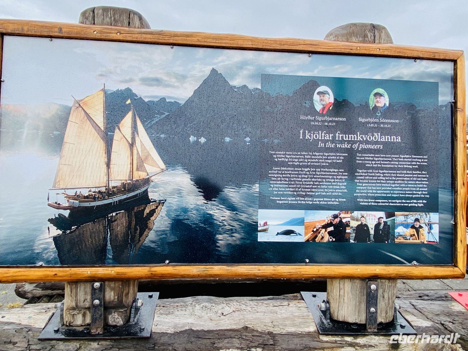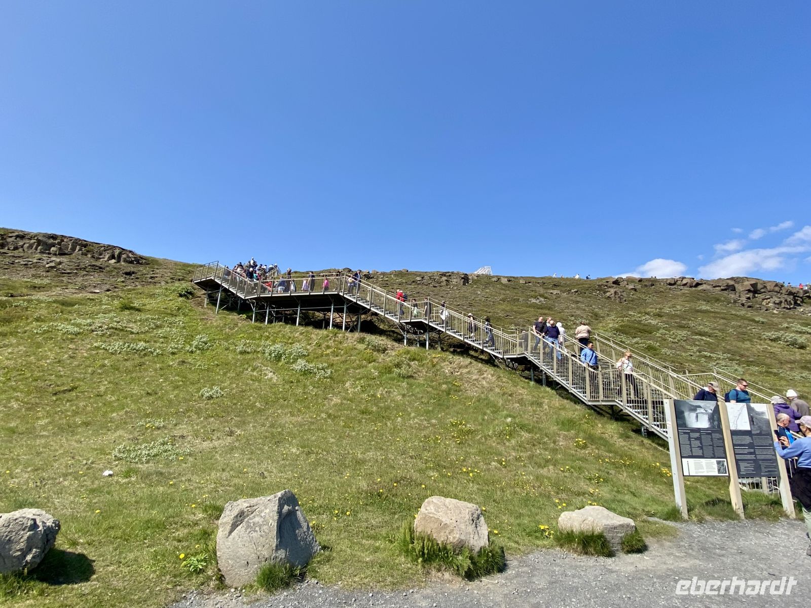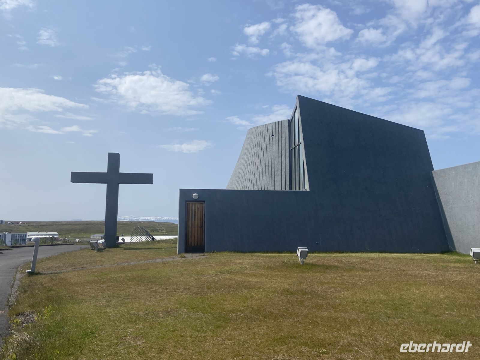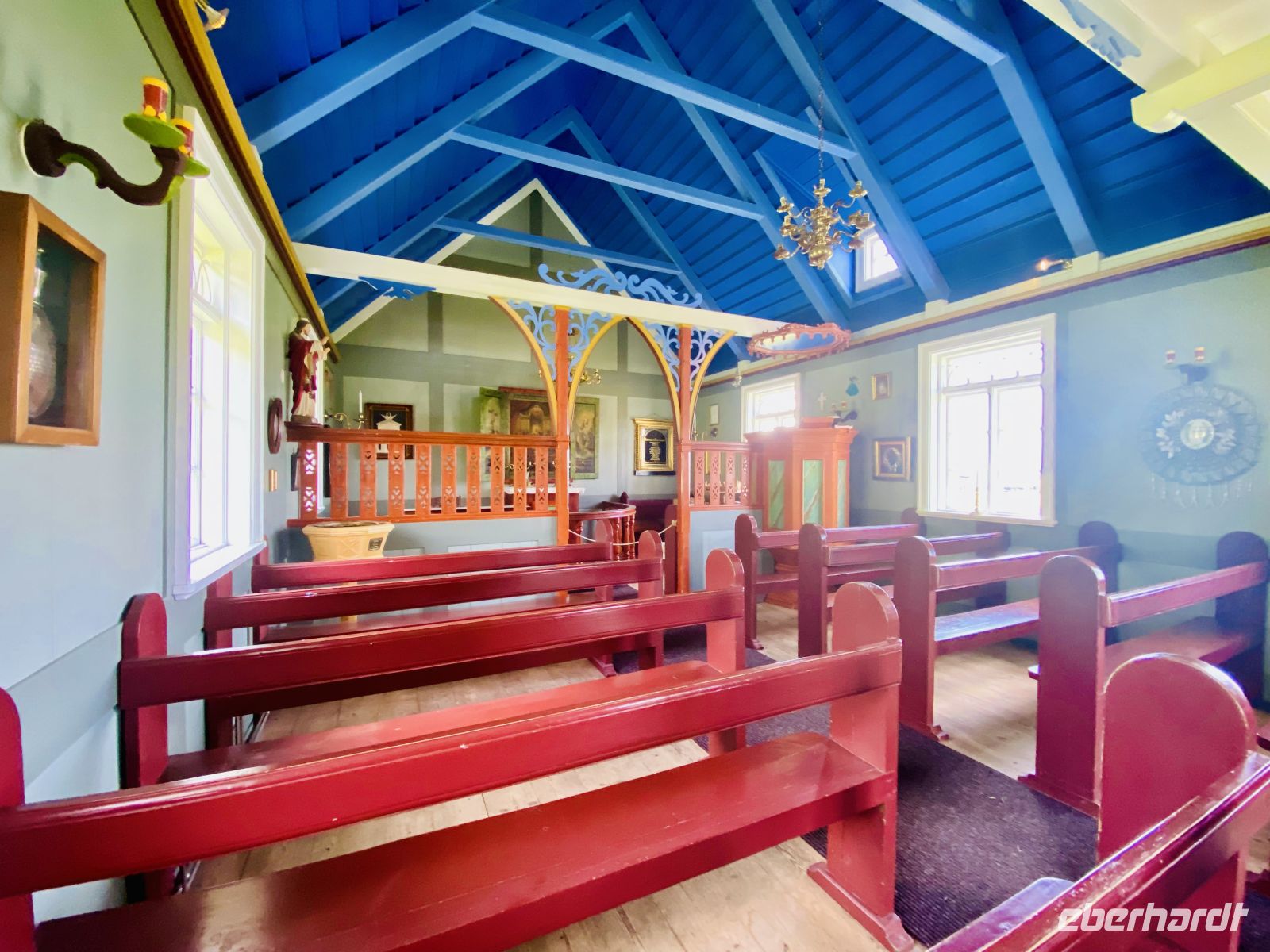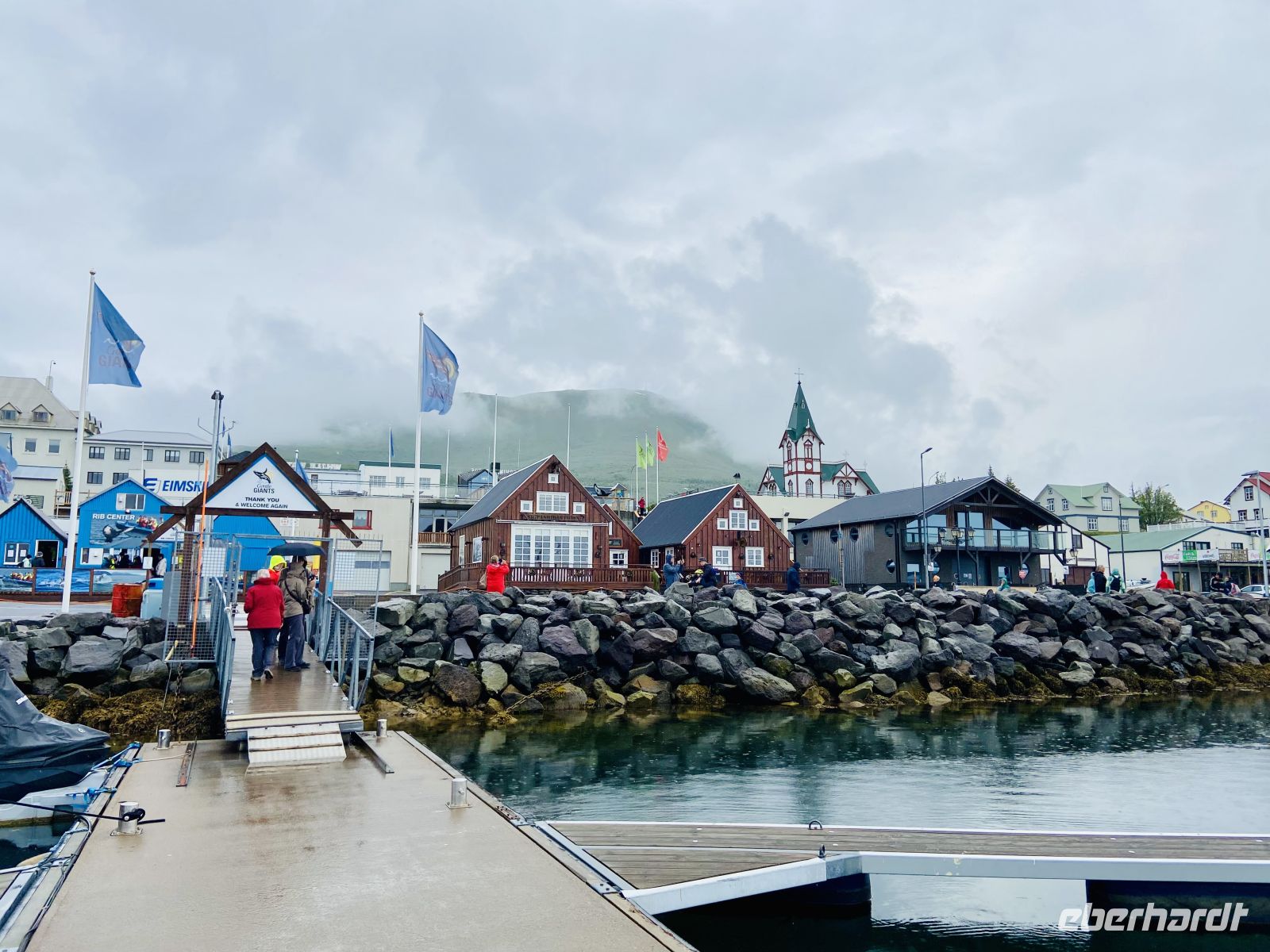 Auf der Halbinsel Tjörnes besuchen wir zuerst den kleinen Fischerort Husavik. Wir schauen kurz im Walmuseum vorbei, bummeln durch den Hafen und besuchen die Kirche. Der Name der Stadt geht auf den Schweden Garðar Svavarsson zurück, der einige Jahre vor Ingólfur Árnarson unfreiwillig nach Island kam, weil er sich verirrt hatte. Er versuchte wohl, die Insel zu umrunden und wurde bei Húsavík vom Winter überrascht. Garðar war gezwungen, auf Island zu überwintern und errichtete einige Häuser (daher der Name Húsavík = Häuserbucht). Sehenswert ist in Húsavík neben dem Hafen und dem Heimatmuseum vor allem die 1907 eingeweihte Kirche. Das vom Architekten Rögnvaldur Ólafsson entworfene Gebäude wurde vollständig aus Holz gebaut, eigens aus Norwegen eingeführt. Die Kirche hat zwar keine Kanzel, aber dafür hat der Pfarrer einen wunderschönen Blick über die Bucht Skjálfandi auf die gegenüberliegenden Berge.