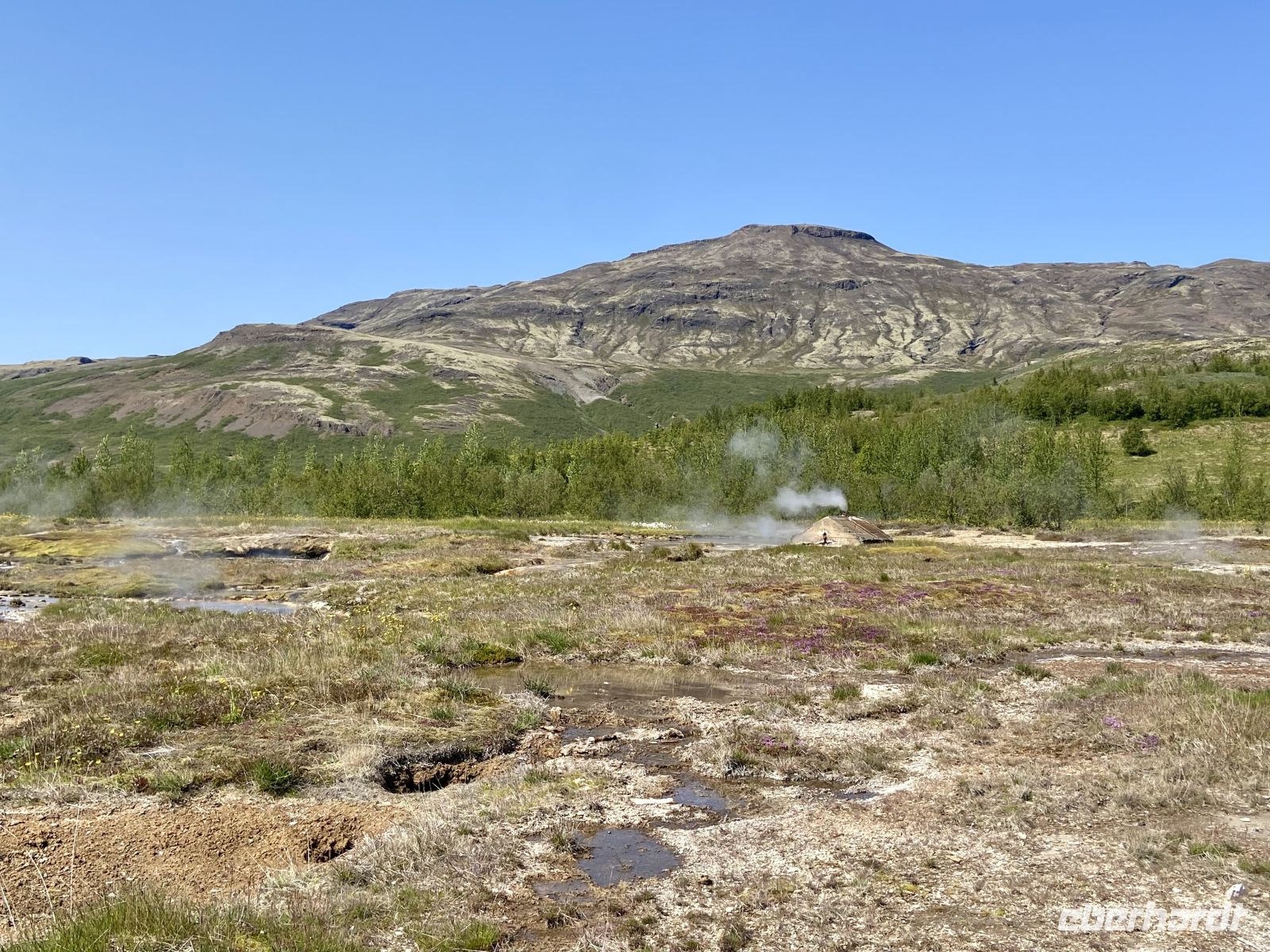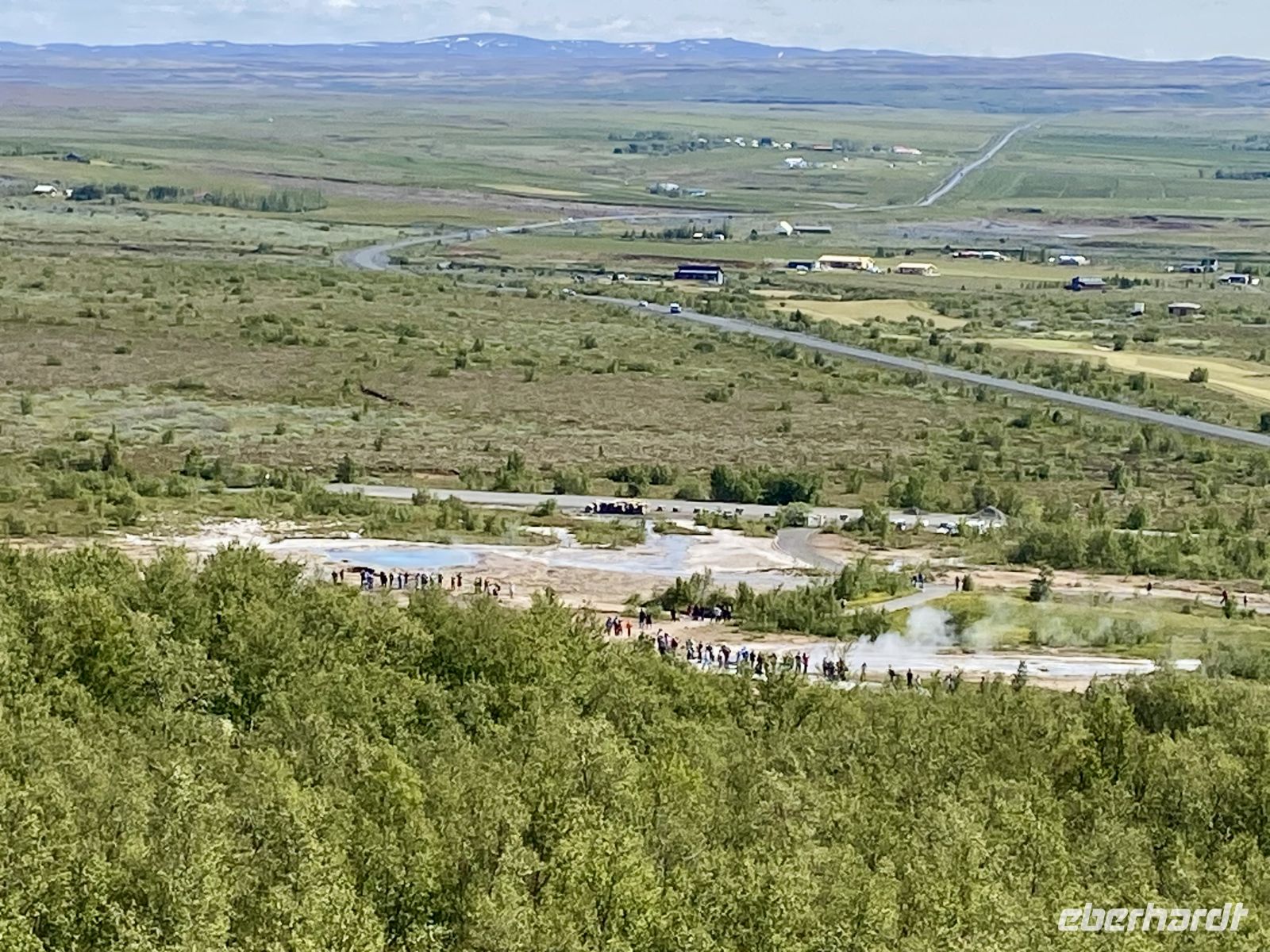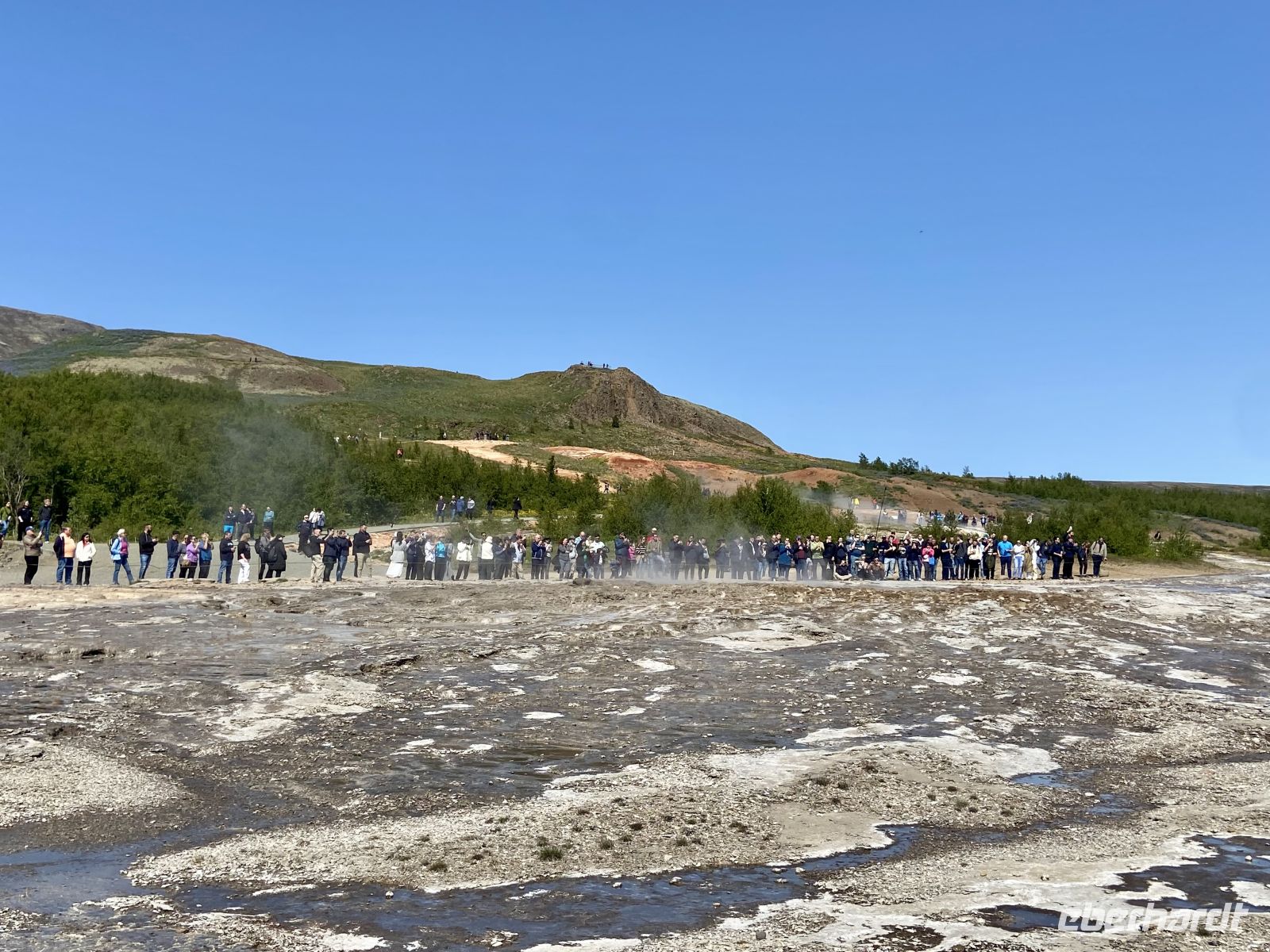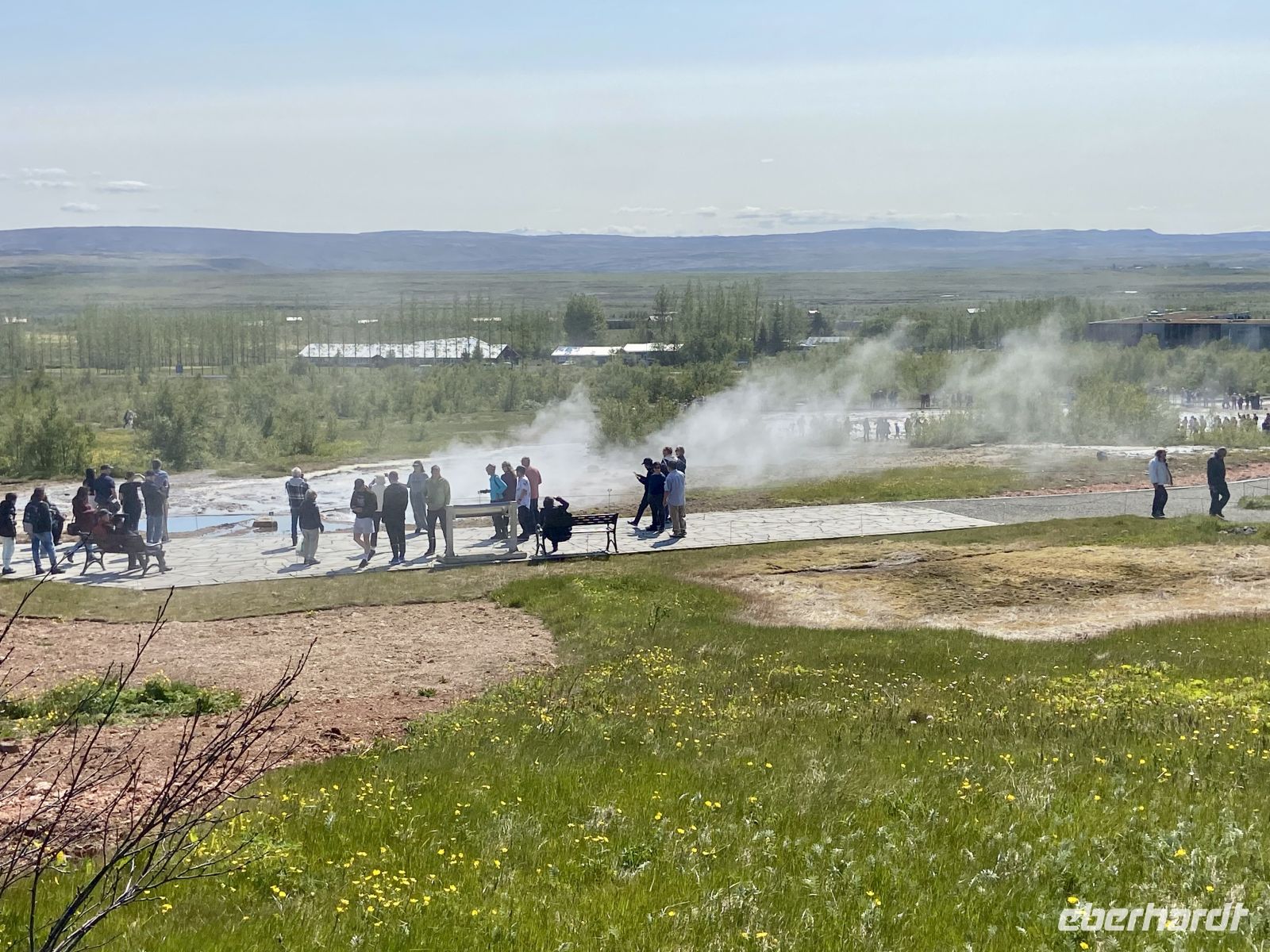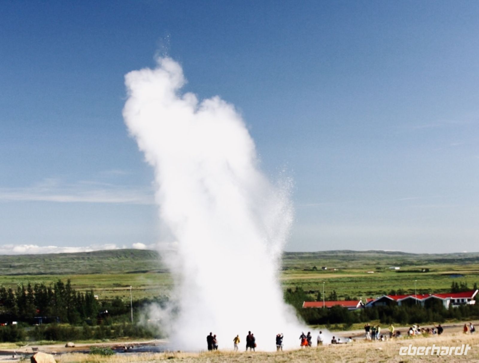 Island ist berühmt für seine Geysire und heißen Quellen. Wir besuchen das bekannteste Heißquellengebiet Haukadalur im Südwesten des Landes. Der Große Geysir, Namensgeber aller Springquellen, war hier lange die Attraktion. Er war über Jahrhunderte aktiv, bereits 1294 wurde er erstmals erwähnt, insgesamt war die Springquelle etwa 10.000 Jahre lang aktiv. Einmal pro Stunde wurde eine 60 m hohe Wasser- und Dampffontäne in die Höhe geschleudert. Anfang des 20. Jahrhunderts erloschen die Ausbrüche, vermutlich infolge geänderter Grundwasser- und Erdwärmeverhältnisse als Folge von Erdbeben. Der kleine Bruder des alten Geysirs, der „Strokkur“, gilt heute als der Zuverlässigste, er spuckt mehrmals in der Stunde. So kommen die leidenschaftlichen Fotografen aus unserer Gruppe voll auf ihre Kosten. Ein Jeder versucht, ihn in Perfektion per Foto und Video aufzunehmen.
