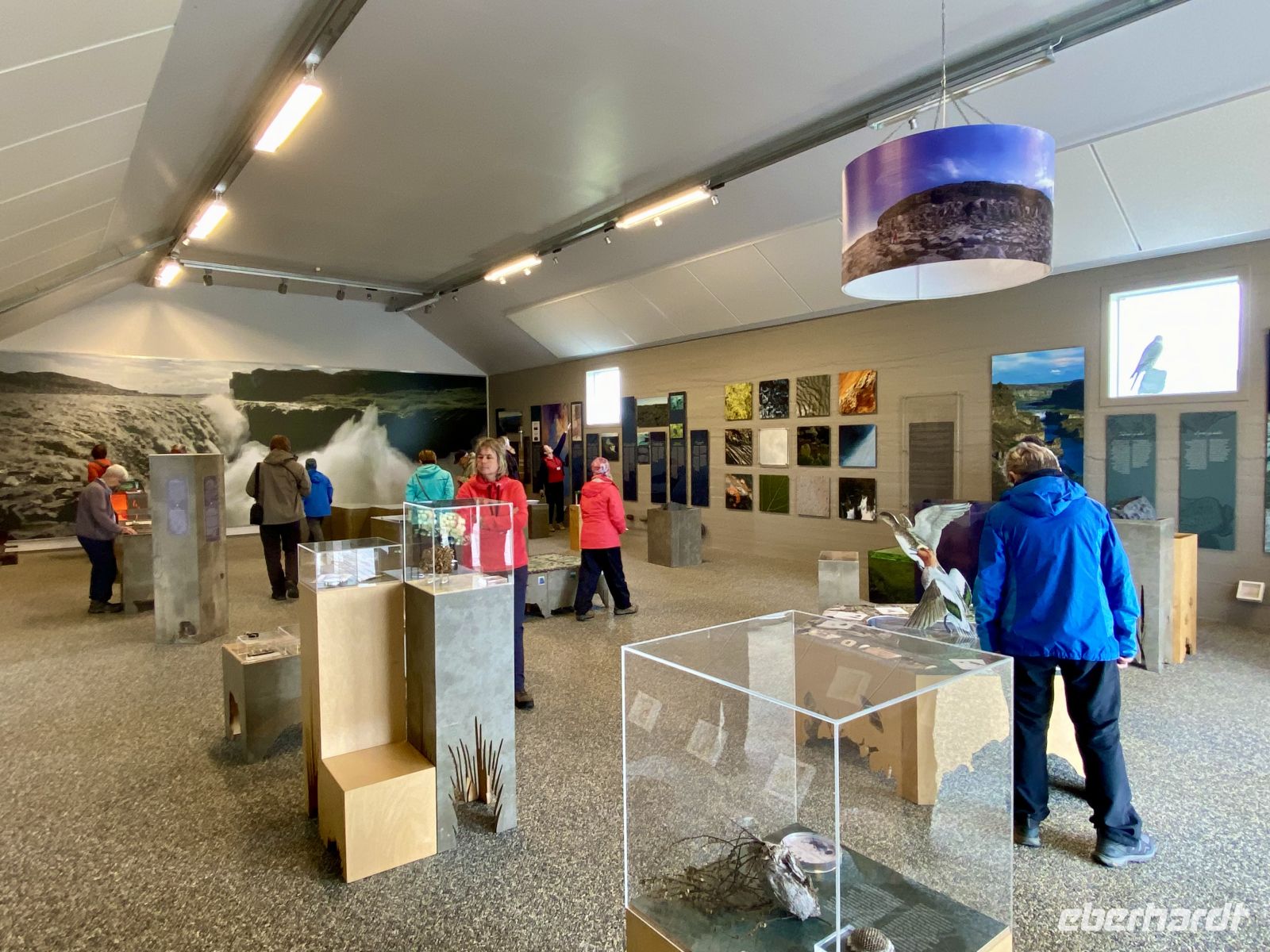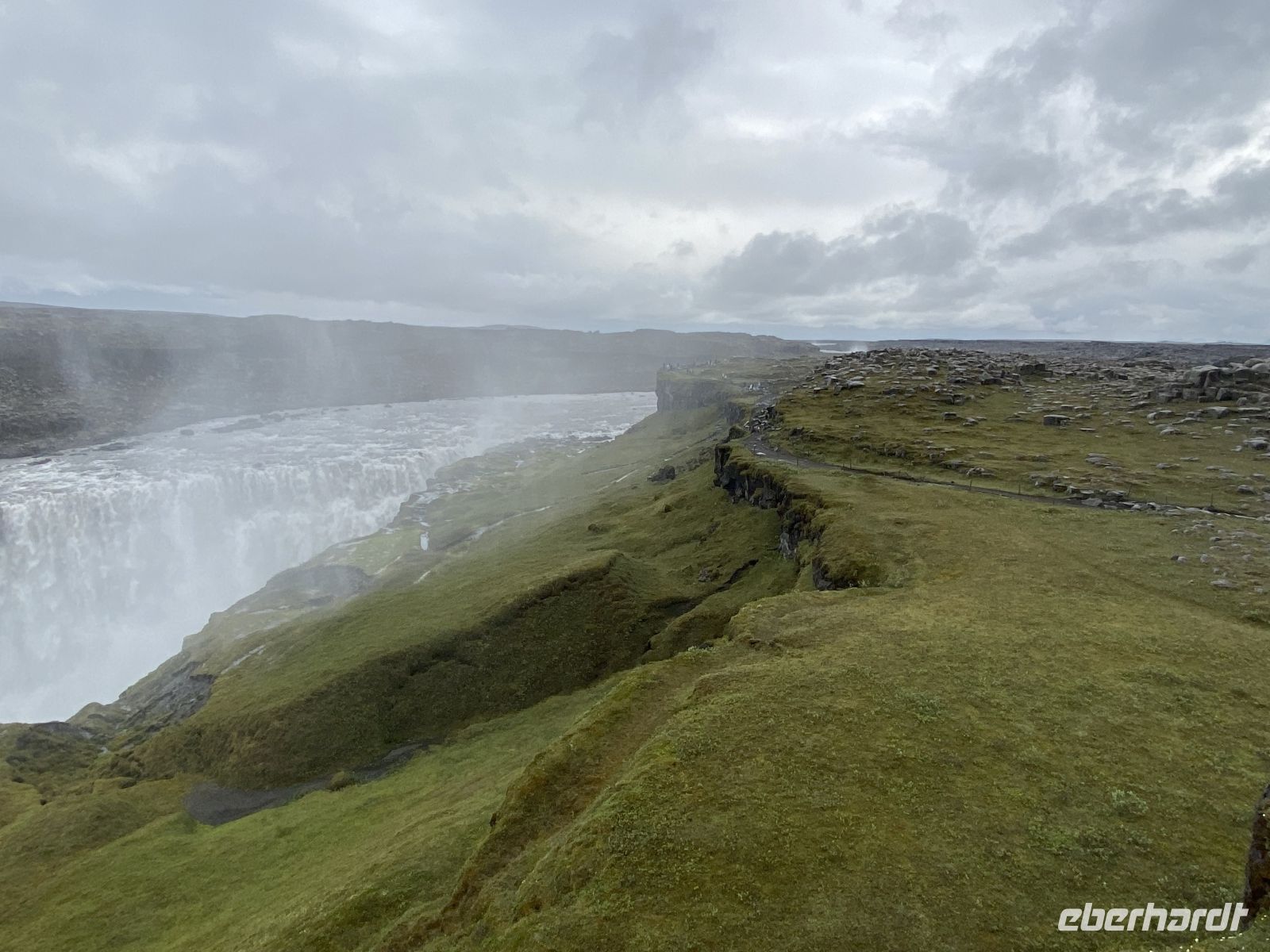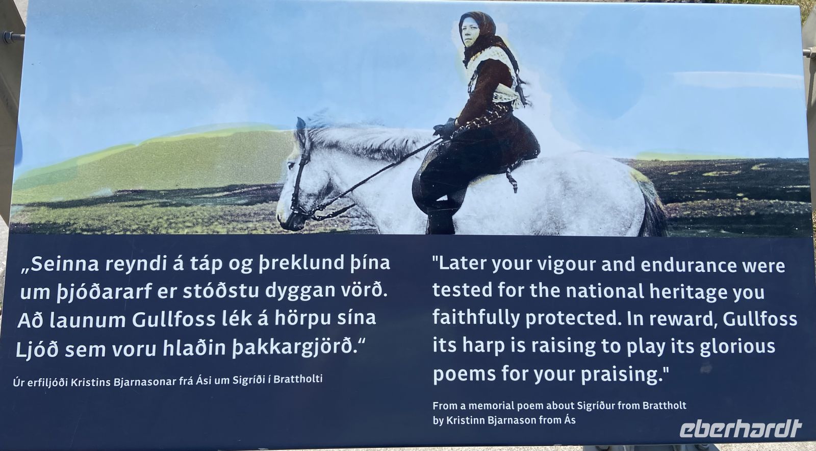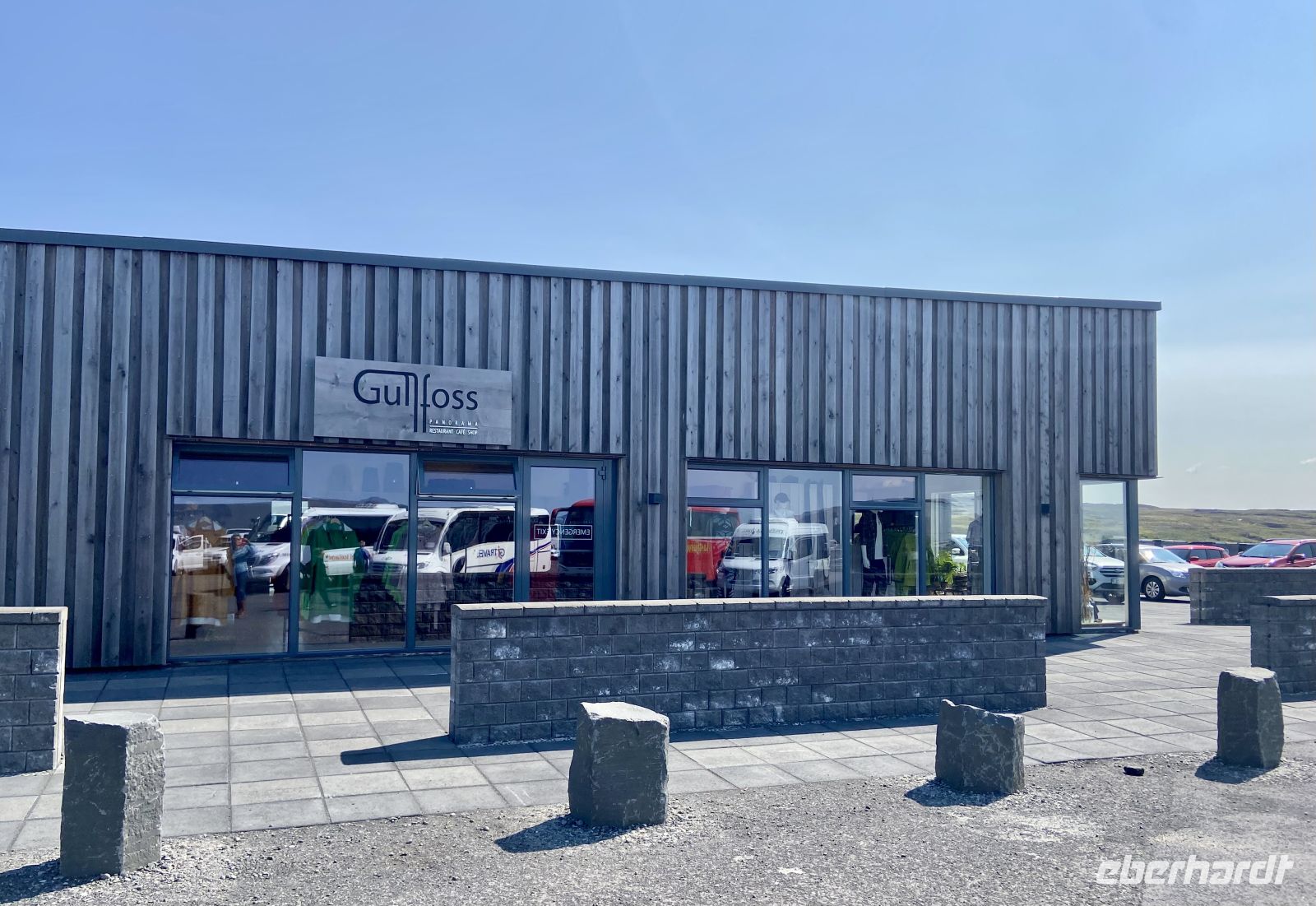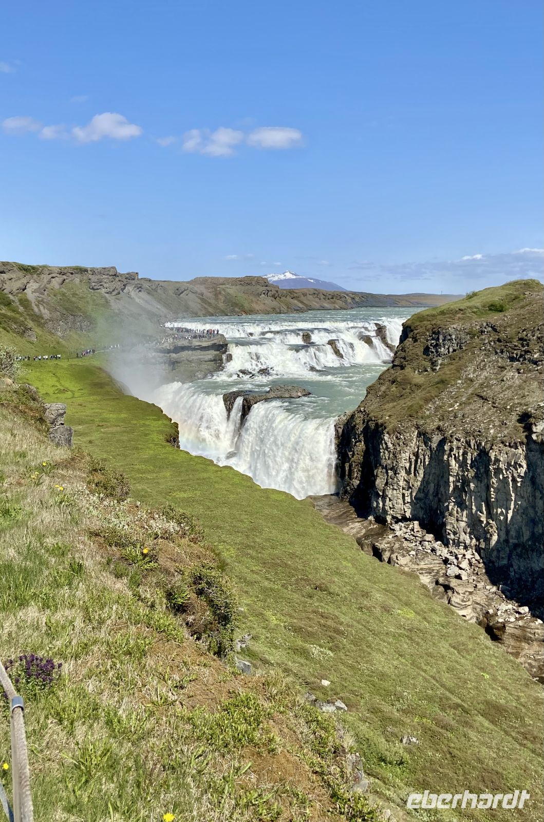 Den "Goldenen Wasserfall", der wohl bekannteste Wasserfall Islands. Über zwei gewaltige, fast im rechten Winkel aufeinander stehenden Kaskaden stürzt das Wasser des Gletscherflusses Hvítá in eine 2,5 km lange und 70 m tiefe Schlucht, pro Sekunde donnern bis zu 1200 Kubikmeter in die Tiefe. Die obere Stufe des Wasserfalls hat eine Höhe von 11 m, die untere Stufe erreicht eine Höhe von 20 m. Der Gullfoss würde heute wahrscheinlich nicht mehr existieren, hätte sich nicht die Tochter des Bauern von Brattholt für ihn eingesetzt. Am Anfang des 20. Jahrhunderts wollten britische Spekulanten den Gullfoss für die Energiegewinnung erschließen. Sigríður Tómasdóttir führte vergeblich einen langjährigen juristischen Kampf gegen die Spekulanten. Erst als sie drohte, sich in die Fluten des Gullfoss zu stürzen, ließen die Briten von ihrem Vorhaben ab. Dankbare Isländer haben der Bauerntochter neben dem Wasserfall ein Denkmal gesetzt.