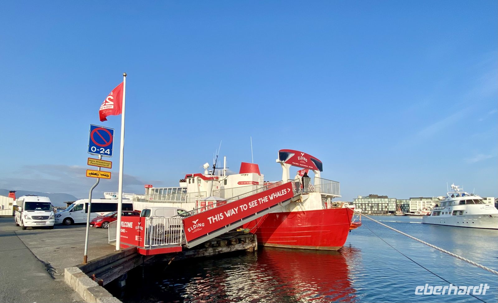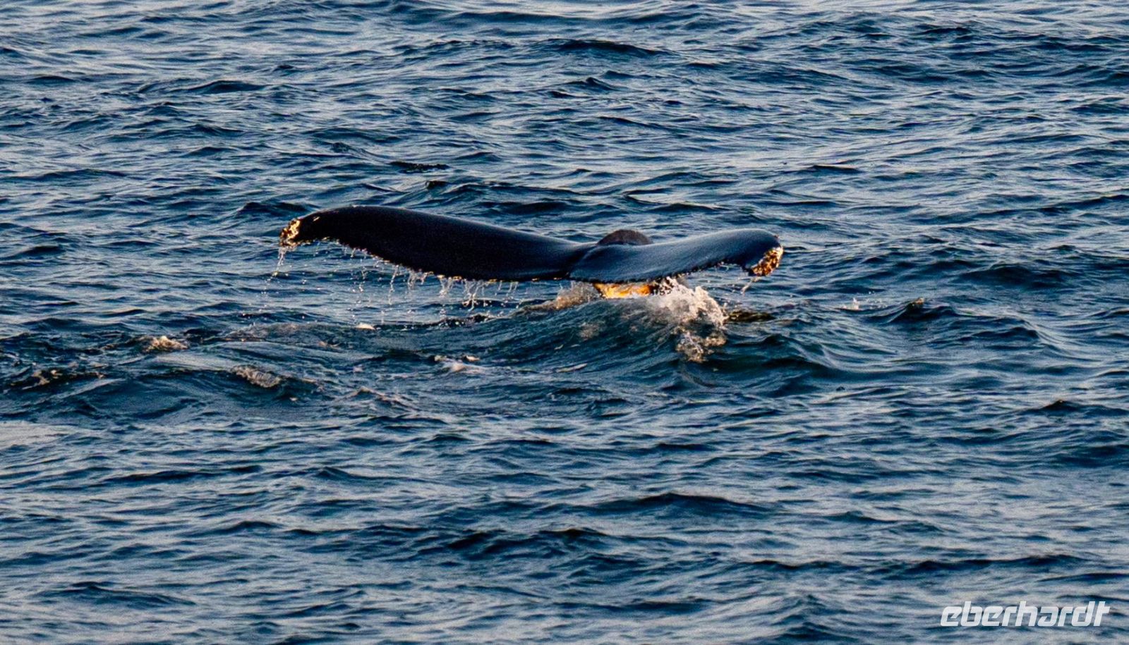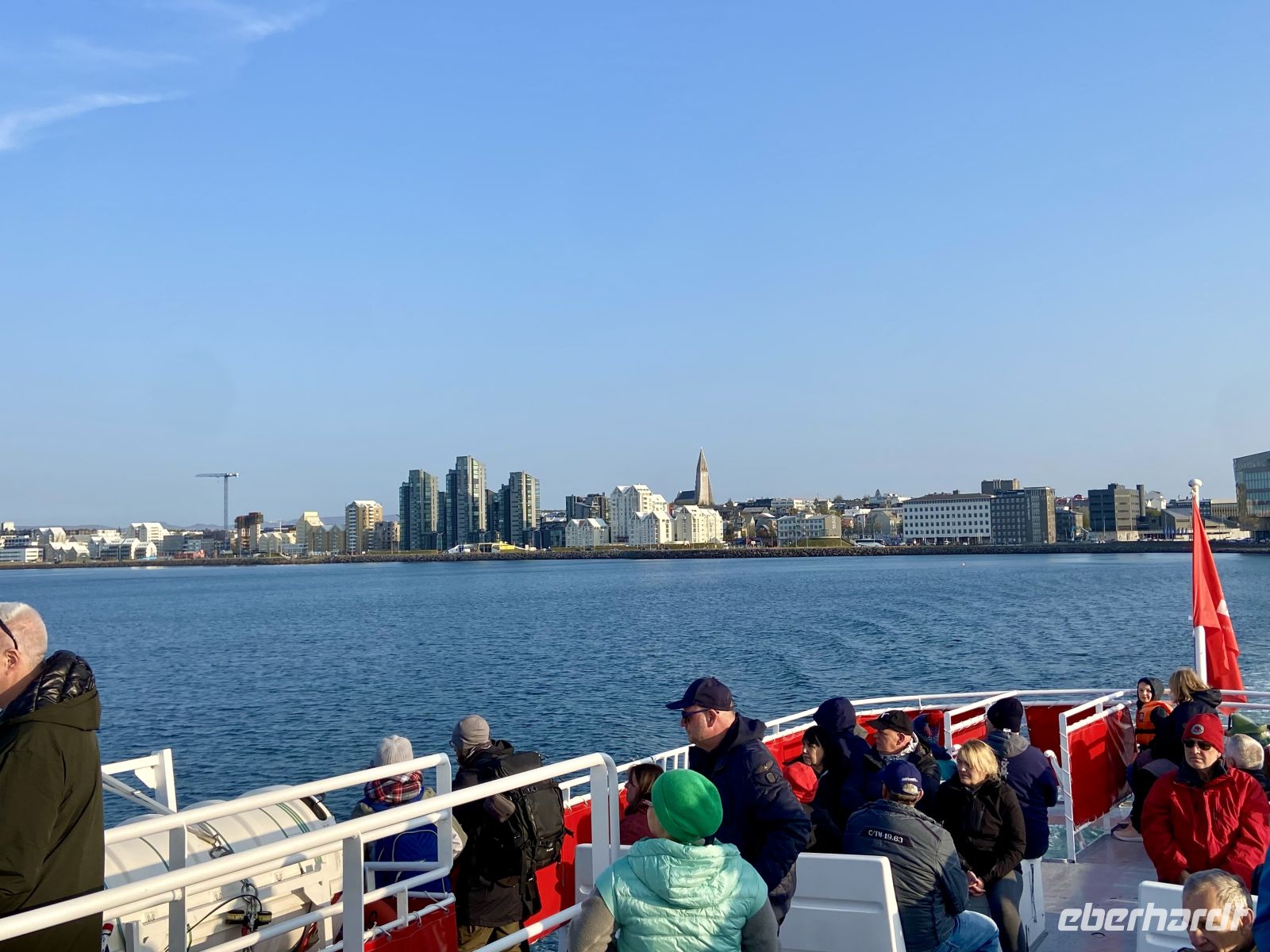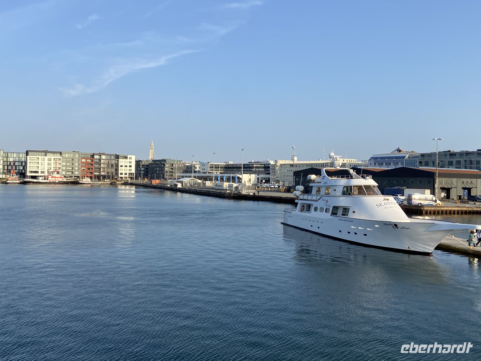 Der Tag ist aber mit den Highlights des Golden Kreises noch nicht beendet. Heute steht zwar kein gemeinsames Abendessen auf dem Programm, aber ein Großteil der Gruppe geht zusammen zu Restaurant Potturinn oh Pannan, wo wir einen Tisch bestellt haben. Um 20 Uhr treffen wir uns danach wieder zur Walbeobachtung. 14 Gäste fahren zum Reykjaviker Hafen, steigen dort auf ein Boot um, das uns den Walen näher bringen soll. Die Hoffnung, viele der gewaltigen Meeresbewohner sehen zu können, ist groß. An Bord herrscht reges Treiben, alle Passagiere versuchen, den besten Platz, die beste Aussicht zu ergattern. Als besonderen Service kann sogar einen wärmende Overall ausleihen, um ohne Einschränkungen an Deck der kühlen Witterung zu trotzen. Doch leider zeigt sich lediglich ein einzelner Vertreter der großen Meeressäuger, und grüßt auch nur ganz zurückhaltend mit seiner Schwanzflosse. Aber trotzdem ist die Fahrt ein wunderschönes Erlebnis, die See ist für isländische Verhältnisse spiegelglatt und die Junisonne bietet ein beeindruckendes Farberlebnis. Gegen 23 Uhr sind wir zurück im Hafen von Reykjavik, die Scheiben der Häuser reflektieren das goldene Licht des Sonnenuntergangs.