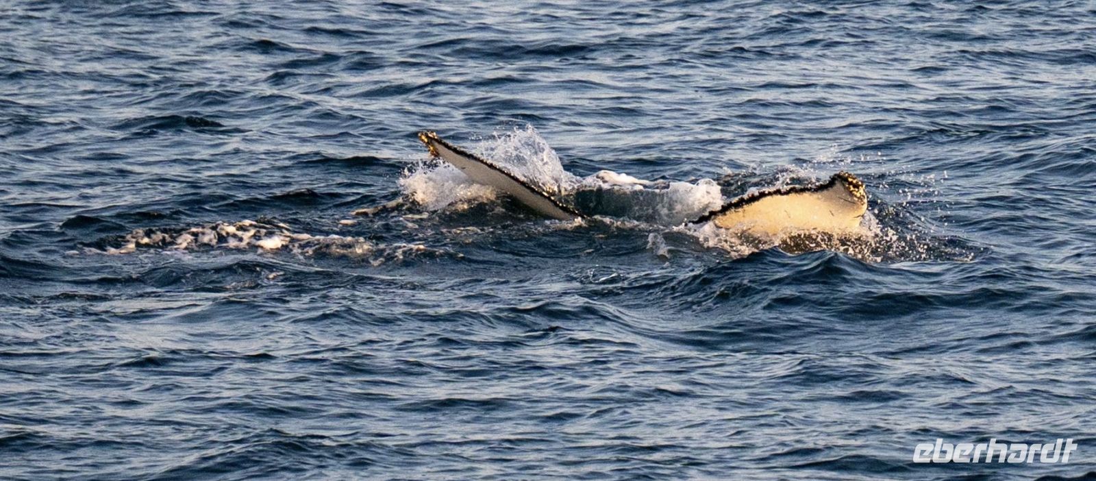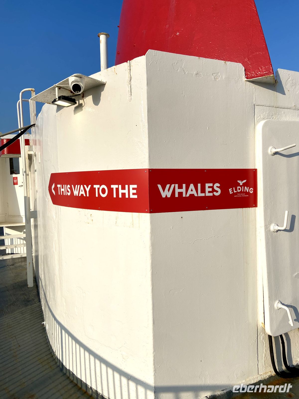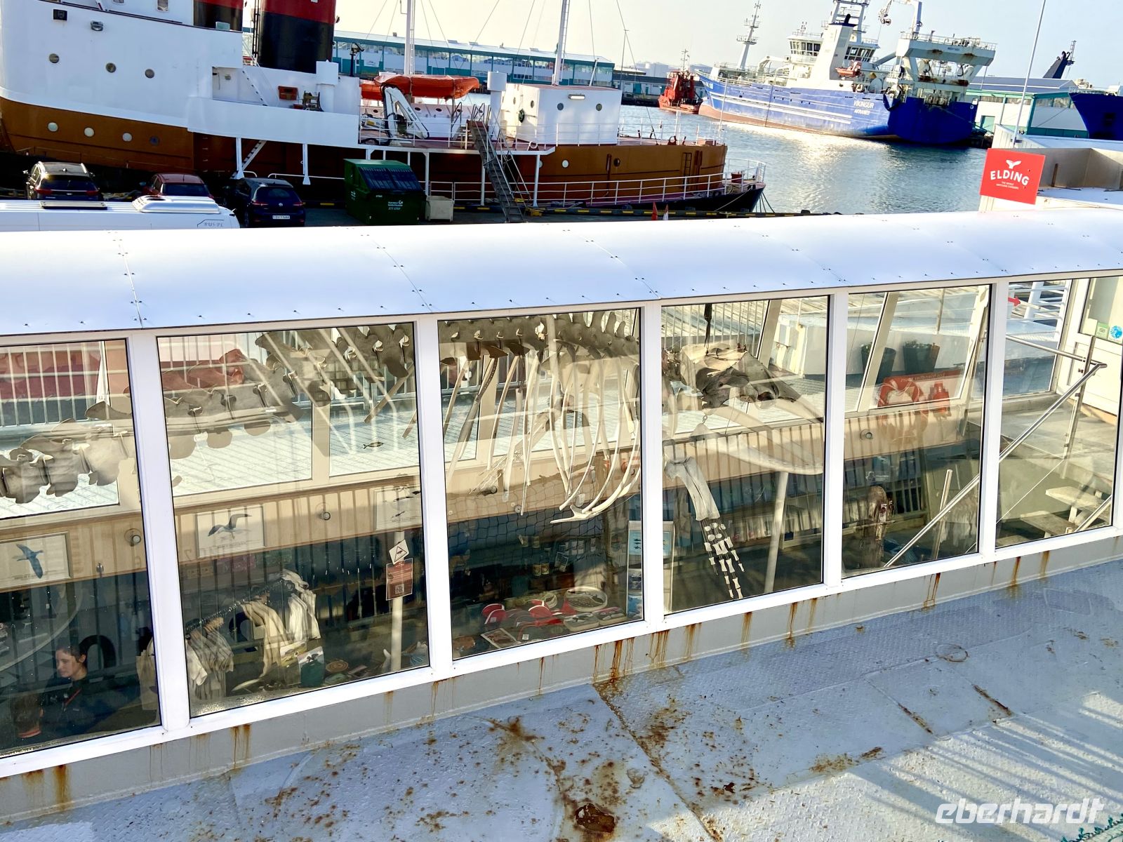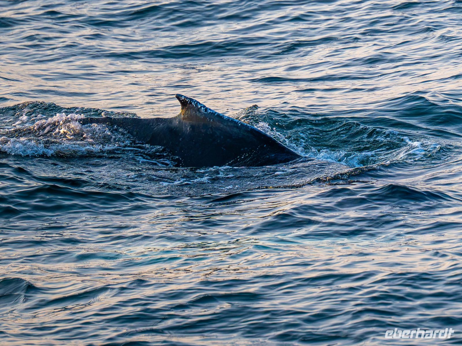 Der Tag ist aber mit den Highlights des Golden Kreises noch nicht beendet. Heute steht zwar kein gemeinsames Abendessen auf dem Programm, aber ein Großteil der Gruppe geht zusammen zu Restaurant Potturinn oh Pannan, wo wir einen Tisch bestellt haben. Um 20 Uhr treffen wir uns danach wieder zur Walbeobachtung. 14 Gäste fahren zum Reykjaviker Hafen, steigen dort auf ein Boot um, das uns den Walen näher bringen soll. Die Hoffnung, viele der gewaltigen Meeresbewohner sehen zu können, ist groß. An Bord herrscht reges Treiben, alle Passagiere versuchen, den besten Platz, die beste Aussicht zu ergattern. Als besonderen Service kann sogar einen wärmende Overall ausleihen, um ohne Einschränkungen an Deck der kühlen Witterung zu trotzen. Doch leider zeigt sich lediglich ein einzelner Vertreter der großen Meeressäuger, und grüßt auch nur ganz zurückhaltend mit seiner Schwanzflosse. Aber trotzdem ist die Fahrt ein wunderschönes Erlebnis, die See ist für isländische Verhältnisse spiegelglatt und die Junisonne bietet ein beeindruckendes Farberlebnis. Gegen 23 Uhr sind wir zurück im Hafen von Reykjavik, die Scheiben der Häuser reflektieren das goldene Licht des Sonnenuntergangs.