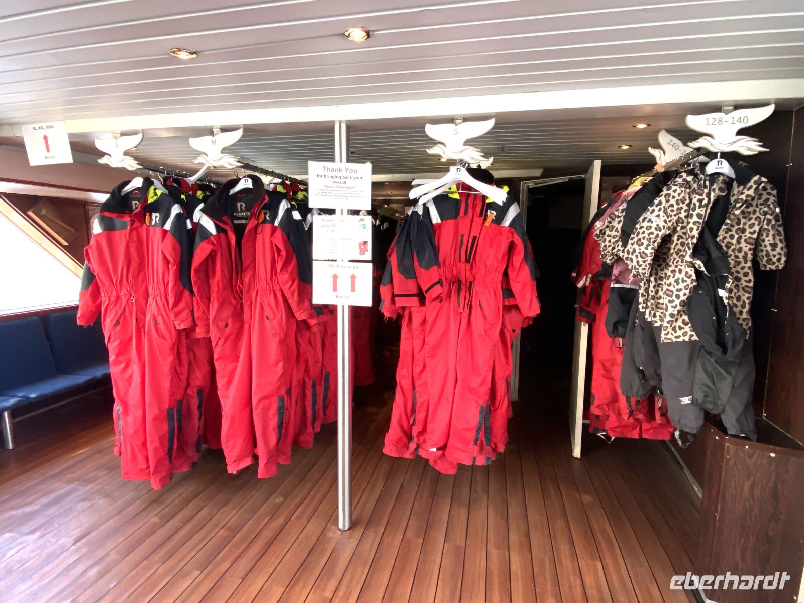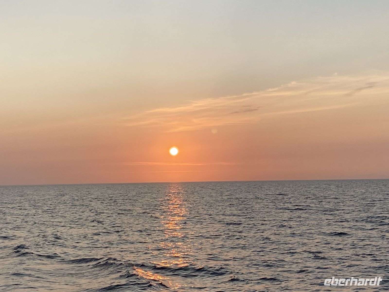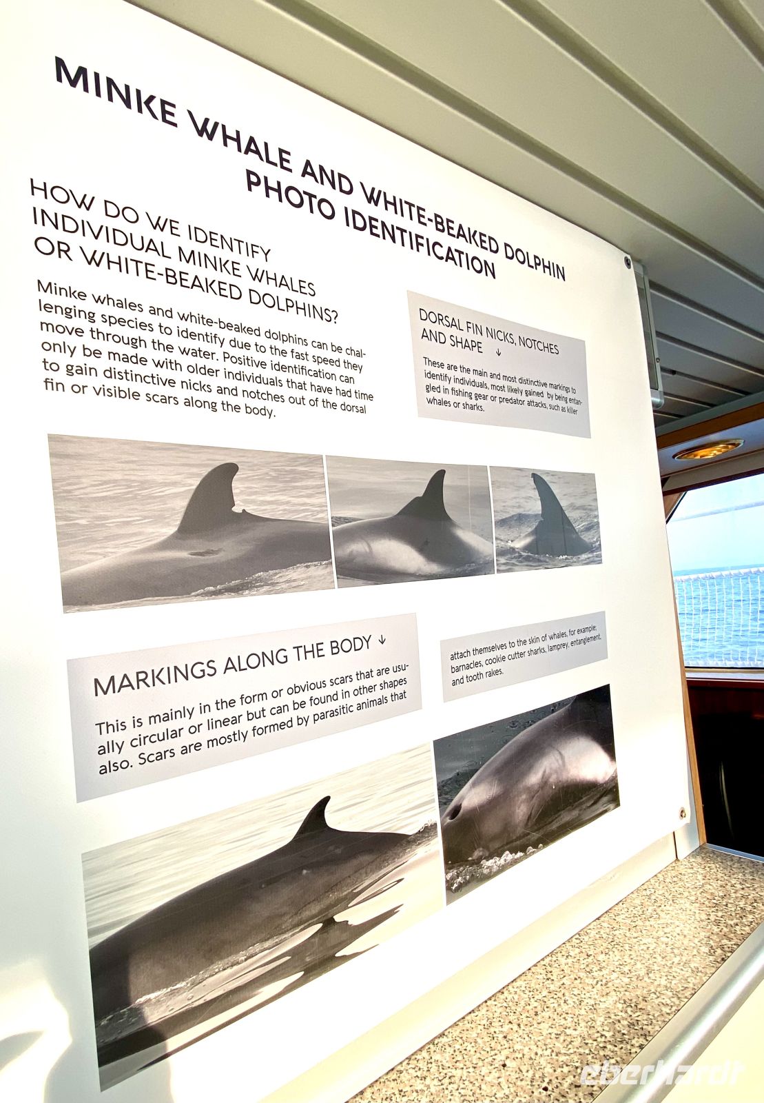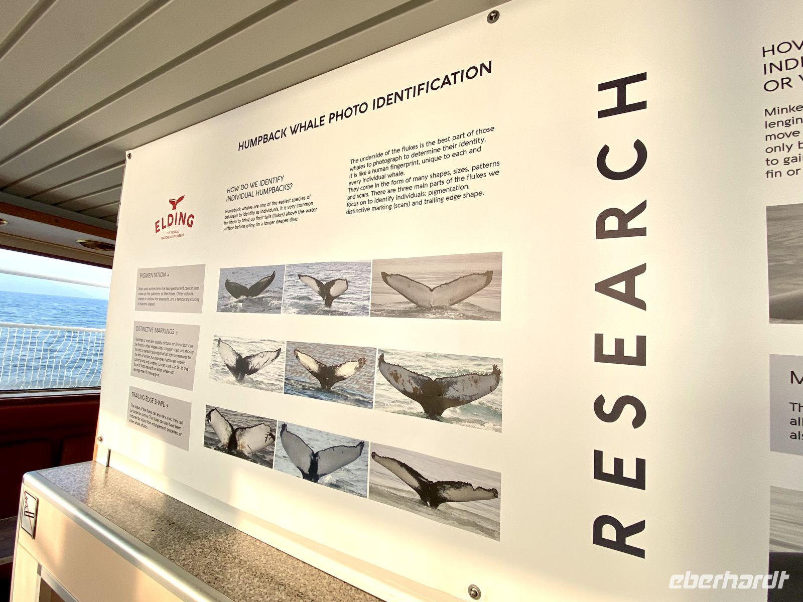 Der Tag ist aber mit den Highlights des Golden Kreises noch nicht beendet. Heute steht zwar kein gemeinsames Abendessen auf dem Programm, aber ein Großteil der Gruppe geht zusammen zu Restaurant Potturinn oh Pannan, wo wir einen Tisch bestellt haben. Um 20 Uhr treffen wir uns danach wieder zur Walbeobachtung. 14 Gäste fahren zum Reykjaviker Hafen, steigen dort auf ein Boot um, das uns den Walen näher bringen soll. Die Hoffnung, viele der gewaltigen Meeresbewohner sehen zu können, ist groß. An Bord herrscht reges Treiben, alle Passagiere versuchen, den besten Platz, die beste Aussicht zu ergattern. Als besonderen Service kann sogar einen wärmende Overall ausleihen, um ohne Einschränkungen an Deck der kühlen Witterung zu trotzen. Doch leider zeigt sich lediglich ein einzelner Vertreter der großen Meeressäuger, und grüßt auch nur ganz zurückhaltend mit seiner Schwanzflosse. Aber trotzdem ist die Fahrt ein wunderschönes Erlebnis, die See ist für isländische Verhältnisse spiegelglatt und die Junisonne bietet ein beeindruckendes Farberlebnis. Gegen 23 Uhr sind wir zurück im Hafen von Reykjavik, die Scheiben der Häuser reflektieren das goldene Licht des Sonnenuntergangs.