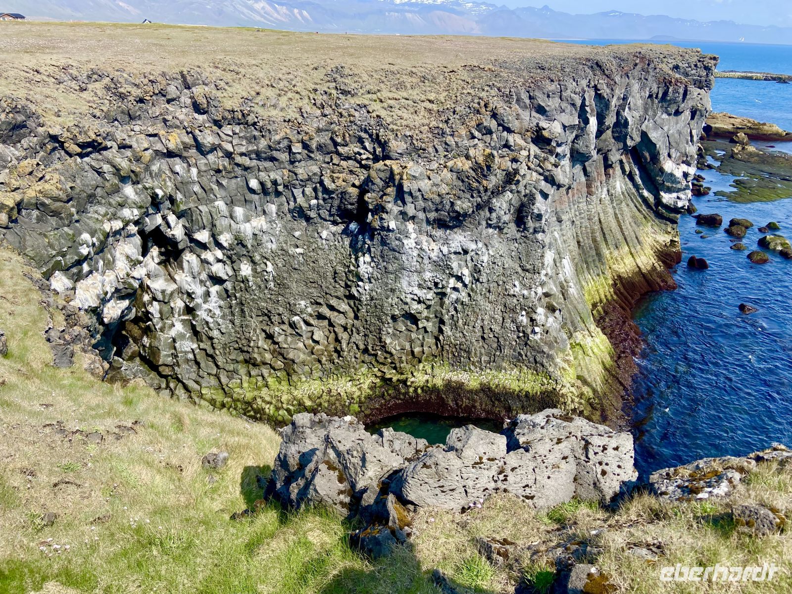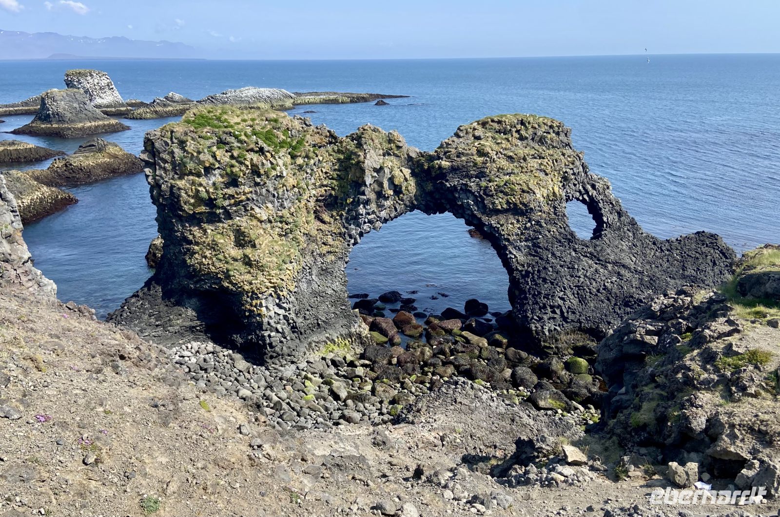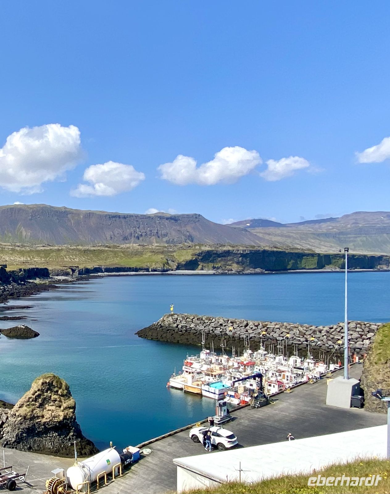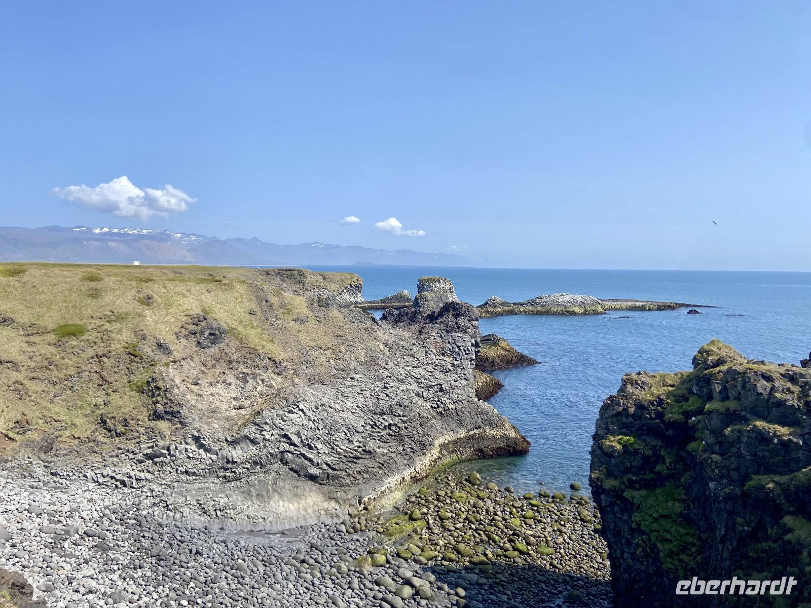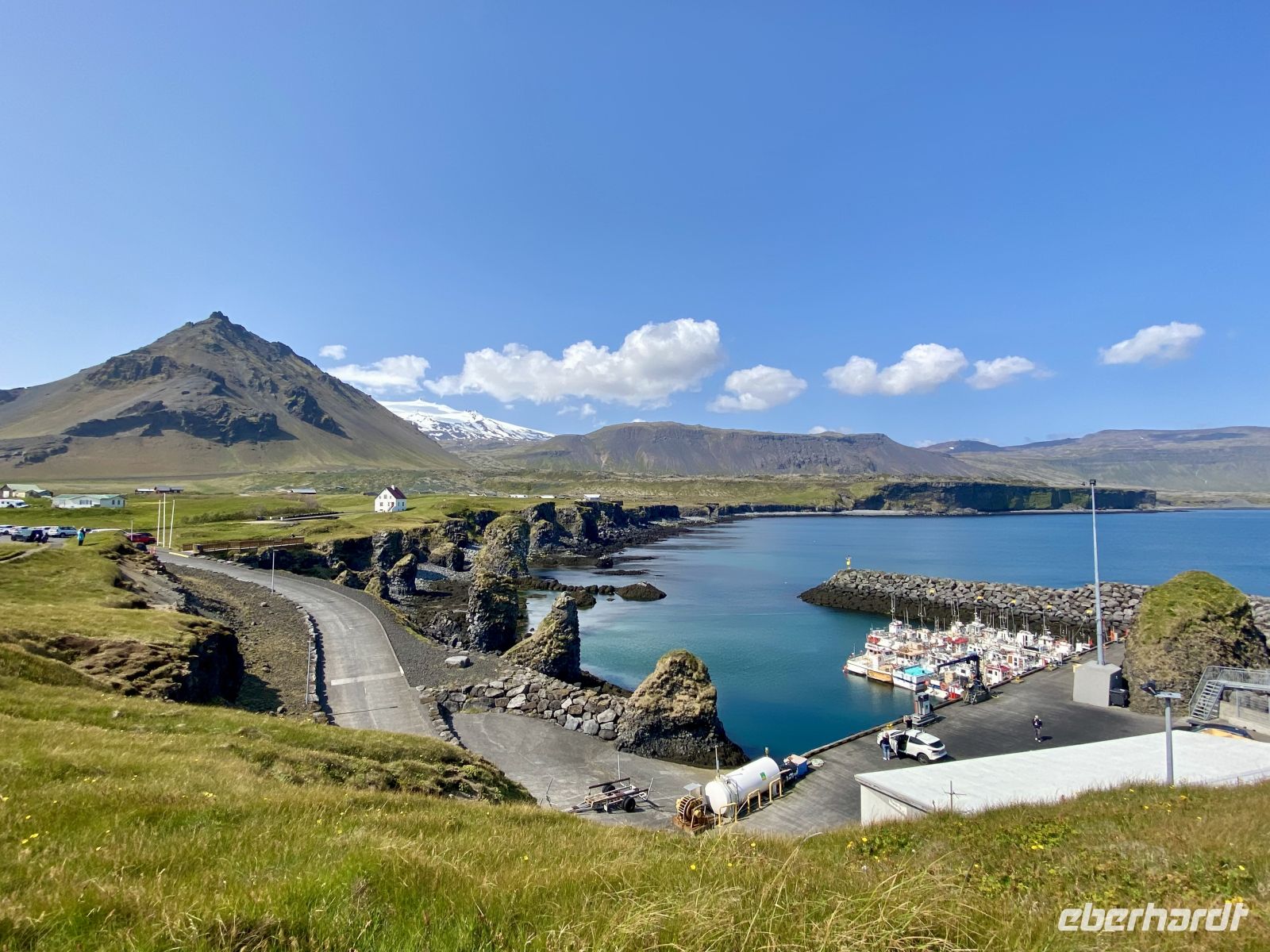 Der heutiger Ausflug bringt uns in den Nordwesten Islands, auf die Halbinsel Snaefellsnes. Durch den 5,8 Kilometer langen, im Jahr 1998 fertiggestellten Hvalfjardargöng/Walfjordtunnel geht es auf die Halbinsel. Sie verdankt ihren Namen dem Vulkangletscher Snaefellsjökull, der während der heutigen Rundfahrt majestätisch über uns thront. Malerisch ist die ihn umgebende Küstenlinie mit ihren kleinen Fischerdörfern und den Vulkan-Inseln und steinigen Klippen, die aus dem Meer ragen.