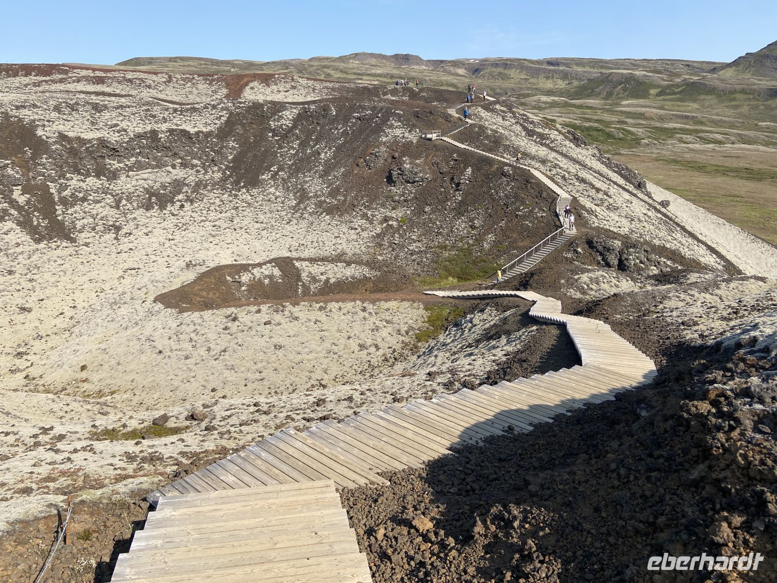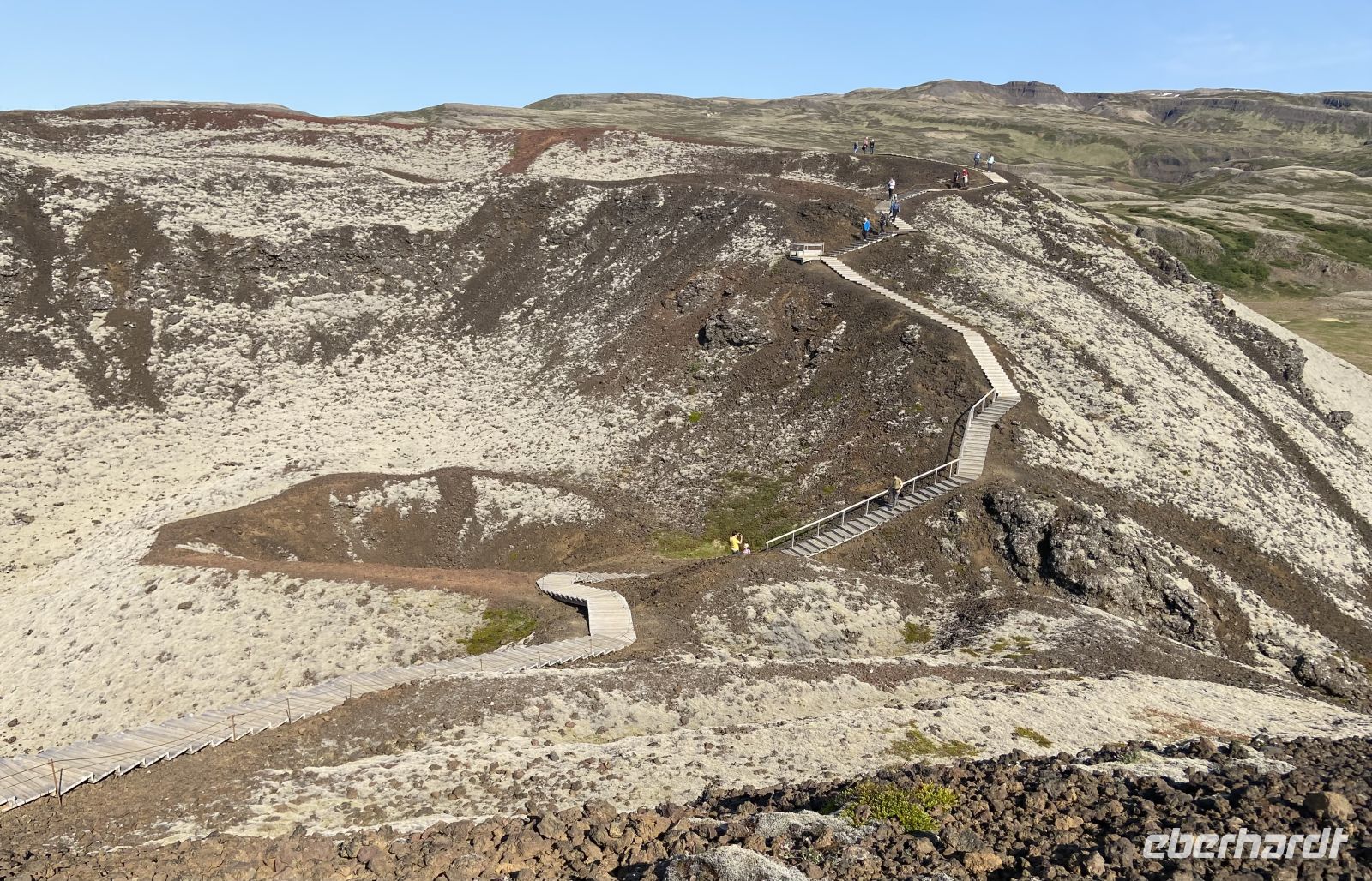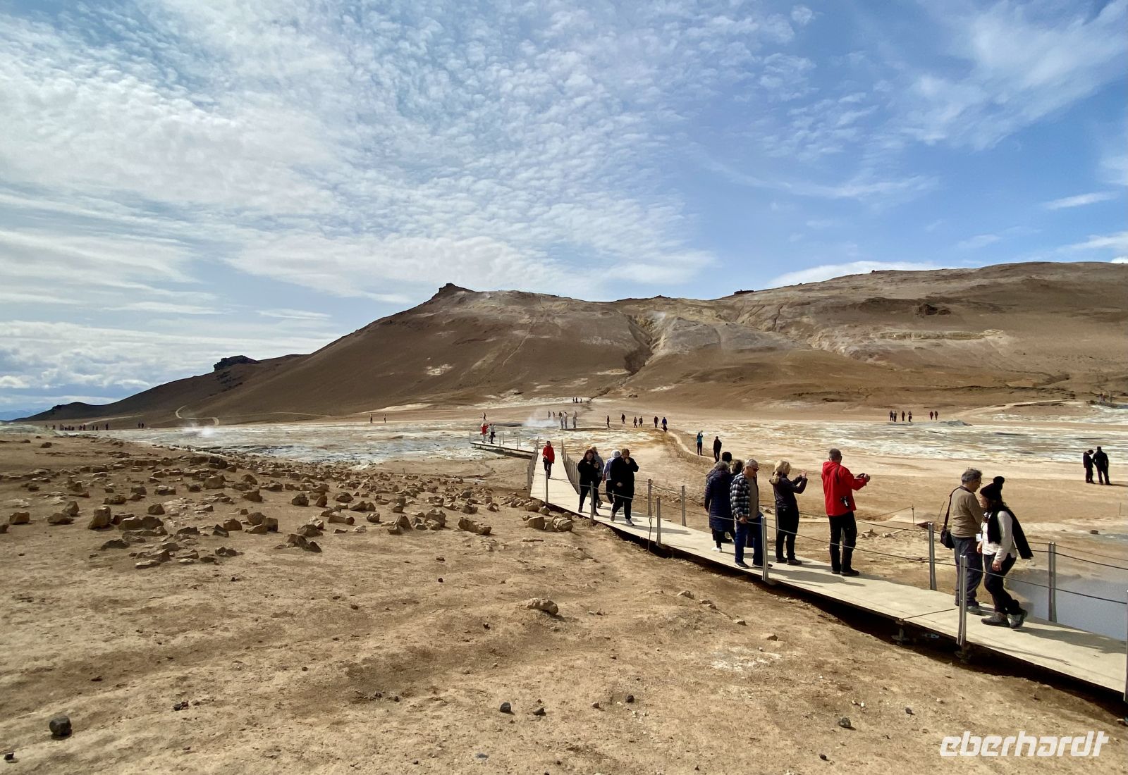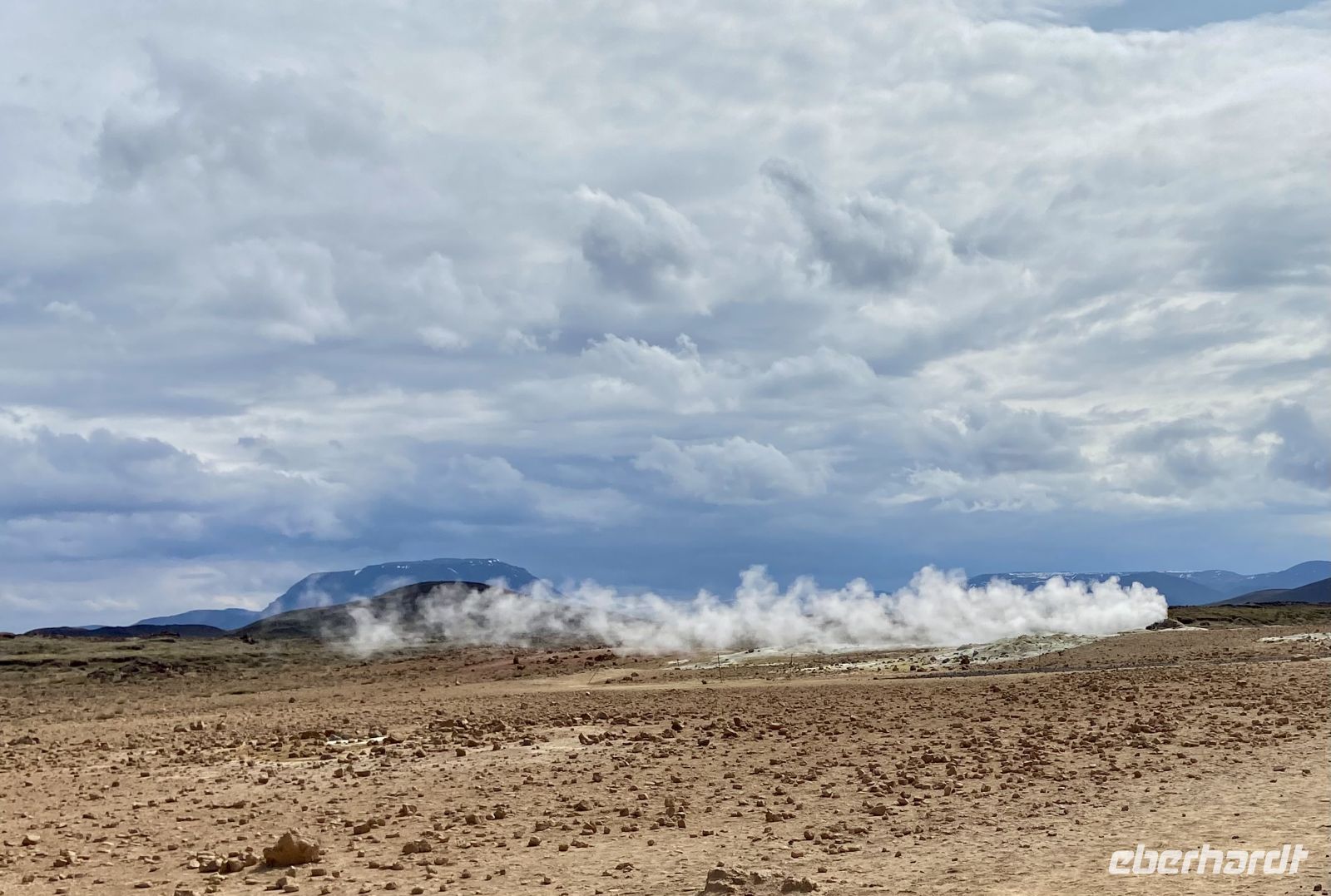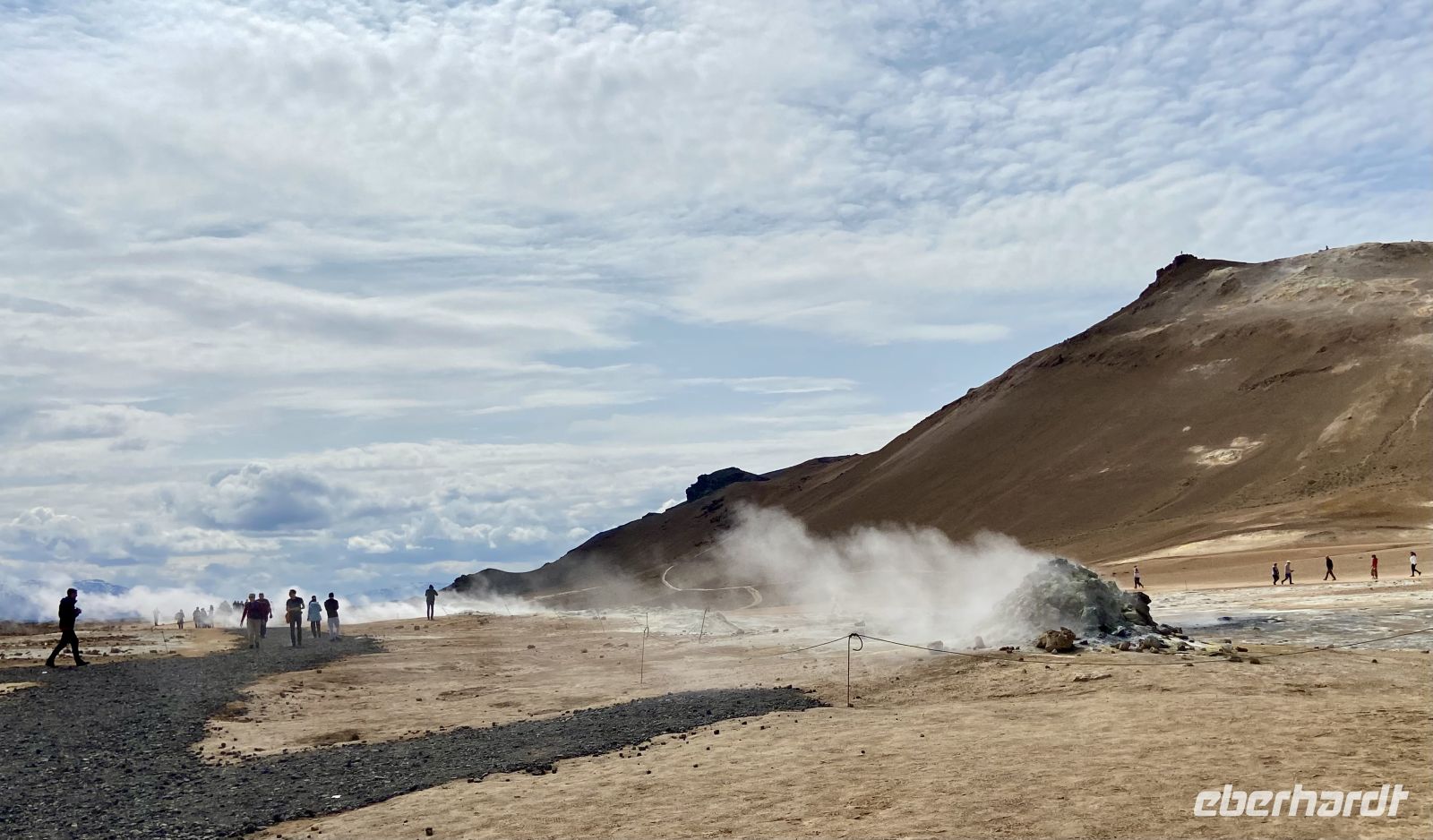 Eines der berühmtesten Hochtemperaturgebiete Islands liegt am Fuße des Berges Námafjall, ist „höllisch“ beeindruckend, aber auch nicht ganz ungefährlich. Hverarönd, oft auch Námaskarð genannnt, lässt erahnen, warum Schwefel gerne mit dem Teufel in Verbindung gebracht wird. Dieses bizarre Hochtemperaturgebiet mit seinen kochenden Schlammlöchern, den aufsteigenden Dampfsäulen und dem starken Geruch, fast möchte man sagen Gestank, ist beeindruckend und vermittelt ein Gefühl dafür, welche Kräfte und welche Hitze im Innern der Erde toben. Früher wurde hier am Berg Námafjall Schwefel – zum Beispiel zur Herstellung von Sprengstoff – abgebaut und über den Hafen von Húsavík exportiert. Seine hohen Temperaturen und seine Energie verdankt das Gebiet dem Krafla-Vulkansystem, dessen Hauptvulkan 8 Kilometer nördlich liegt.