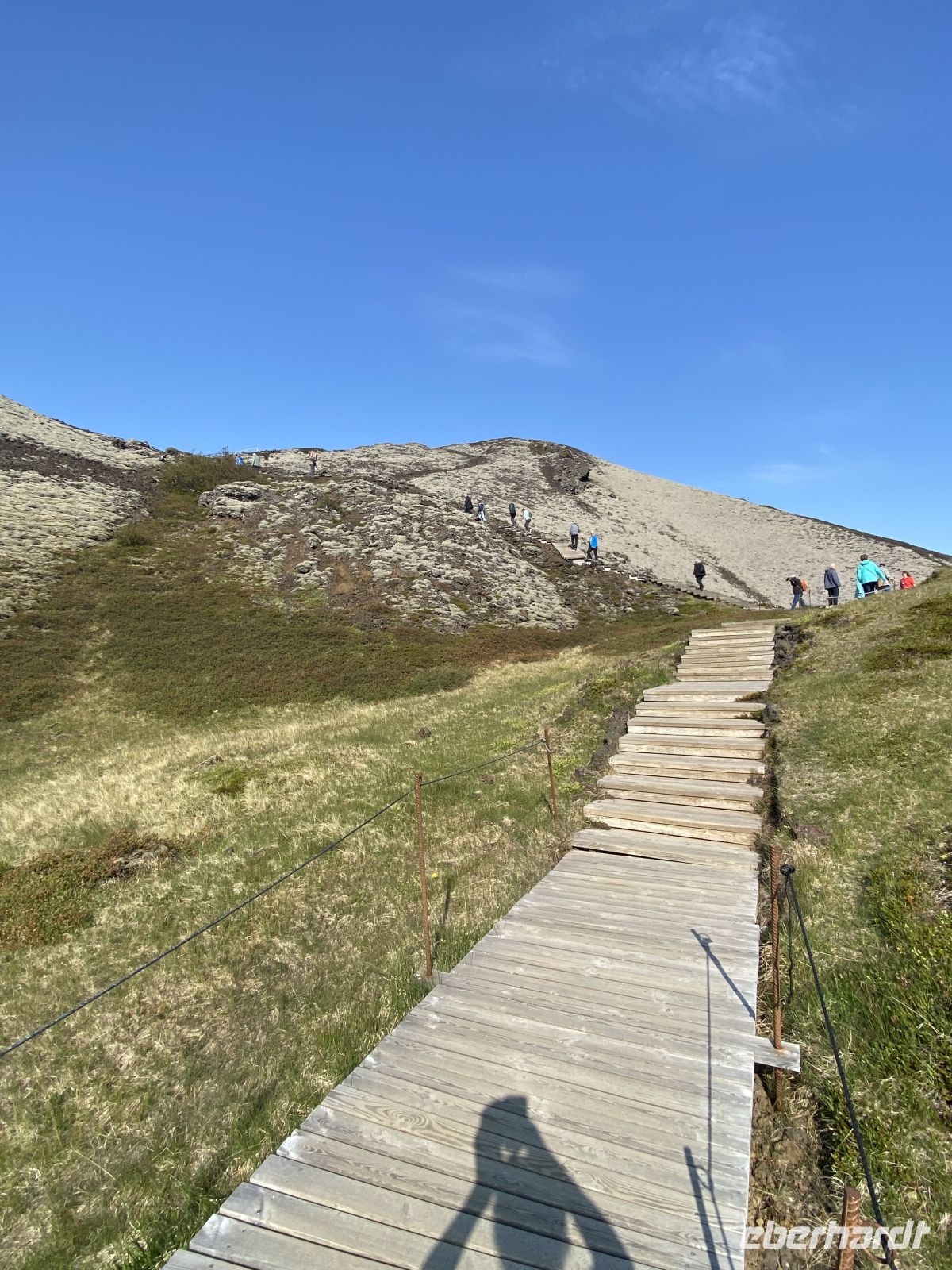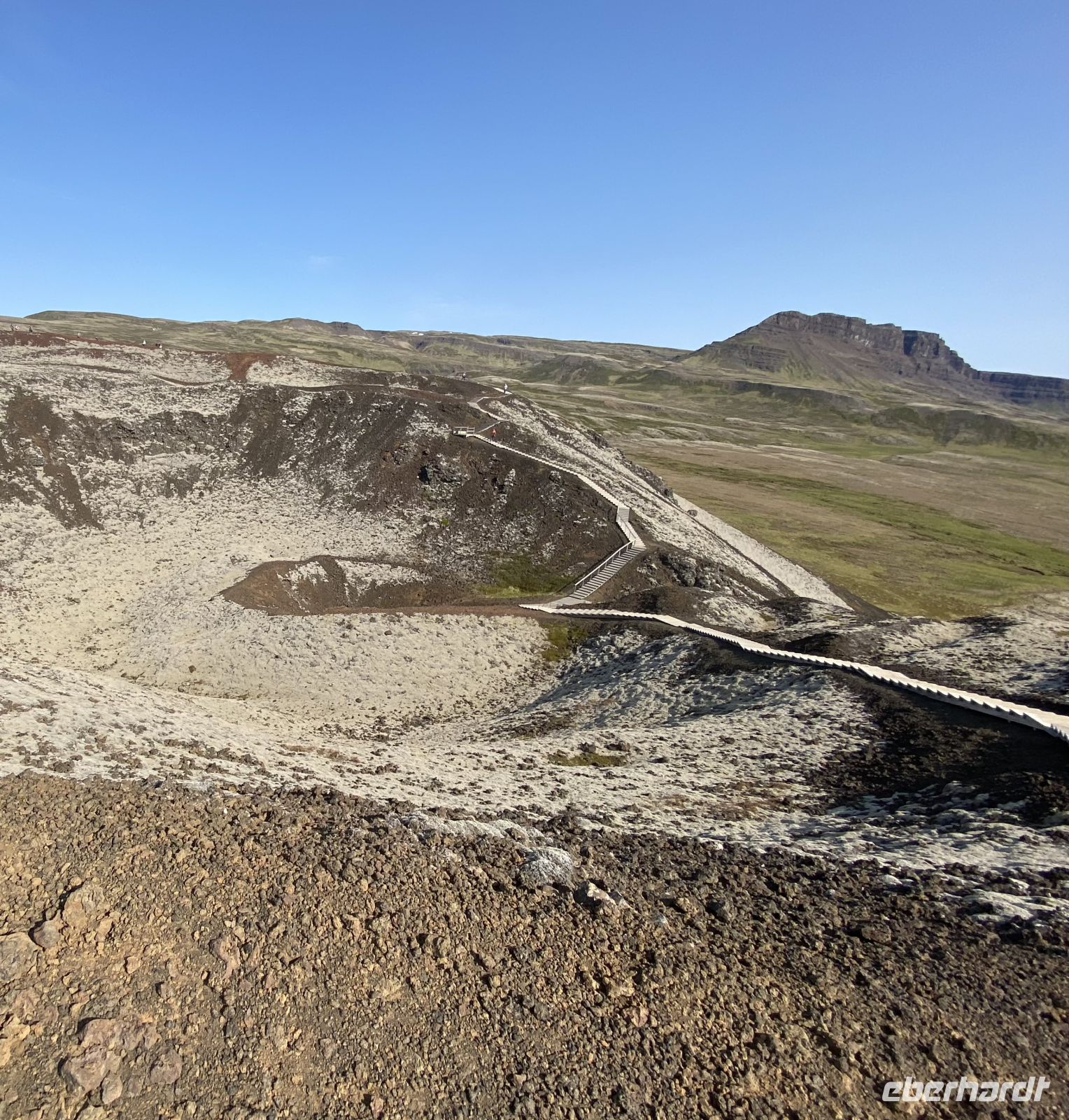 Heute lernen wir eines der längsten Vulkansysteme Islands kennen, es reicht weit nach Westen bis zum Lavafeld Berserkjahraun bei Stykkishólmur und bildet den Gebirgszug Ljósufjöll. Den Namen kann man mit "helle Berge" übersetzen, er leitet sich von sechs Gipfeln ab, die aus lichtem Liparitgestein bestehen.Direkt an der Straße liegt der Krater Grábrók, er besteht aus vulkanischer Schlacke und entstand vor etwa 3600 Jahren. Unterhalb des Kraters befindet sich ein Parkplatz und ein Treppensystem von über 500 Stufen führt bis auf den Kraterrand. Von oben bietet sich ein schöner Blick über das Tal der Norðurá, einem der wichtigsten Lachsflüsse Islands. Wir machen einen Spaziergang am Kraterrand. In Blönduos kehren wir ein zur Mittagspause und anschließend erkunden wir die Hrutey-Insel, die im Gletscherfluss liegt. Danach geht es über die Hochebene Holtavörduheidi nach Norden in eines der bekanntesten Pferdezuchtgebiete Islands.