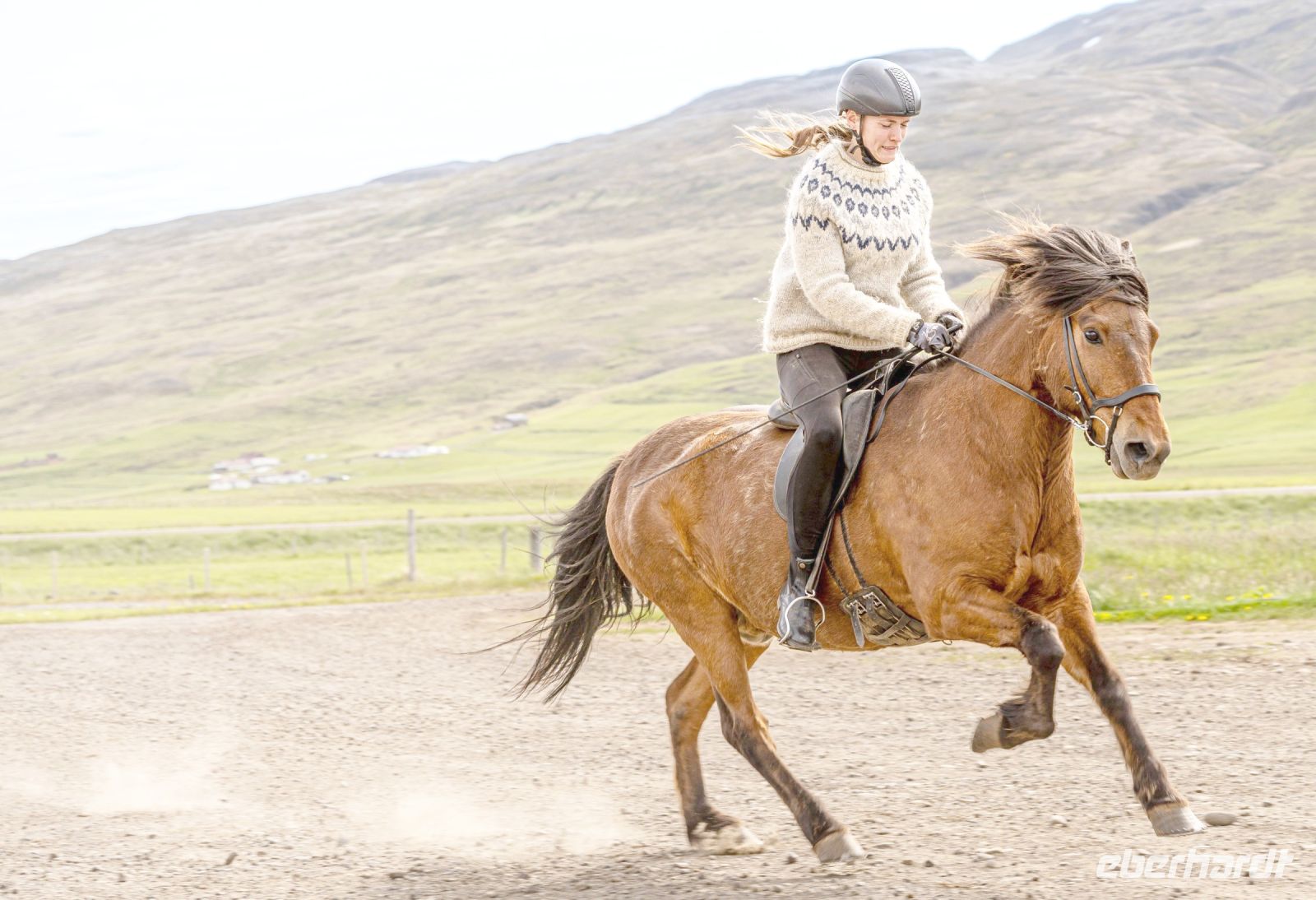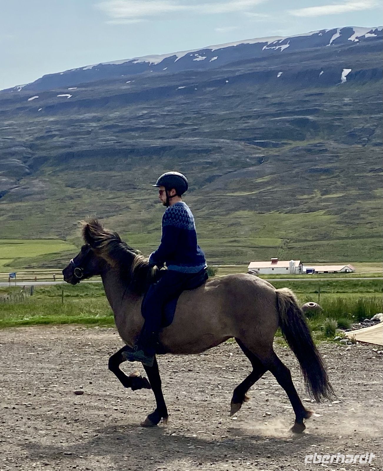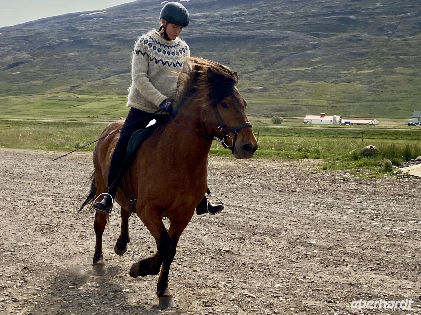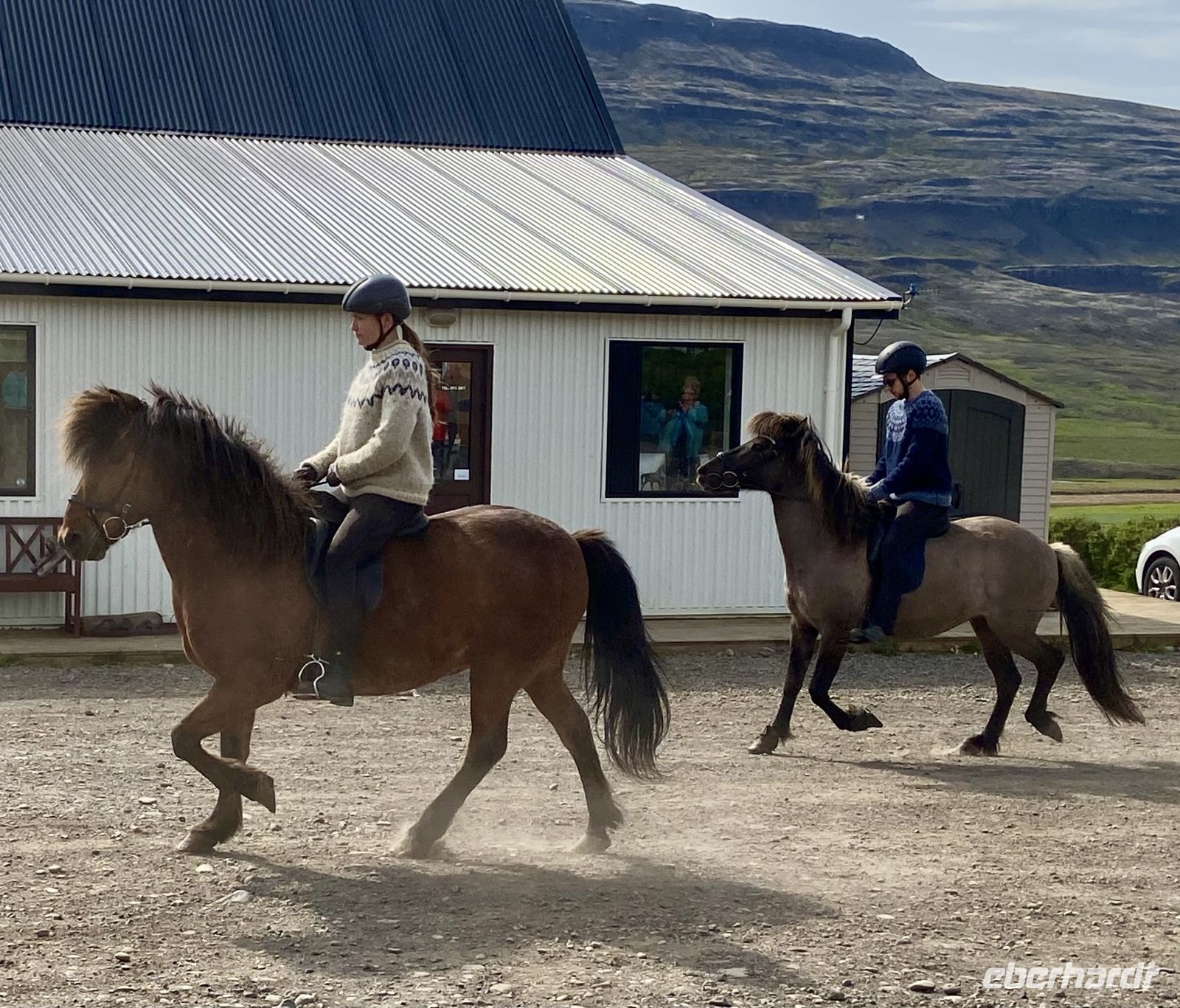 Wir besuchen die Deutsche Evelyn Kuhne auf ihrem Pferdehof und lernen viele interessante Details über die nationale Pferderasse mit ihren außergewöhnlichen Gangarten Tölt und Pass. Die ersten Pferde kamen etwa im 9. Jahrhundert mit den Siedlern nach Island und werden heute noch absolut reinrassig gezüchtet. Es werden keine Pferde auf die Insel importiert und wenn ein Islandpferd verkauft wird und das Land verlässt, darf es nie wieder eingeführt werden, um das Einschleppen von Krankheiten zu verhindern. Trotz der geringen Größe von ca. 140 cm kann es schwere Lasten und Reiter bis etwa 120 kg tragen. Sohn und Schwiegertochter von Evelyn führen uns ihre Reitkünste vor und danach sehen wir die Grashäuser, die sie nach altem Vorbild errichten ließ und sich damit einen Traum erfüllte. Zum Abschluss lädt sie uns ein zu Kaffee und selbstgebackenen Keksen. So lecker, dass wir gerne das Rezept mitnehmen…