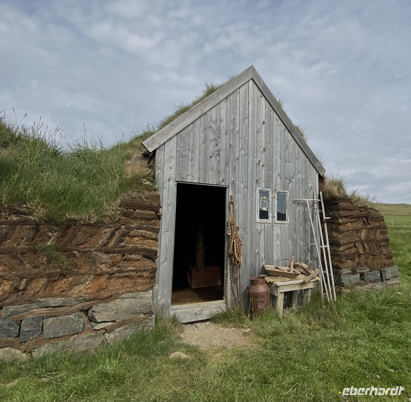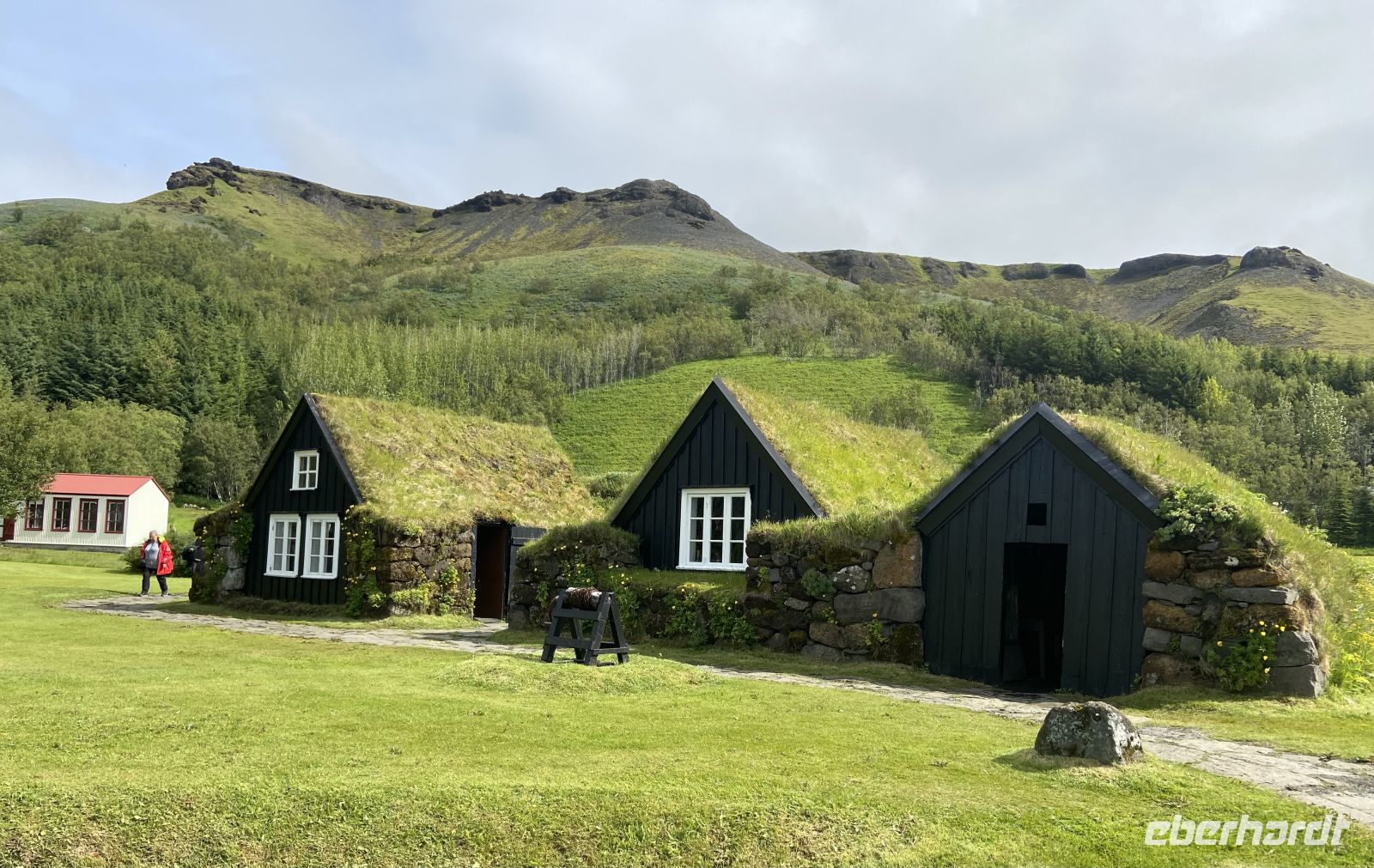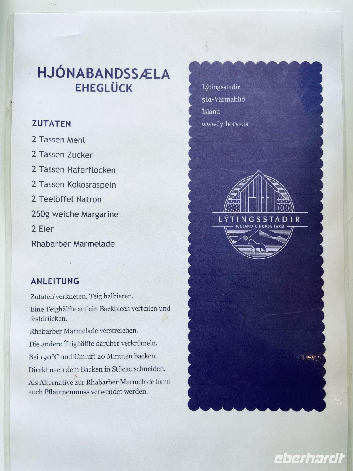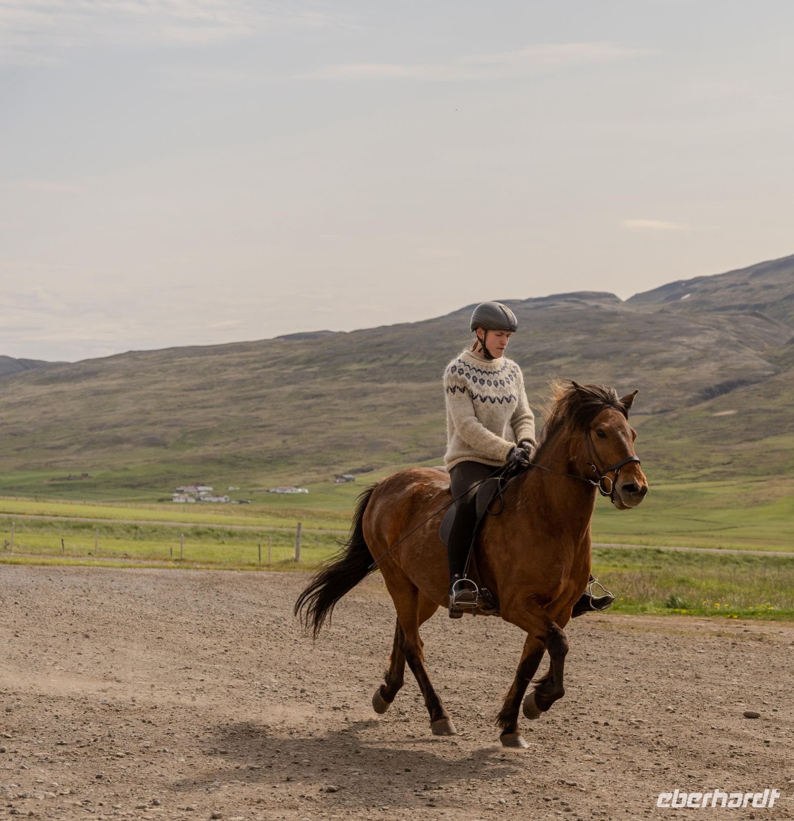 Wir besuchen die Deutsche Evelyn Kuhne auf ihrem Pferdehof und lernen viele interessante Details über die nationale Pferderasse mit ihren außergewöhnlichen Gangarten Tölt und Pass. Die ersten Pferde kamen etwa im 9. Jahrhundert mit den Siedlern nach Island und werden heute noch absolut reinrassig gezüchtet. Es werden keine Pferde auf die Insel importiert und wenn ein Islandpferd verkauft wird und das Land verlässt, darf es nie wieder eingeführt werden, um das Einschleppen von Krankheiten zu verhindern. Trotz der geringen Größe von ca. 140 cm kann es schwere Lasten und Reiter bis etwa 120 kg tragen. Sohn und Schwiegertochter von Evelyn führen uns ihre Reitkünste vor und danach sehen wir die Grashäuser, die sie nach altem Vorbild errichten ließ und sich damit einen Traum erfüllte. Zum Abschluss lädt sie uns ein zu Kaffee und selbstgebackenen Keksen. So lecker, dass wir gerne das Rezept mitnehmen…