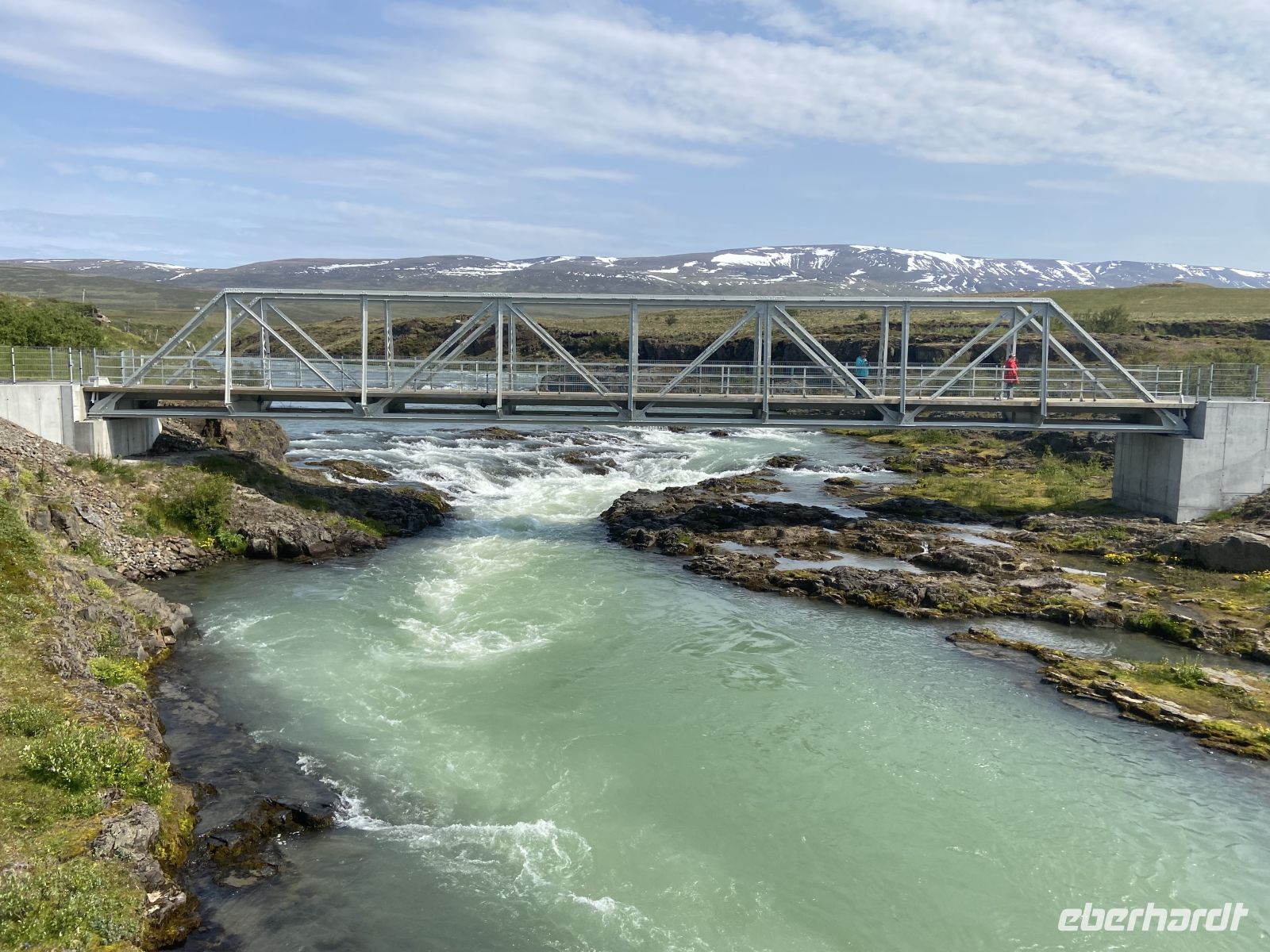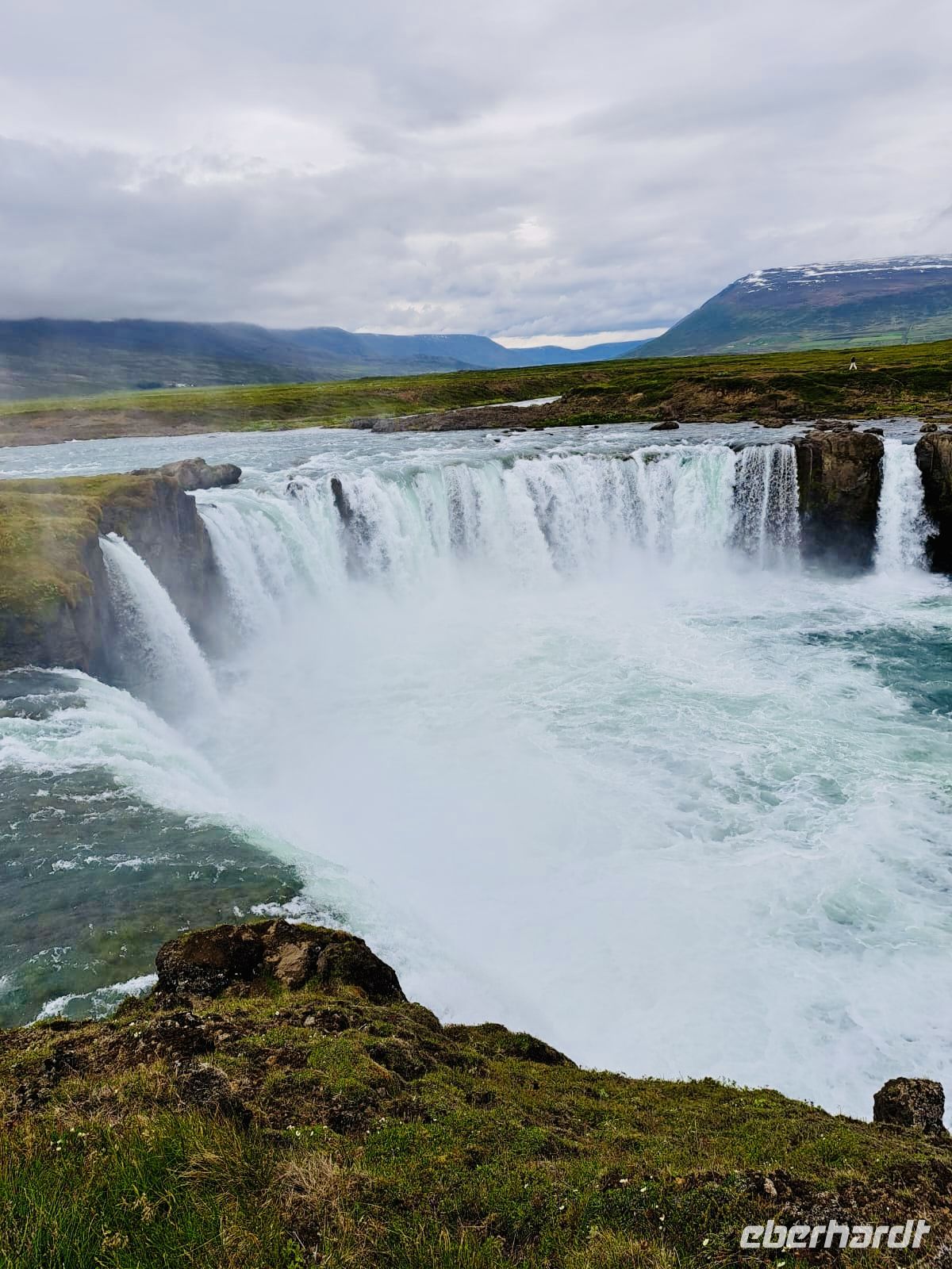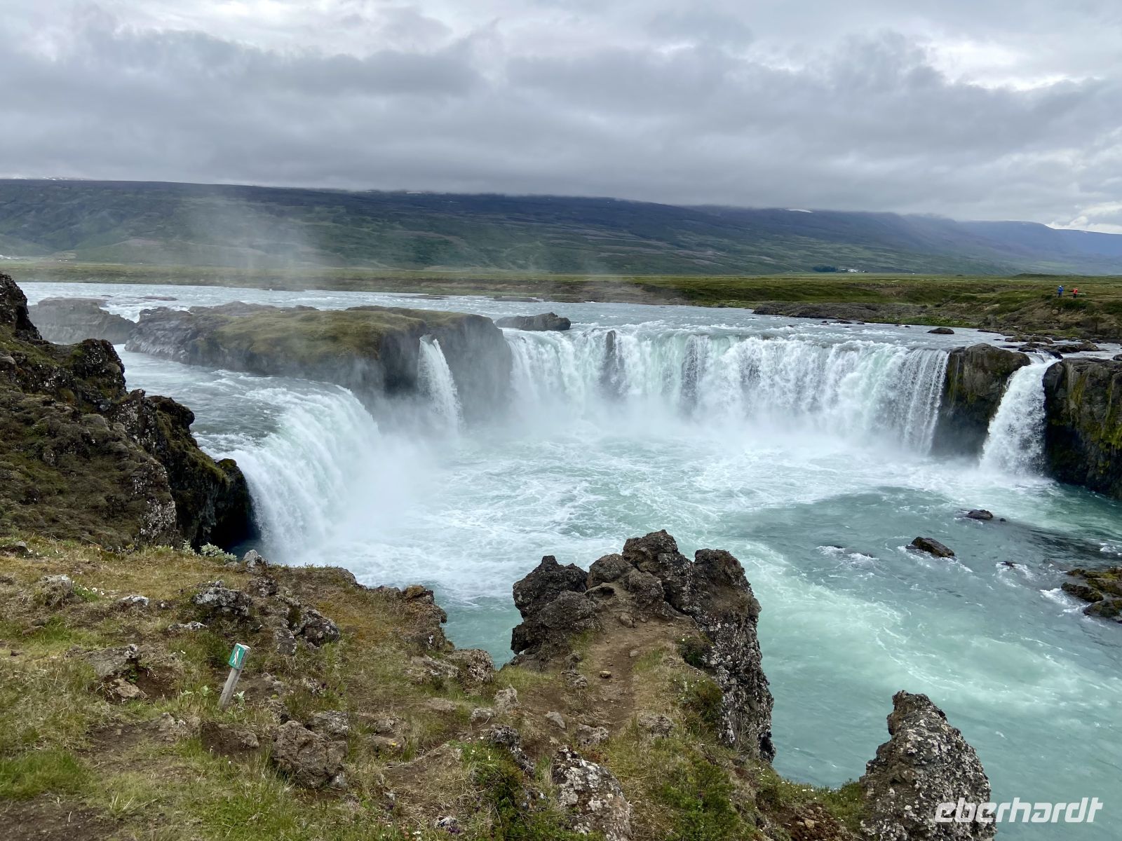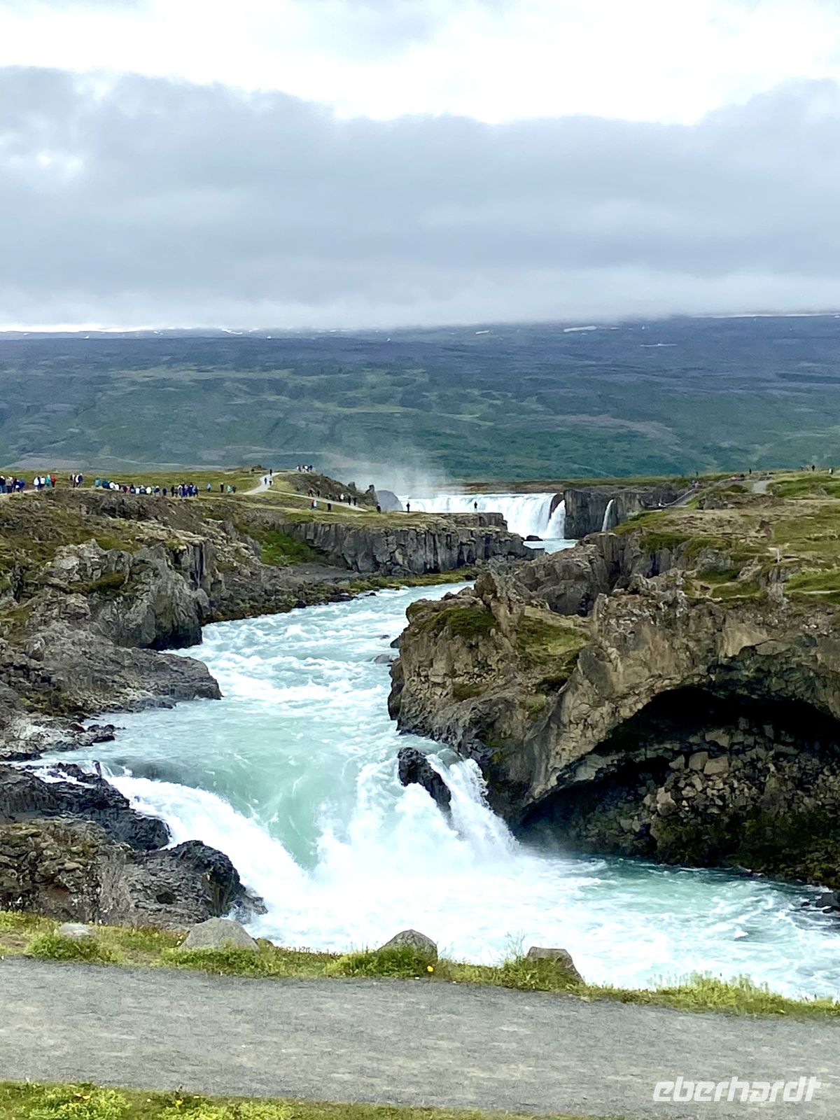 Letzte Station unseres Tagesausfluges ist der Wasserfall Goðafoss. Obgleich nur bescheidene 12 m hoch, beeindruckt die donnernde Kaskade doch durch die Wassermassen, die sich in großer Breite in die Schlucht stürzen. Die Fallkante des Wasserfalls entstand am Rand des Lavastromes Frambruni, der sich vor rund 8000 Jahren aus dem Schildvulkan Trölladyngja ergoß und eine Länge von 105 km erreichte. Der Name des Wasserfalls dürfte wohl mit der Ljósvetninga-Saga im Zusammenhang stehen. Im Jahr 1000 hatte der Gode Þorgeir als Gesetzessprecher auf der Thingsitzung für das Christentum als offizielle Religion gesorgt. Er handelte dabei wahrscheinlich vor allem aus politischen Gründen, denn er fürchtete das vom norwegischen König Olaf angedrohte Holzembargo für den Fall, dass die Isländer Heiden bleiben würden. Das aber hätte das Ende des lebenswichtigen Schiffsbaues bedeutet. Erleichtert hatte Þorgeir nach der erfolgreichen Thingsitzung seine Götterbilder im nächstbesten Wasserfall versenkt, der seitdem Goðafoss, also Götterwasserfall, heißt.