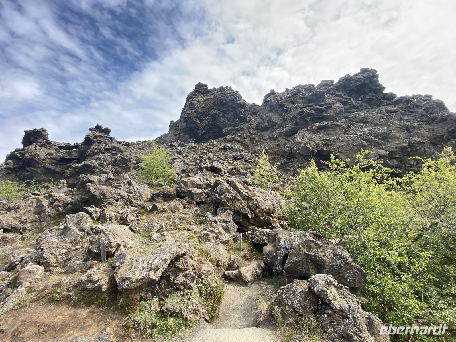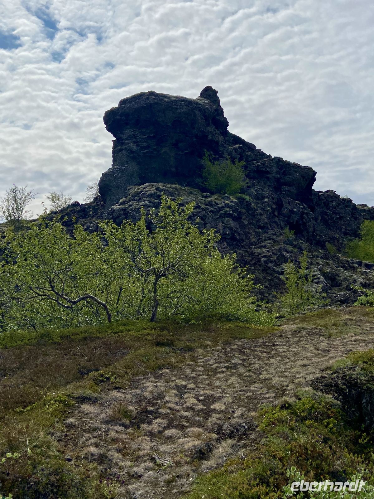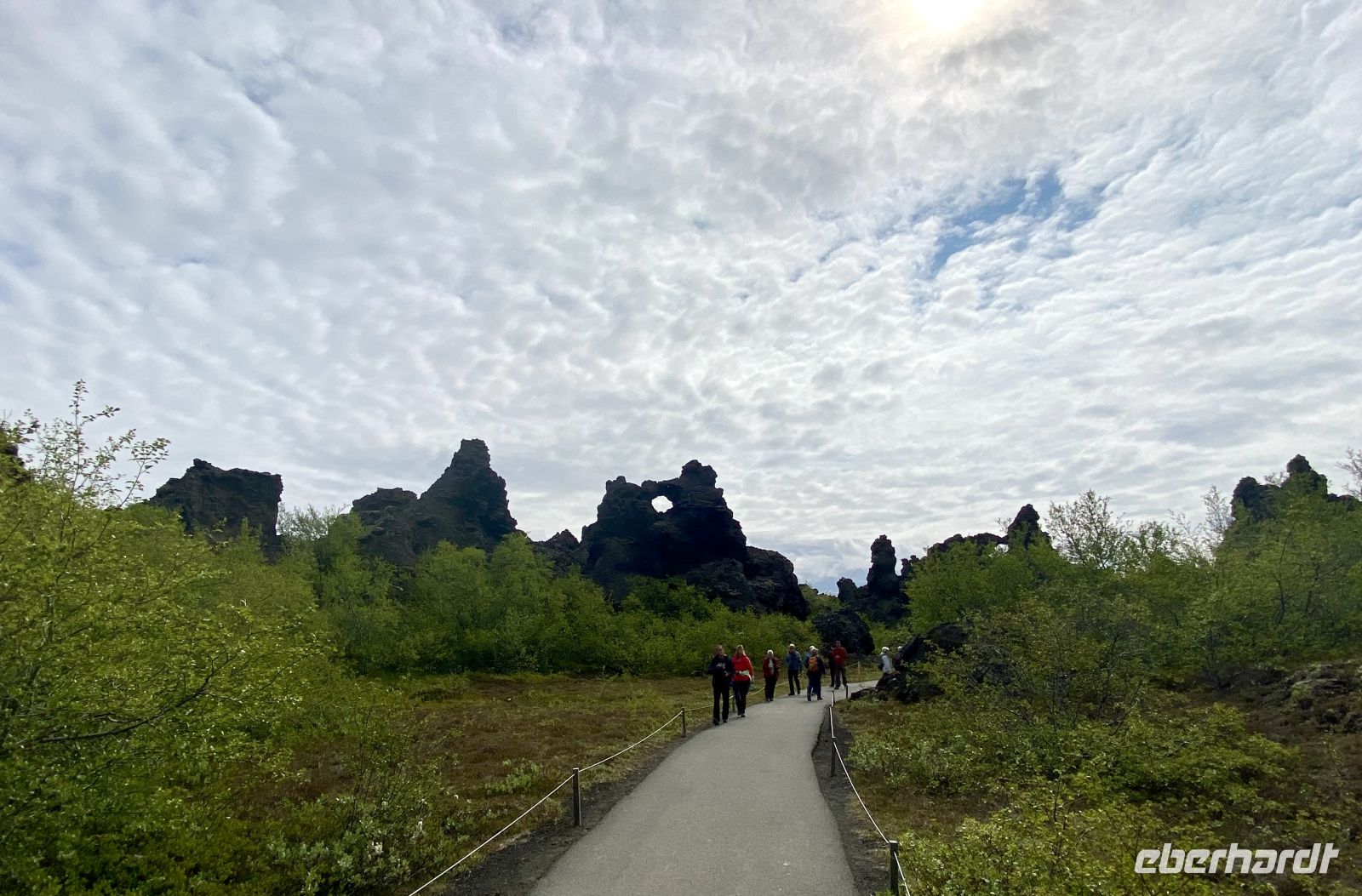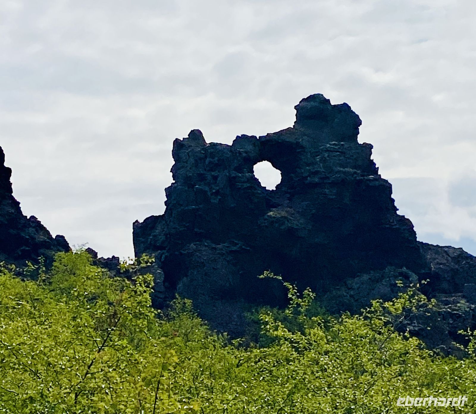 Im abgelegenen Norden Islands findet sich auch eine der ungewöhnlichsten Naturschönheiten des Landes. Die Felsformation Dimmuborgir besteht vollständig aus schwarzem Lavagestein, was ihr eine unheimliche Atmosphäre verleiht. Wenig verwunderlich ranken sich denn auch zahlreiche düstere Legenden um den Ort, allein schon sein Name: Dimmuborgir – die „dunkle Festung“ lässt der Phantasie freien Lauf. Die schroffe Formation erhebt sich in der kargen Landschaft. Aufgetürmt vor Jahrtausenden, recken schwarze Vulkanstein-Kegel drohend in den Himmel.