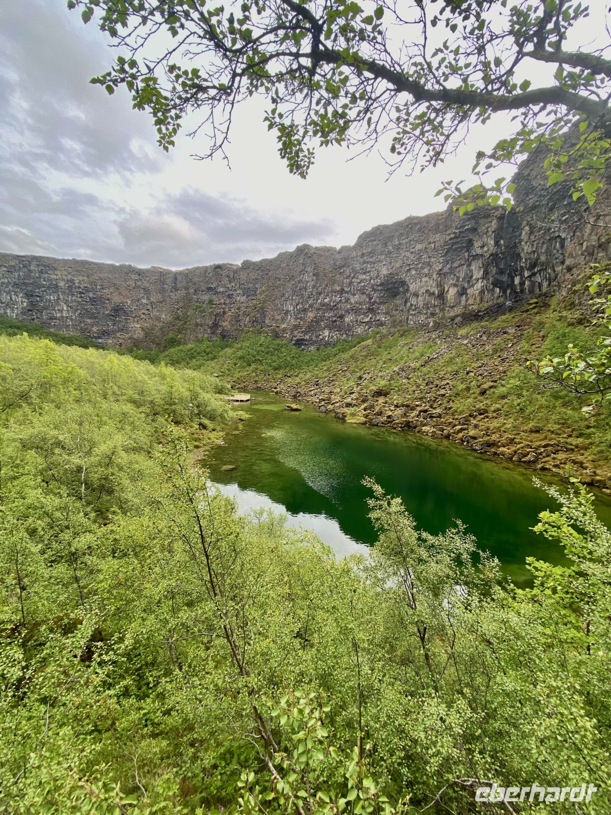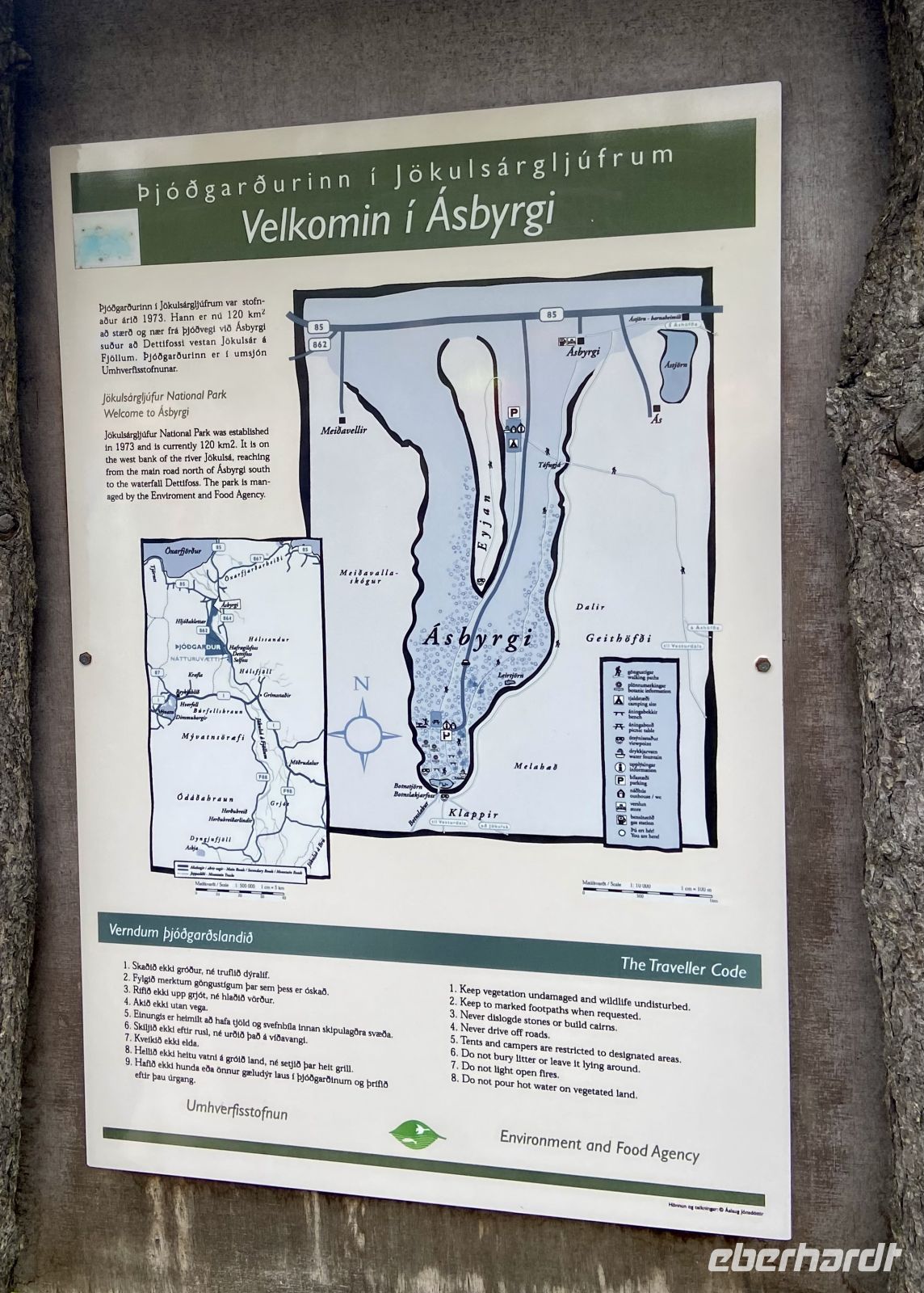 Früher floß der Fluss Jökulsá á Fjöllum etwas weiter im Westen und formte die Ásbyrgi-Schlucht. Zunächst stürzte das Wasser über zwei getrennte Wasserfälle in die Tiefe. Durch rückschreitende Erosion näherten sich die beiden Wasserfälle einander an und bildeten schließlich einen gemeinsamen Fall. Der Wasserfall dürfte ehemals bei einer Breite von gut 3 km die Ausmaße der Niagarfälle erreicht haben. Vor 2.000 Jahren verlagerte sich der Fluss dann nach Osten und hinterließ die hufeisenförmige Schlucht Ásbyrgi. Sie gehört heute zum 1973 gegründeten Nationalpark Jökulsárgljúfur, der die Ásbyrgi und den Jökulsá-Canyon umfaßt, und ist z.T. mit Weiden und Birken bewaldet. Am Ende der Schlucht sind in der oberen Wand noch einige Rinnen erkennbar, durch die das Wasser vormals seinen Weg nahm.