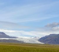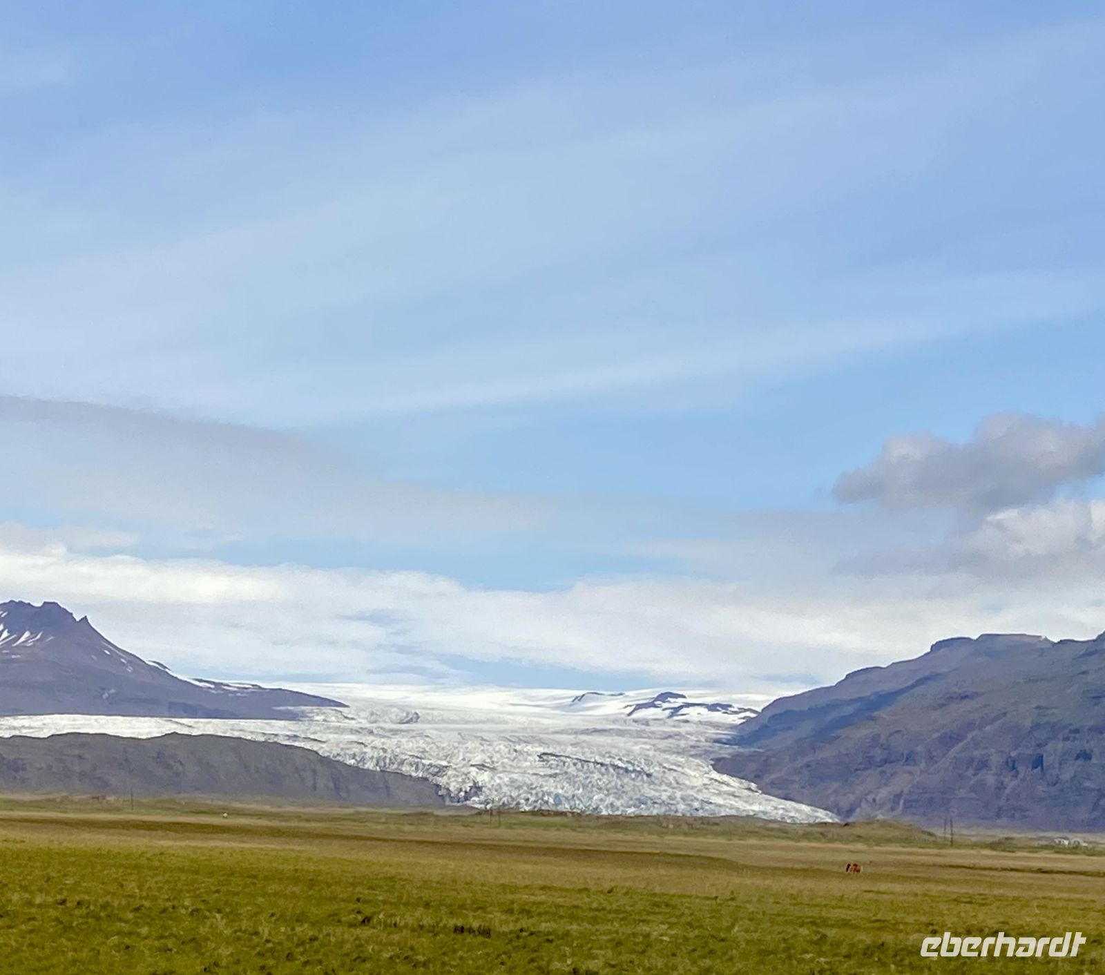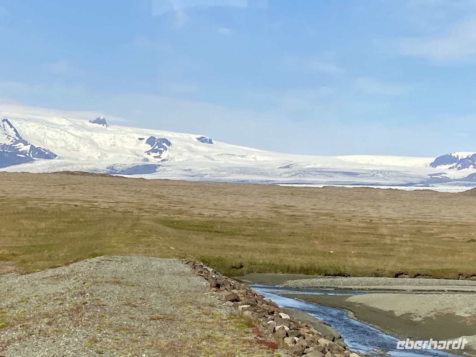 Bei der Weiterfahrt sehen wir am Horizont den Vatnajökull. Er ist nicht nur der größte Gletscher in Island, sondern ganz Europas, bedeckt etwa 8100 Quadratkilometer und besitzt ungefähr 30 Ausläufer. Der Vatnajökull-Nationalpark wurde 2008 auf den Grundlagen des Skaftafell-Nationalparks und Jökulsárgljúfur-Reservoirs gegründet. Der Nationalpark ist die größte geschützte Region in Europa. Neben dem Gletscher bietet der Nationalpark viele weitere natürliche Wunder; riesige Gletscherflüsse, wunderschöne Canyons, blaue Gletscherlagunen und beeindruckende Wasserfälle.