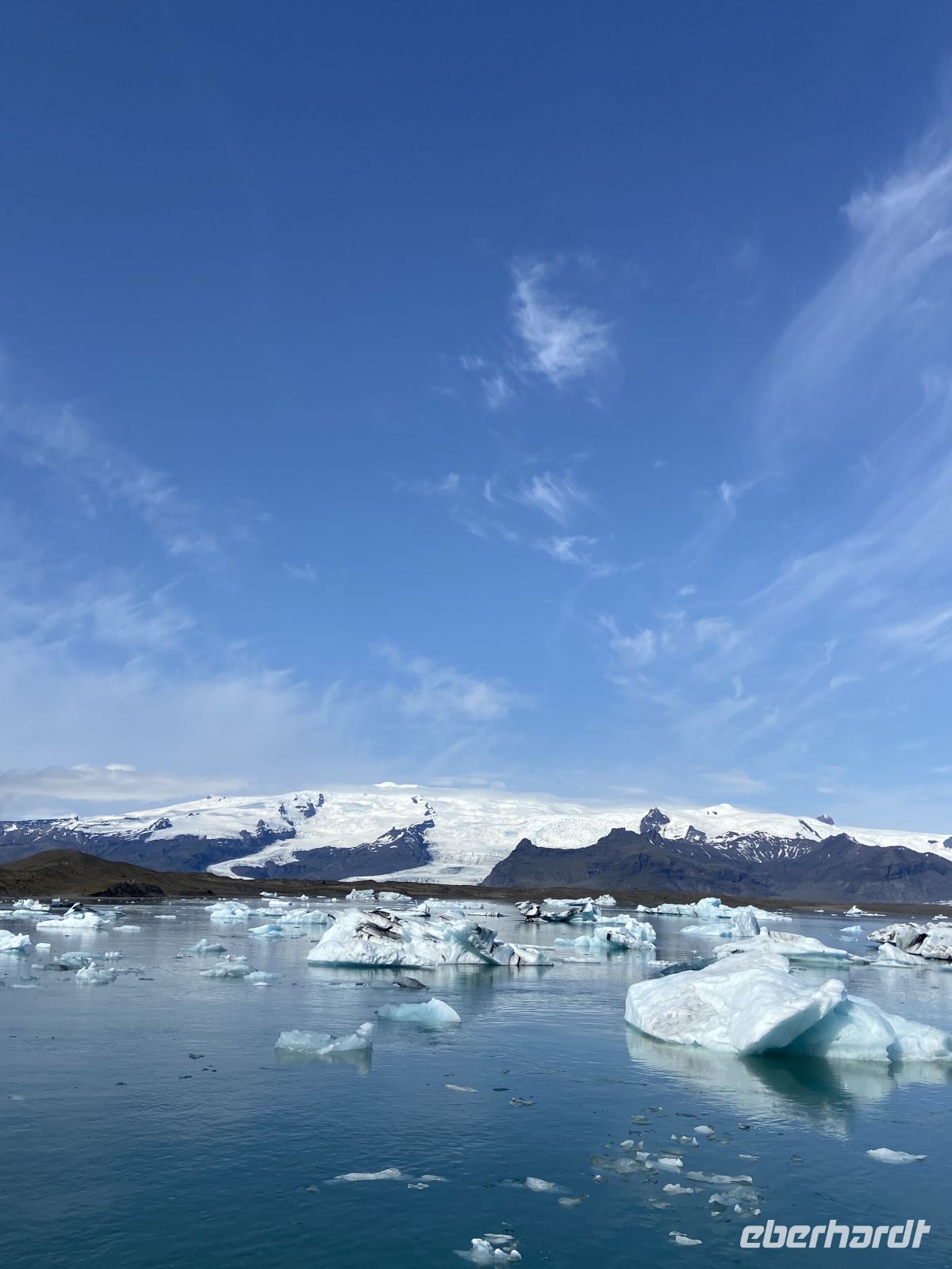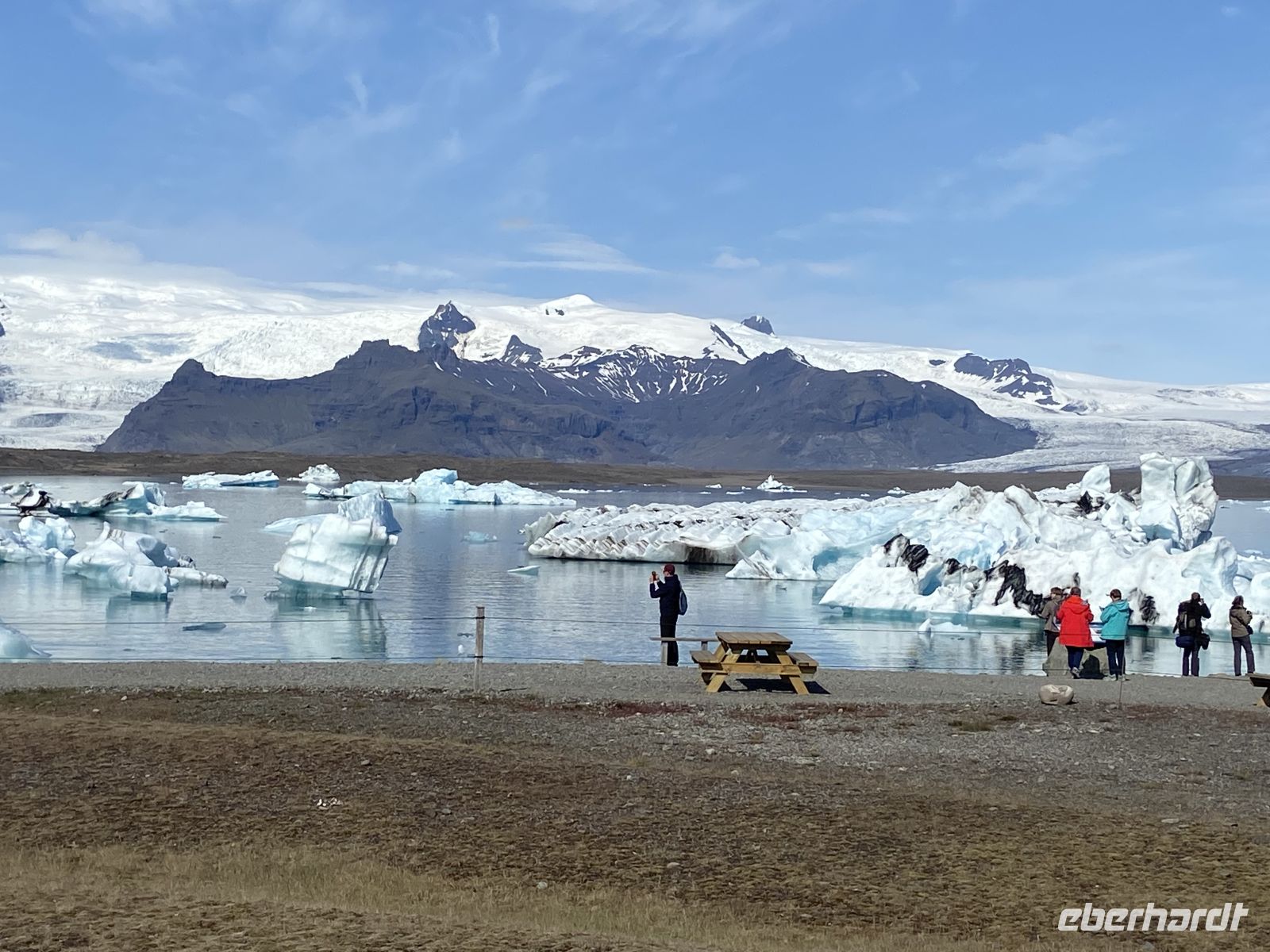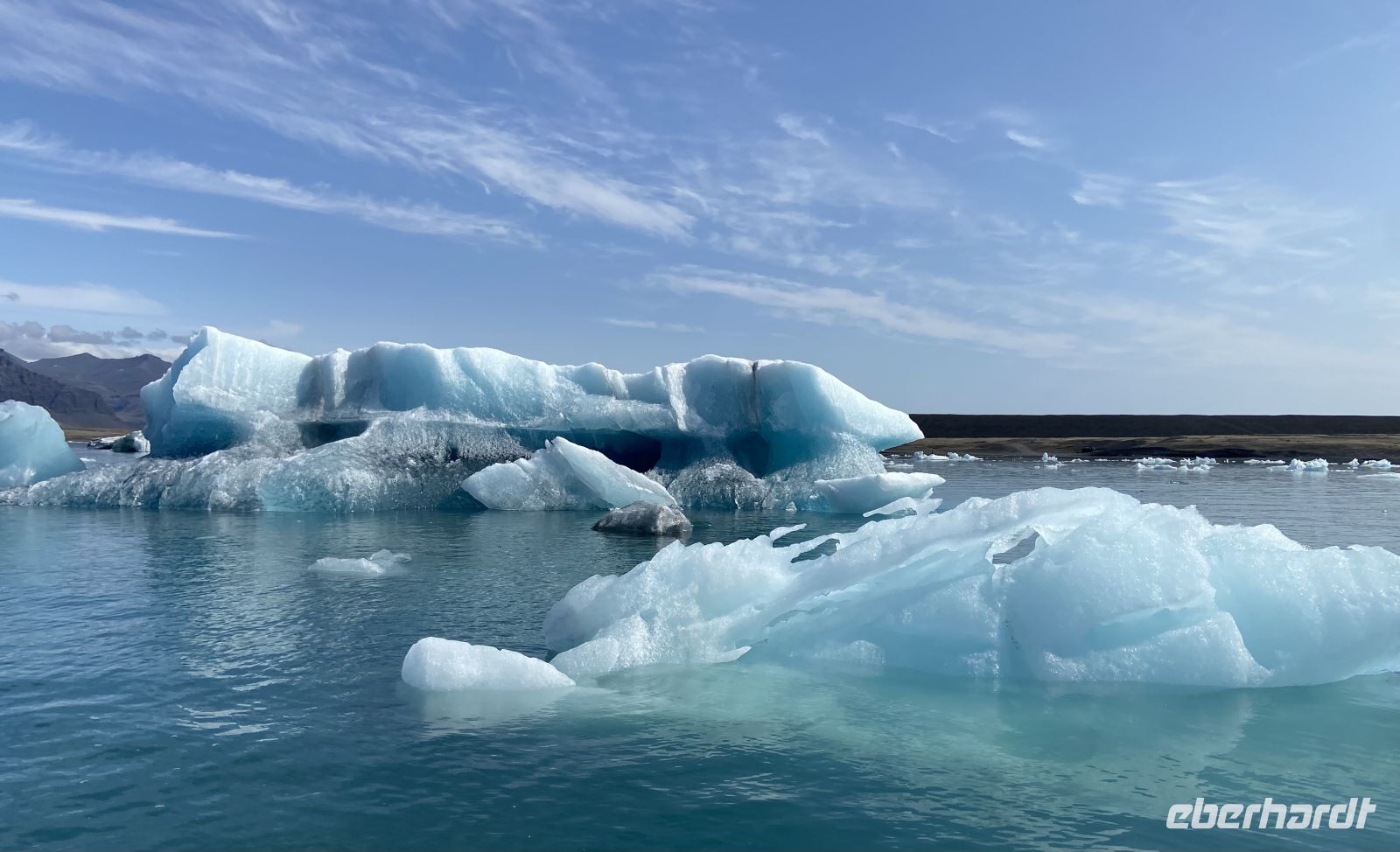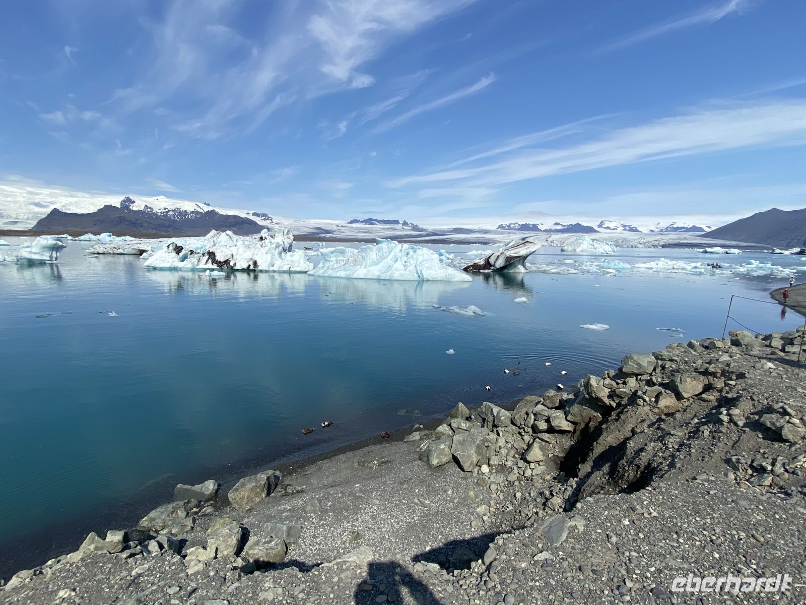 Highlight des Tages ist heute die Gletscherlagune Jökulsarlon an der Südküste der Insel. Nicht nur als Filmkulisse („James Bond“, „Tomb Raider", „Batman“) ist Jökulsarlon bekannt, sondern auch als faszinierendes Naturschauspiel. Für uns geht es von Land, gesichert mit Rettungswesten, per Amphibienfahrzeug hinein in die Lagune. Der Breidamerkurjökull, Teil des riesigen Vatnajökulls, kalbt in einen bis zu 248 m tiefen Gletschersee. Etwa 10% der Eisberge sind in den verschiedensten Farben über der Wasseroberfläche zu bestaunen, 90% liegen darunter. Die Wassertemperatur beträgt zwischen 2 und 7 Grad, während das Meer mit etwa 12 Grad wärmer ist.