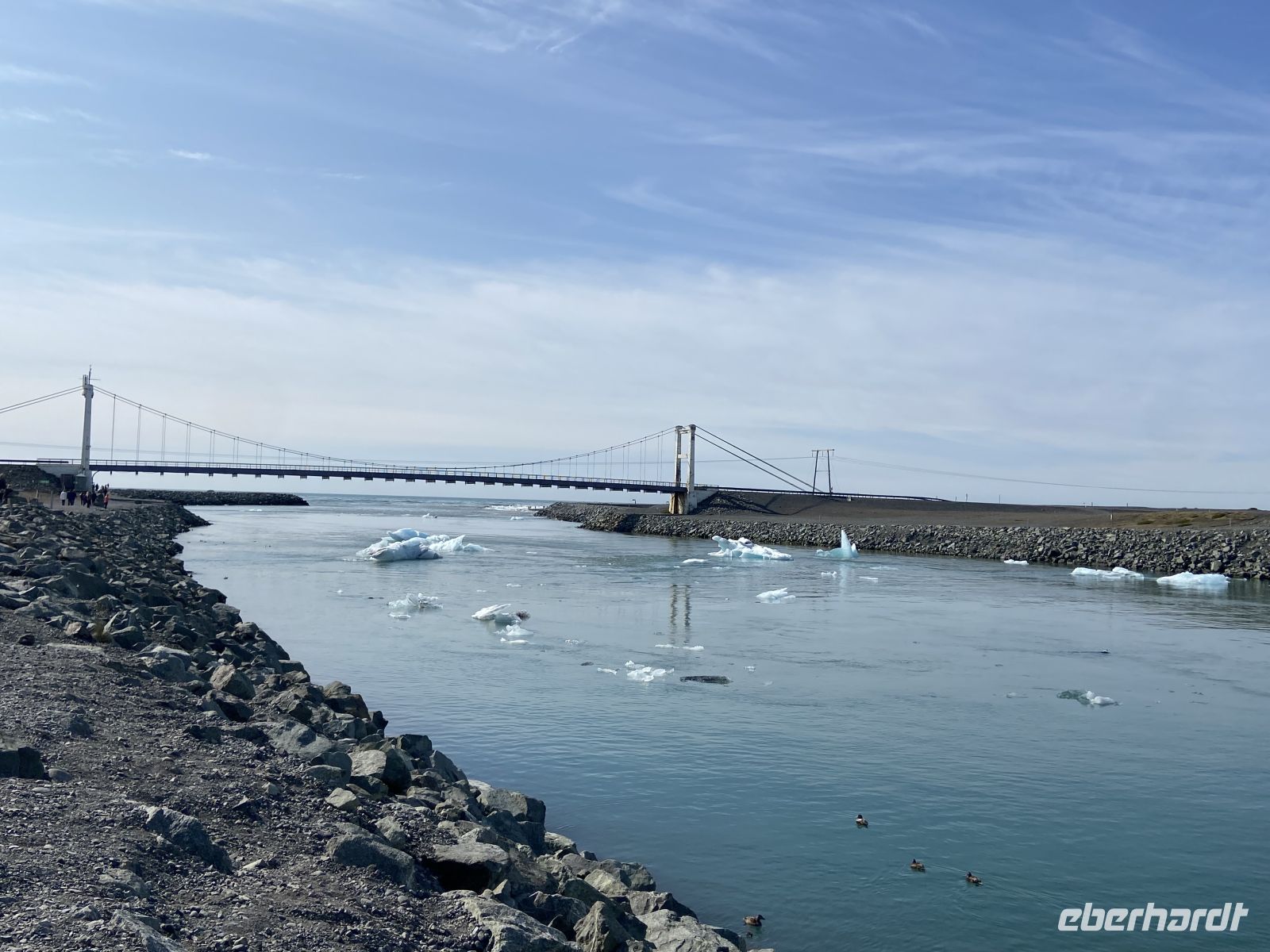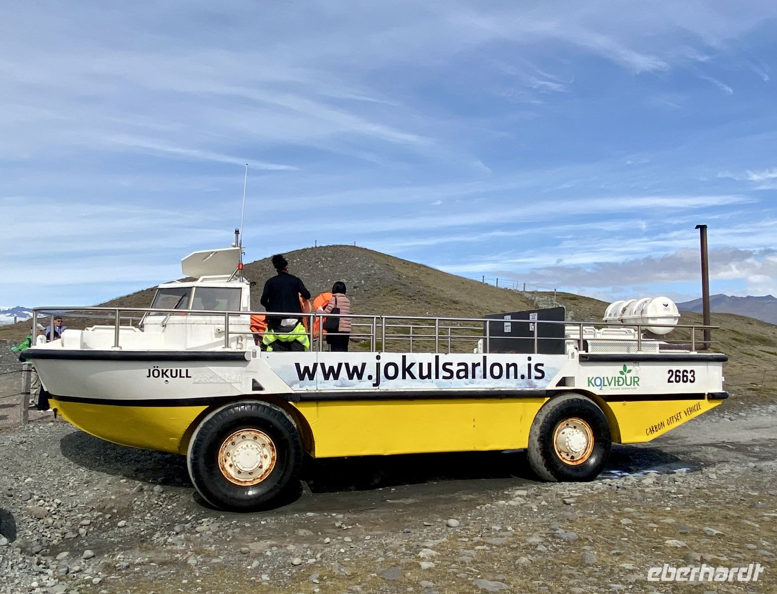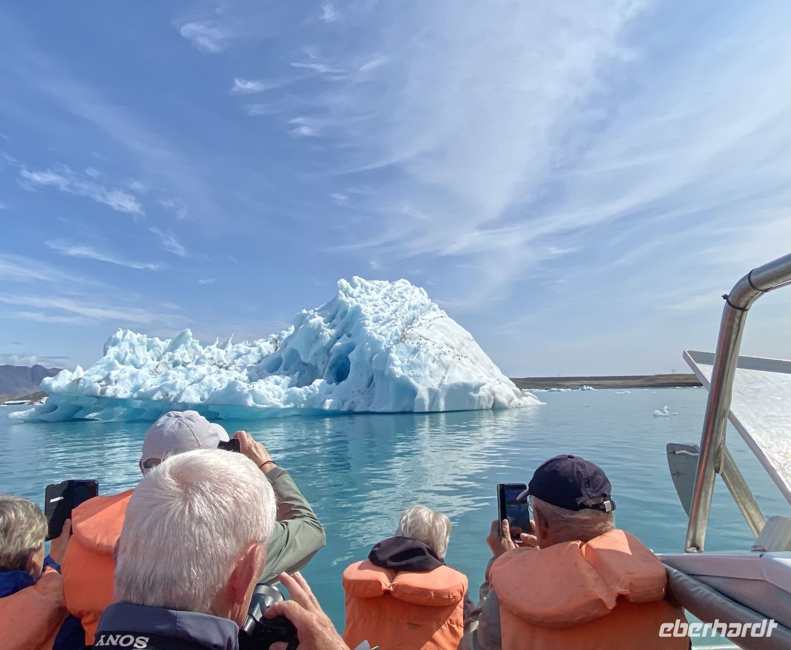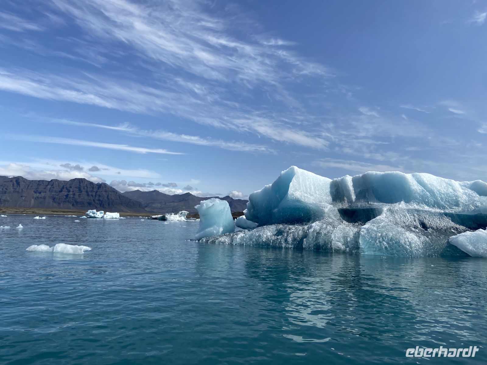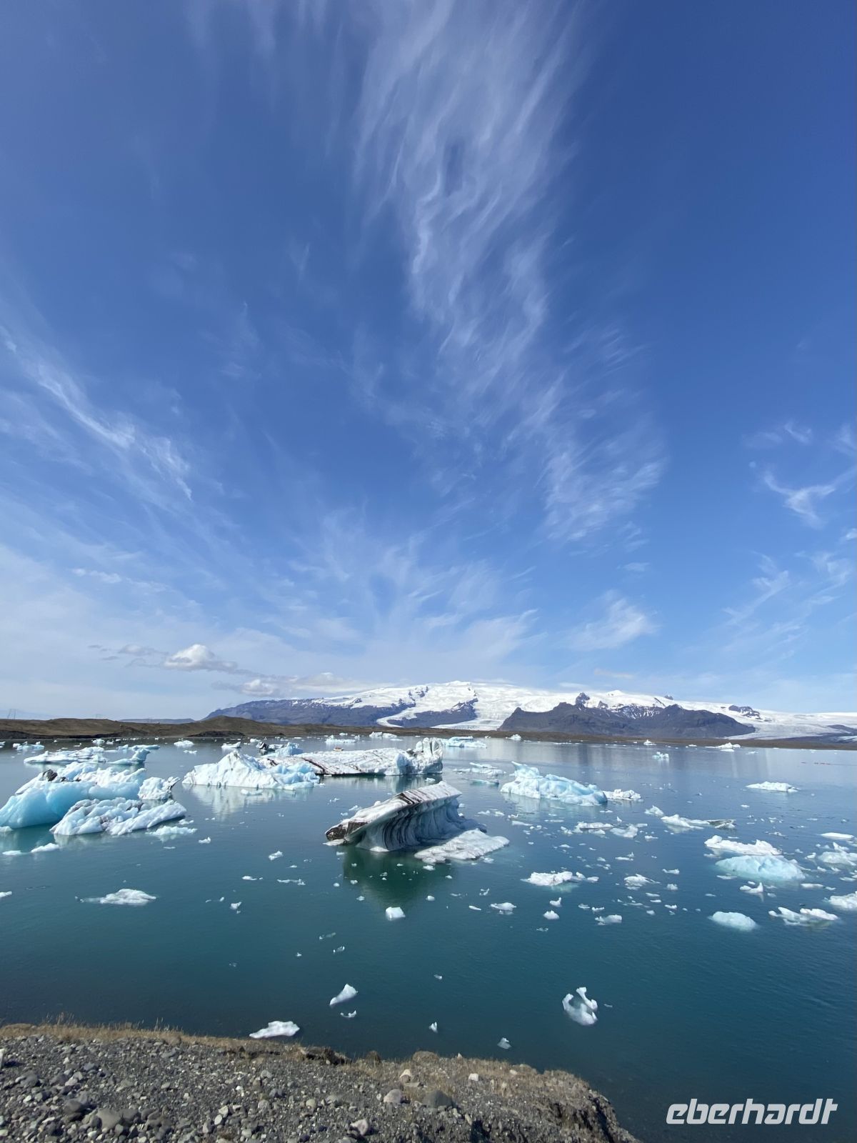 Highlight des Tages ist heute die Gletscherlagune Jökulsarlon an der Südküste der Insel. Nicht nur als Filmkulisse („James Bond“, „Tomb Raider", „Batman“) ist Jökulsarlon bekannt, sondern auch als faszinierendes Naturschauspiel. Für uns geht es von Land, gesichert mit Rettungswesten, per Amphibienfahrzeug hinein in die Lagune. Der Breidamerkurjökull, Teil des riesigen Vatnajökulls, kalbt in einen bis zu 248 m tiefen Gletschersee. Etwa 10% der Eisberge sind in den verschiedensten Farben über der Wasseroberfläche zu bestaunen, 90% liegen darunter. Die Wassertemperatur beträgt zwischen 2 und 7 Grad, während das Meer mit etwa 12 Grad wärmer ist.