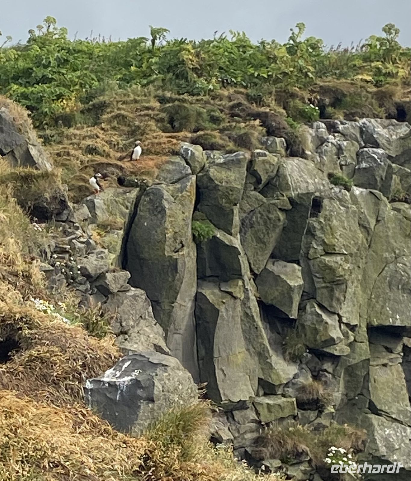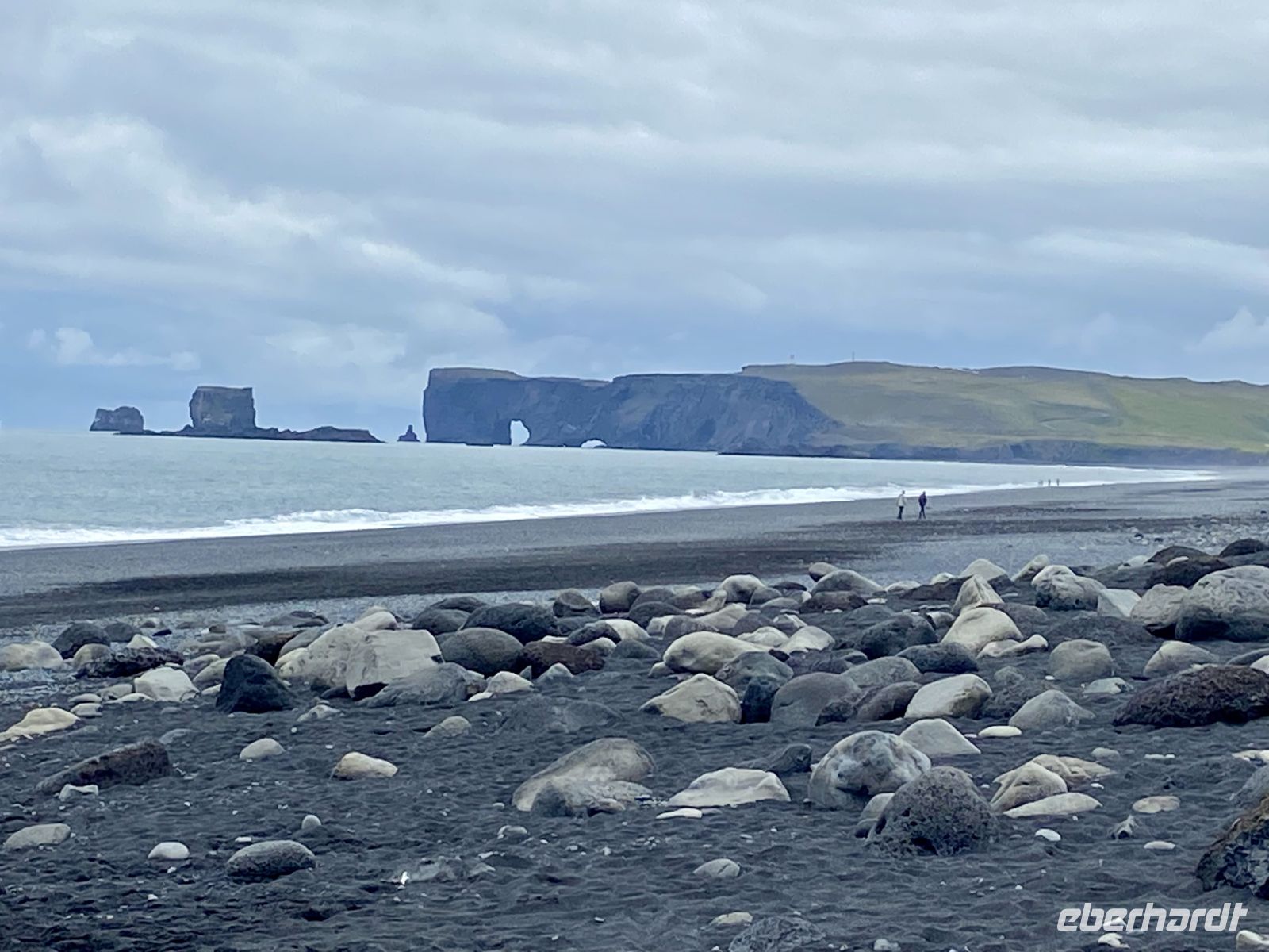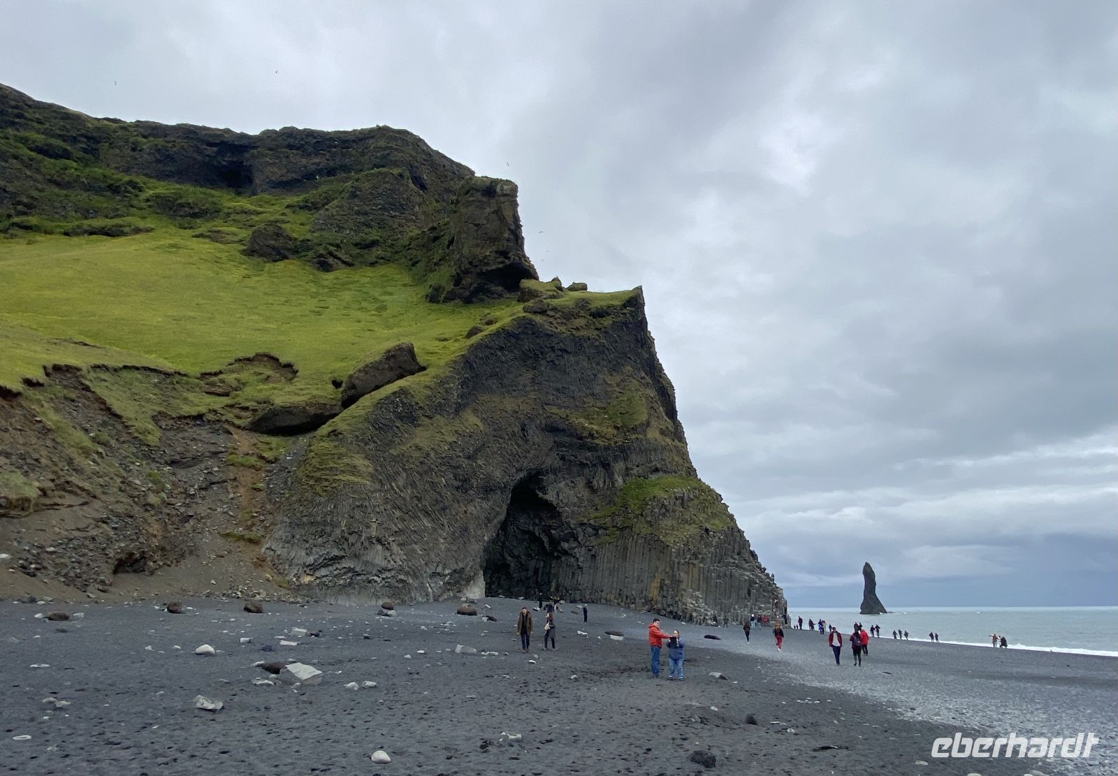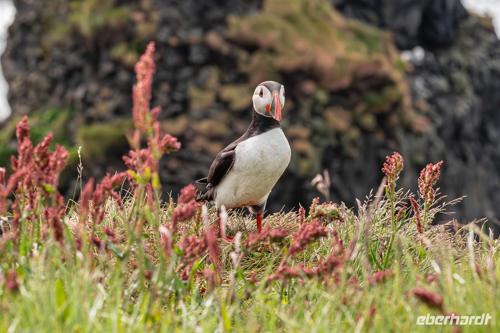 Der Kreis unserer Reise schließt sich langsam, durch den Süden der Insel fahren wir schließlich zurück nach Reykjavik. Hier sind in der Nähe des Ortes Vík in den vergangenen 2 Millionen Jahren einige Vulkaninseln entstanden. Auch unter dem Gletscher Mýrdalsjökull sind immer wieder Vulkane ausgebrochen, unter anderem die berüchtigte Katla. Die Ausbrüche haben zu gewaltigen Gletscherläufen geführt und so wurden im Laufe der Zeit einige der Vulkaninseln durch das aufgeschwemmte Neuland mit dem Festland verbunden. Eine dieser ehemaligen Inseln ist das Kap Dyrhólaey. Die Wände der Vulkanruine ragen bis zu einer Höhe von 120 m steil empor und bieten zahleichen Seevögeln hervorragende Nistmöglichkeiten. Bekannt wurde Dyrhólaey aber vor allem wegen des gewaltigen Felsentores, das die Brandung in Jahrtausenden geschaffen hat. Und wieder haben wir großes Glück (wie so oft auf dieser Reise): Obwohl noch keine Brutsaison ist, sehen wir in den Felsen einige Papageientaucher, die im Hochsommer hier in Scharen mit ihrem Nachwuchs zu finden sind. Alle Fotografen unserer Gruppe sind mehr als begeistert, aber auch ohne Foto macht es Freude, die putzigen Tiere zu beobachten.