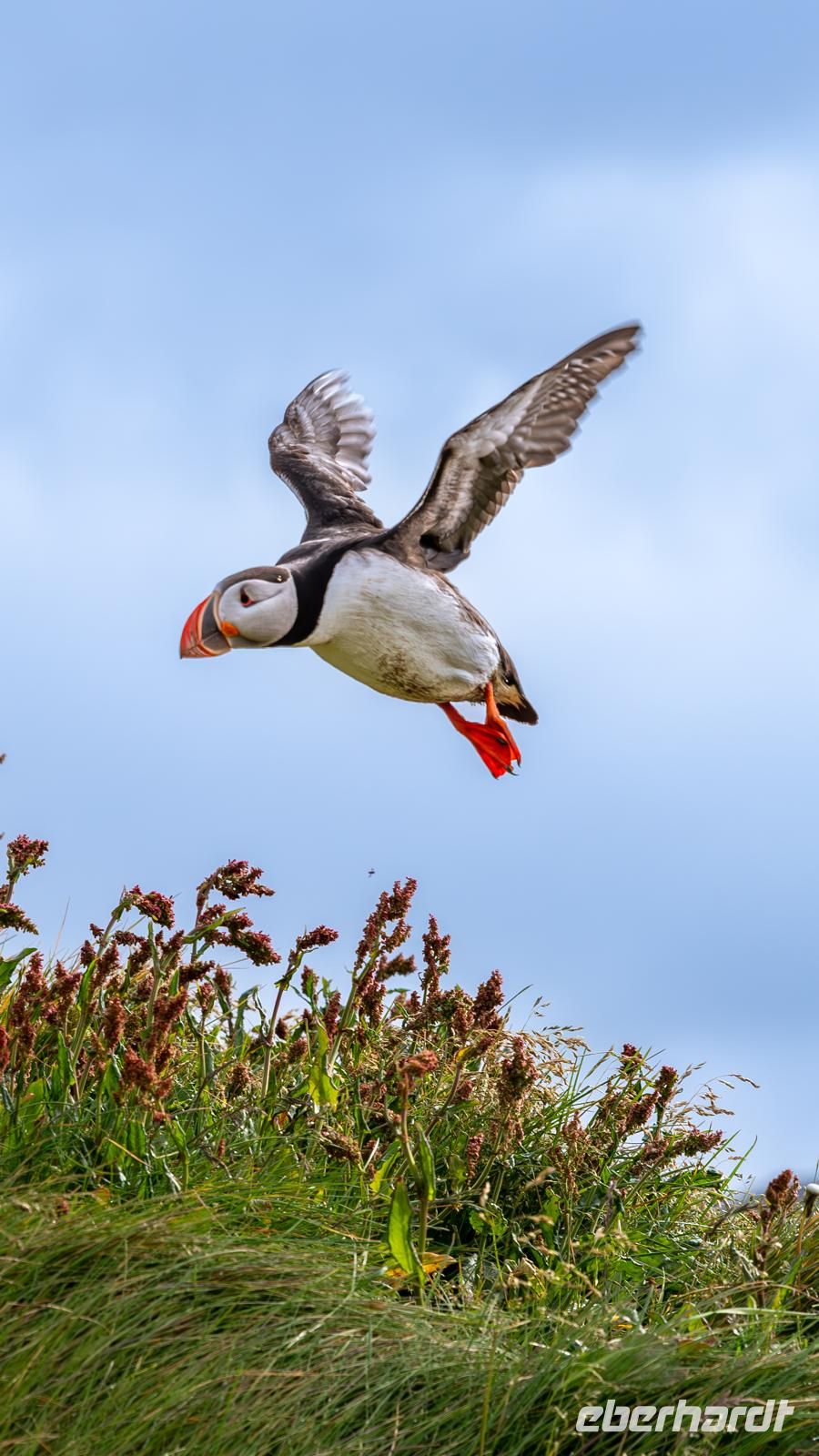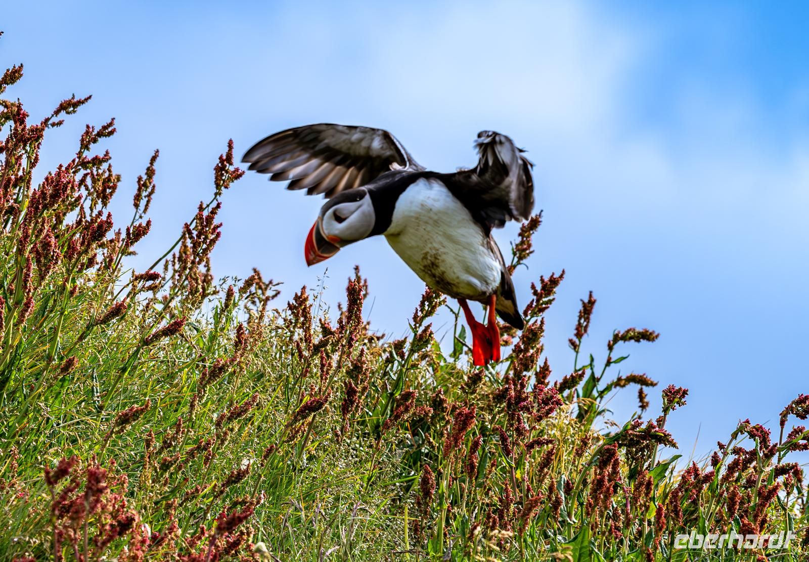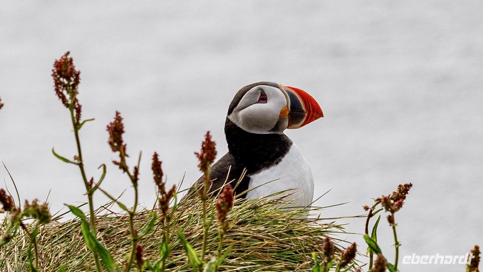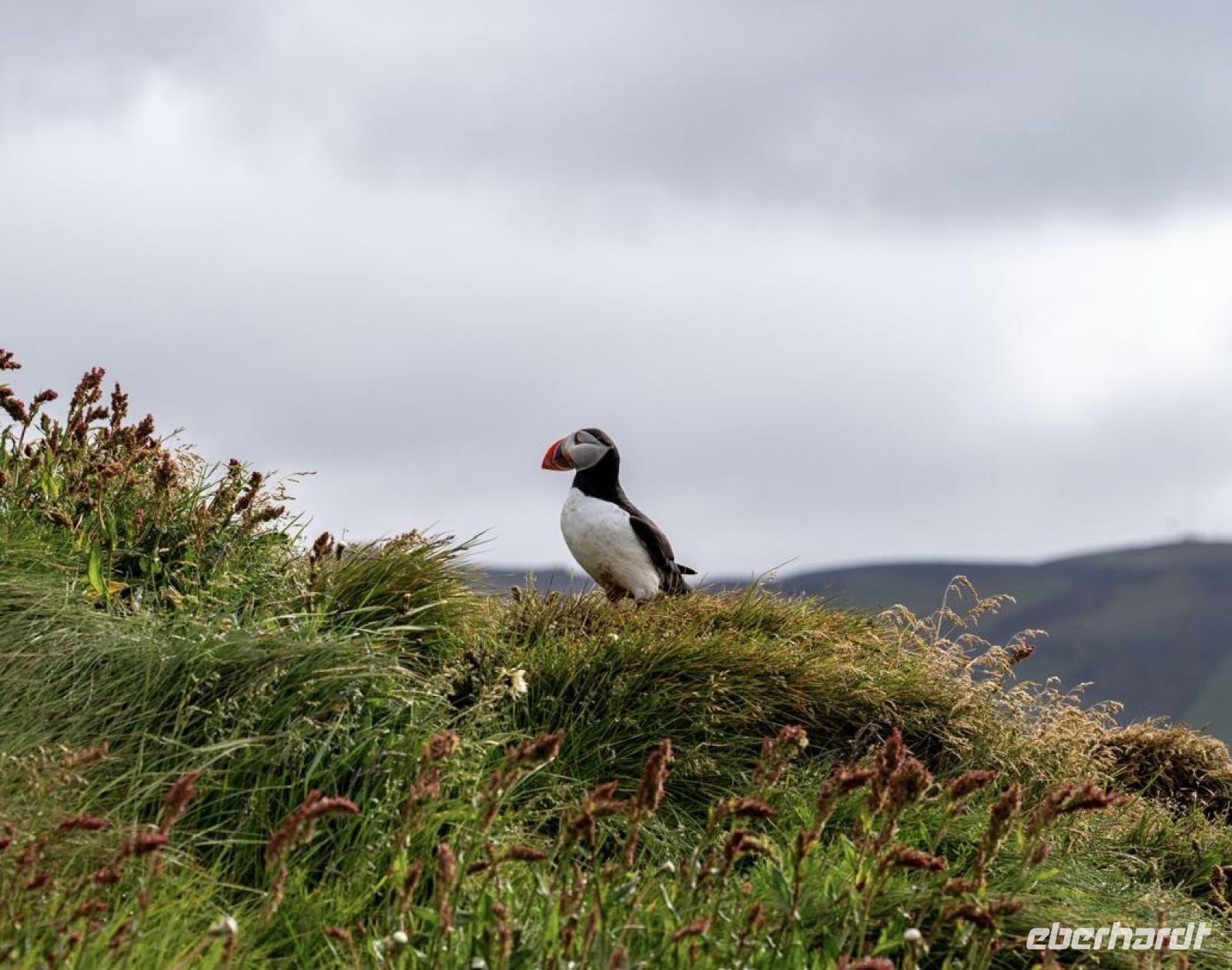 Der Kreis unserer Reise schließt sich langsam, durch den Süden der Insel fahren wir schließlich zurück nach Reykjavik. Hier sind in der Nähe des Ortes Vík in den vergangenen 2 Millionen Jahren einige Vulkaninseln entstanden. Auch unter dem Gletscher Mýrdalsjökull sind immer wieder Vulkane ausgebrochen, unter anderem die berüchtigte Katla. Die Ausbrüche haben zu gewaltigen Gletscherläufen geführt und so wurden im Laufe der Zeit einige der Vulkaninseln durch das aufgeschwemmte Neuland mit dem Festland verbunden. Eine dieser ehemaligen Inseln ist das Kap Dyrhólaey. Die Wände der Vulkanruine ragen bis zu einer Höhe von 120 m steil empor und bieten zahleichen Seevögeln hervorragende Nistmöglichkeiten. Bekannt wurde Dyrhólaey aber vor allem wegen des gewaltigen Felsentores, das die Brandung in Jahrtausenden geschaffen hat. Und wieder haben wir großes Glück (wie so oft auf dieser Reise): Obwohl noch keine Brutsaison ist, sehen wir in den Felsen einige Papageientaucher, die im Hochsommer hier in Scharen mit ihrem Nachwuchs zu finden sind. Alle Fotografen unserer Gruppe sind mehr als begeistert, aber auch ohne Foto macht es Freude, die putzigen Tiere zu beobachten.