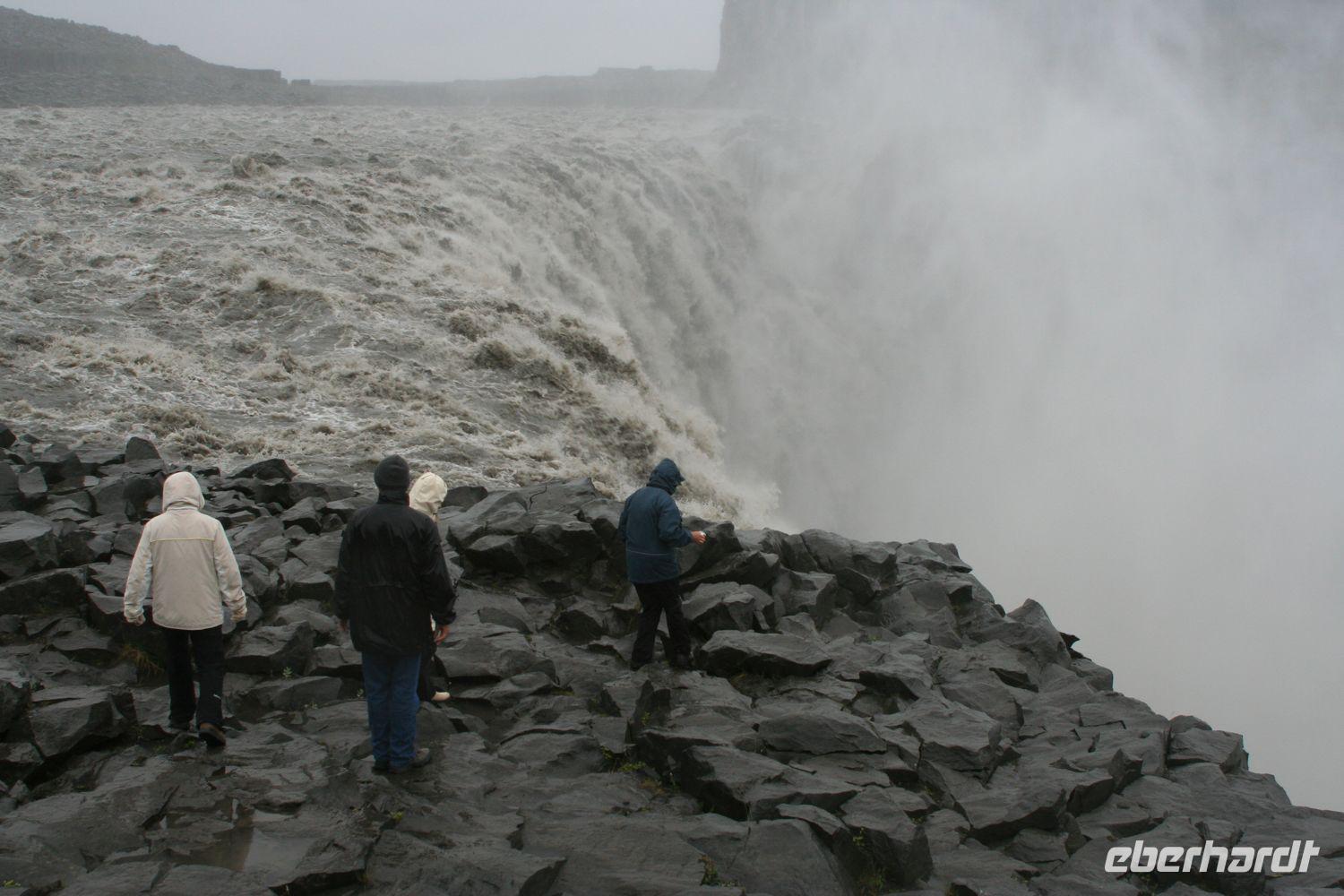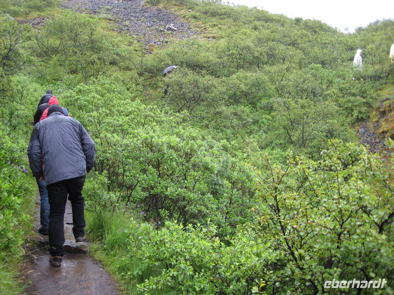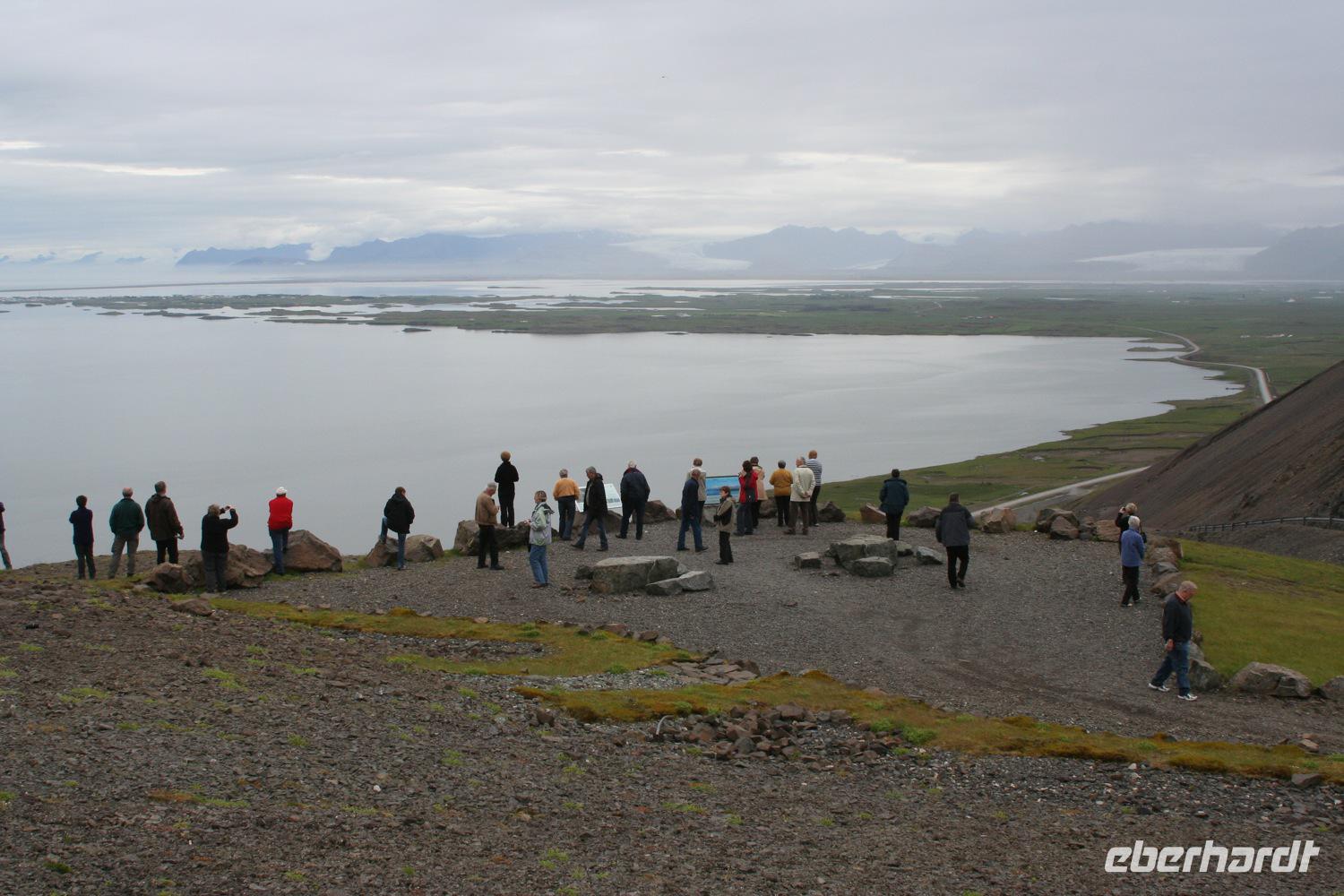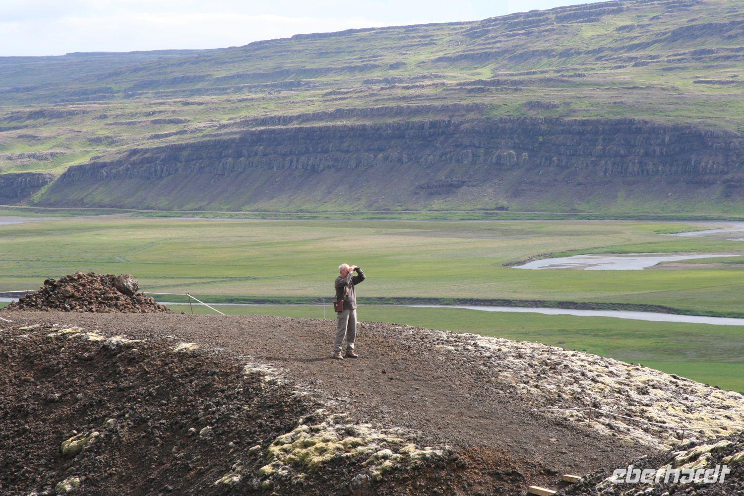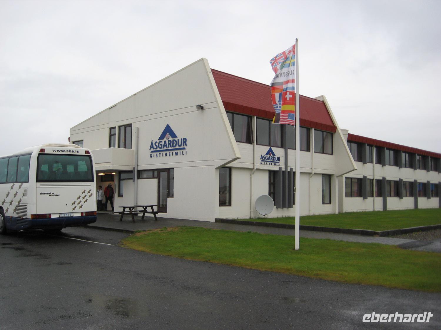 Wiedereinmal hieß es Kofferpacken, obwohl wir uns schon angewöhnt hatten sie erst gar nicht auszupacken, und in den Bus damit. Nach der Abfahrt vom Hotel ging es weiter in den Norden, einmal um die Landzunge Tjörnes herum zur Ásbyrgí-Schlucht. Die Schlucht ist 3,5 km lang und bis zu 25 Meter hoch. In ihrem inneren verbirgt sich ein wunderschöner Wald aus Birken mit lila und gelb blühender Blumen. Nach einer Überlieferung soll die Schlucht durch einen Hufabdruck von Odins achtbeinigen Ross Sleipnir entstanden sein. Die wissenschaftliche Erklärung ist viel simpler, denn hier soll es einmal zwei Wasserfälle gegeben haben, die sich mit der Zeit immer näher kamen bis sie miteinander verbunden waren. Die Entscheidung, welche der beiden Thesen nun richtig ist, überlasse ich ihrer Phantasie. Auf jeden Fall lädt die Schlucht samt Birkenwald und See mit Vogelnistplätzen zum Wandern und verweilen ein. Doch heute sollten wir noch etwas viel imposanteres erleben. Von der Schlucht aus fuhren wir über eine Schotterpiste zum mächtigen Wasserfall Dettifoss. Hier stürzt das Wasser tosend bis zu 100 Meter in die Tiefe. Einfach toll so etwas aus nächster Nähe zu erleben. Damit hatten wir unseren Höhepunkt des Tages schon erreicht. Nun ging es mit dem Bus die Schotterpiste ? die von Kilometer zu Kilometer immer schlimmer zu werden schien ? weiter zurück zur ?Ringstraße Nr. 1?. Als wir sie erreichten waren wir sehr froh, denn die Massage der letzten Kilometer war doch schon sehr anstrengend für uns und unsere tolle isländische Busfahrerin. Ja, richtig gelesen. Wir hatten nicht nur eine örtliche Reiseleiterin, sondern auch eine Busfahrerin, die uns Sicher an alle unsere Ziele brachte. Wie auch zu unserem Hotel in Hallormsstradur, welches im größten Waldgebiet Islands liegt und beim leckeren Abend- und Frühstücks-Buffet einen herrlichen Blick auf den Lagarfljót bietet.