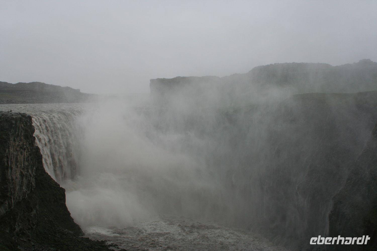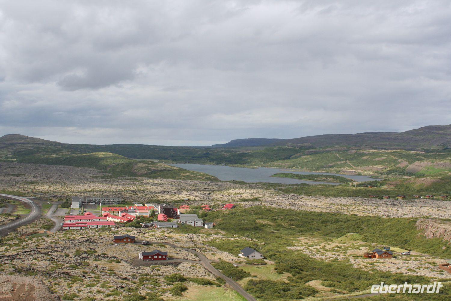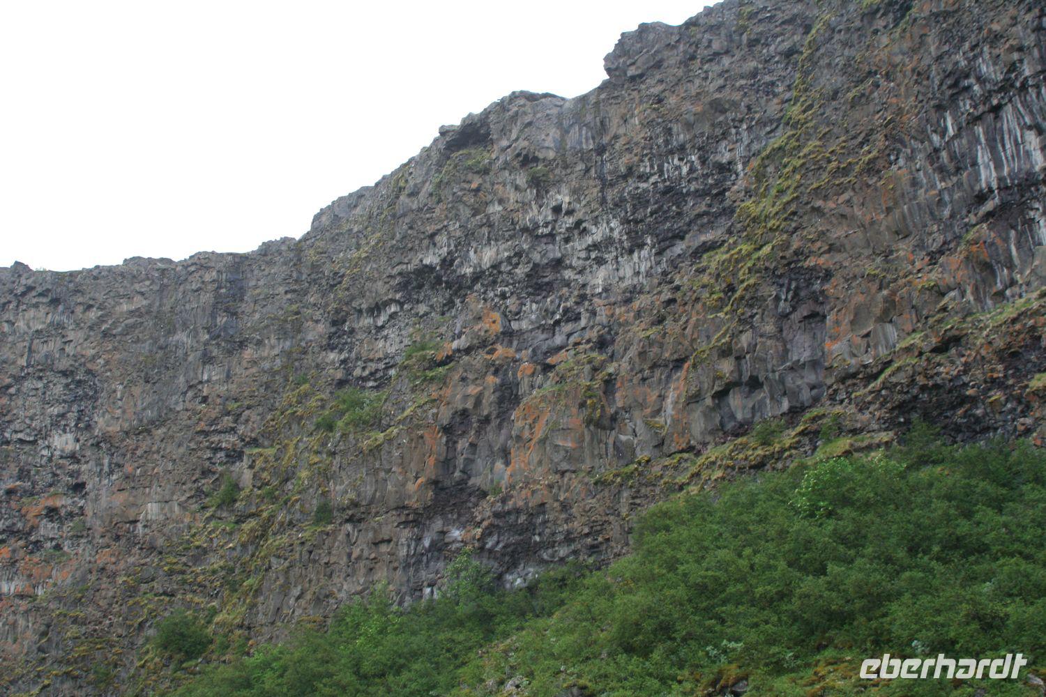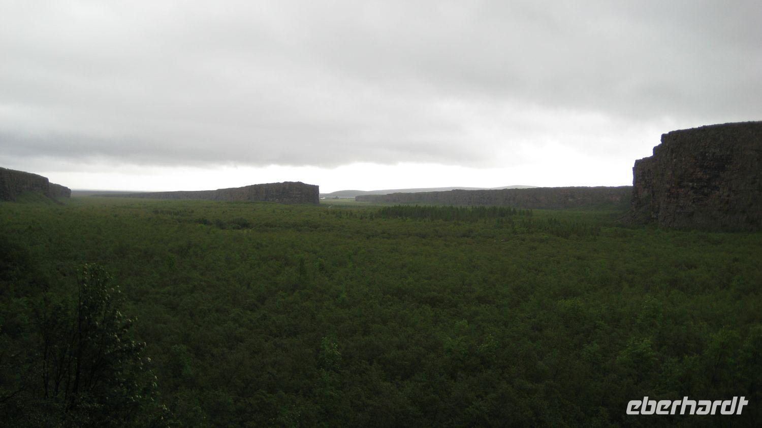 Wiedereinmal hieß es Kofferpacken, obwohl wir uns schon angewöhnt hatten sie erst gar nicht auszupacken, und in den Bus damit. Nach der Abfahrt vom Hotel ging es weiter in den Norden, einmal um die Landzunge Tjörnes herum zur Ásbyrgí-Schlucht. Die Schlucht ist 3,5 km lang und bis zu 25 Meter hoch. In ihrem inneren verbirgt sich ein wunderschöner Wald aus Birken mit lila und gelb blühender Blumen. Nach einer Überlieferung soll die Schlucht durch einen Hufabdruck von Odins achtbeinigen Ross Sleipnir entstanden sein. Die wissenschaftliche Erklärung ist viel simpler, denn hier soll es einmal zwei Wasserfälle gegeben haben, die sich mit der Zeit immer näher kamen bis sie miteinander verbunden waren. Die Entscheidung, welche der beiden Thesen nun richtig ist, überlasse ich ihrer Phantasie. Auf jeden Fall lädt die Schlucht samt Birkenwald und See mit Vogelnistplätzen zum Wandern und verweilen ein. Doch heute sollten wir noch etwas viel imposanteres erleben. Von der Schlucht aus fuhren wir über eine Schotterpiste zum mächtigen Wasserfall Dettifoss. Hier stürzt das Wasser tosend bis zu 100 Meter in die Tiefe. Einfach toll so etwas aus nächster Nähe zu erleben. Damit hatten wir unseren Höhepunkt des Tages schon erreicht. Nun ging es mit dem Bus die Schotterpiste ? die von Kilometer zu Kilometer immer schlimmer zu werden schien ? weiter zurück zur ?Ringstraße Nr. 1?. Als wir sie erreichten waren wir sehr froh, denn die Massage der letzten Kilometer war doch schon sehr anstrengend für uns und unsere tolle isländische Busfahrerin. Ja, richtig gelesen. Wir hatten nicht nur eine örtliche Reiseleiterin, sondern auch eine Busfahrerin, die uns Sicher an alle unsere Ziele brachte. Wie auch zu unserem Hotel in Hallormsstradur, welches im größten Waldgebiet Islands liegt und beim leckeren Abend- und Frühstücks-Buffet einen herrlichen Blick auf den Lagarfljót bietet.