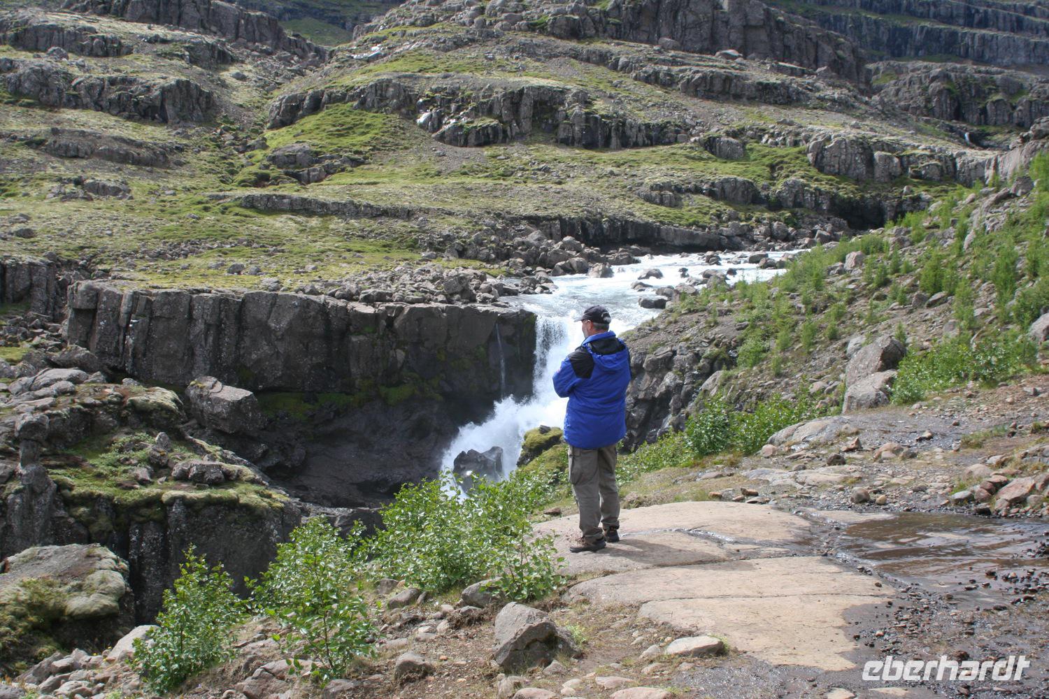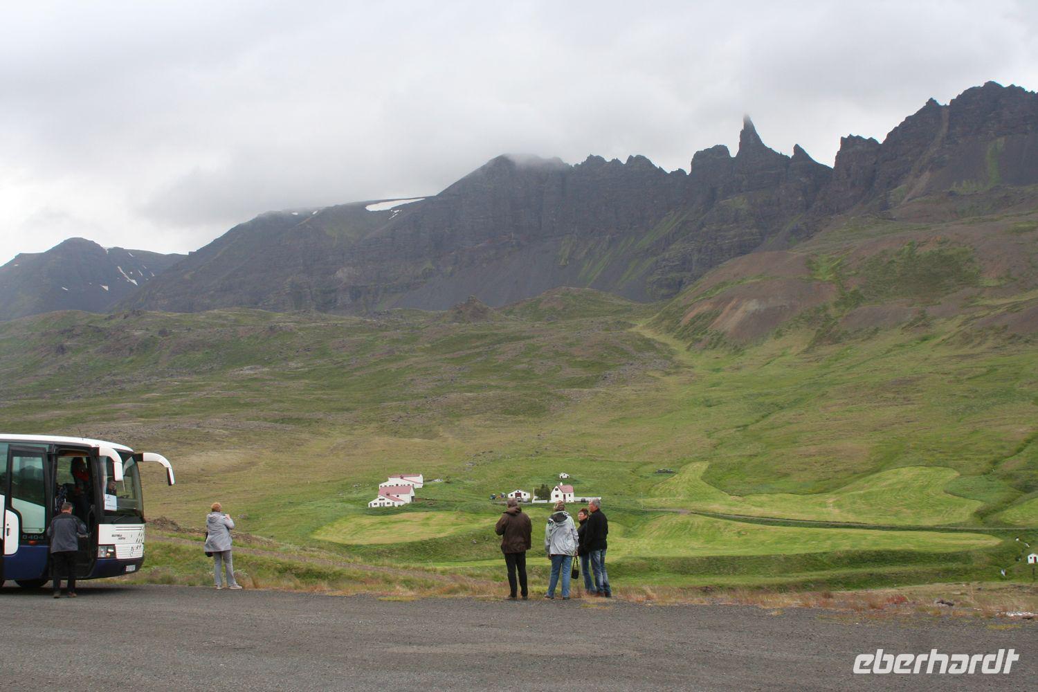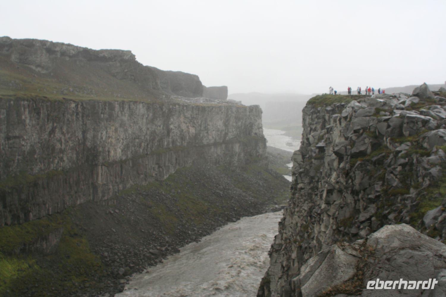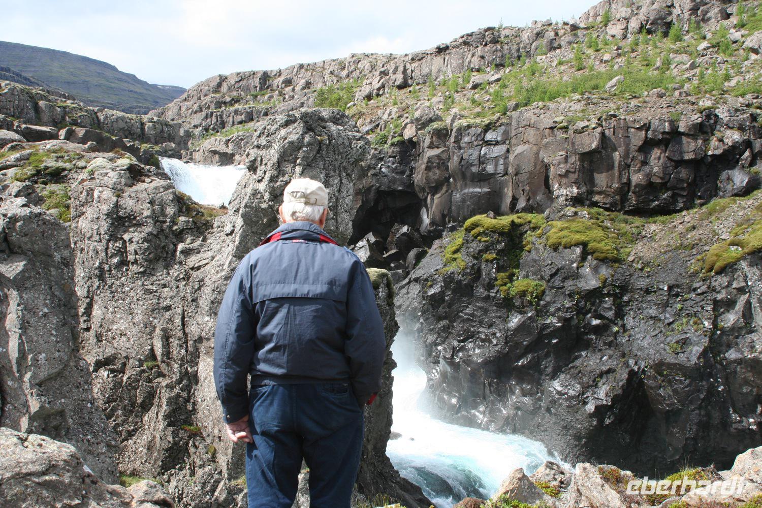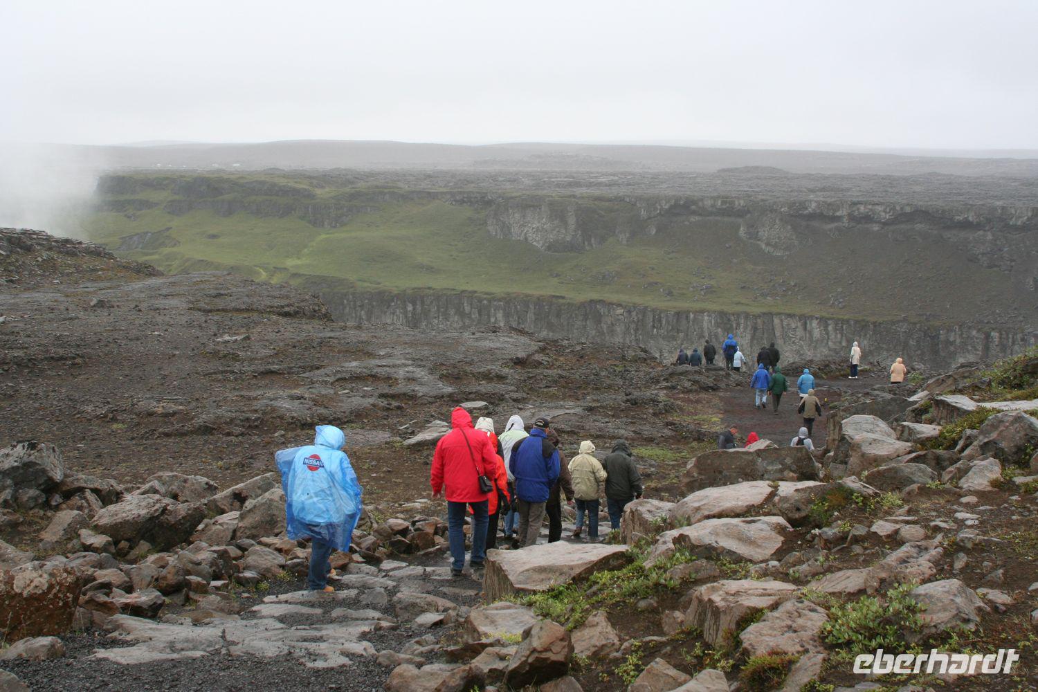 Wiedereinmal hieß es Kofferpacken, obwohl wir uns schon angewöhnt hatten sie erst gar nicht auszupacken, und in den Bus damit. Nach der Abfahrt vom Hotel ging es weiter in den Norden, einmal um die Landzunge Tjörnes herum zur Ásbyrgí-Schlucht. Die Schlucht ist 3,5 km lang und bis zu 25 Meter hoch. In ihrem inneren verbirgt sich ein wunderschöner Wald aus Birken mit lila und gelb blühender Blumen. Nach einer Überlieferung soll die Schlucht durch einen Hufabdruck von Odins achtbeinigen Ross Sleipnir entstanden sein. Die wissenschaftliche Erklärung ist viel simpler, denn hier soll es einmal zwei Wasserfälle gegeben haben, die sich mit der Zeit immer näher kamen bis sie miteinander verbunden waren. Die Entscheidung, welche der beiden Thesen nun richtig ist, überlasse ich ihrer Phantasie. Auf jeden Fall lädt die Schlucht samt Birkenwald und See mit Vogelnistplätzen zum Wandern und verweilen ein. Doch heute sollten wir noch etwas viel imposanteres erleben. Von der Schlucht aus fuhren wir über eine Schotterpiste zum mächtigen Wasserfall Dettifoss. Hier stürzt das Wasser tosend bis zu 100 Meter in die Tiefe. Einfach toll so etwas aus nächster Nähe zu erleben. Damit hatten wir unseren Höhepunkt des Tages schon erreicht. Nun ging es mit dem Bus die Schotterpiste ? die von Kilometer zu Kilometer immer schlimmer zu werden schien ? weiter zurück zur ?Ringstraße Nr. 1?. Als wir sie erreichten waren wir sehr froh, denn die Massage der letzten Kilometer war doch schon sehr anstrengend für uns und unsere tolle isländische Busfahrerin. Ja, richtig gelesen. Wir hatten nicht nur eine örtliche Reiseleiterin, sondern auch eine Busfahrerin, die uns Sicher an alle unsere Ziele brachte. Wie auch zu unserem Hotel in Hallormsstradur, welches im größten Waldgebiet Islands liegt und beim leckeren Abend- und Frühstücks-Buffet einen herrlichen Blick auf den Lagarfljót bietet.