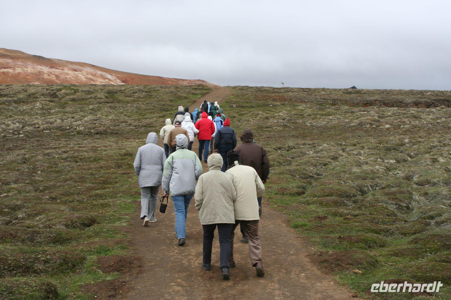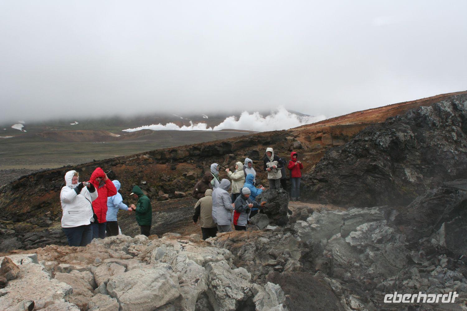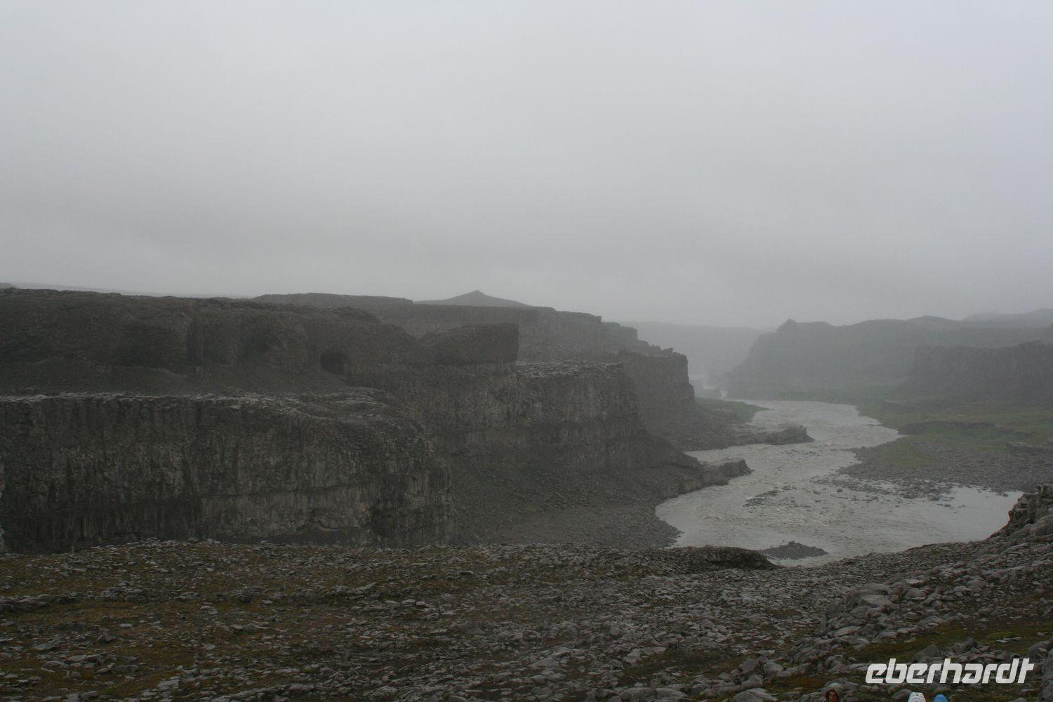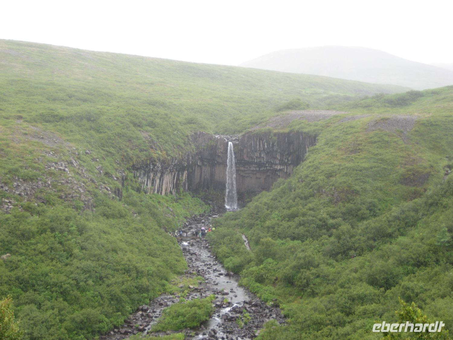 Wiedereinmal hieß es Kofferpacken, obwohl wir uns schon angewöhnt hatten sie erst gar nicht auszupacken, und in den Bus damit. Nach der Abfahrt vom Hotel ging es weiter in den Norden, einmal um die Landzunge Tjörnes herum zur Ásbyrgí-Schlucht. Die Schlucht ist 3,5 km lang und bis zu 25 Meter hoch. In ihrem inneren verbirgt sich ein wunderschöner Wald aus Birken mit lila und gelb blühender Blumen. Nach einer Überlieferung soll die Schlucht durch einen Hufabdruck von Odins achtbeinigen Ross Sleipnir entstanden sein. Die wissenschaftliche Erklärung ist viel simpler, denn hier soll es einmal zwei Wasserfälle gegeben haben, die sich mit der Zeit immer näher kamen bis sie miteinander verbunden waren. Die Entscheidung, welche der beiden Thesen nun richtig ist, überlasse ich ihrer Phantasie. Auf jeden Fall lädt die Schlucht samt Birkenwald und See mit Vogelnistplätzen zum Wandern und verweilen ein. Doch heute sollten wir noch etwas viel imposanteres erleben. Von der Schlucht aus fuhren wir über eine Schotterpiste zum mächtigen Wasserfall Dettifoss. Hier stürzt das Wasser tosend bis zu 100 Meter in die Tiefe. Einfach toll so etwas aus nächster Nähe zu erleben. Damit hatten wir unseren Höhepunkt des Tages schon erreicht. Nun ging es mit dem Bus die Schotterpiste ? die von Kilometer zu Kilometer immer schlimmer zu werden schien ? weiter zurück zur ?Ringstraße Nr. 1?. Als wir sie erreichten waren wir sehr froh, denn die Massage der letzten Kilometer war doch schon sehr anstrengend für uns und unsere tolle isländische Busfahrerin. Ja, richtig gelesen. Wir hatten nicht nur eine örtliche Reiseleiterin, sondern auch eine Busfahrerin, die uns Sicher an alle unsere Ziele brachte. Wie auch zu unserem Hotel in Hallormsstradur, welches im größten Waldgebiet Islands liegt und beim leckeren Abend- und Frühstücks-Buffet einen herrlichen Blick auf den Lagarfljót bietet.