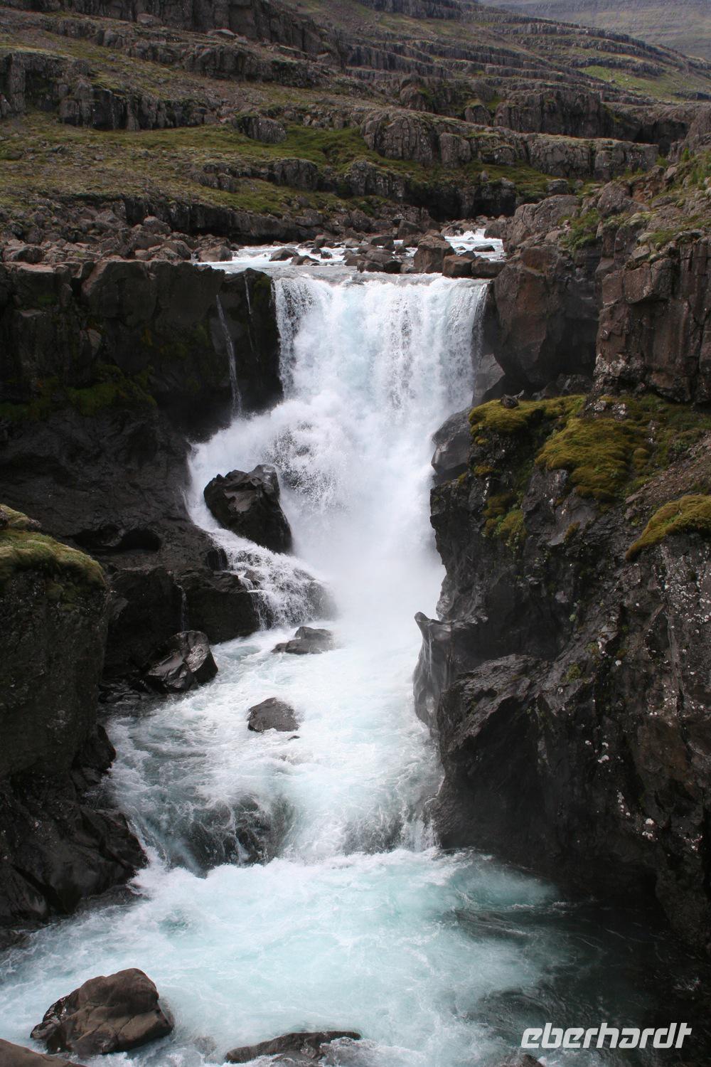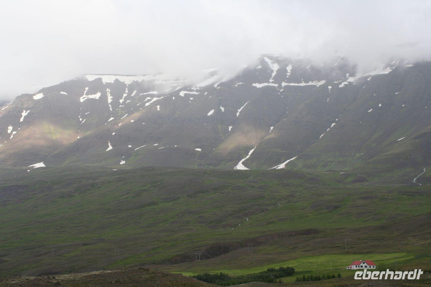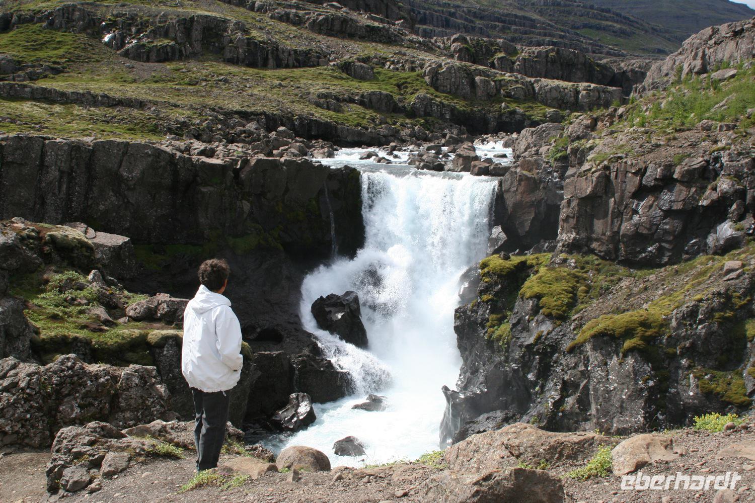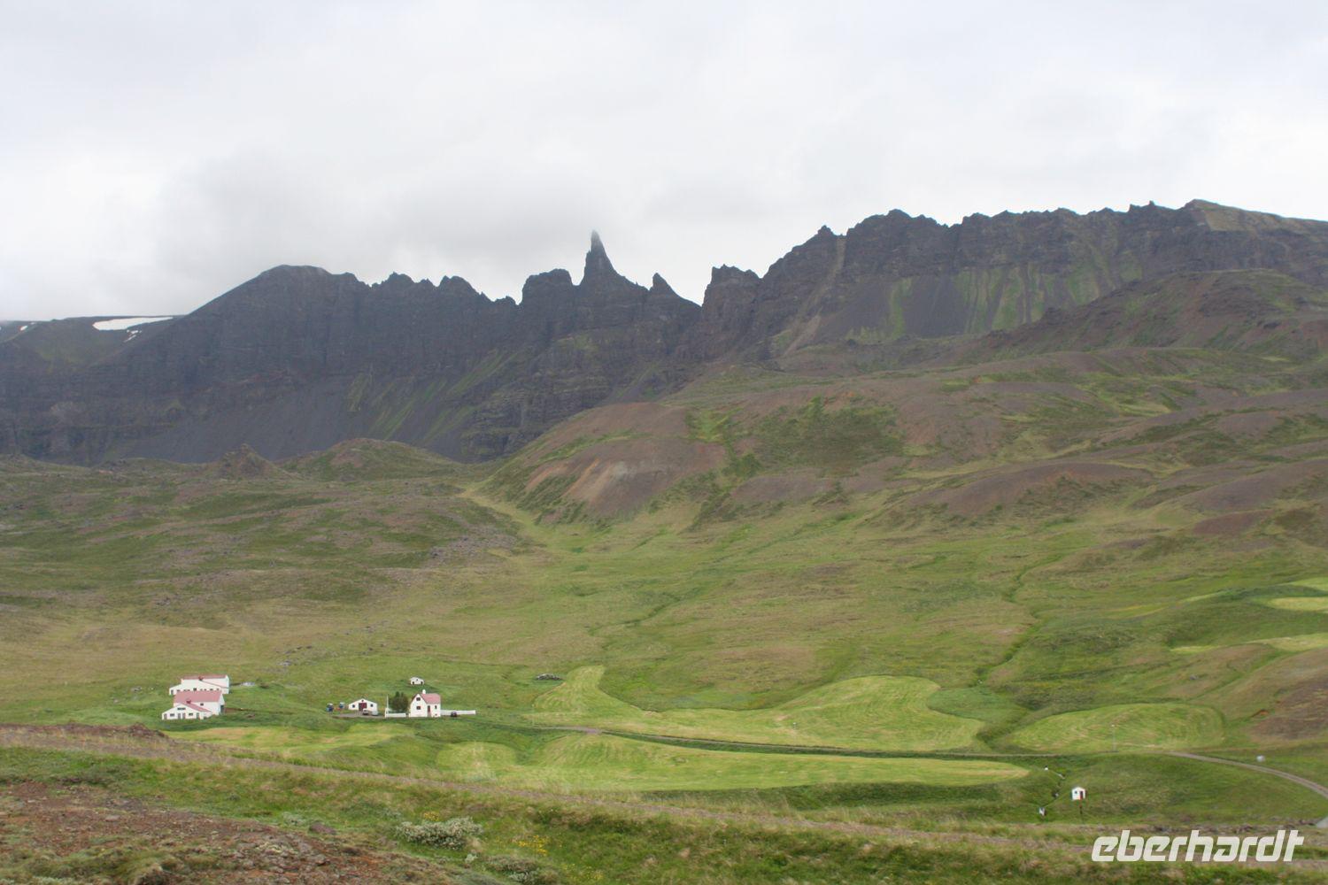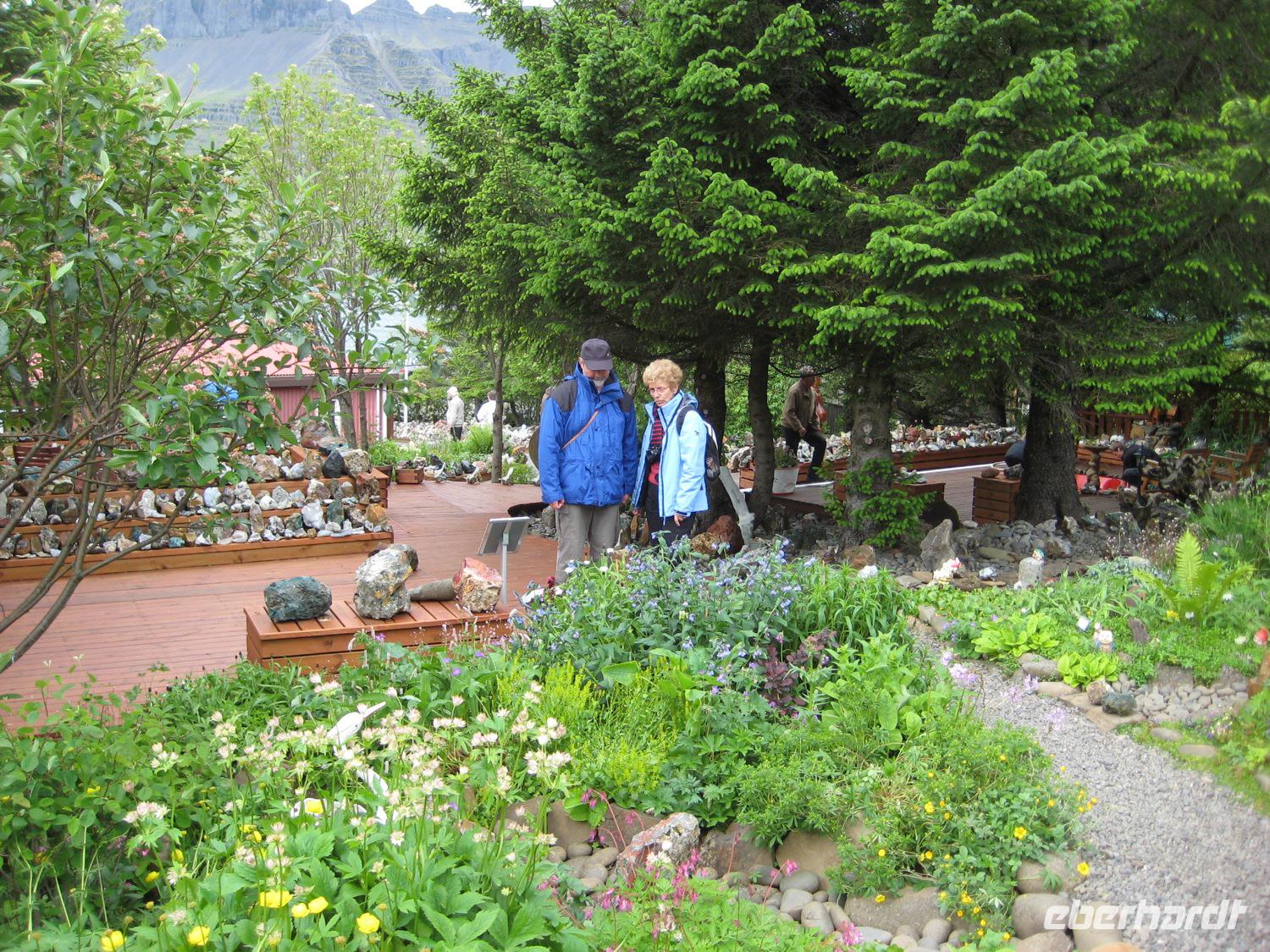 Wiedereinmal hieß es Kofferpacken, obwohl wir uns schon angewöhnt hatten sie erst gar nicht auszupacken, und in den Bus damit. Nach der Abfahrt vom Hotel ging es weiter in den Norden, einmal um die Landzunge Tjörnes herum zur Ásbyrgí-Schlucht. Die Schlucht ist 3,5 km lang und bis zu 25 Meter hoch. In ihrem inneren verbirgt sich ein wunderschöner Wald aus Birken mit lila und gelb blühender Blumen. Nach einer Überlieferung soll die Schlucht durch einen Hufabdruck von Odins achtbeinigen Ross Sleipnir entstanden sein. Die wissenschaftliche Erklärung ist viel simpler, denn hier soll es einmal zwei Wasserfälle gegeben haben, die sich mit der Zeit immer näher kamen bis sie miteinander verbunden waren. Die Entscheidung, welche der beiden Thesen nun richtig ist, überlasse ich ihrer Phantasie. Auf jeden Fall lädt die Schlucht samt Birkenwald und See mit Vogelnistplätzen zum Wandern und verweilen ein. Doch heute sollten wir noch etwas viel imposanteres erleben. Von der Schlucht aus fuhren wir über eine Schotterpiste zum mächtigen Wasserfall Dettifoss. Hier stürzt das Wasser tosend bis zu 100 Meter in die Tiefe. Einfach toll so etwas aus nächster Nähe zu erleben. Damit hatten wir unseren Höhepunkt des Tages schon erreicht. Nun ging es mit dem Bus die Schotterpiste ? die von Kilometer zu Kilometer immer schlimmer zu werden schien ? weiter zurück zur ?Ringstraße Nr. 1?. Als wir sie erreichten waren wir sehr froh, denn die Massage der letzten Kilometer war doch schon sehr anstrengend für uns und unsere tolle isländische Busfahrerin. Ja, richtig gelesen. Wir hatten nicht nur eine örtliche Reiseleiterin, sondern auch eine Busfahrerin, die uns Sicher an alle unsere Ziele brachte. Wie auch zu unserem Hotel in Hallormsstradur, welches im größten Waldgebiet Islands liegt und beim leckeren Abend- und Frühstücks-Buffet einen herrlichen Blick auf den Lagarfljót bietet.