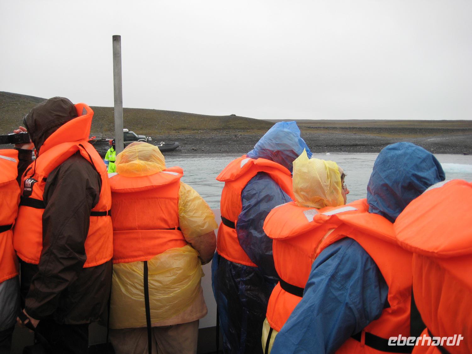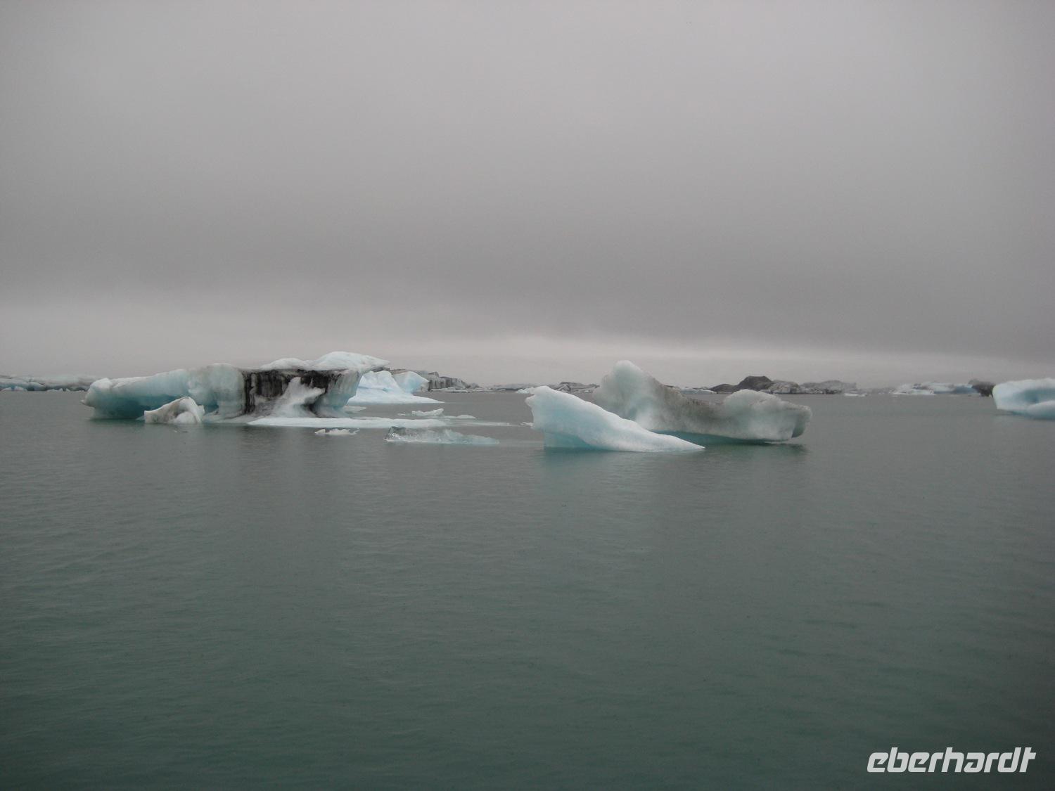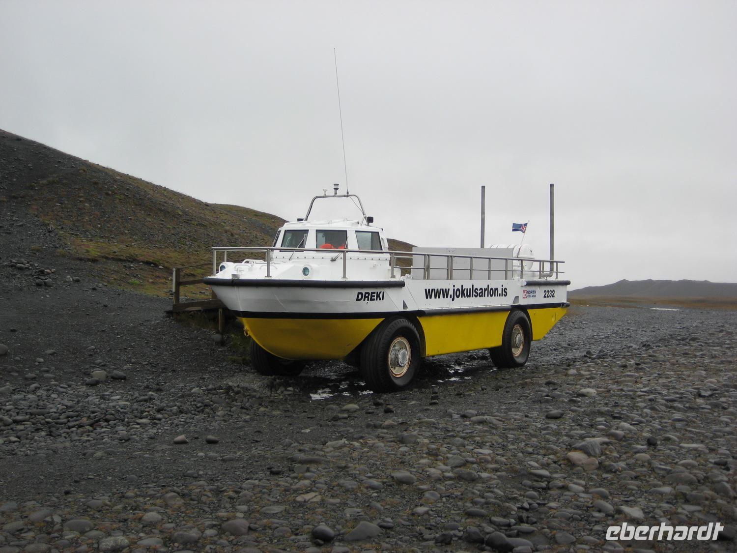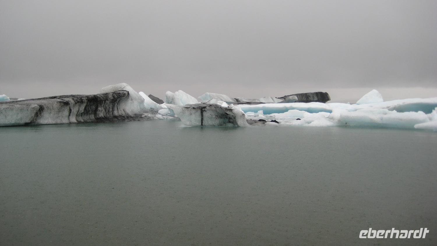 Nach einer kurzen aber erlebnisreichen Nacht ging es auch gleich weiter zum nächsten Highlight. Wie ein Gast so schön zu mir meinte: ?Das ist ja ein Highlight nach dem anderen. Toll.?. Da kann ich mich nur anschließen. Gegen 9 Uhr erreichten wir die Gletscherlagune Jökulsárlon. Diese wurde 2002 eigens für eine Sequenz des Film ?James Bond 007 ? Stirb an einem anderen Tag? angestaut, damit sie zufriert. Normalerweise friert die Lagune nicht zu, da sie zu je 50% aus Süß- und Salzwasser besteht. Für uns musste man aber nicht den See anstauen. Wir wollten ja schließlich eine Bootsfahrt auf ihn machen. Doch in diesem Moment fing es an wie aus Kübeln zu schütten. Nichtsdestotrotz bestiegen wir eines der vier Amphibienfahrzeuge und warfen uns eine orangene Sicherheitsweste über. Denn Sicherheit geht vor. Drum wurden wir zusätzlich von einem Begleitboot eskortiert. Eisberge ? von denen Schwammen jede Menge in der Lagune herum ? haben die unmögliche Angewohnheit sich einfach und ohne Vorwarnung zu drehen. Das kann verheerende folgen für ein Boot haben, denn wie jedes Kind weiß befinden sich gut 90% des Berges Unterwasser und sind damit nicht sichtbar. Schon der kleinste Stups kann ihn ins torkeln bringen und umkippen lassen. Drum fuhren wir mit unseren Geleitschutz in sicherer Entfernung um die Berge herum. Tolle Fotos haben wir trotzdem machen können. Zurück im warmen Bus ging es weiter, vorbei an den Svinafells, zum Skaftafell. Hier unternahmen wir eine Wanderung zum am meist fotografierten Wasserfall Islands, dem Svatifoss. Das ist er auch nicht ohne Grund, denn er fällt von einem riesigen Basaltsäulenfeld herunter. Es wirkt wie eine riesige Orgel mit hunderten von sechseckigen Pfeifen. Zurück von unserer Wanderung mussten wir unser geplantes Picknick, wegen des anhaltenden Regens, in den Bus verlegen. Was aber nicht weiter schlimm war. Gestärkt fuhren wir weiter zu dem kleinen Gehöft in Núpsstadur. Hier lebten zwei Brüdern, von denen der letzte erst vor wenigen Wochen mit fast 101 Jahren gestorben ist. Ihre Geschichte ist sehr interessant ? Ich erzähle sie hier nicht, da man sonst ja keinen Grund hat hier her zu kommen und die kleine Kirche um so mehr.Mitten durch die Laverfelder von Eldhraun und Myrdalssandur ging es zum Landhotel ?Höfdabrekka? bei Vík, unserer Herberge für die kommende Nacht.