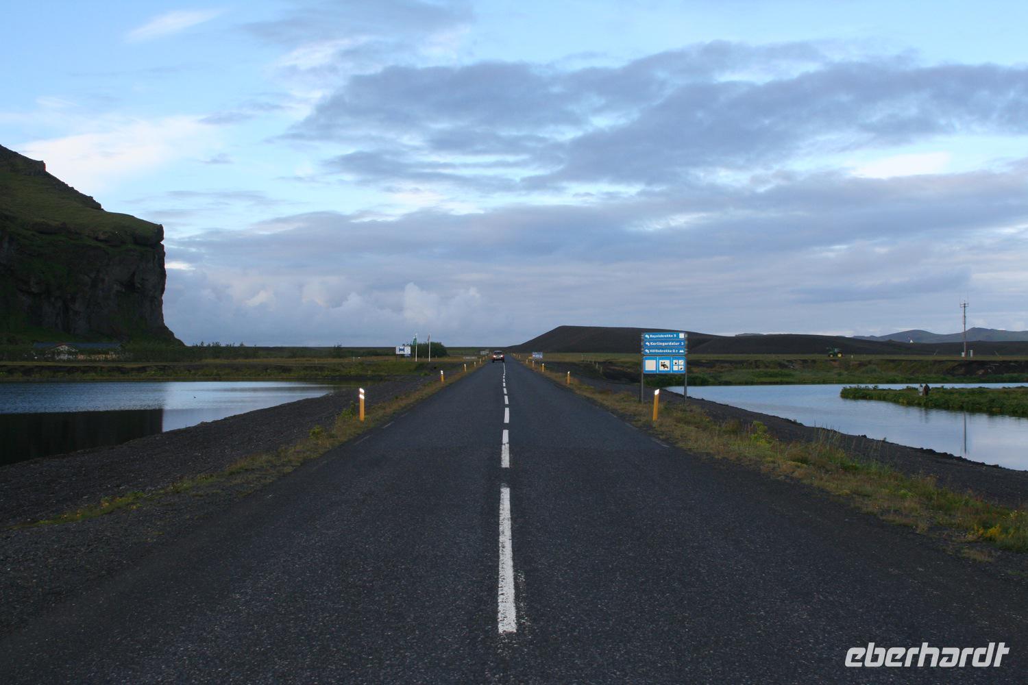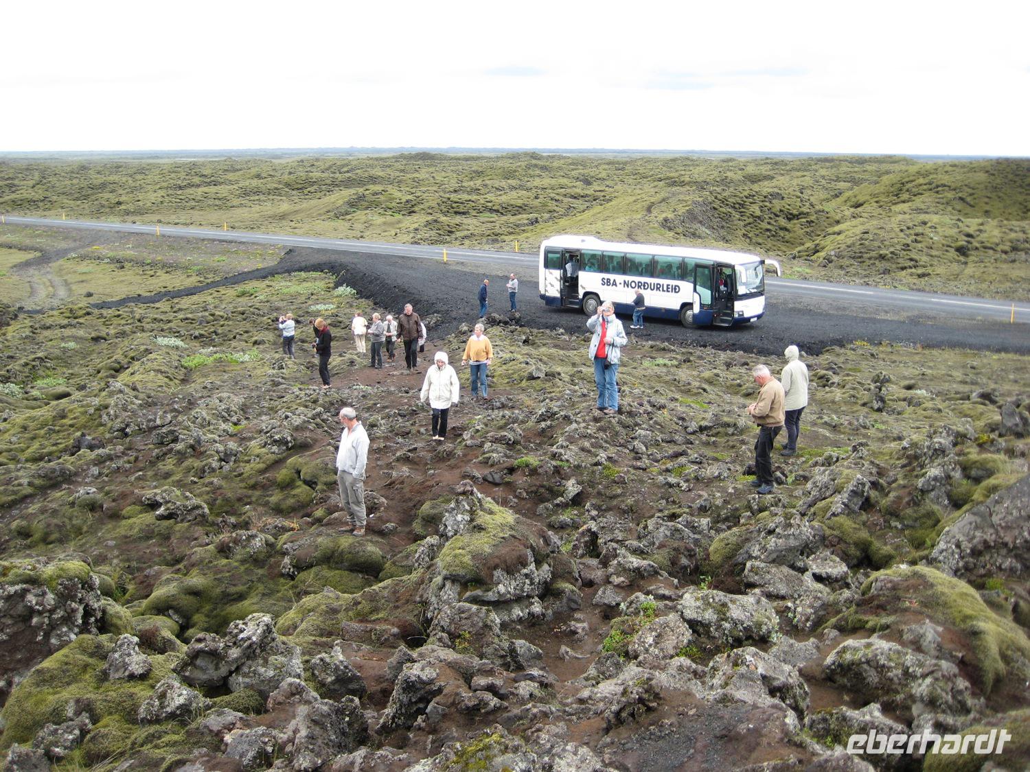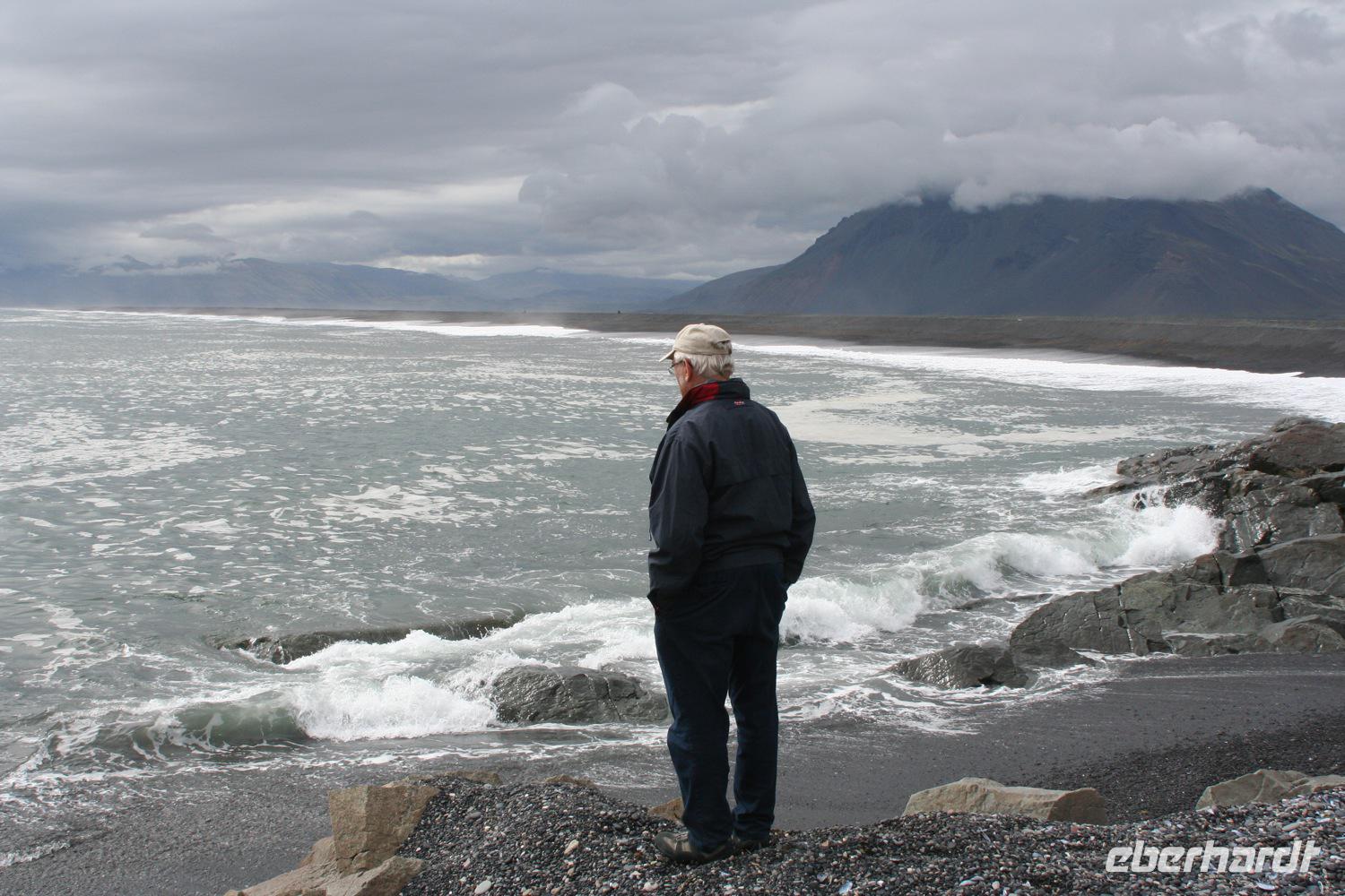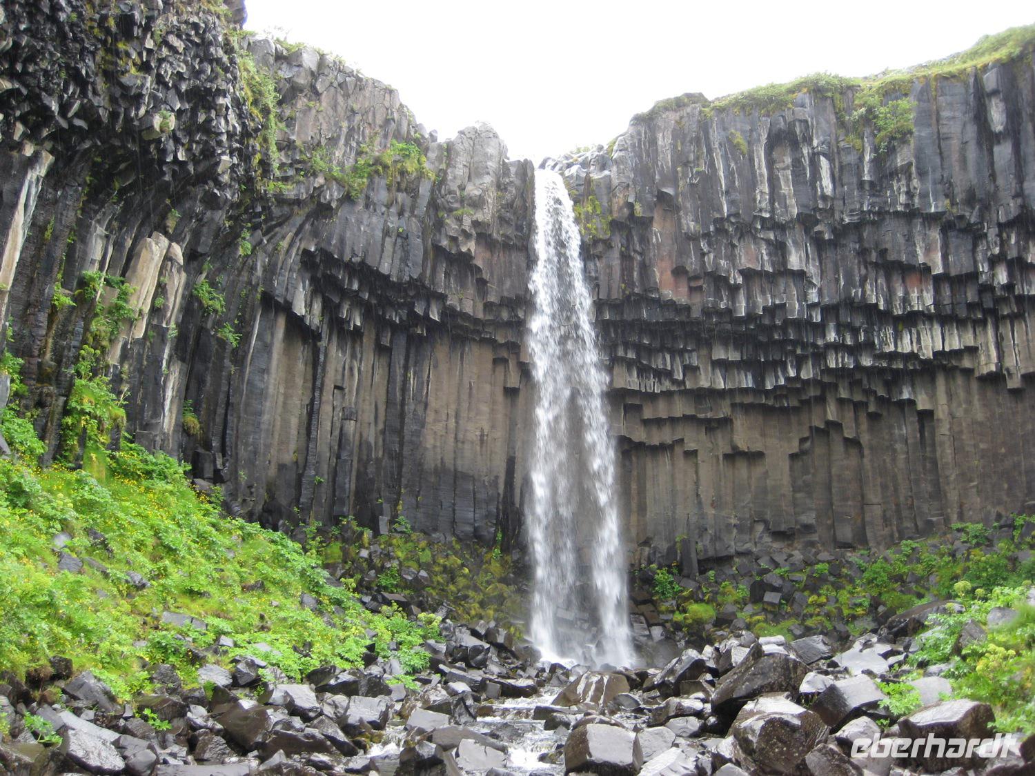 Nach einer kurzen aber erlebnisreichen Nacht ging es auch gleich weiter zum nächsten Highlight. Wie ein Gast so schön zu mir meinte: ?Das ist ja ein Highlight nach dem anderen. Toll.?. Da kann ich mich nur anschließen. Gegen 9 Uhr erreichten wir die Gletscherlagune Jökulsárlon. Diese wurde 2002 eigens für eine Sequenz des Film ?James Bond 007 ? Stirb an einem anderen Tag? angestaut, damit sie zufriert. Normalerweise friert die Lagune nicht zu, da sie zu je 50% aus Süß- und Salzwasser besteht. Für uns musste man aber nicht den See anstauen. Wir wollten ja schließlich eine Bootsfahrt auf ihn machen. Doch in diesem Moment fing es an wie aus Kübeln zu schütten. Nichtsdestotrotz bestiegen wir eines der vier Amphibienfahrzeuge und warfen uns eine orangene Sicherheitsweste über. Denn Sicherheit geht vor. Drum wurden wir zusätzlich von einem Begleitboot eskortiert. Eisberge ? von denen Schwammen jede Menge in der Lagune herum ? haben die unmögliche Angewohnheit sich einfach und ohne Vorwarnung zu drehen. Das kann verheerende folgen für ein Boot haben, denn wie jedes Kind weiß befinden sich gut 90% des Berges Unterwasser und sind damit nicht sichtbar. Schon der kleinste Stups kann ihn ins torkeln bringen und umkippen lassen. Drum fuhren wir mit unseren Geleitschutz in sicherer Entfernung um die Berge herum. Tolle Fotos haben wir trotzdem machen können. Zurück im warmen Bus ging es weiter, vorbei an den Svinafells, zum Skaftafell. Hier unternahmen wir eine Wanderung zum am meist fotografierten Wasserfall Islands, dem Svatifoss. Das ist er auch nicht ohne Grund, denn er fällt von einem riesigen Basaltsäulenfeld herunter. Es wirkt wie eine riesige Orgel mit hunderten von sechseckigen Pfeifen. Zurück von unserer Wanderung mussten wir unser geplantes Picknick, wegen des anhaltenden Regens, in den Bus verlegen. Was aber nicht weiter schlimm war. Gestärkt fuhren wir weiter zu dem kleinen Gehöft in Núpsstadur. Hier lebten zwei Brüdern, von denen der letzte erst vor wenigen Wochen mit fast 101 Jahren gestorben ist. Ihre Geschichte ist sehr interessant ? Ich erzähle sie hier nicht, da man sonst ja keinen Grund hat hier her zu kommen und die kleine Kirche um so mehr.Mitten durch die Laverfelder von Eldhraun und Myrdalssandur ging es zum Landhotel ?Höfdabrekka? bei Vík, unserer Herberge für die kommende Nacht.