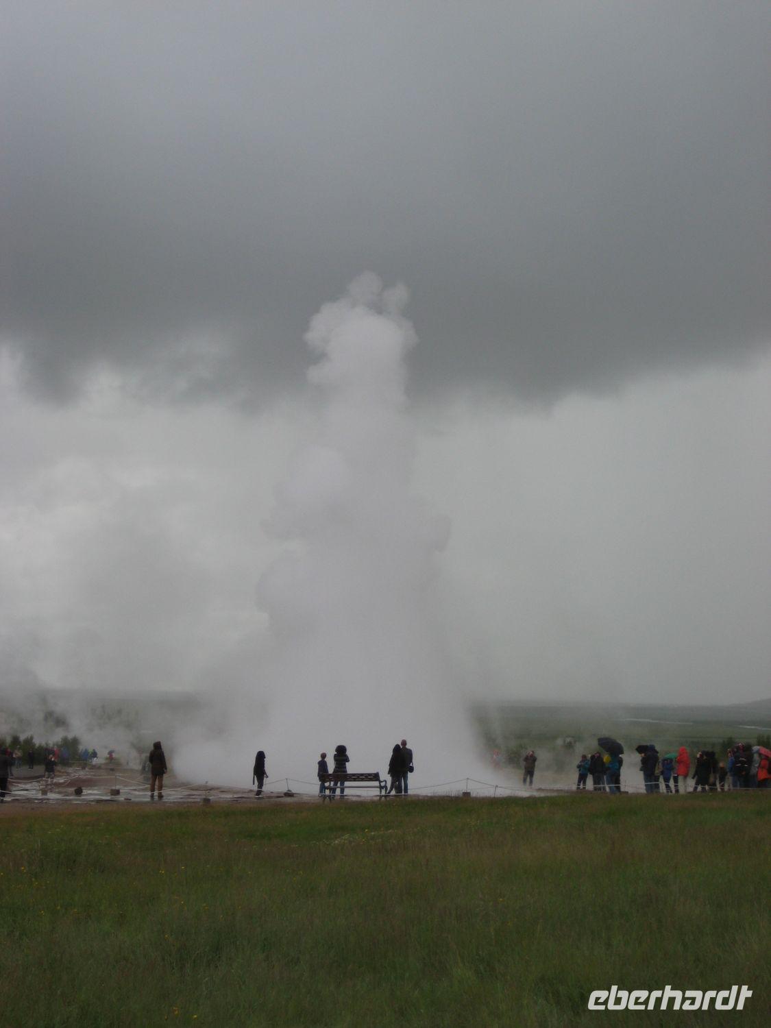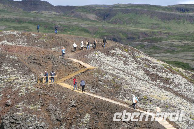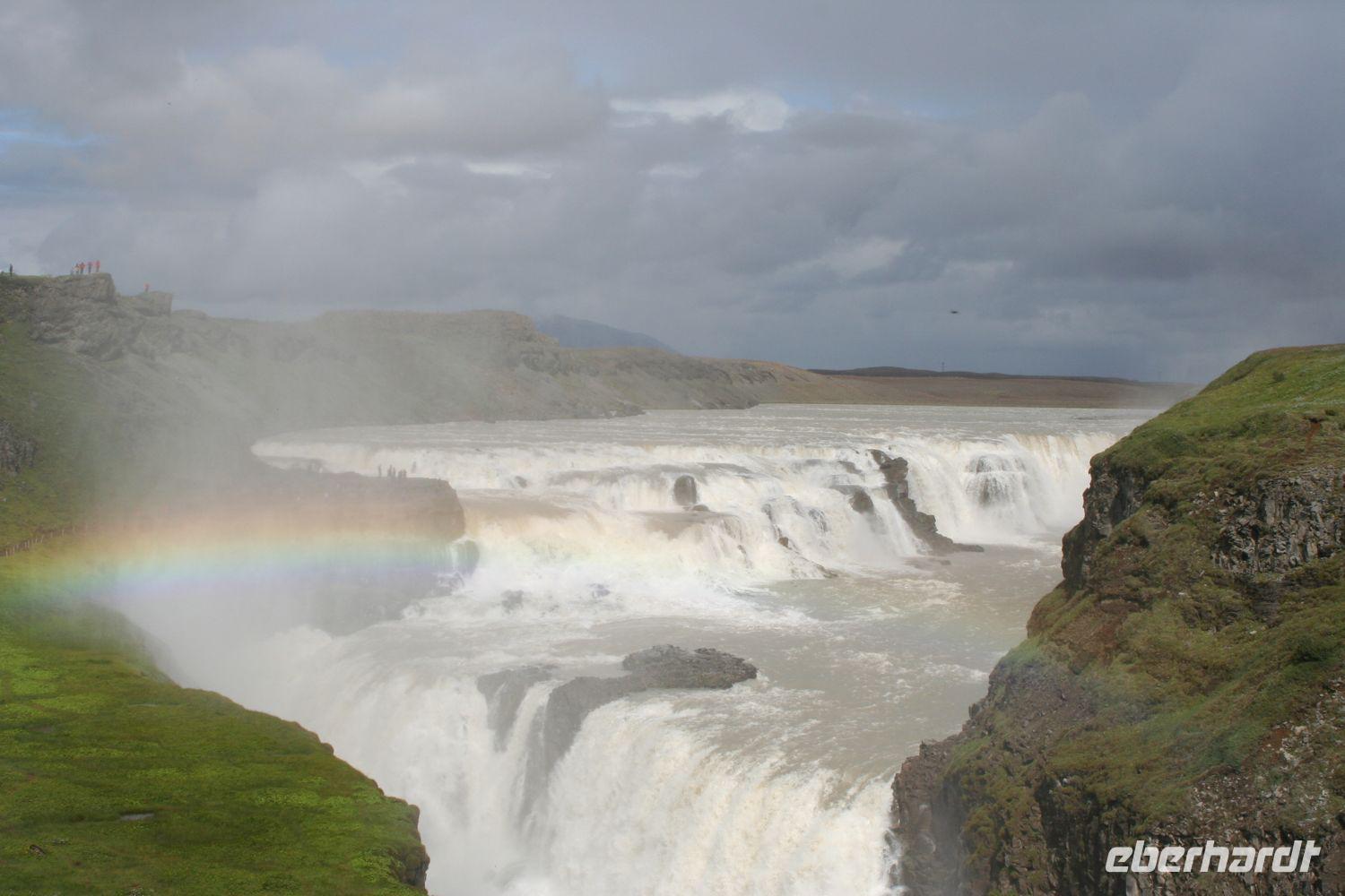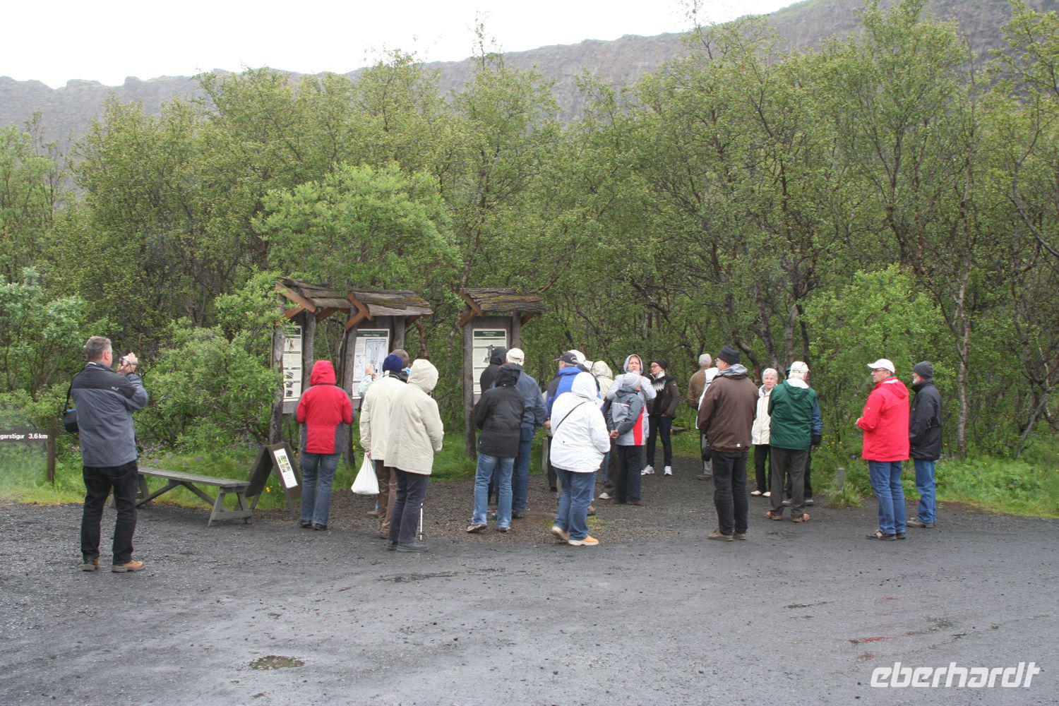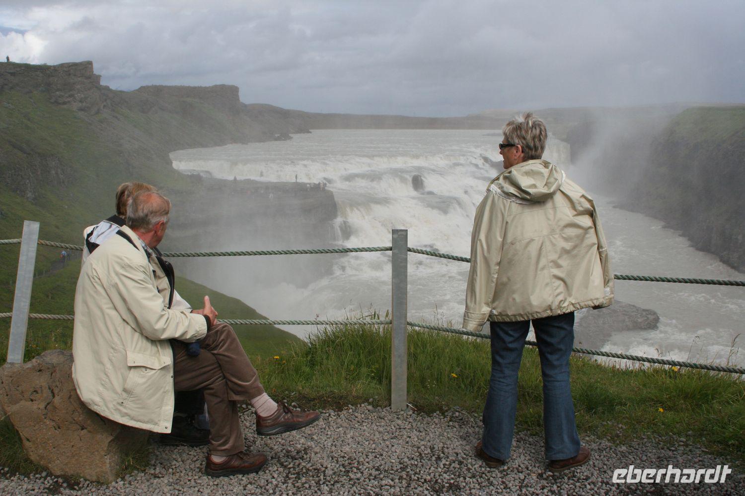 Ab jetzt fuhren wir nur noch ein kleines Stück auf der 1, denn um unser nächstes Ziel zu erreichen mussten wir diese verlassen und werden sie bis Reykjavík auch nicht mehr befahren. Wir bogen ins Landesinnere ab und begaben uns auf den Goldenen Kreis, einem Weg der Attraktionen. Vorbei an den Springquellen Geysir, den Namensgeber aller Springquellen der Welt aber leider schon versiegt ist, und Strokkur zum mächtigen Gullfoss. Wo wir eine Mittagspause einlegten und die gewaltigen Fälle auf uns wirken ließen. Es sollte heute aber noch gewaltiger werden. Es folgte die fahrt ins Niemandsland, besser gesagt, in den Graben des mittelatlantischen Rückens. Wir verließen gut sichtbar die eurasische Kontinentalplatte und begaben uns in den Graben, der im Schnitt jährlich um zwei Zentimeter auseinander driftet, dies aber nur statistisch. Denn wenn er auseinander geht dann mit einem gewaltigem Ruck und um mehrere Zentimeter. Wir verließen den Bus und besichtigten die älteste Thing des Nordens, dem Urparlament der Isländer. Direkt vor dem gewaltigen massiven Felsen der amerikanischen Kontinentalplatte. Die wir zu Fuß erklommen. Somit kann man sagen, dass wir nach Amerika gewandert sind. Da so eine Wanderung schon recht anstrengend sein kann, fuhren wir weiter nach Reykjavík in unser Hotel und schlossen somit den Kreis. Wir haben es geschafft, rund 1800 erlebnisreiche Kilometer liegen nun hinter uns.