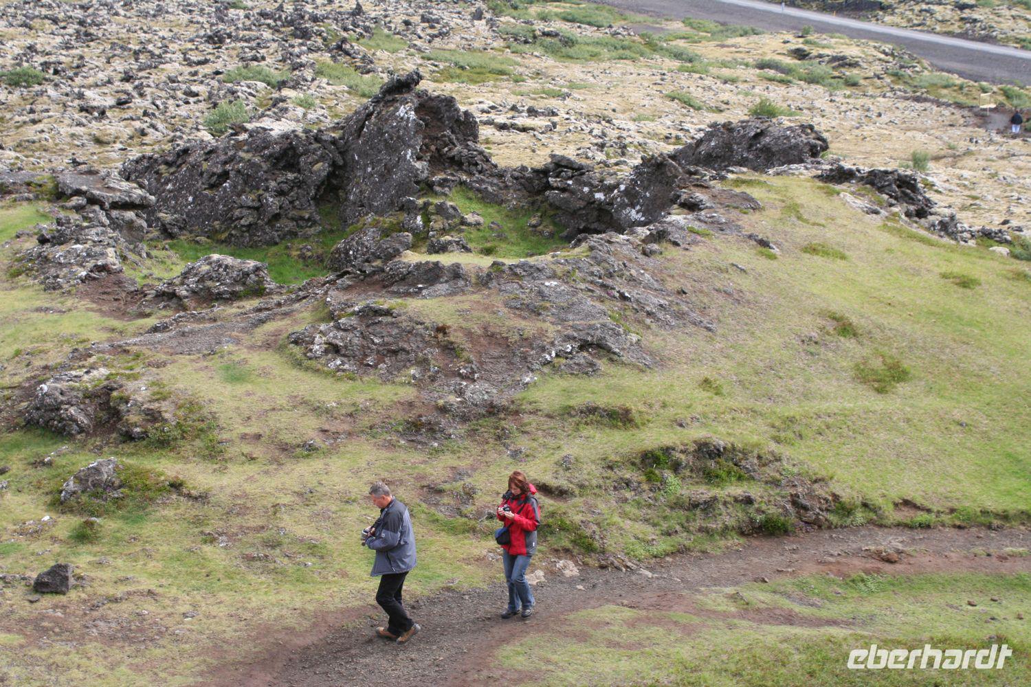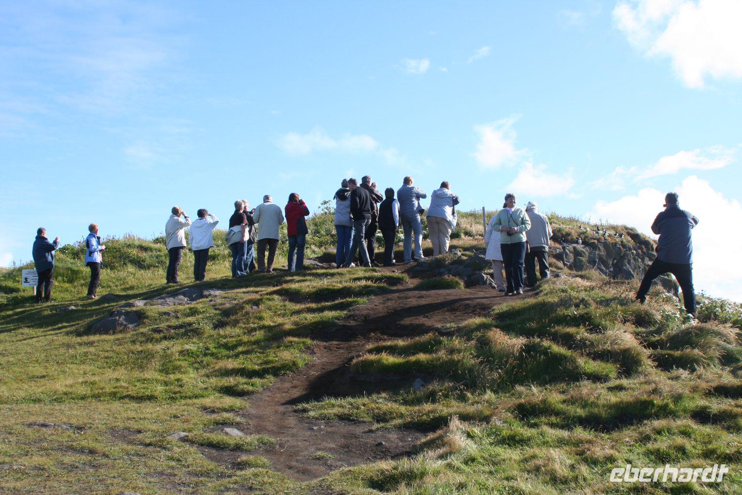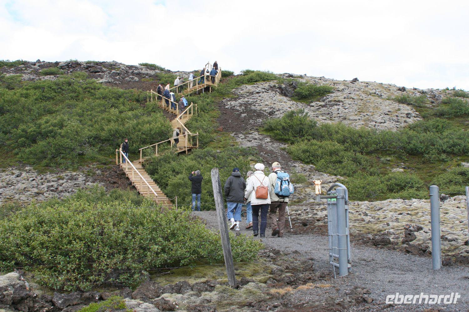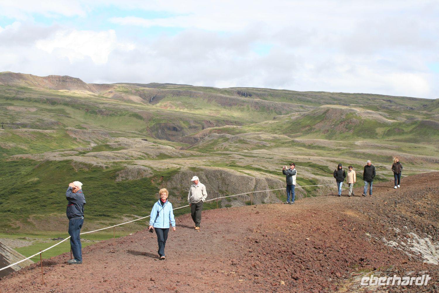 Ab jetzt fuhren wir nur noch ein kleines Stück auf der 1, denn um unser nächstes Ziel zu erreichen mussten wir diese verlassen und werden sie bis Reykjavík auch nicht mehr befahren. Wir bogen ins Landesinnere ab und begaben uns auf den Goldenen Kreis, einem Weg der Attraktionen. Vorbei an den Springquellen Geysir, den Namensgeber aller Springquellen der Welt aber leider schon versiegt ist, und Strokkur zum mächtigen Gullfoss. Wo wir eine Mittagspause einlegten und die gewaltigen Fälle auf uns wirken ließen. Es sollte heute aber noch gewaltiger werden. Es folgte die fahrt ins Niemandsland, besser gesagt, in den Graben des mittelatlantischen Rückens. Wir verließen gut sichtbar die eurasische Kontinentalplatte und begaben uns in den Graben, der im Schnitt jährlich um zwei Zentimeter auseinander driftet, dies aber nur statistisch. Denn wenn er auseinander geht dann mit einem gewaltigem Ruck und um mehrere Zentimeter. Wir verließen den Bus und besichtigten die älteste Thing des Nordens, dem Urparlament der Isländer. Direkt vor dem gewaltigen massiven Felsen der amerikanischen Kontinentalplatte. Die wir zu Fuß erklommen. Somit kann man sagen, dass wir nach Amerika gewandert sind. Da so eine Wanderung schon recht anstrengend sein kann, fuhren wir weiter nach Reykjavík in unser Hotel und schlossen somit den Kreis. Wir haben es geschafft, rund 1800 erlebnisreiche Kilometer liegen nun hinter uns.