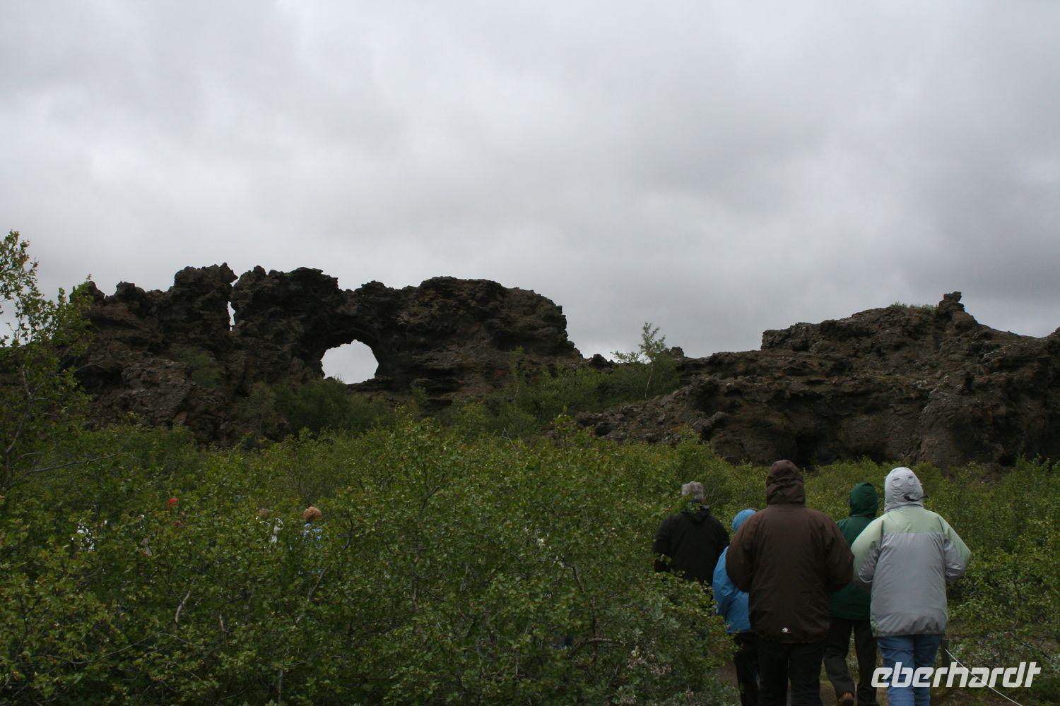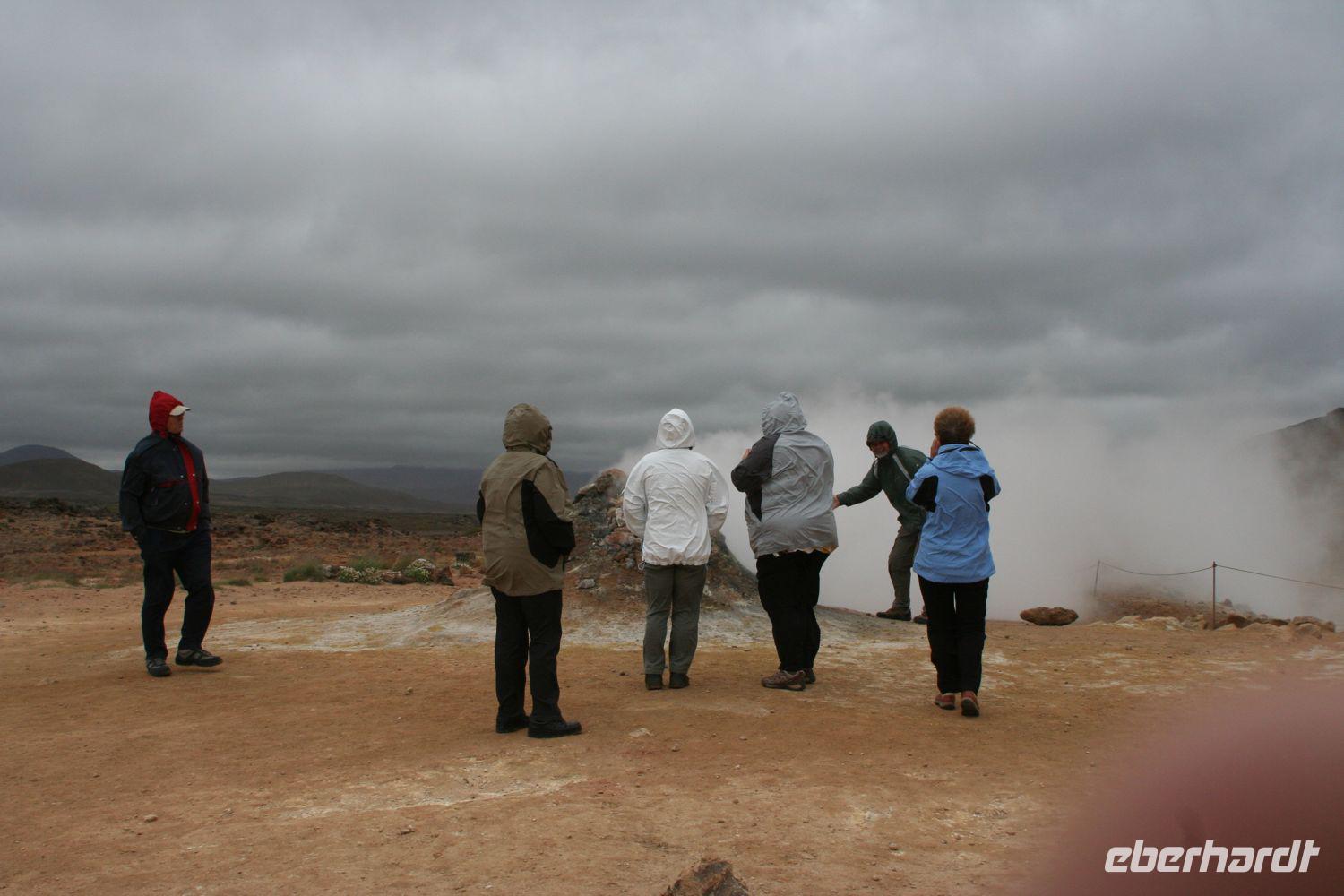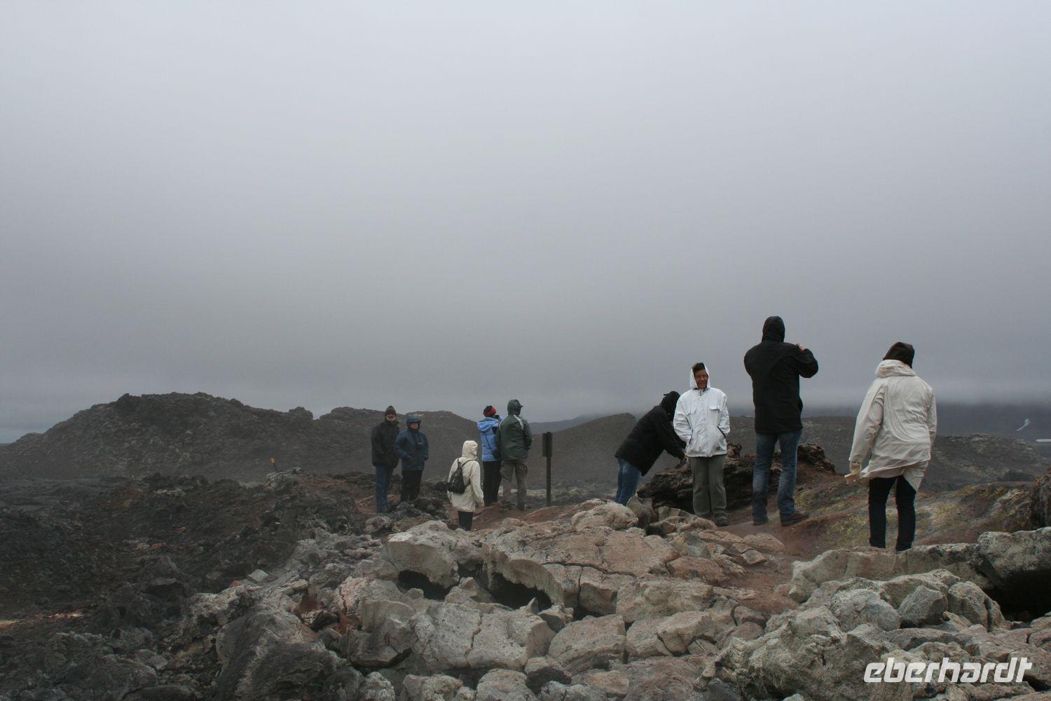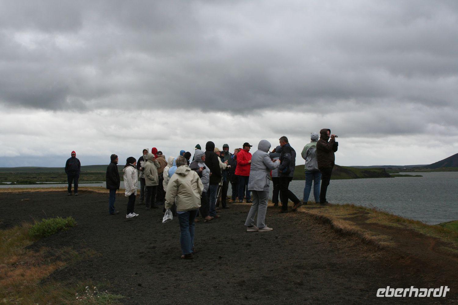 Unser erstes Ziel für heute hieß Godafoss, die Goden Wasserfälle. Sie sind mit gerade einmal 10 Metern Höhe nicht besonders hoch, aber ungefähr 70 Meter breit, schön anzuschauen und ein perfektes Postkartenmotiv. Anschließend fuhren wir weiter zum Myvatn-See, hier bewanderten wir die Krater, die durch blasen schlagende Lava entstanden sind. Der Myvatn-See hat seinen Namen, wie alles in Island, nicht ohne Grund. Übersetzt heißt er Mückensee. Aber wir hatten Aufgrund des feuchten Wetters Glück und mussten uns nicht vor eventuellen Angriffen von Mücken schützen, es waren keine da. In der Nähe des Myvatn-Sees befinden sich das Lavalabyrinth von Dimmuborgir, welches aus versteinerten Trollen bestehen soll, und die Schwefel-Schlammquellen von Námafjall Hverir. Bei einer einstündigen Wanderung erklommen wir den Krater des Leirhnjúkur und bestaunten die Überreste des Ausbruchs von vor ungefähr 25 Jahren. Zum Mittag fuhren wir in eine kleine isländische Bar Namens ?Gamli Baerium? am Myvatn-See. Nach dem Essen verließen wir das Gebiet um den Mückensee und fuhren nach Húsavík ins ?Fosshotel?, unserem heutigen Domizil für die Nacht. Húsavík ist für Walsafaris bekannt. Doch leider konnten wir aufgrund der schlechten Wetterlage nicht rausfahren. Stattdessen besuchten wir das Wal- und einige auch das Phallus-Museum, zudem ich jetzt mal lieber nichts weiter sage. Am Abend gab es ein dreigängiges Menü und anschließend, da ja Fußballweltmeisterschaft in Südafrika war, das Halbfinalspiel Spanien gegen Deutschland. Leider gewann Spanien mit 1:0. Schade.