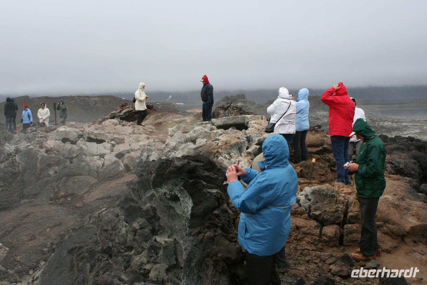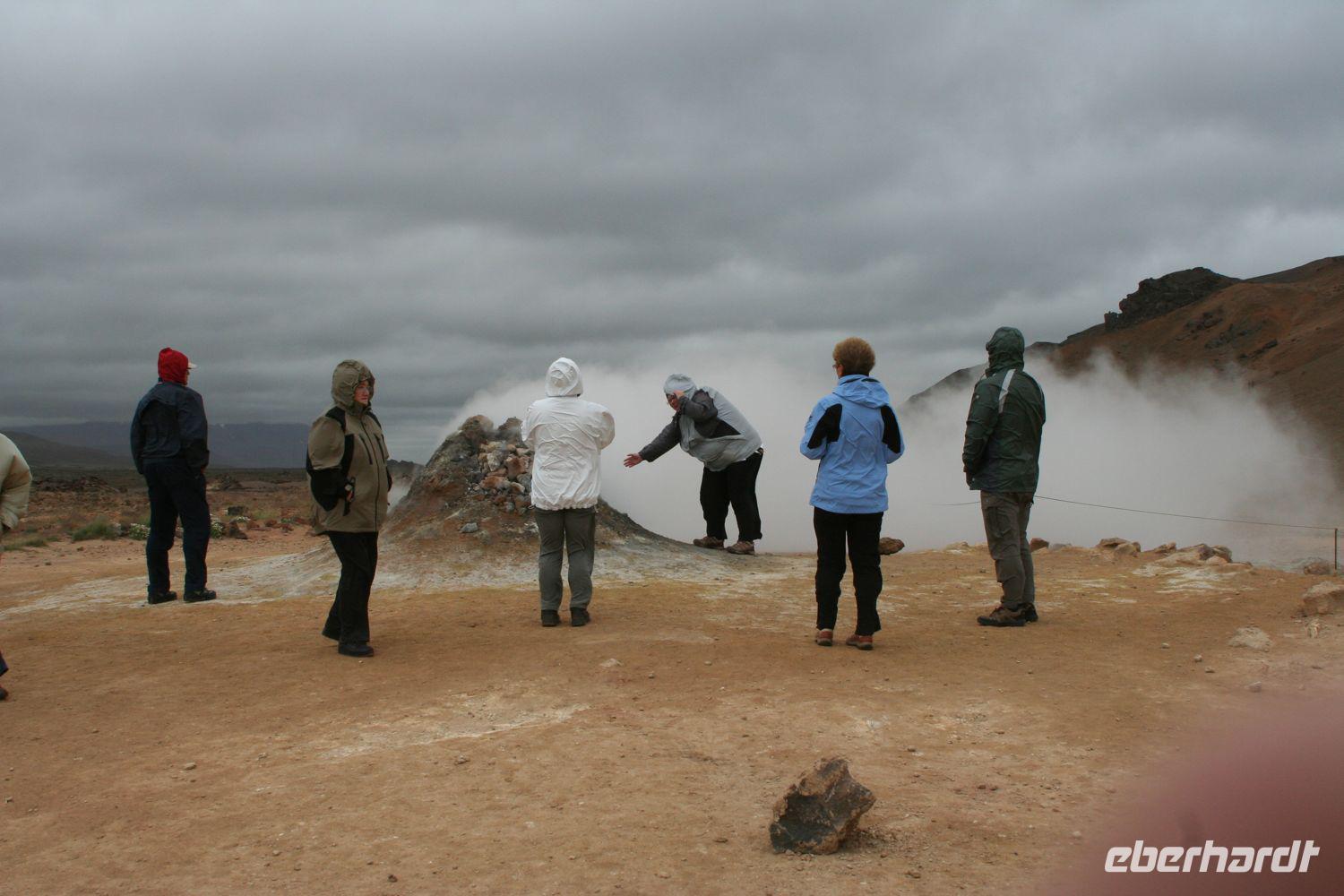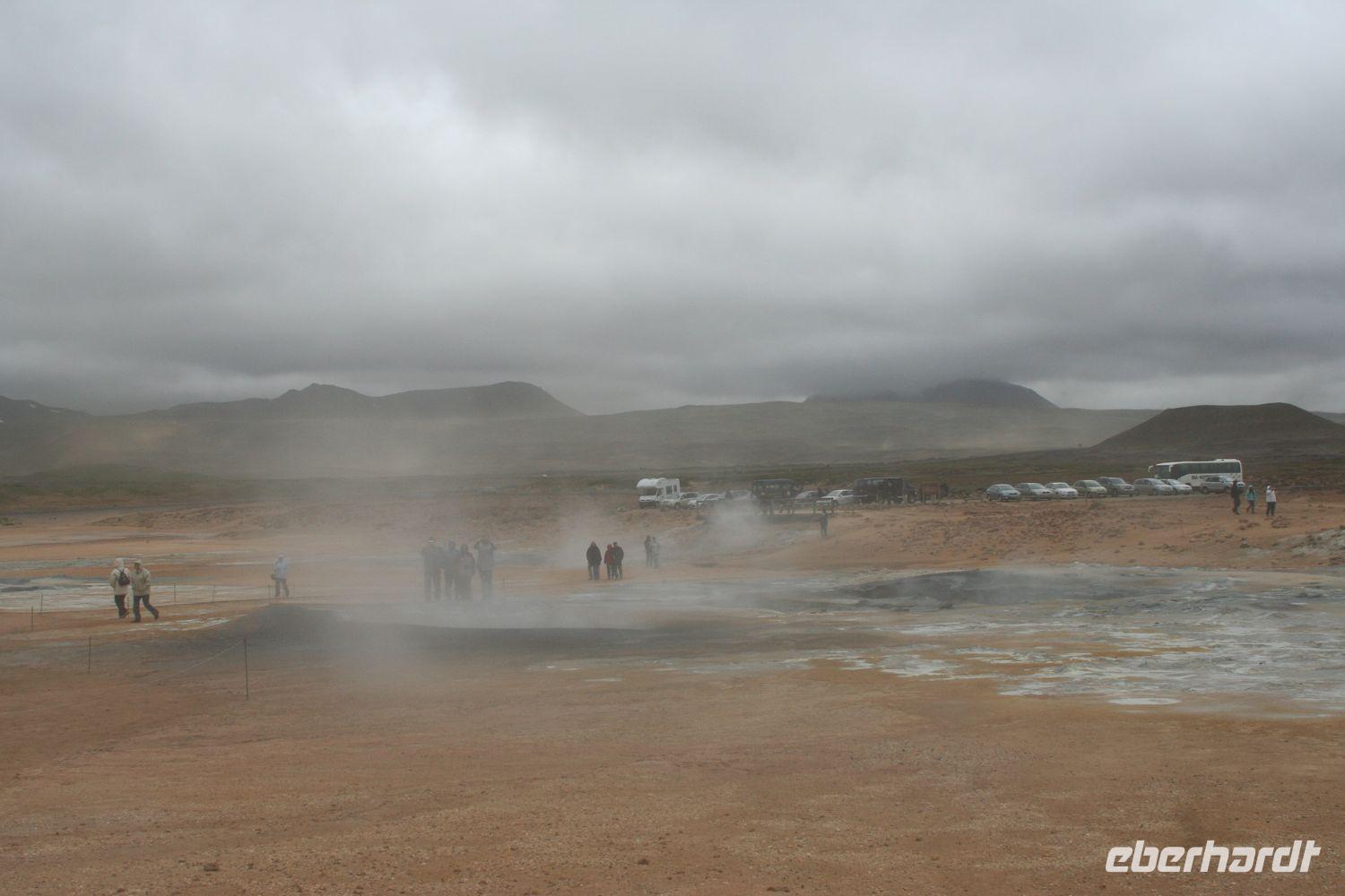 Unser erstes Ziel für heute hieß Godafoss, die Goden Wasserfälle. Sie sind mit gerade einmal 10 Metern Höhe nicht besonders hoch, aber ungefähr 70 Meter breit, schön anzuschauen und ein perfektes Postkartenmotiv. Anschließend fuhren wir weiter zum Myvatn-See, hier bewanderten wir die Krater, die durch blasen schlagende Lava entstanden sind. Der Myvatn-See hat seinen Namen, wie alles in Island, nicht ohne Grund. Übersetzt heißt er Mückensee. Aber wir hatten Aufgrund des feuchten Wetters Glück und mussten uns nicht vor eventuellen Angriffen von Mücken schützen, es waren keine da. In der Nähe des Myvatn-Sees befinden sich das Lavalabyrinth von Dimmuborgir, welches aus versteinerten Trollen bestehen soll, und die Schwefel-Schlammquellen von Námafjall Hverir. Bei einer einstündigen Wanderung erklommen wir den Krater des Leirhnjúkur und bestaunten die Überreste des Ausbruchs von vor ungefähr 25 Jahren. Zum Mittag fuhren wir in eine kleine isländische Bar Namens ?Gamli Baerium? am Myvatn-See. Nach dem Essen verließen wir das Gebiet um den Mückensee und fuhren nach Húsavík ins ?Fosshotel?, unserem heutigen Domizil für die Nacht. Húsavík ist für Walsafaris bekannt. Doch leider konnten wir aufgrund der schlechten Wetterlage nicht rausfahren. Stattdessen besuchten wir das Wal- und einige auch das Phallus-Museum, zudem ich jetzt mal lieber nichts weiter sage. Am Abend gab es ein dreigängiges Menü und anschließend, da ja Fußballweltmeisterschaft in Südafrika war, das Halbfinalspiel Spanien gegen Deutschland. Leider gewann Spanien mit 1:0. Schade.