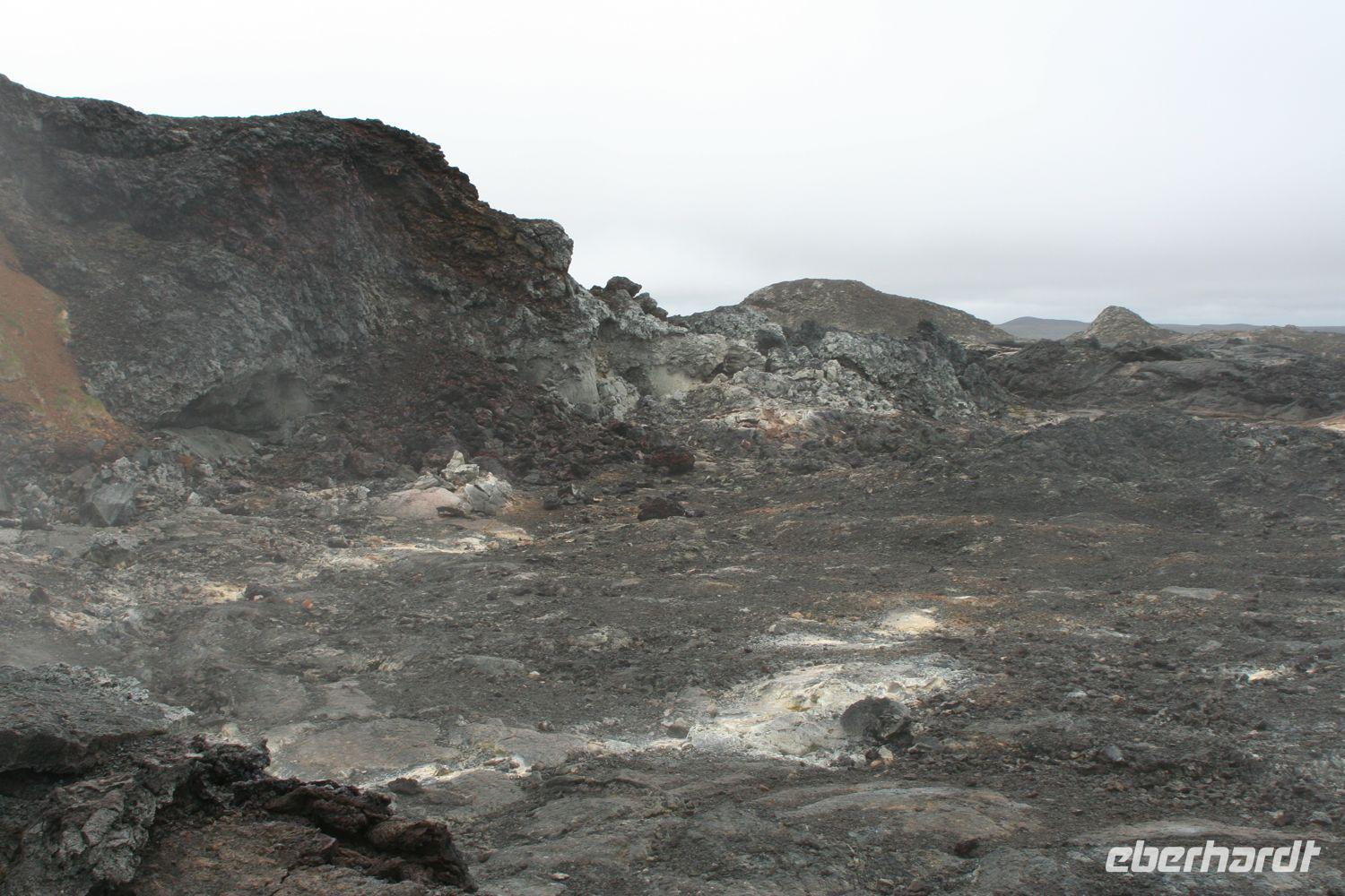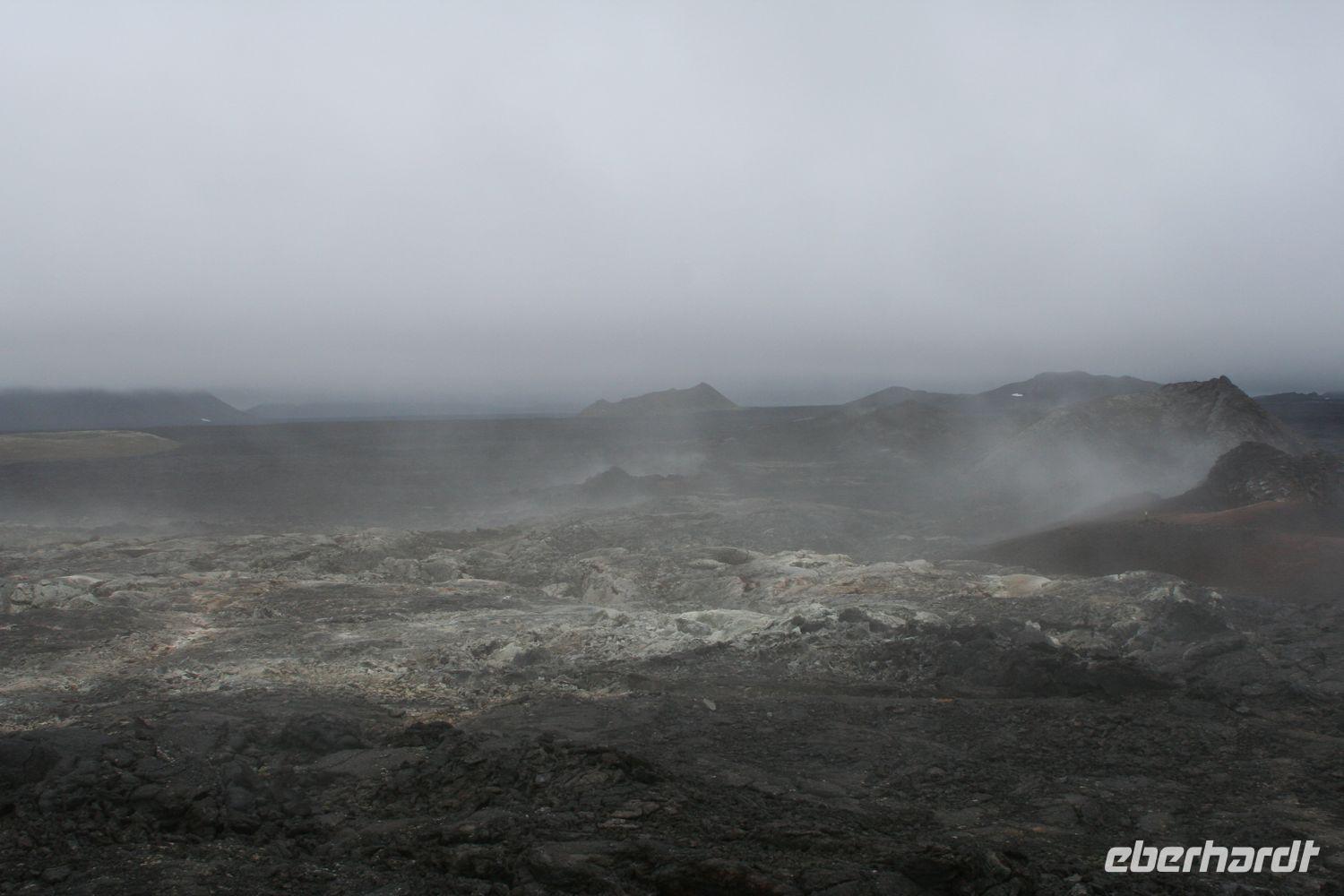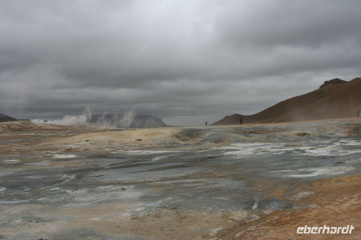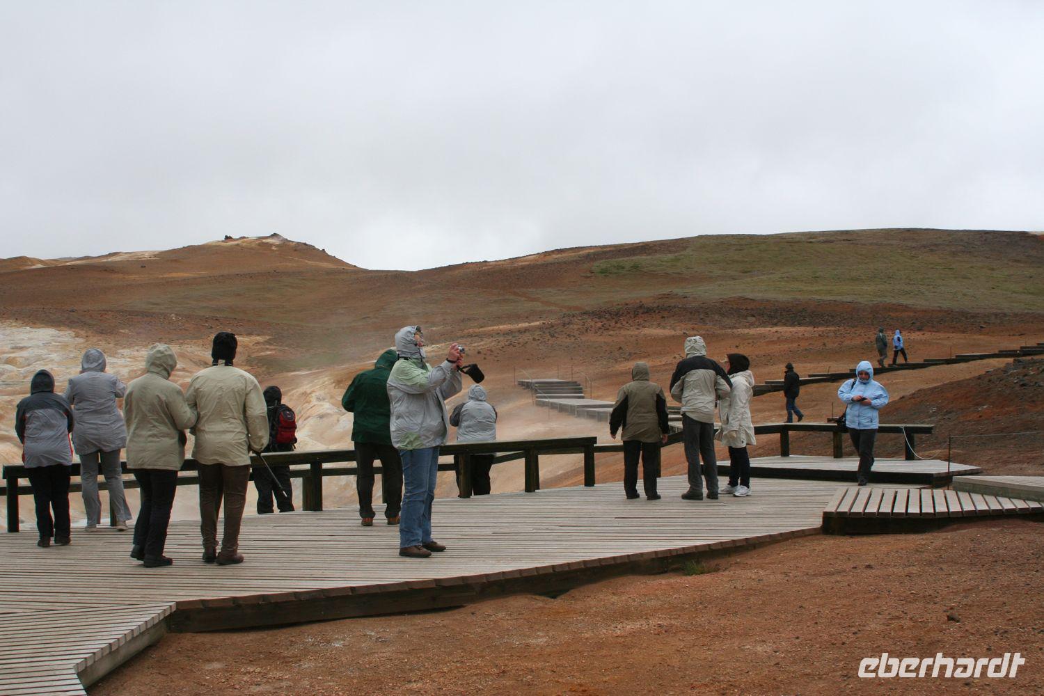 Unser erstes Ziel für heute hieß Godafoss, die Goden Wasserfälle. Sie sind mit gerade einmal 10 Metern Höhe nicht besonders hoch, aber ungefähr 70 Meter breit, schön anzuschauen und ein perfektes Postkartenmotiv. Anschließend fuhren wir weiter zum Myvatn-See, hier bewanderten wir die Krater, die durch blasen schlagende Lava entstanden sind. Der Myvatn-See hat seinen Namen, wie alles in Island, nicht ohne Grund. Übersetzt heißt er Mückensee. Aber wir hatten Aufgrund des feuchten Wetters Glück und mussten uns nicht vor eventuellen Angriffen von Mücken schützen, es waren keine da. In der Nähe des Myvatn-Sees befinden sich das Lavalabyrinth von Dimmuborgir, welches aus versteinerten Trollen bestehen soll, und die Schwefel-Schlammquellen von Námafjall Hverir. Bei einer einstündigen Wanderung erklommen wir den Krater des Leirhnjúkur und bestaunten die Überreste des Ausbruchs von vor ungefähr 25 Jahren. Zum Mittag fuhren wir in eine kleine isländische Bar Namens ?Gamli Baerium? am Myvatn-See. Nach dem Essen verließen wir das Gebiet um den Mückensee und fuhren nach Húsavík ins ?Fosshotel?, unserem heutigen Domizil für die Nacht. Húsavík ist für Walsafaris bekannt. Doch leider konnten wir aufgrund der schlechten Wetterlage nicht rausfahren. Stattdessen besuchten wir das Wal- und einige auch das Phallus-Museum, zudem ich jetzt mal lieber nichts weiter sage. Am Abend gab es ein dreigängiges Menü und anschließend, da ja Fußballweltmeisterschaft in Südafrika war, das Halbfinalspiel Spanien gegen Deutschland. Leider gewann Spanien mit 1:0. Schade.
