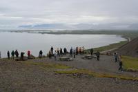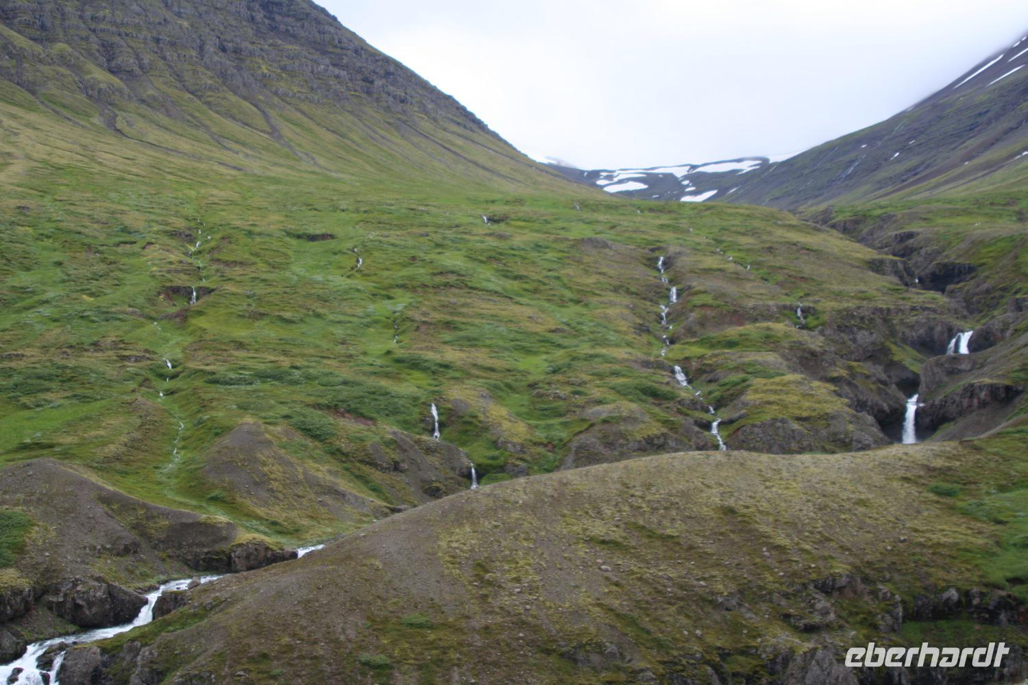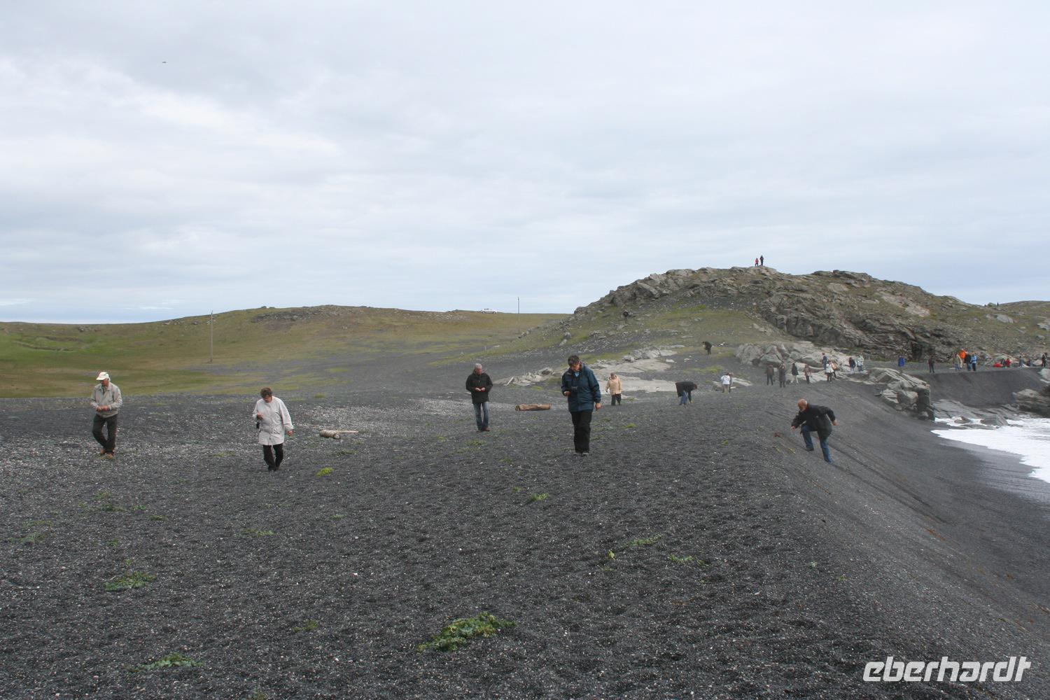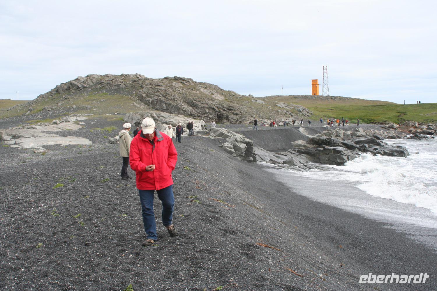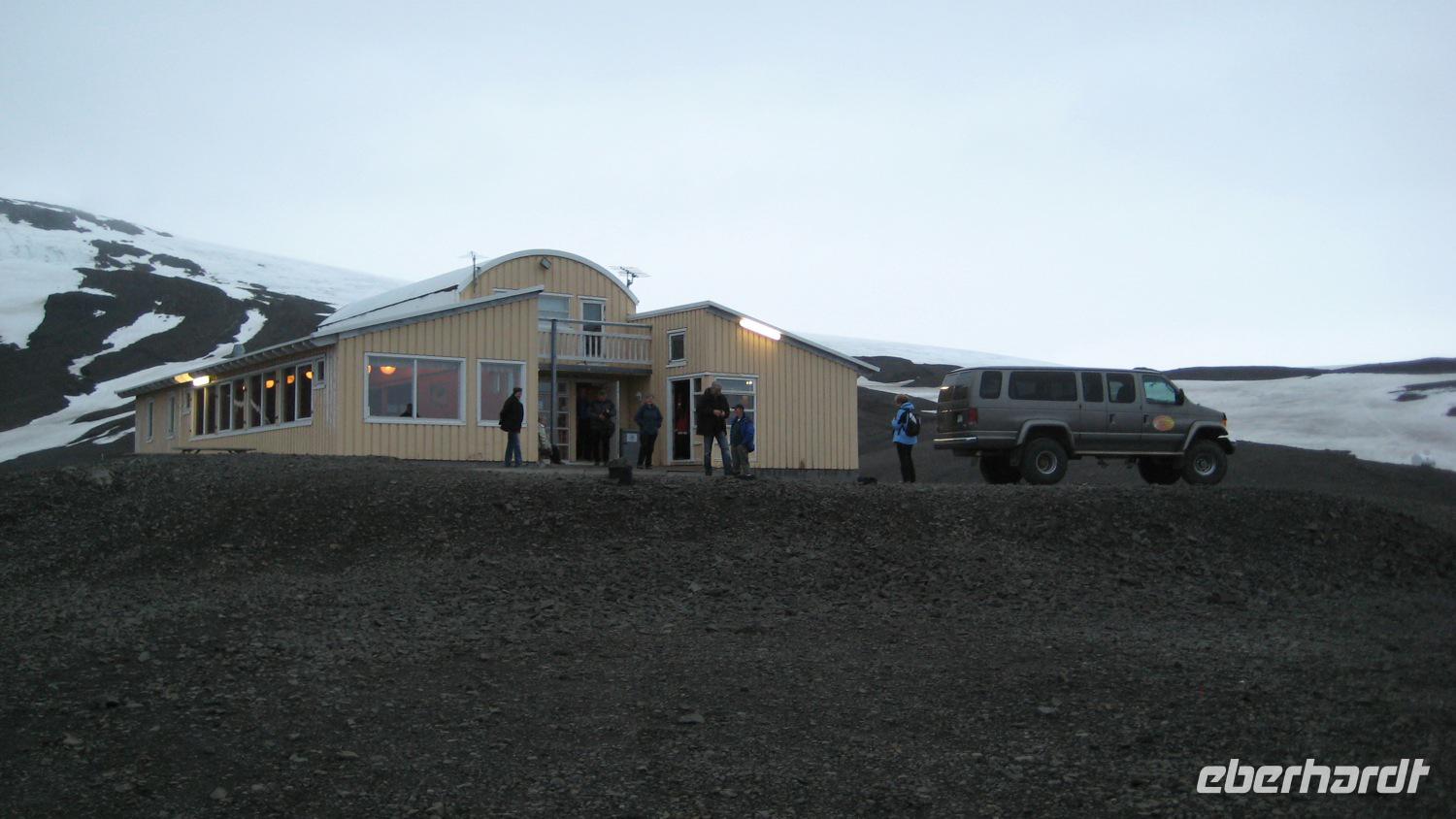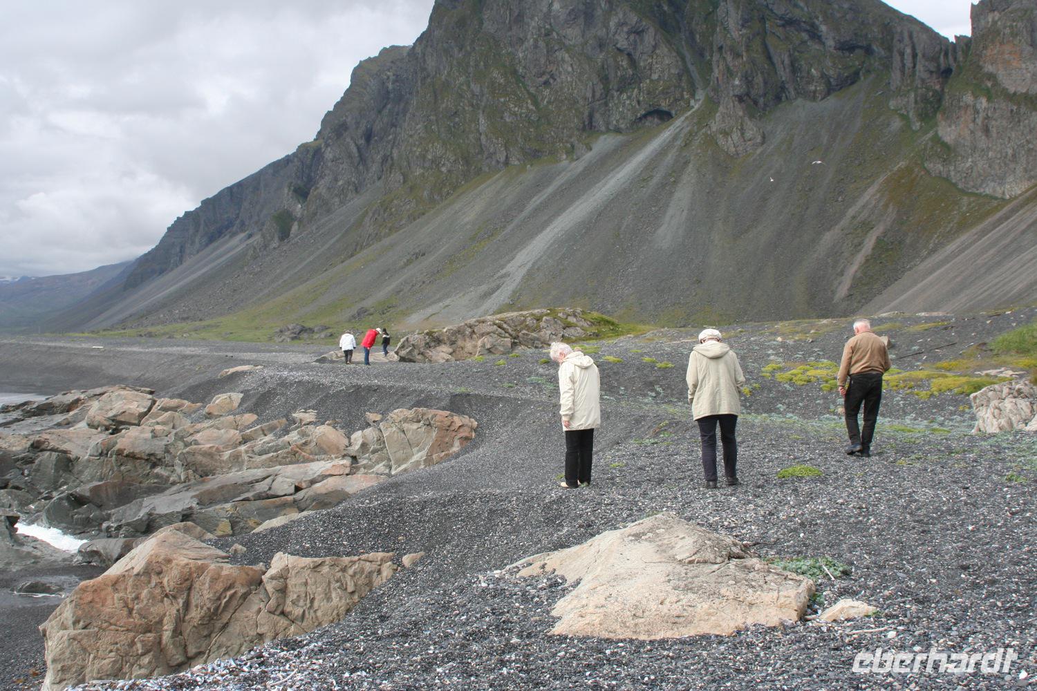 Nach dem dem Frühstück luden wir unser Gepäck in den Bus und fuhren über Eglisstadir zur Straße 92 die durch das Tal des Reyarfjördur geht. Bei der durchfahrt wusste man gar nicht ob man nun nach rechts oder doch besser nach links gucken sollte, denn von den Bergen zu beiden Seiten ergossen sich unzählige kleine Wasserfälle in das Tal. Zudem wuchs überall hellgrün leuchtendes Quellmoos, dass die Anblick komplettierte. Mit Hilfe eines Tunnels durch die Berge verkürzten wir die Fahrt zum Fáskrudsfjördur. Von nun an ging es immer an der Küste entlang und somit durch die sogenannten Ostfjorde, von denen einer schöner als er andere ist. In Strödvarflördur machten wir einen Stopp und bestaunten die vielen Mineralgesteine in ?Petras Steinhaus?. Zum Mittag kehrten wir in die Langahut in Djúpivogur ein. Weiter ging es entlang der Ostfjorde zum Lagunenfjord, der zu einem kleinen Strandspaziergang einlud und viele hunderte Schwäne einen sicheren Hafen bietet. Bevor es am Abend dann zum Hummeressen in Höfn ging, bezogen wir noch unsere Zimmer im Hotel ?Asgardur?. Nach dem Essen, so gegen 19:40 Uhr wurden wir von drei groß bereiften geländegängigen Jeeps abgeholt, denn nun wurde es Abenteuerlich.