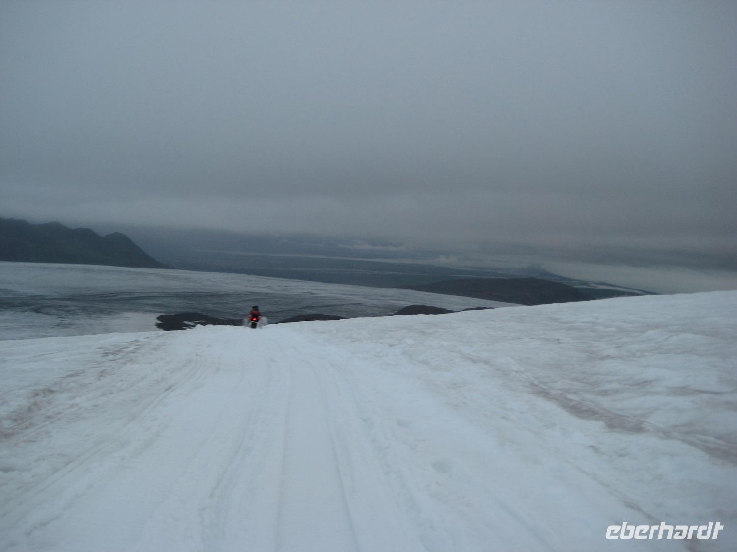 Die Jeeps brachten uns innerhalb von 55 Minuten von Meereshöhe in Höfn, über eine Schotterpiste, auf eine Höhe von 830 Meter und damit an den Rand des Gletscher Vatnajökull. Nach dem überziehen der Overalls und einer kurzen Einweisung ging es mit dem Snowmobile bzw. dem Jeep direkt auf den Gletscher und damit bis in eine Höhe von gut 1200 Metern. Dabei erfuhren wir, dass der Vatnajökull eine Fläche von 8000 Quadratkilometer und eine Höhe von bis zu 1000 Metern besitzt. Beinahe anderthalb Stunden waren wir auf dem Gletscher unterwegs. Wir fanden es unglaublich beeindruckend und einmalig. Von dem Gletscher brachten uns die Jeeps wieder zu unserem Hotel in Höfn, wo wir begeistert aber auch sehr müde ins Bett fielen.
