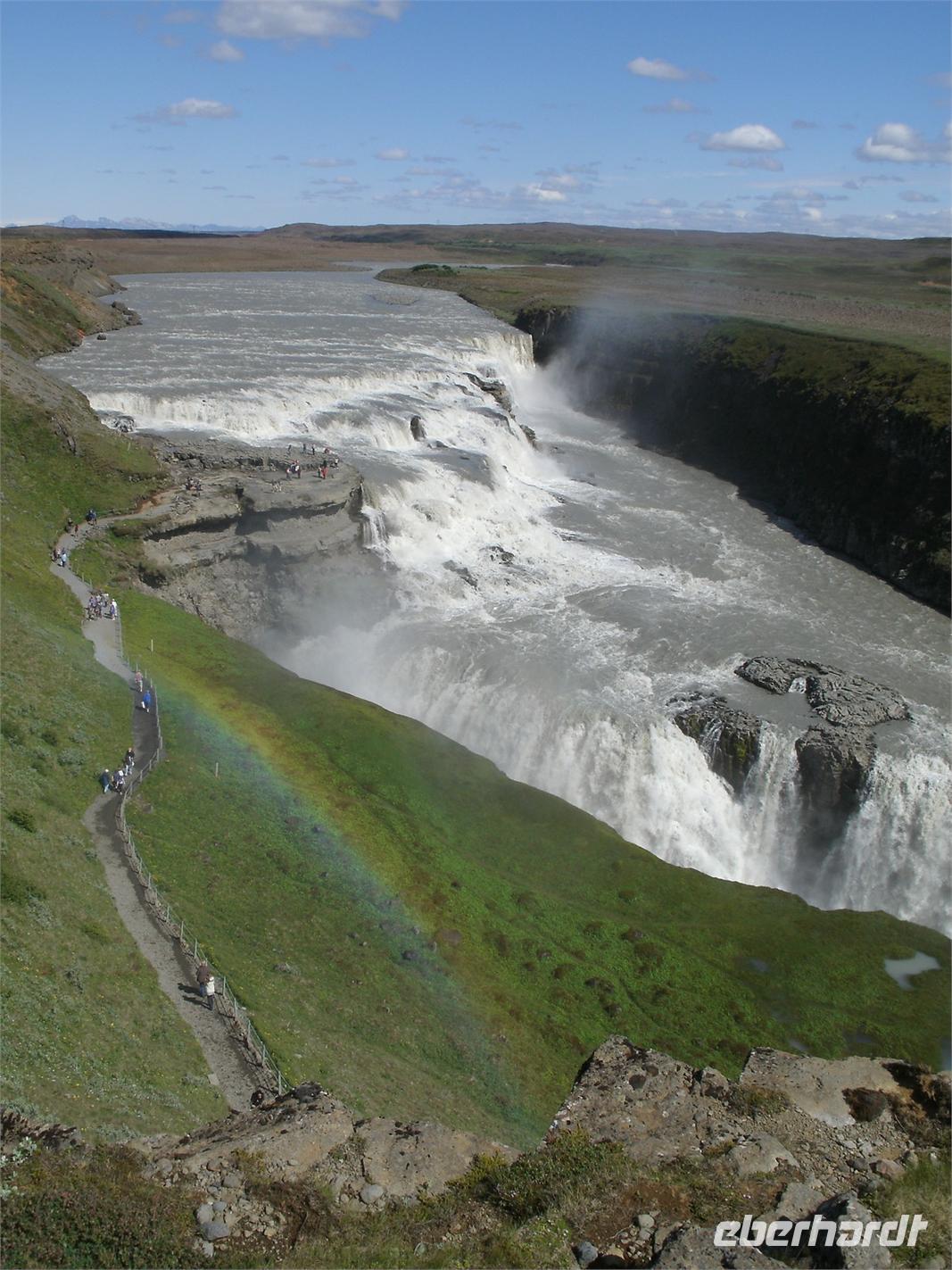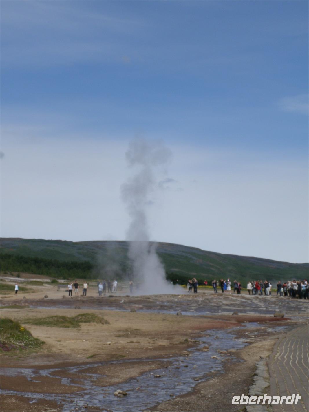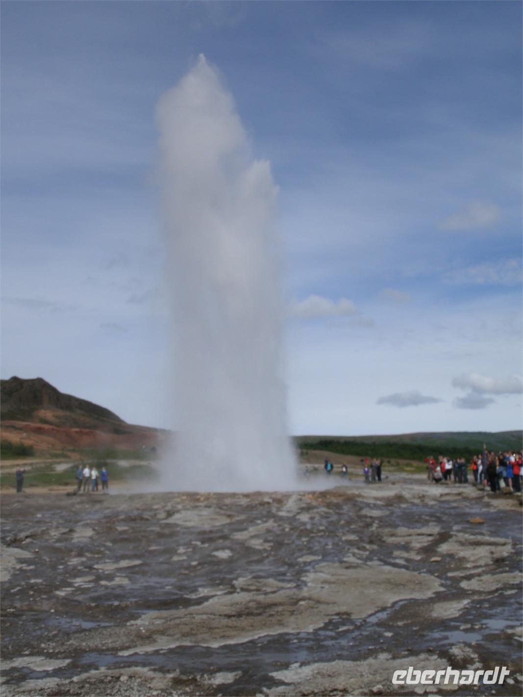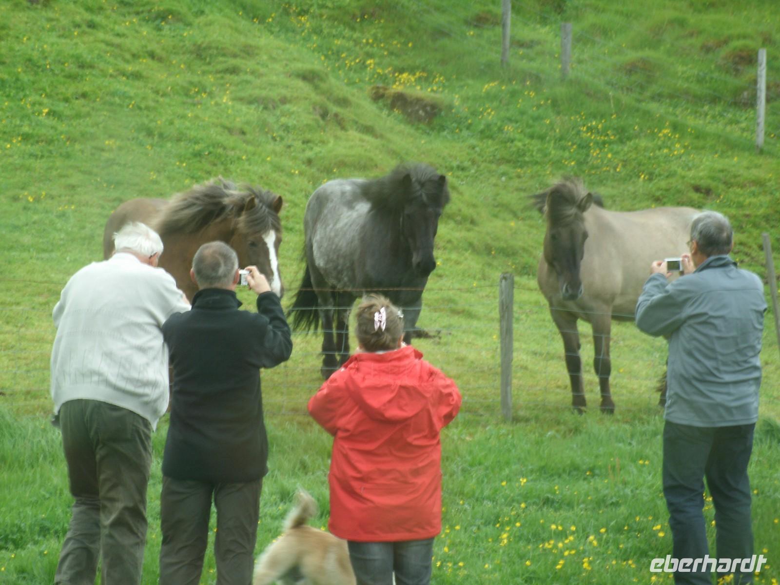 Am Morgen ging es zuerst zu den markanten Felsnadeln "Reynisdrangar". Bei starkem, böigem Wind spazierten wir entlang des schwarzen Sandstrandes. Selbst manche Mützen blieben nicht mehr auf dem Kopf sicher, sie wurden einfach von dem Wind davon geblassen. Nach einem kurzen Stopp bei Islandpferden fuhren wir in das Heimatmuseum von Skógar. Ein riesiges Segelschiff überwältigte uns. Dies stand inmitten des Museums. Das Museum befindet sich unterhalb des berühmten Vulkans Eyjafjallajökull, welcher im April 2010 ein weltweites Chaos anrichtete. Nach dem Besuch des benachbarten Verkehrsmuseums fuhren zum Skógafoss. Ein wunderschön anzuseheneder Wasserfall. Nach einem kurzen Stopp, auf Grund des Windes, fuhren wir weiter zum berühmten Geysir. Dieser liegt auf dem "Goldenen Kreis". Der Geysir "Stokkur" schießt alle 5 Minuten aus der Erde heraus. Kaum zu glauben, welch Kräfte hier wieder in der Erde arbeiten. Alle warteten gespannt auf den "Ausbruch", im Kreis standen alle mit Ihren Kameras. Nach einer kurzen Mittagspause fuhren wir zum nicht weit entfernt gelegenen Gullfoss, der sogenannte "Goldene Wasserfall". Hier wieder bei strahlendem Sonnenschein, erlebten wir einen reißenden Strom. Ein Regenbogen zeigte sich direkt vor dem Wasserfall. Dieser zierte jedes Fotomotiv. Am Ende haben wir noch eine kleine Wanderung durch Thingvellir unternommen. Hier wurde 930 das erste demokratische Parlament ausgerufen. Am Abend sind wir wieder in Reykjavik angekommen und genossen ein reichhaltiges Fischbuffet.