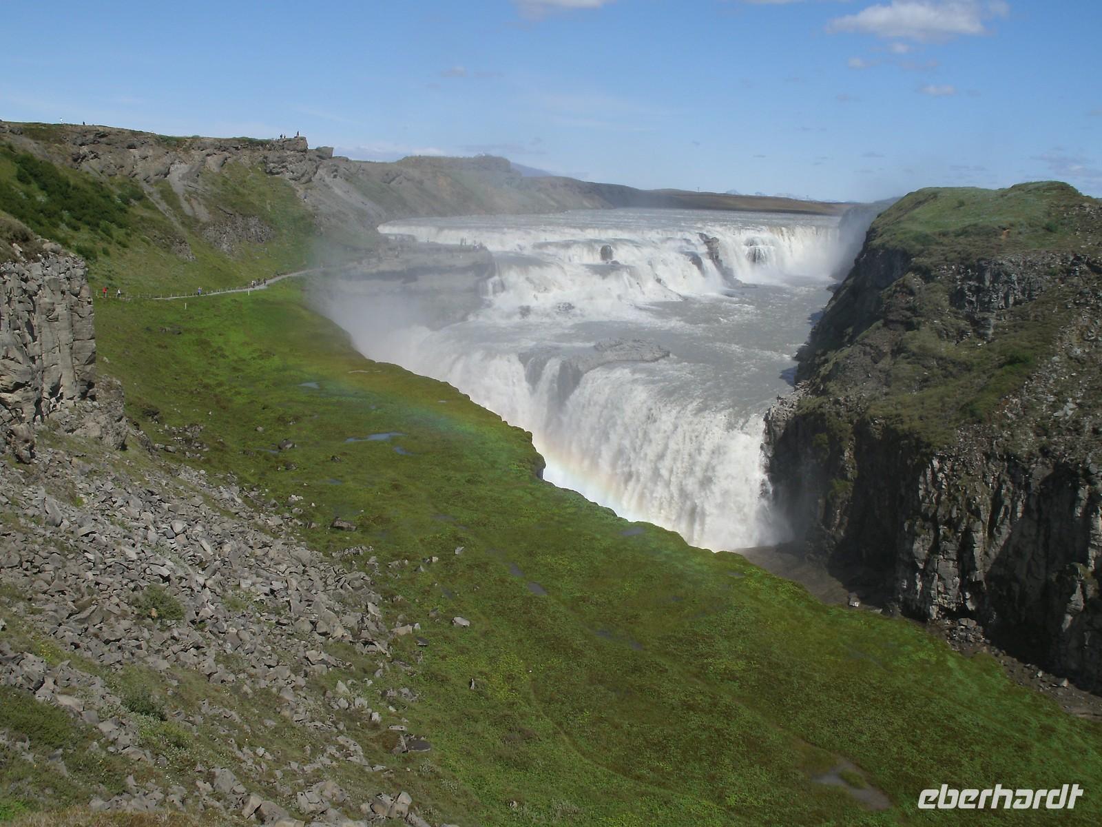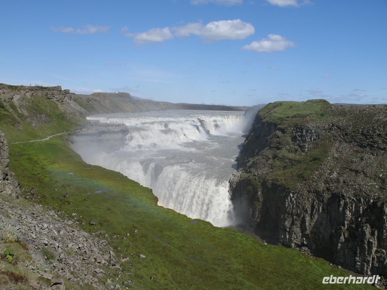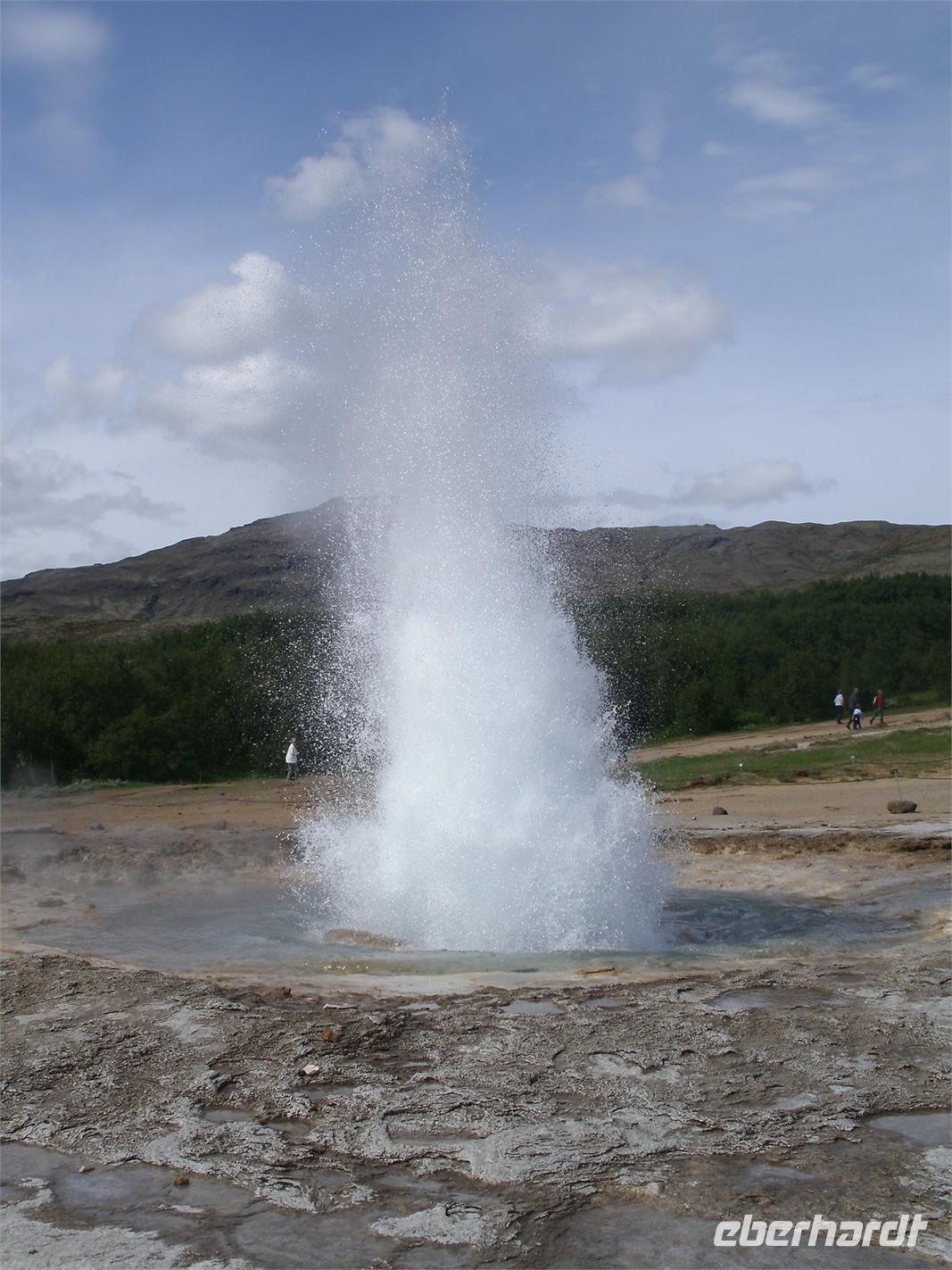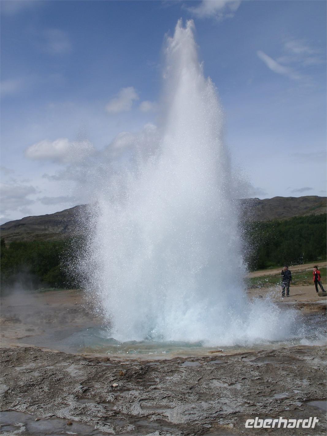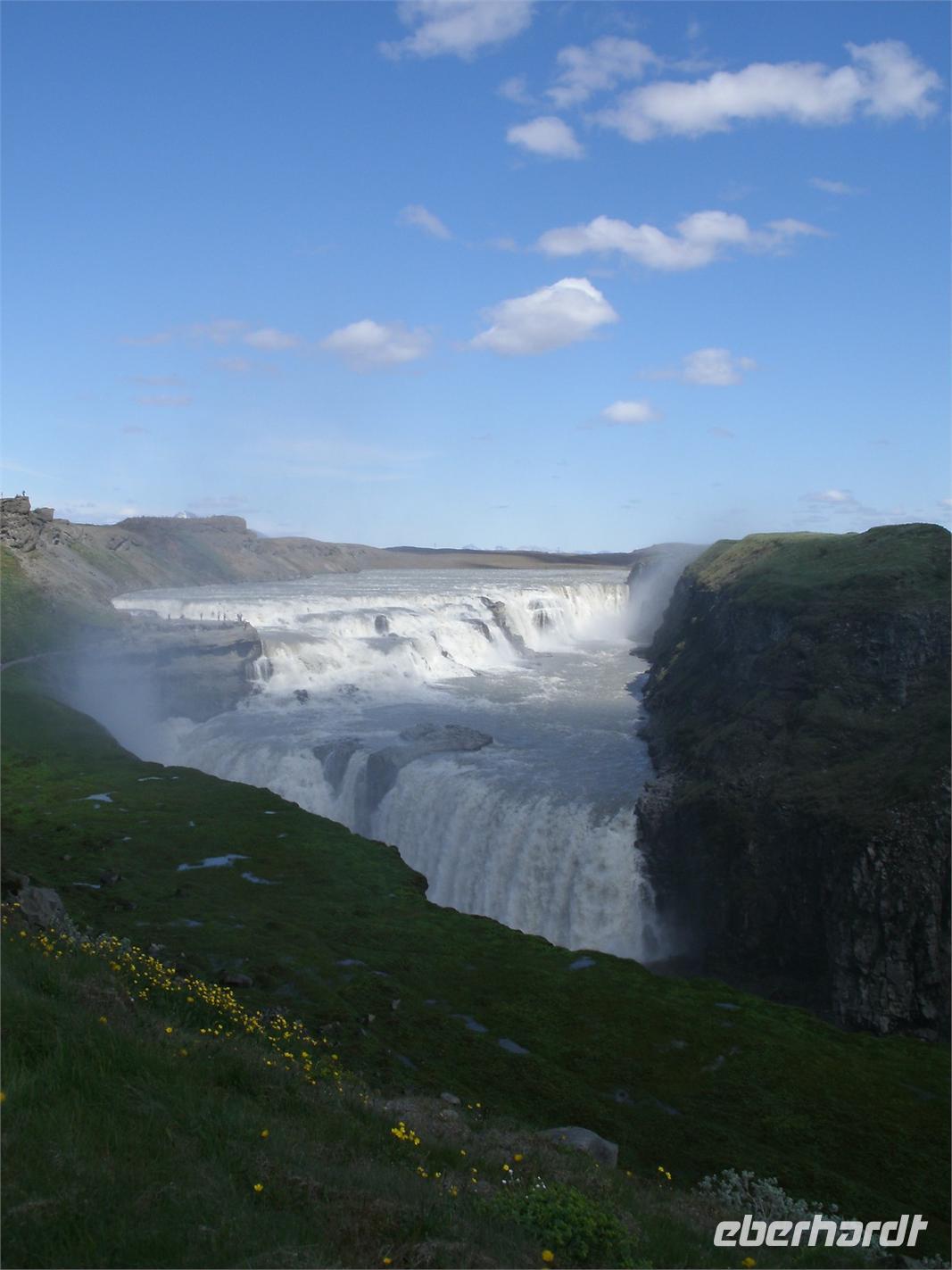 Am Morgen ging es zuerst zu den markanten Felsnadeln "Reynisdrangar". Bei starkem, böigem Wind spazierten wir entlang des schwarzen Sandstrandes. Selbst manche Mützen blieben nicht mehr auf dem Kopf sicher, sie wurden einfach von dem Wind davon geblassen. Nach einem kurzen Stopp bei Islandpferden fuhren wir in das Heimatmuseum von Skógar. Ein riesiges Segelschiff überwältigte uns. Dies stand inmitten des Museums. Das Museum befindet sich unterhalb des berühmten Vulkans Eyjafjallajökull, welcher im April 2010 ein weltweites Chaos anrichtete. Nach dem Besuch des benachbarten Verkehrsmuseums fuhren zum Skógafoss. Ein wunderschön anzuseheneder Wasserfall. Nach einem kurzen Stopp, auf Grund des Windes, fuhren wir weiter zum berühmten Geysir. Dieser liegt auf dem "Goldenen Kreis". Der Geysir "Stokkur" schießt alle 5 Minuten aus der Erde heraus. Kaum zu glauben, welch Kräfte hier wieder in der Erde arbeiten. Alle warteten gespannt auf den "Ausbruch", im Kreis standen alle mit Ihren Kameras. Nach einer kurzen Mittagspause fuhren wir zum nicht weit entfernt gelegenen Gullfoss, der sogenannte "Goldene Wasserfall". Hier wieder bei strahlendem Sonnenschein, erlebten wir einen reißenden Strom. Ein Regenbogen zeigte sich direkt vor dem Wasserfall. Dieser zierte jedes Fotomotiv. Am Ende haben wir noch eine kleine Wanderung durch Thingvellir unternommen. Hier wurde 930 das erste demokratische Parlament ausgerufen. Am Abend sind wir wieder in Reykjavik angekommen und genossen ein reichhaltiges Fischbuffet.