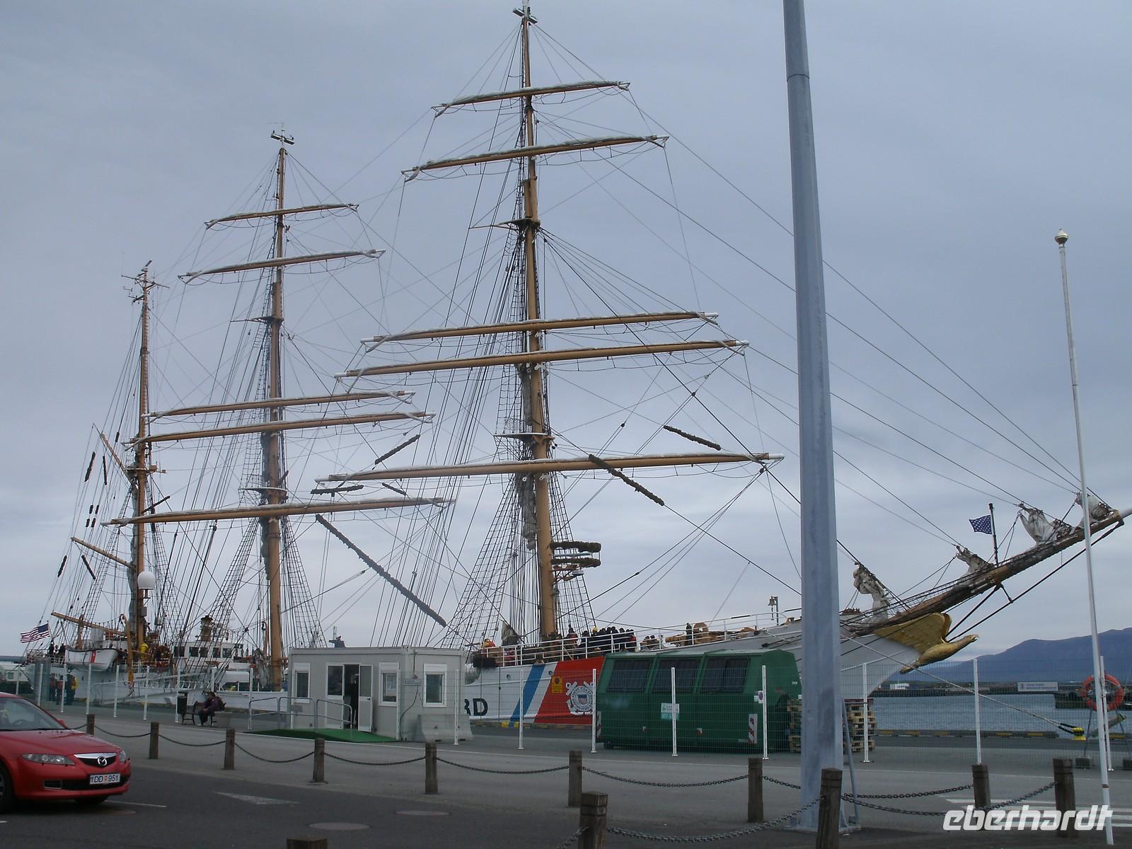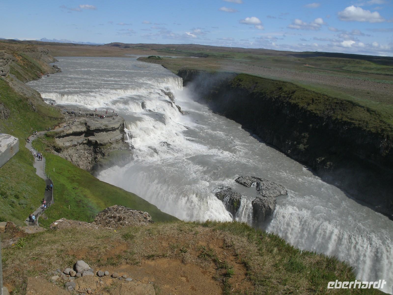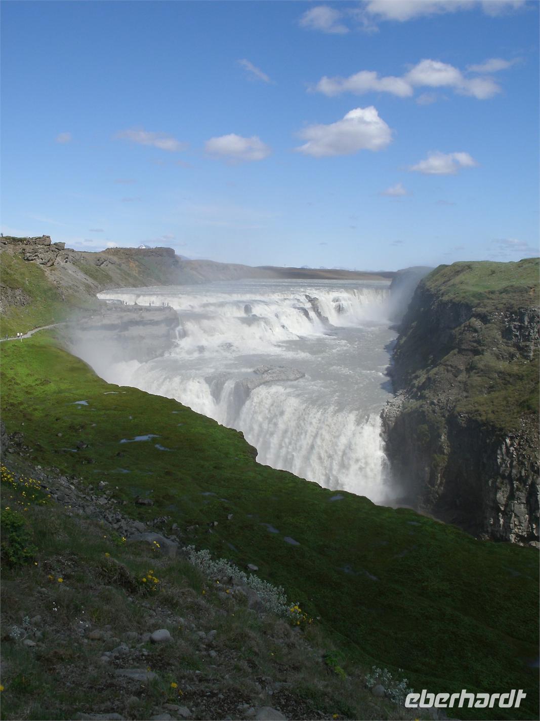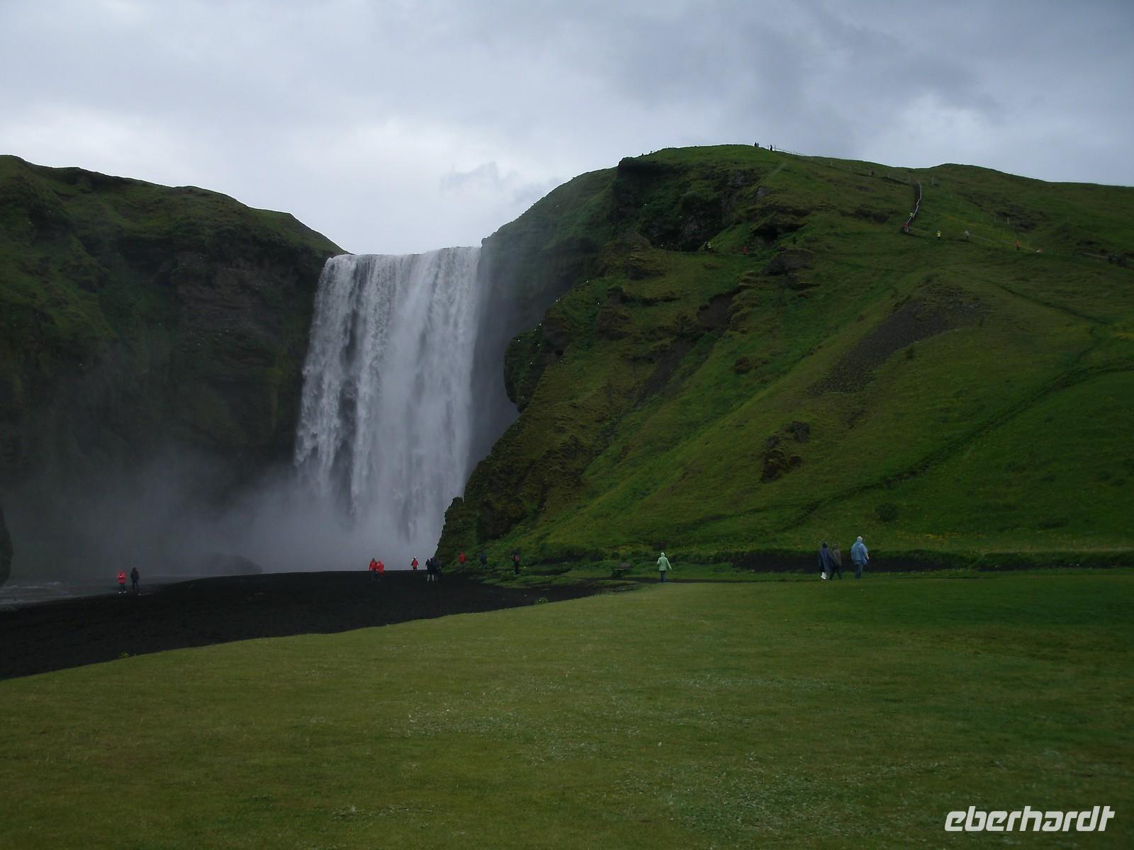 Am Morgen ging es zuerst zu den markanten Felsnadeln "Reynisdrangar". Bei starkem, böigem Wind spazierten wir entlang des schwarzen Sandstrandes. Selbst manche Mützen blieben nicht mehr auf dem Kopf sicher, sie wurden einfach von dem Wind davon geblassen. Nach einem kurzen Stopp bei Islandpferden fuhren wir in das Heimatmuseum von Skógar. Ein riesiges Segelschiff überwältigte uns. Dies stand inmitten des Museums. Das Museum befindet sich unterhalb des berühmten Vulkans Eyjafjallajökull, welcher im April 2010 ein weltweites Chaos anrichtete. Nach dem Besuch des benachbarten Verkehrsmuseums fuhren zum Skógafoss. Ein wunderschön anzuseheneder Wasserfall. Nach einem kurzen Stopp, auf Grund des Windes, fuhren wir weiter zum berühmten Geysir. Dieser liegt auf dem "Goldenen Kreis". Der Geysir "Stokkur" schießt alle 5 Minuten aus der Erde heraus. Kaum zu glauben, welch Kräfte hier wieder in der Erde arbeiten. Alle warteten gespannt auf den "Ausbruch", im Kreis standen alle mit Ihren Kameras. Nach einer kurzen Mittagspause fuhren wir zum nicht weit entfernt gelegenen Gullfoss, der sogenannte "Goldene Wasserfall". Hier wieder bei strahlendem Sonnenschein, erlebten wir einen reißenden Strom. Ein Regenbogen zeigte sich direkt vor dem Wasserfall. Dieser zierte jedes Fotomotiv. Am Ende haben wir noch eine kleine Wanderung durch Thingvellir unternommen. Hier wurde 930 das erste demokratische Parlament ausgerufen. Am Abend sind wir wieder in Reykjavik angekommen und genossen ein reichhaltiges Fischbuffet.