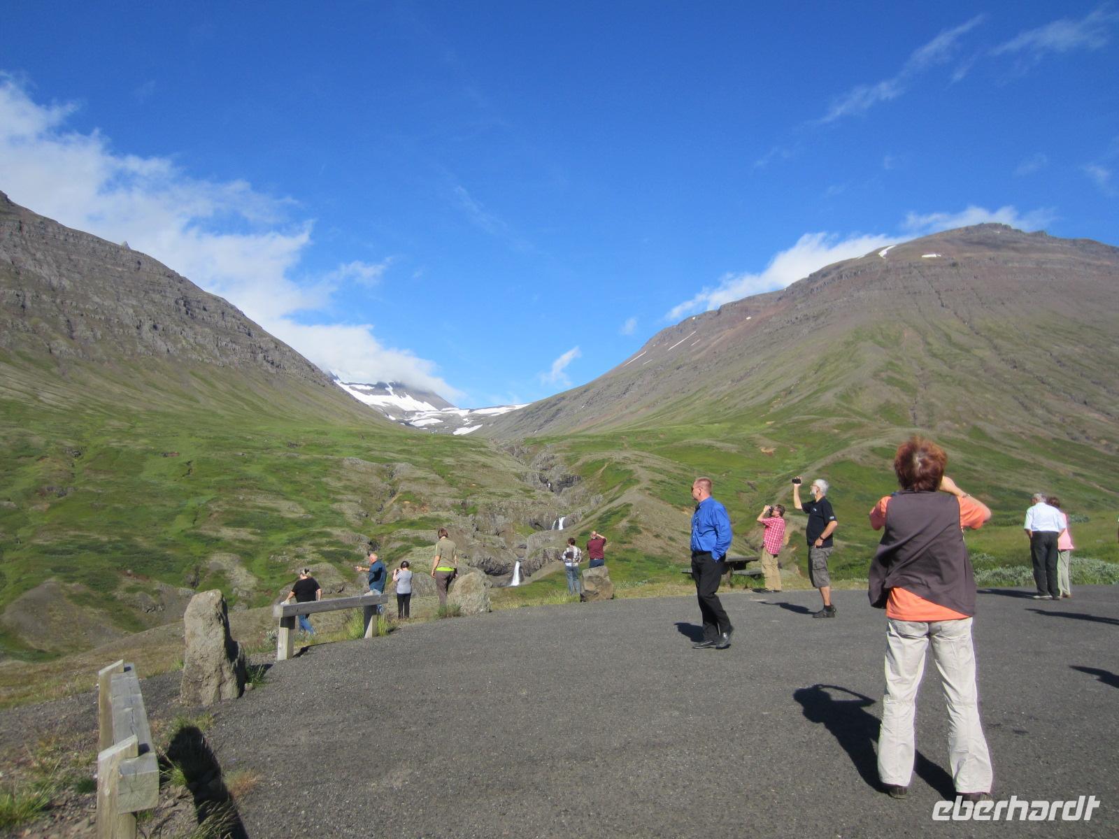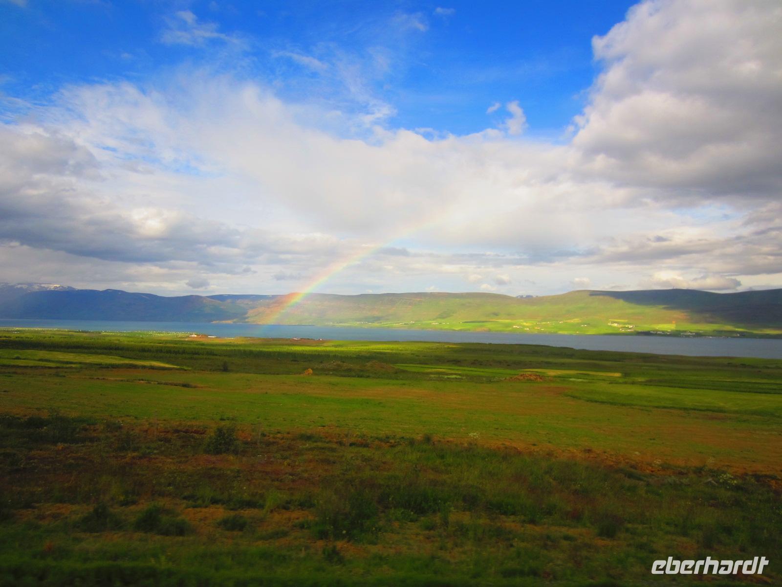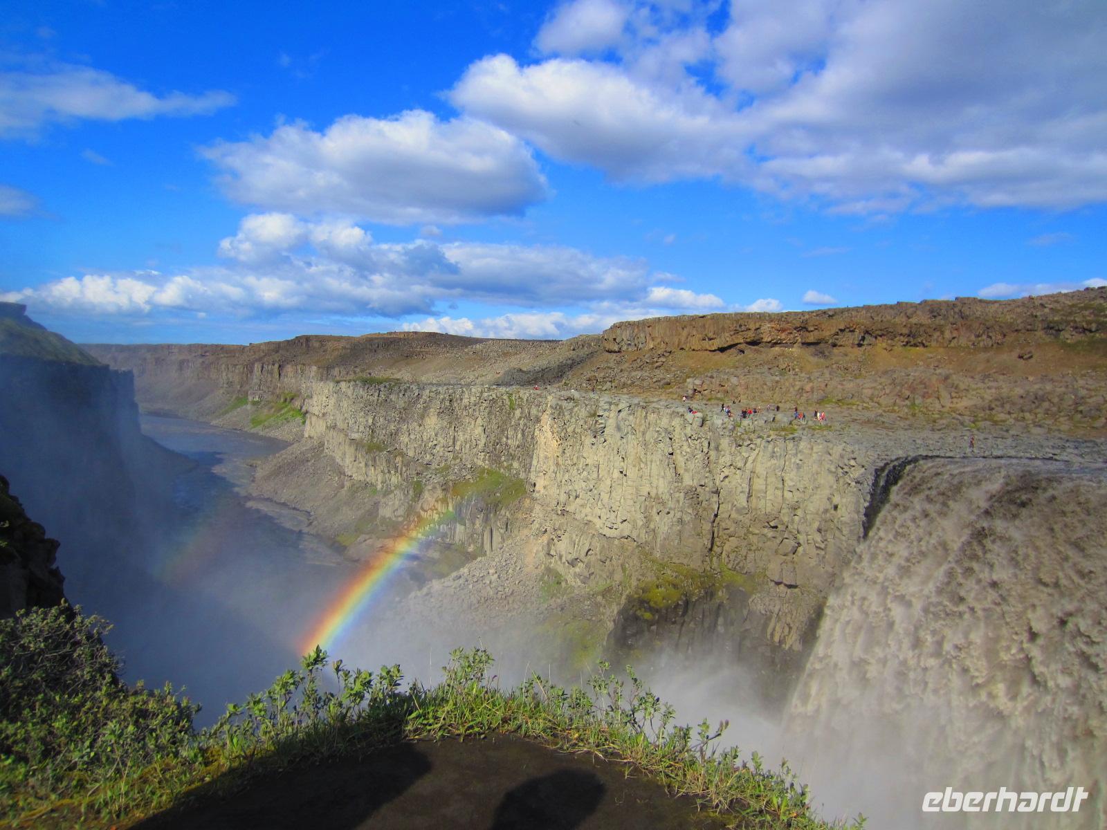 Wir lernten schnell, dass die Isländer sehr gemütlich sind und morgens gern länger schlafen. So war gegen 10 Uhr morgens im Fischerdorf Húsavik kaum ein Mensch auf der Straße, jedoch wurden schon Vorbereitungen für das abendliche Fest getroffen. Eine Feierlichkeit zu Ehren der Süßigkeiten sollte heute stattfinden. So war der Ort bunt geschmückt und ein Festzelt, sowie eine Bühne waren bereits aufgebaut. Da die Isländer auch gern feiern, würde es sicher noch ein rauschendes Fest werden. Doch für uns ging es schon weiter nach Asbyrgi, wo wir einen Spaziergang durch die beeindruckende Schlucht machten. Nach einer Fahrt über die hügeligen Straßen der isländischen Einöde gelangten wir zum Dettifoss, dem wasserreichsten Wasserfall Europas. Mit einer unheimlichen Kraft stürzte das Wasser in die Tiefe und im Sonnenschein spannte sich für uns noch eine Regenbogenbrücke über die Fluten. Es war ein gewaltiger Anblick, den man so schnell nicht vergisst. Der Nachmittag gestaltete sich für uns mit einer Fahrt über das Hochland. Es heißt, dass es nahezu unmöglich ist hier zu leben. Rosa erzählte uns so einige spannende Geschichte über Aussätzige und las uns aus den Kinderbüchern von Nonne vor. In der isländischen Einöde konnte man sich wahrlich verlieren und die Gedanken weit streifen lassen. Auf einem kleinen Bauernhof mitten im Nirgendwo nahmen wir einen Kaffee und gebratene Mäuschen, eine isländische Süßgkeit, zu uns. Am Abend erreichten wir unser Edda Hotel in Egelstadir und genossen noch ein leckeres Menü mit Fisch und „Eheglück“ zum Nachtisch.