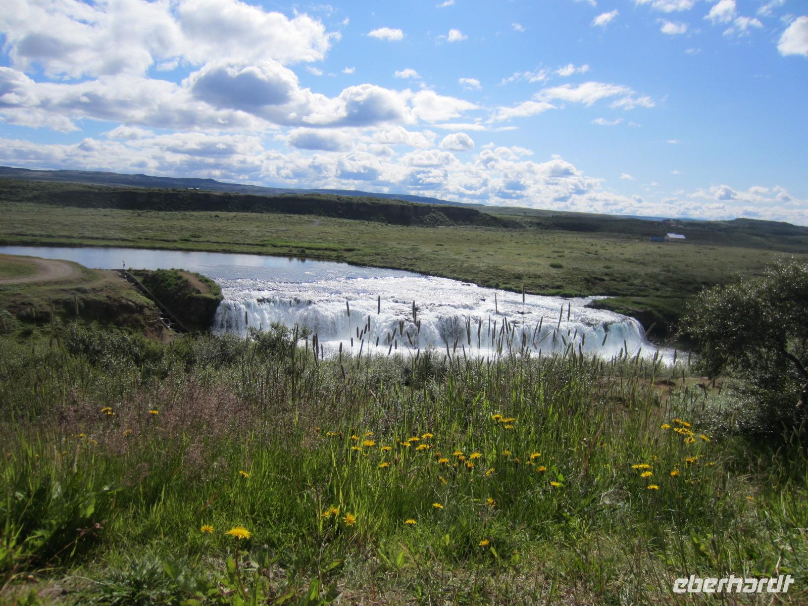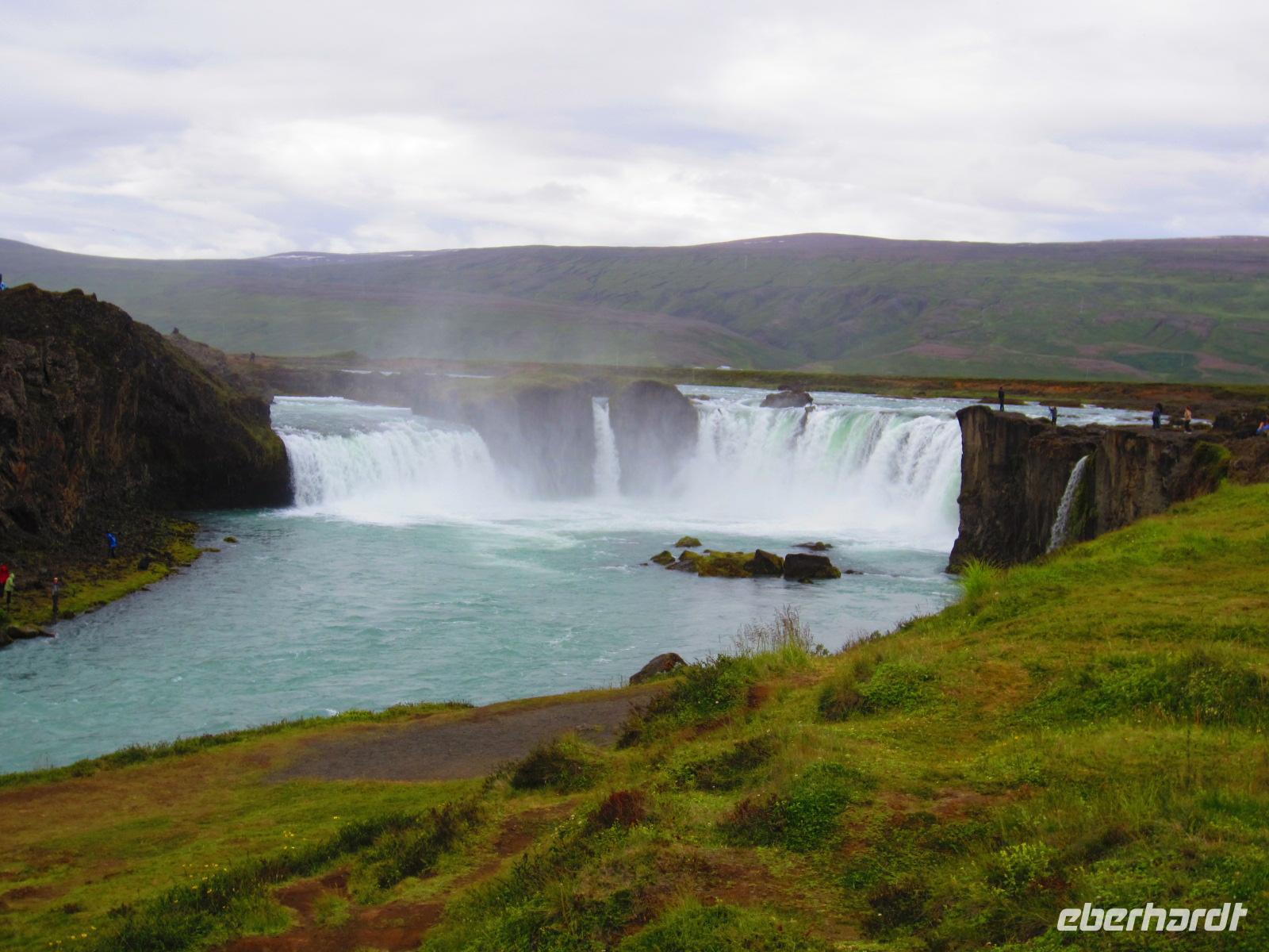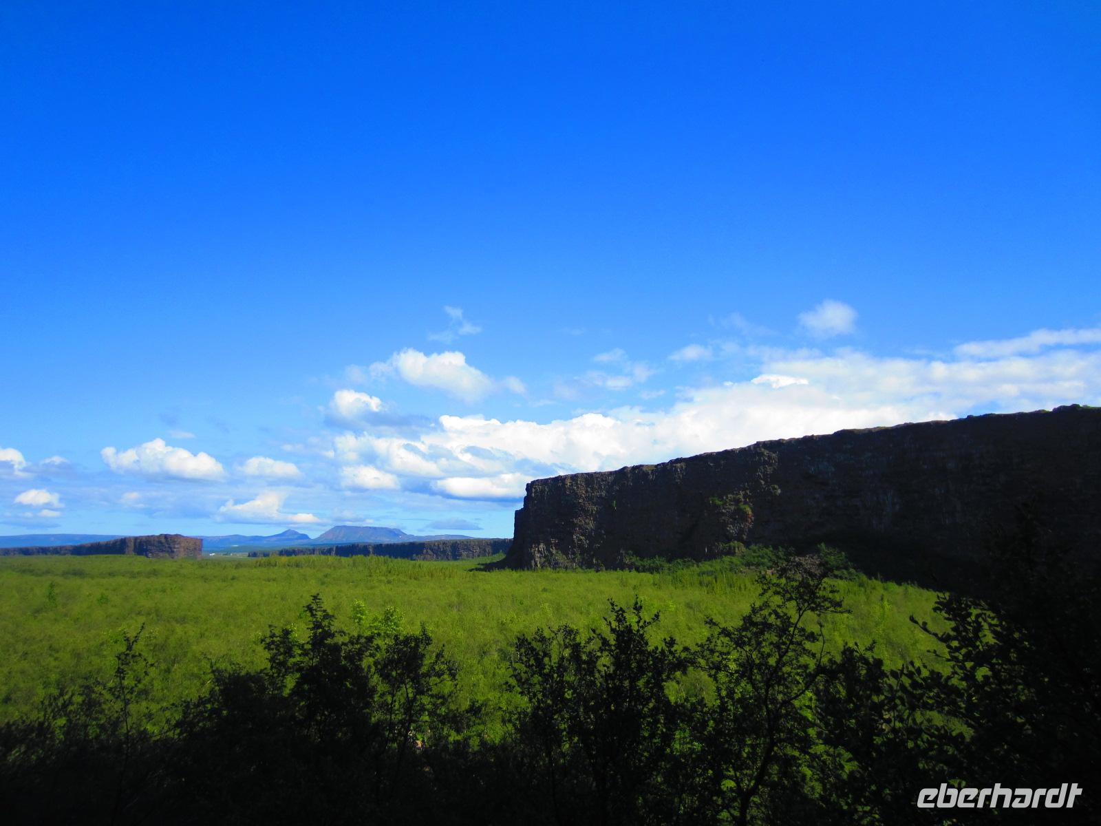 Wir lernten schnell, dass die Isländer sehr gemütlich sind und morgens gern länger schlafen. So war gegen 10 Uhr morgens im Fischerdorf Húsavik kaum ein Mensch auf der Straße, jedoch wurden schon Vorbereitungen für das abendliche Fest getroffen. Eine Feierlichkeit zu Ehren der Süßigkeiten sollte heute stattfinden. So war der Ort bunt geschmückt und ein Festzelt, sowie eine Bühne waren bereits aufgebaut. Da die Isländer auch gern feiern, würde es sicher noch ein rauschendes Fest werden. Doch für uns ging es schon weiter nach Asbyrgi, wo wir einen Spaziergang durch die beeindruckende Schlucht machten. Nach einer Fahrt über die hügeligen Straßen der isländischen Einöde gelangten wir zum Dettifoss, dem wasserreichsten Wasserfall Europas. Mit einer unheimlichen Kraft stürzte das Wasser in die Tiefe und im Sonnenschein spannte sich für uns noch eine Regenbogenbrücke über die Fluten. Es war ein gewaltiger Anblick, den man so schnell nicht vergisst. Der Nachmittag gestaltete sich für uns mit einer Fahrt über das Hochland. Es heißt, dass es nahezu unmöglich ist hier zu leben. Rosa erzählte uns so einige spannende Geschichte über Aussätzige und las uns aus den Kinderbüchern von Nonne vor. In der isländischen Einöde konnte man sich wahrlich verlieren und die Gedanken weit streifen lassen. Auf einem kleinen Bauernhof mitten im Nirgendwo nahmen wir einen Kaffee und gebratene Mäuschen, eine isländische Süßgkeit, zu uns. Am Abend erreichten wir unser Edda Hotel in Egelstadir und genossen noch ein leckeres Menü mit Fisch und „Eheglück“ zum Nachtisch.