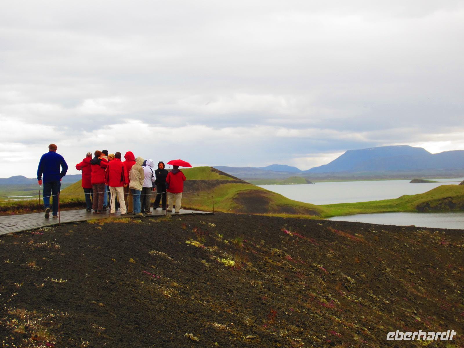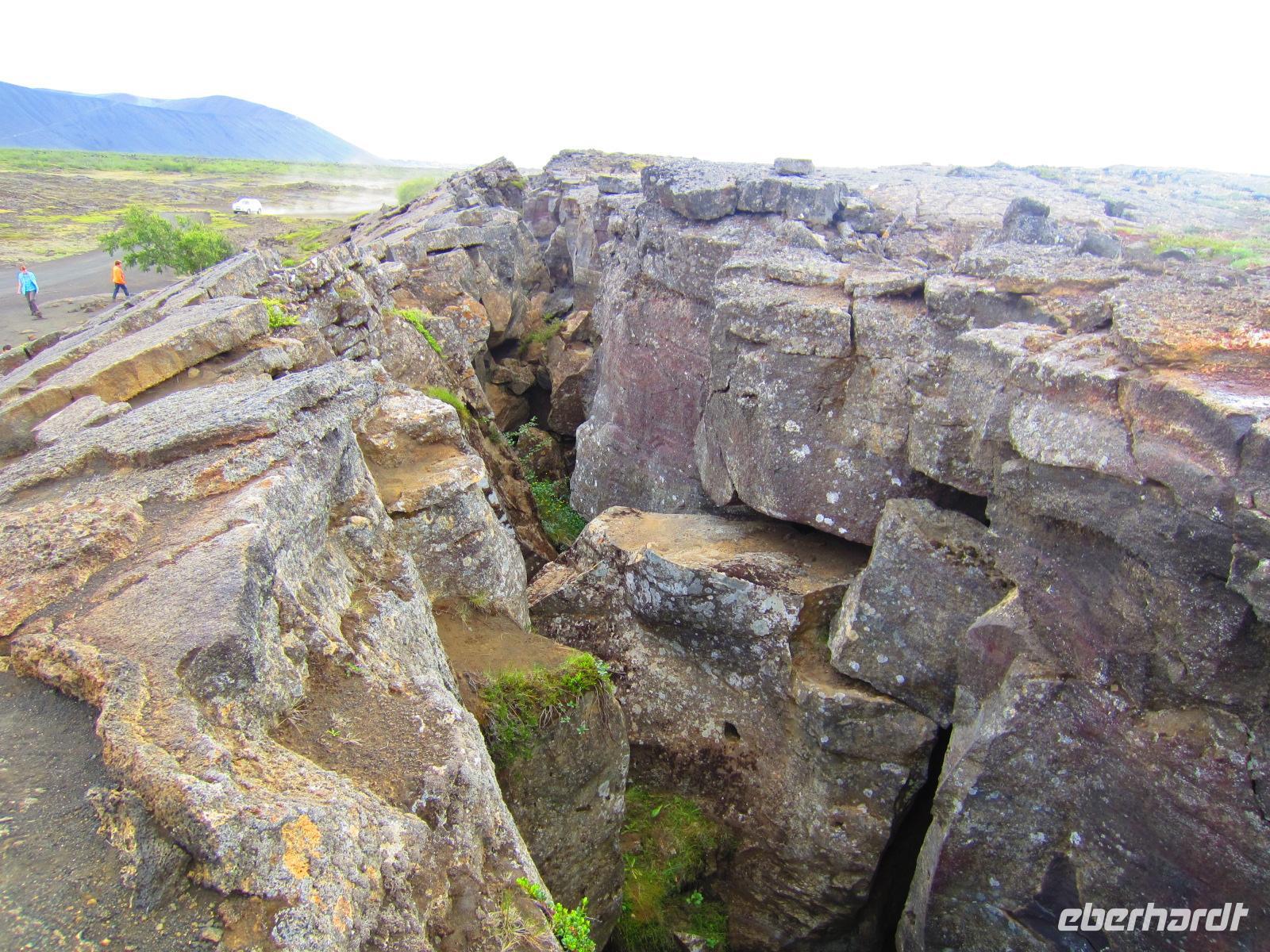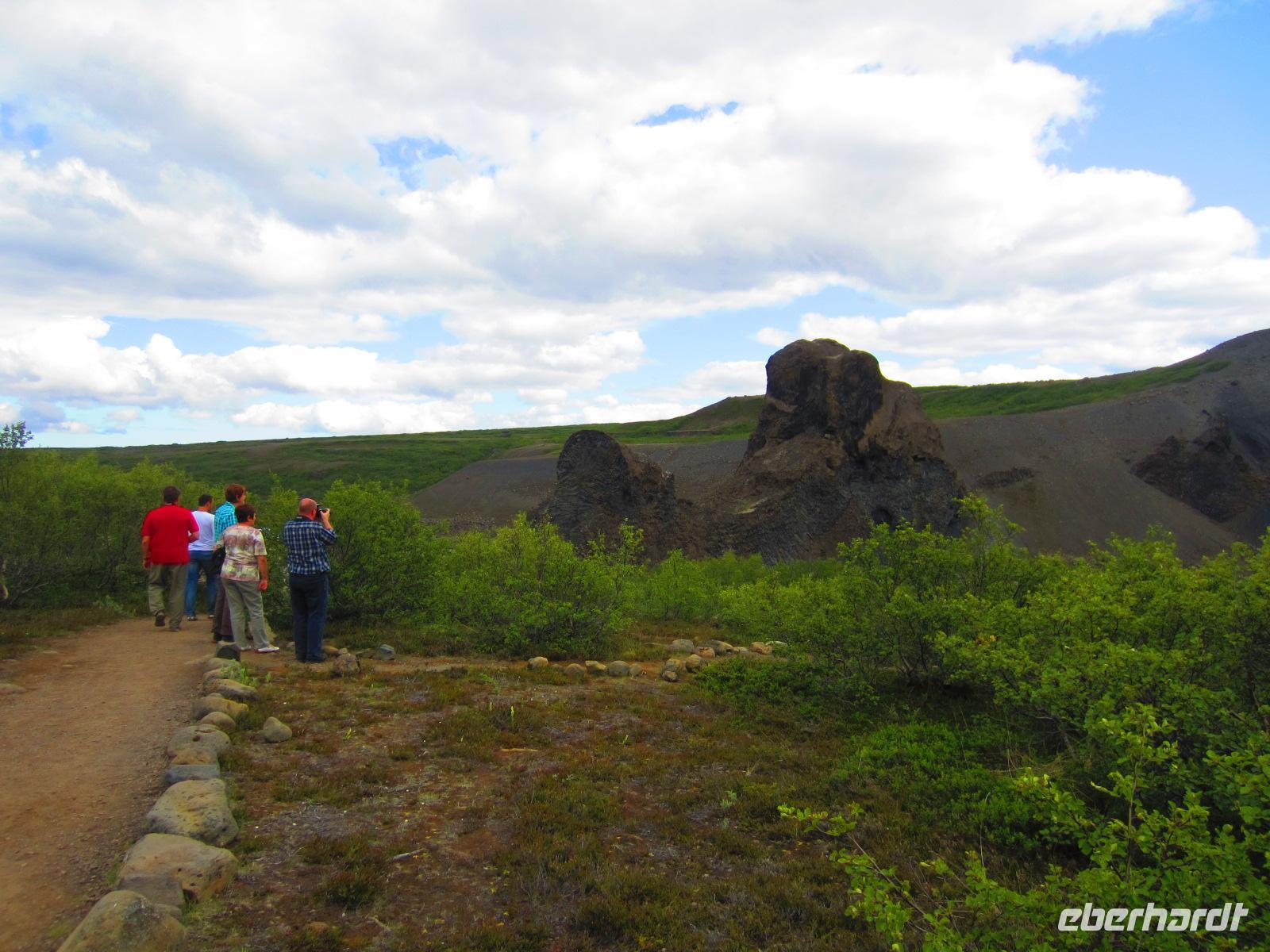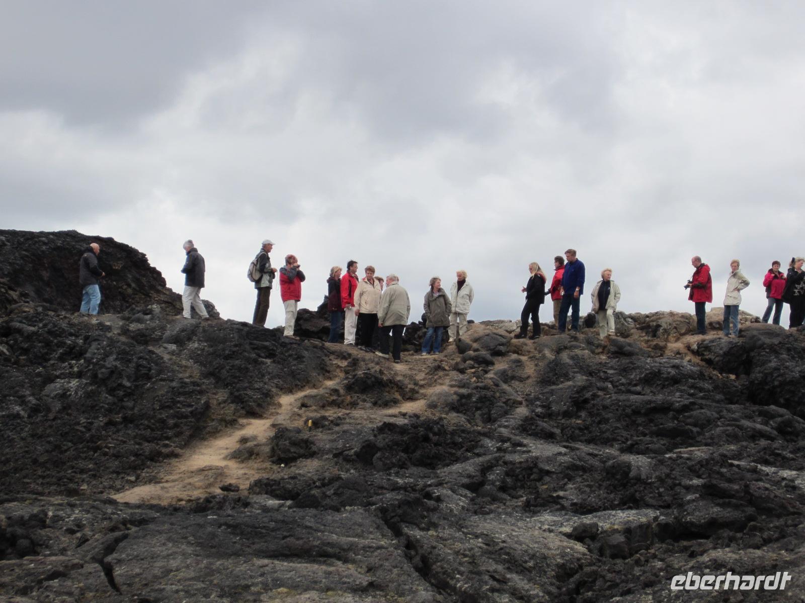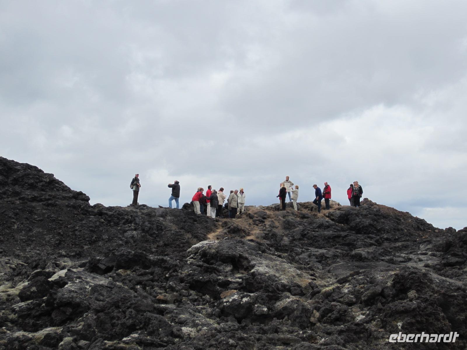 Nach einem ausgiebigen Frühstück starteten wir zu unserem spannenden Ausflug rund um den Mückensee. Es sollte ein Tag ganz im Zeichen der Lava und vulkanischer Aktivitäten werden, aber zuerst besichtigten wir den Godafoss, den Götterfall. Wieder war es für uns eine aufregende Klettertour, um bis ganz nah ran zu kommen und die besten Bilder zu schießen. Das Wasser floss tosend in die Tiefe, was wir auf einem gemeinsamen Gruppenbild versuchten einzufangen. Bald schon erreichten wir den Mývatn und machten zunächst einen Abstecher in die Hölle ;-).Gott sei Dank war diese nicht mit blubbernder Lava gefüllt, sondern lediglich mit grünem Wasser. Doch Reiseleiterin Rosa versicherte uns, dass der Vulkan jederzeit ausbrechen könnte, was uns dann doch ein eher mulmiges Gefühl bereitete. Noch abenteuerlicher wurde es dann bei einer Wanderung auf den Leijhur, der zuletzt von 1975-84 aktiv war, doch dessen vulkanische Vorgänge immer noch sichtbar sind. Eine riesige Fläche voller schwarzer, erkalteter Lava breitete sich vor uns aus. Man kann nur staunen, welche Macht die Natur doch besitzt. Am Krater brodelte und dampfte es und ein stechender Schwefelgeruch begleitete uns. Die Aussicht von oben war fantastisch und ließ uns erahnen, wie die Lava vor einigen Jahren hier herunter gedrungen sein musste. Einen noch intensiveren Geruch nach faulen Eiern bot sich uns an den Schlammquellen. Das laute Blubbern war schon von weitem zu hören und der kochende Schlamm sprang auf und ab in den kleinen Löchern mitten im weiten Lavafeld. Nach so viel Abenteuer hieß es zunächst erstmal entspannen und die Seele baumeln lassen. Im Schwefelbad von Jardbödin konnten wir unsere verspannten Muskeln im heißen Wasser lösen und die Natur ringsherum genießen. Ein wunderbares Erlebnis. Die Grenze zwischen der amerikanischen und eurasischen Platte zieht sich durch ganz Island und ist in keinem anderen Land der Welt so gut mit bloßem Auge sichtbar. Auch heute konnten wir dieses Phänomen wieder erleben.