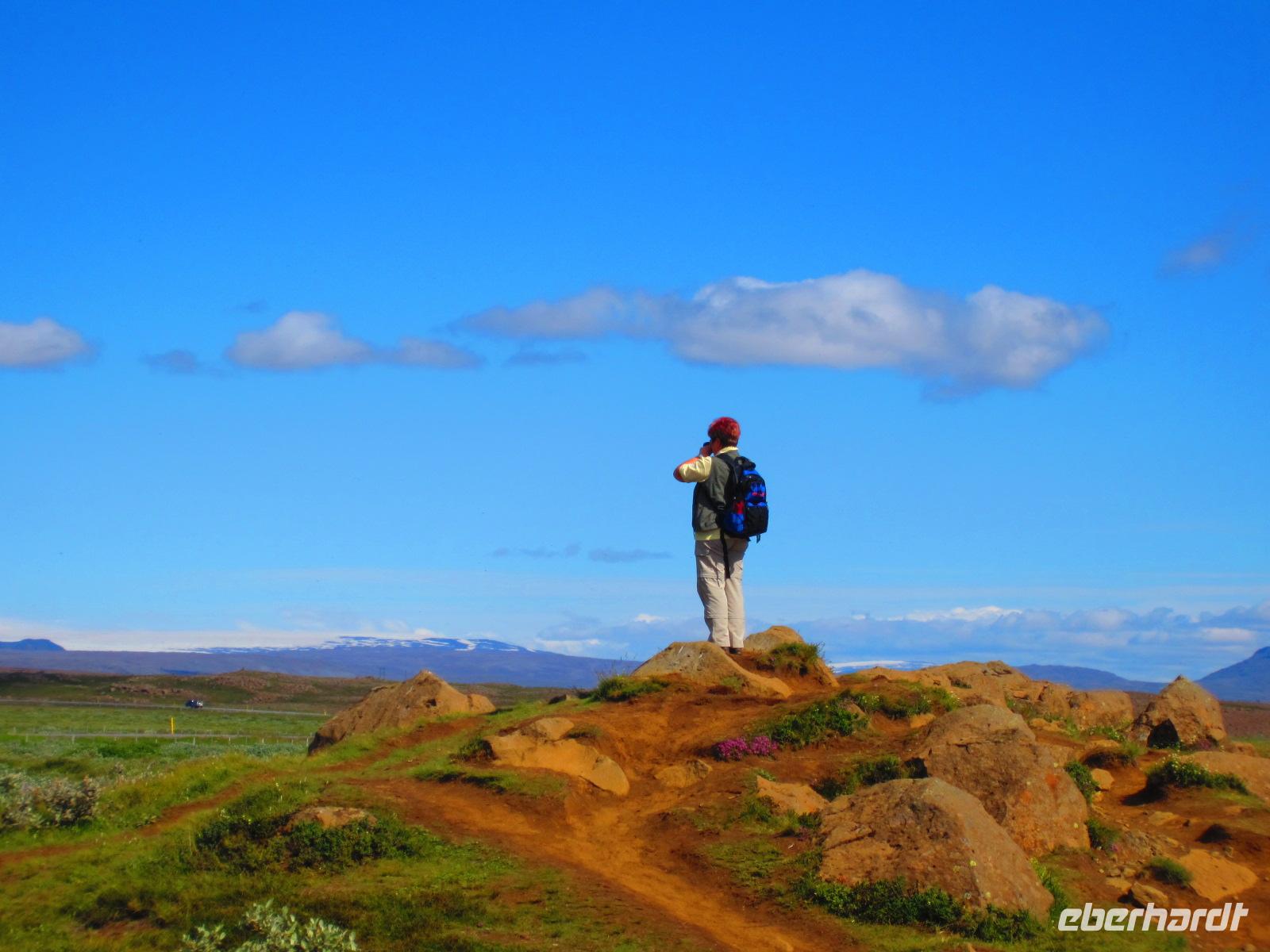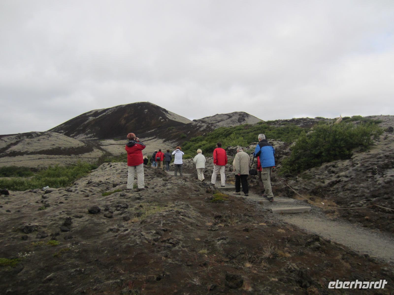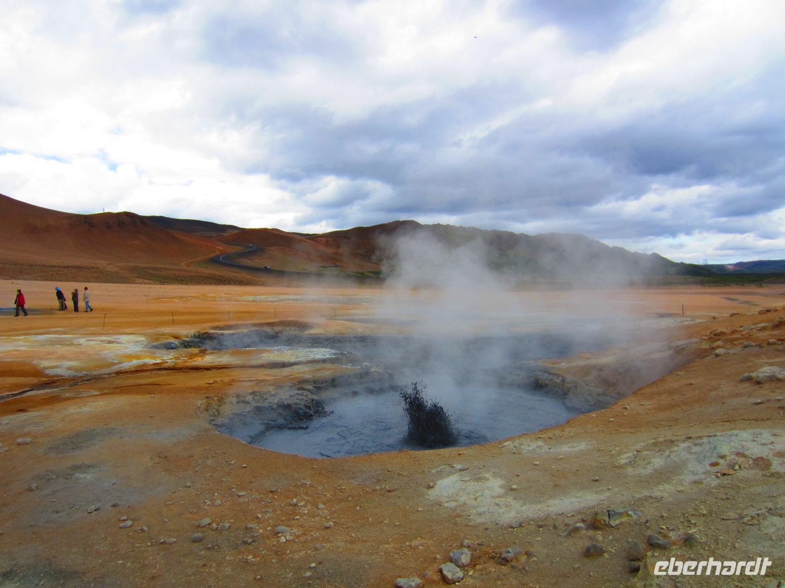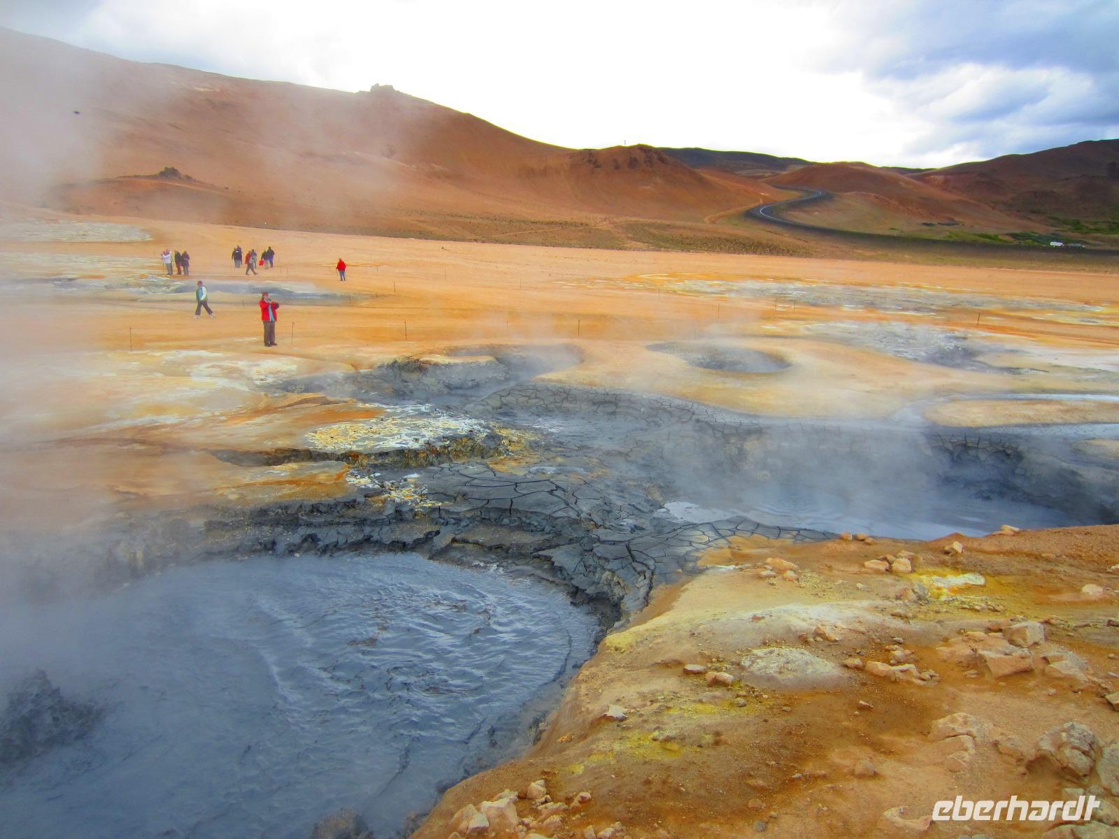 Nach einem ausgiebigen Frühstück starteten wir zu unserem spannenden Ausflug rund um den Mückensee. Es sollte ein Tag ganz im Zeichen der Lava und vulkanischer Aktivitäten werden, aber zuerst besichtigten wir den Godafoss, den Götterfall. Wieder war es für uns eine aufregende Klettertour, um bis ganz nah ran zu kommen und die besten Bilder zu schießen. Das Wasser floss tosend in die Tiefe, was wir auf einem gemeinsamen Gruppenbild versuchten einzufangen. Bald schon erreichten wir den Mývatn und machten zunächst einen Abstecher in die Hölle ;-).Gott sei Dank war diese nicht mit blubbernder Lava gefüllt, sondern lediglich mit grünem Wasser. Doch Reiseleiterin Rosa versicherte uns, dass der Vulkan jederzeit ausbrechen könnte, was uns dann doch ein eher mulmiges Gefühl bereitete. Noch abenteuerlicher wurde es dann bei einer Wanderung auf den Leijhur, der zuletzt von 1975-84 aktiv war, doch dessen vulkanische Vorgänge immer noch sichtbar sind. Eine riesige Fläche voller schwarzer, erkalteter Lava breitete sich vor uns aus. Man kann nur staunen, welche Macht die Natur doch besitzt. Am Krater brodelte und dampfte es und ein stechender Schwefelgeruch begleitete uns. Die Aussicht von oben war fantastisch und ließ uns erahnen, wie die Lava vor einigen Jahren hier herunter gedrungen sein musste. Einen noch intensiveren Geruch nach faulen Eiern bot sich uns an den Schlammquellen. Das laute Blubbern war schon von weitem zu hören und der kochende Schlamm sprang auf und ab in den kleinen Löchern mitten im weiten Lavafeld. Nach so viel Abenteuer hieß es zunächst erstmal entspannen und die Seele baumeln lassen. Im Schwefelbad von Jardbödin konnten wir unsere verspannten Muskeln im heißen Wasser lösen und die Natur ringsherum genießen. Ein wunderbares Erlebnis. Die Grenze zwischen der amerikanischen und eurasischen Platte zieht sich durch ganz Island und ist in keinem anderen Land der Welt so gut mit bloßem Auge sichtbar. Auch heute konnten wir dieses Phänomen wieder erleben.