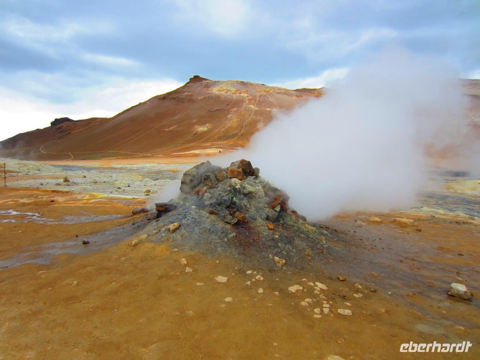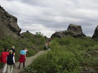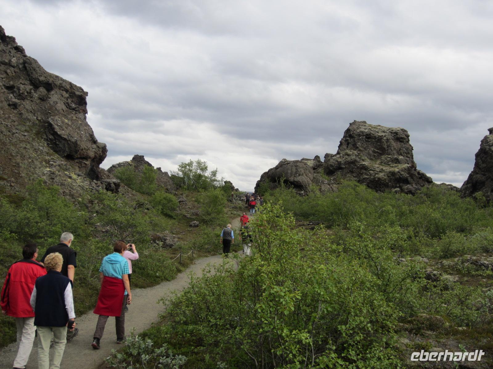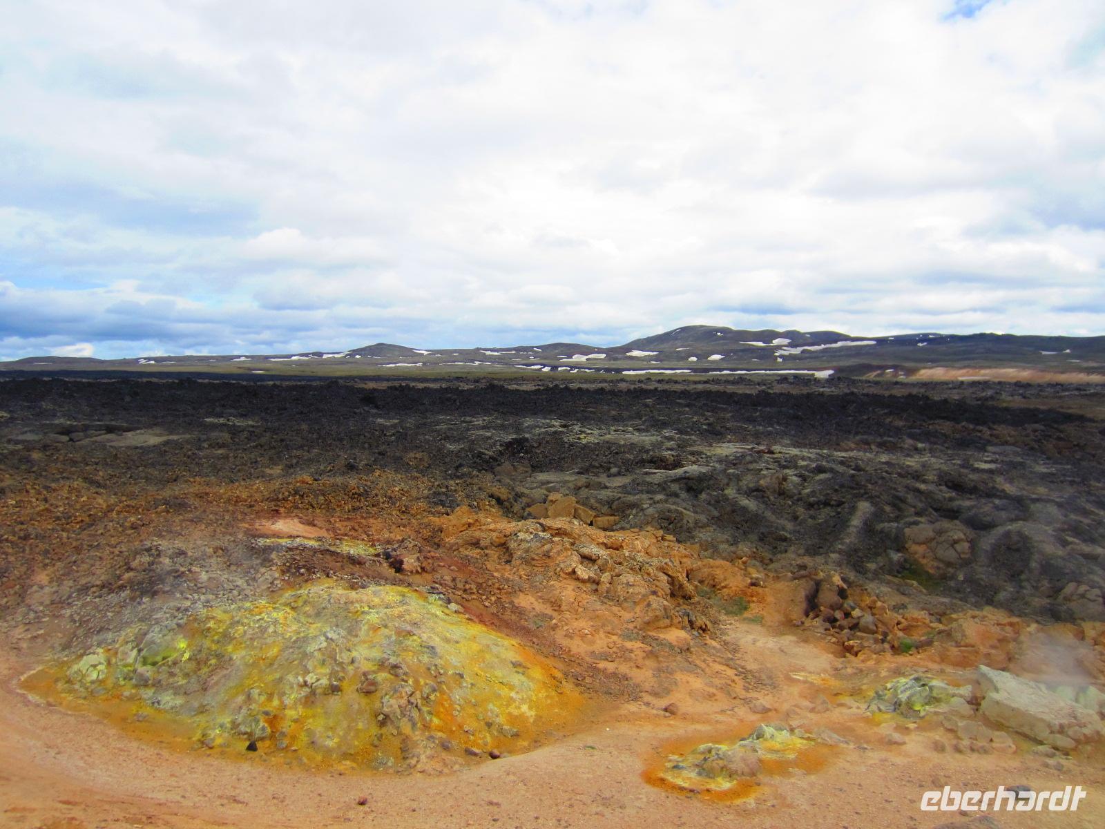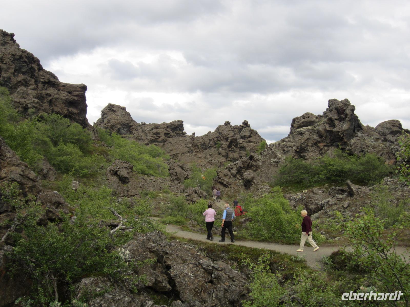 Nach einem ausgiebigen Frühstück starteten wir zu unserem spannenden Ausflug rund um den Mückensee. Es sollte ein Tag ganz im Zeichen der Lava und vulkanischer Aktivitäten werden, aber zuerst besichtigten wir den Godafoss, den Götterfall. Wieder war es für uns eine aufregende Klettertour, um bis ganz nah ran zu kommen und die besten Bilder zu schießen. Das Wasser floss tosend in die Tiefe, was wir auf einem gemeinsamen Gruppenbild versuchten einzufangen. Bald schon erreichten wir den Mývatn und machten zunächst einen Abstecher in die Hölle ;-).Gott sei Dank war diese nicht mit blubbernder Lava gefüllt, sondern lediglich mit grünem Wasser. Doch Reiseleiterin Rosa versicherte uns, dass der Vulkan jederzeit ausbrechen könnte, was uns dann doch ein eher mulmiges Gefühl bereitete. Noch abenteuerlicher wurde es dann bei einer Wanderung auf den Leijhur, der zuletzt von 1975-84 aktiv war, doch dessen vulkanische Vorgänge immer noch sichtbar sind. Eine riesige Fläche voller schwarzer, erkalteter Lava breitete sich vor uns aus. Man kann nur staunen, welche Macht die Natur doch besitzt. Am Krater brodelte und dampfte es und ein stechender Schwefelgeruch begleitete uns. Die Aussicht von oben war fantastisch und ließ uns erahnen, wie die Lava vor einigen Jahren hier herunter gedrungen sein musste. Einen noch intensiveren Geruch nach faulen Eiern bot sich uns an den Schlammquellen. Das laute Blubbern war schon von weitem zu hören und der kochende Schlamm sprang auf und ab in den kleinen Löchern mitten im weiten Lavafeld. Nach so viel Abenteuer hieß es zunächst erstmal entspannen und die Seele baumeln lassen. Im Schwefelbad von Jardbödin konnten wir unsere verspannten Muskeln im heißen Wasser lösen und die Natur ringsherum genießen. Ein wunderbares Erlebnis. Die Grenze zwischen der amerikanischen und eurasischen Platte zieht sich durch ganz Island und ist in keinem anderen Land der Welt so gut mit bloßem Auge sichtbar. Auch heute konnten wir dieses Phänomen wieder erleben.