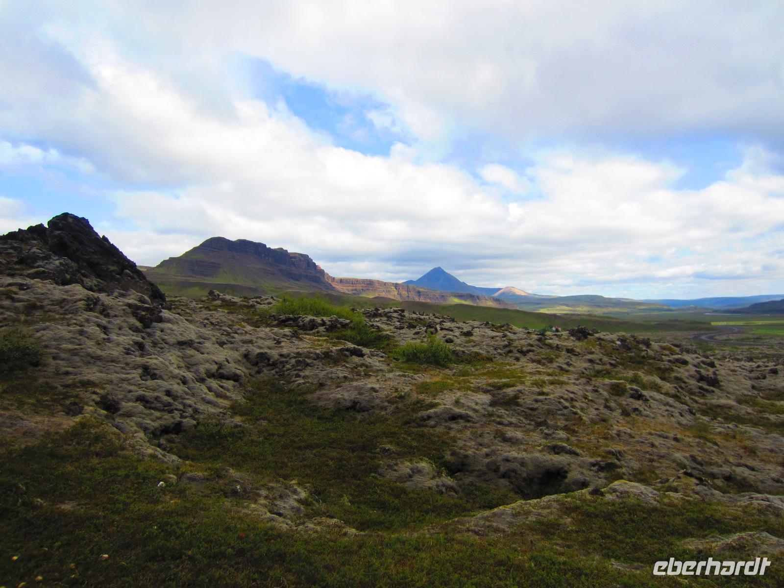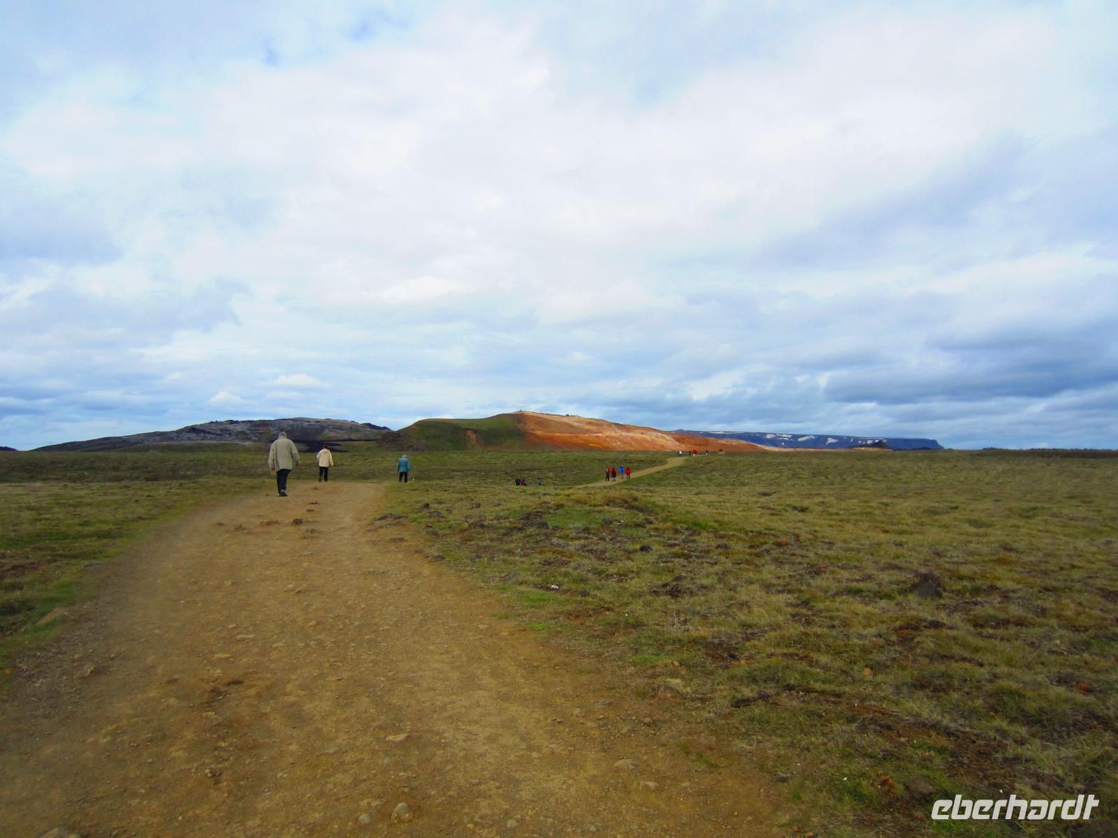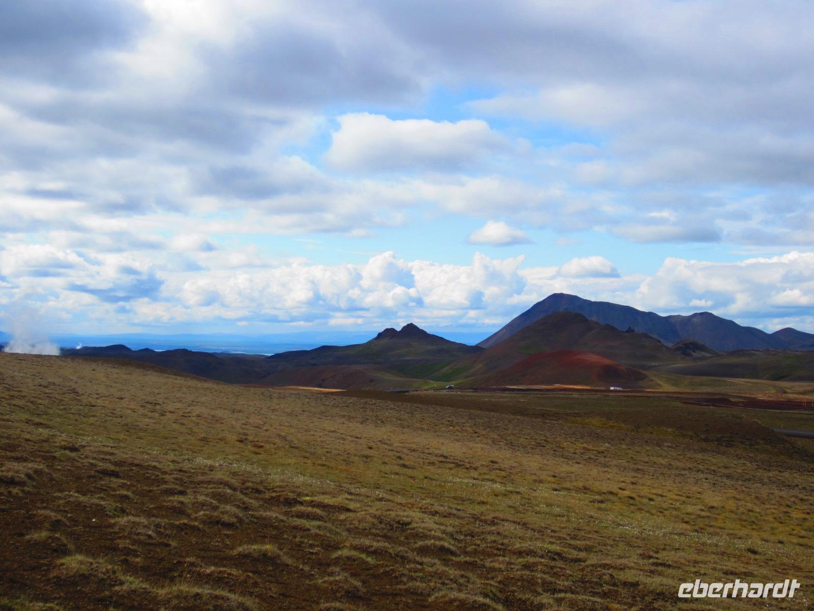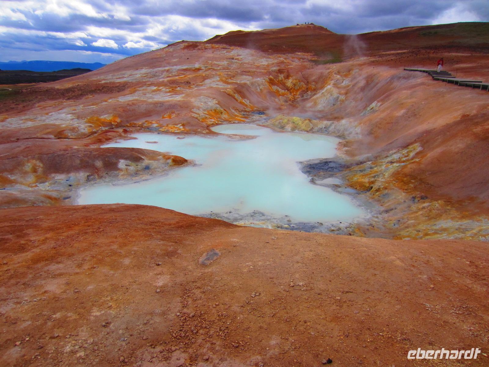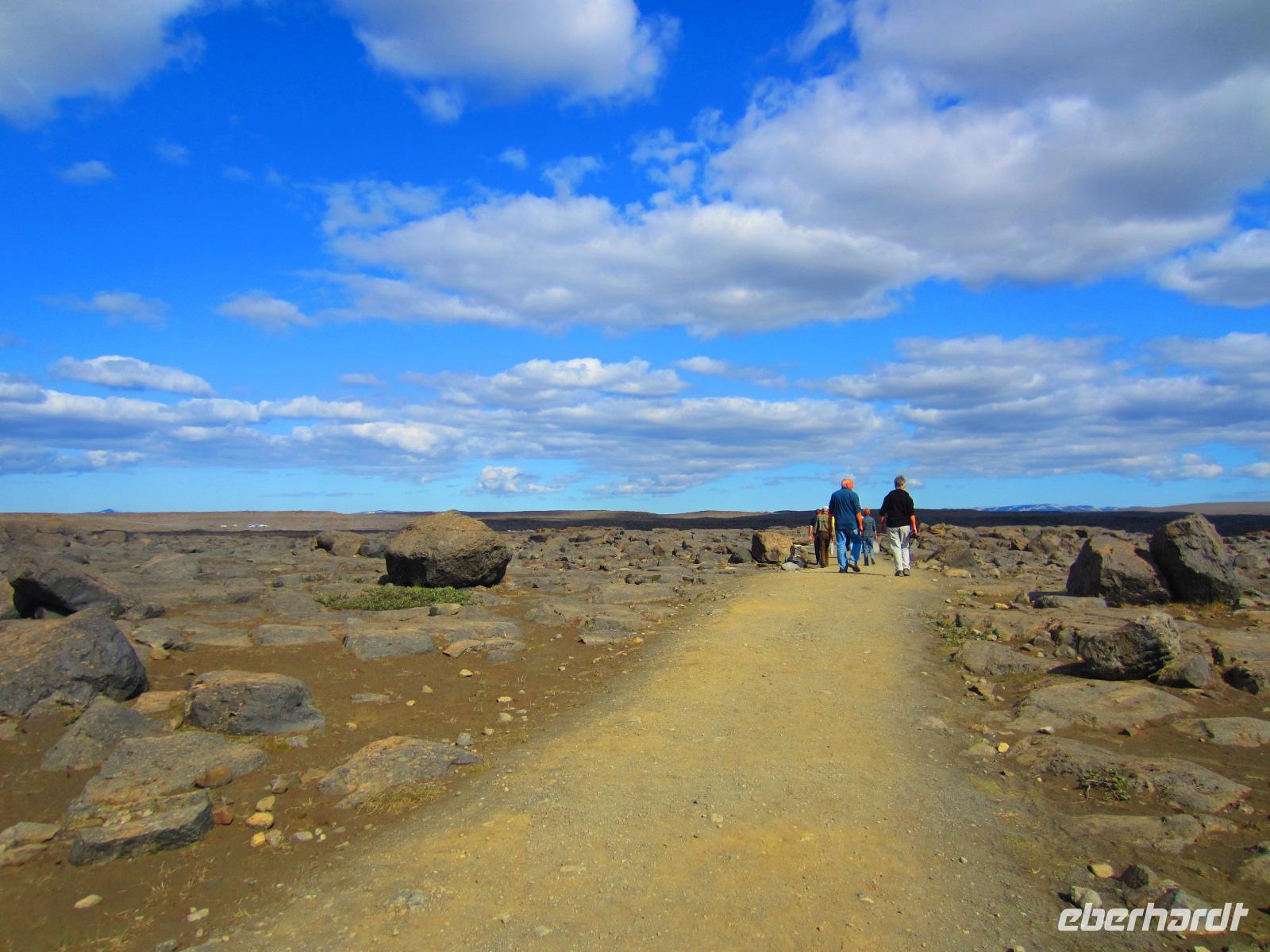 Nach einem ausgiebigen Frühstück starteten wir zu unserem spannenden Ausflug rund um den Mückensee. Es sollte ein Tag ganz im Zeichen der Lava und vulkanischer Aktivitäten werden, aber zuerst besichtigten wir den Godafoss, den Götterfall. Wieder war es für uns eine aufregende Klettertour, um bis ganz nah ran zu kommen und die besten Bilder zu schießen. Das Wasser floss tosend in die Tiefe, was wir auf einem gemeinsamen Gruppenbild versuchten einzufangen. Bald schon erreichten wir den Mývatn und machten zunächst einen Abstecher in die Hölle ;-).Gott sei Dank war diese nicht mit blubbernder Lava gefüllt, sondern lediglich mit grünem Wasser. Doch Reiseleiterin Rosa versicherte uns, dass der Vulkan jederzeit ausbrechen könnte, was uns dann doch ein eher mulmiges Gefühl bereitete. Noch abenteuerlicher wurde es dann bei einer Wanderung auf den Leijhur, der zuletzt von 1975-84 aktiv war, doch dessen vulkanische Vorgänge immer noch sichtbar sind. Eine riesige Fläche voller schwarzer, erkalteter Lava breitete sich vor uns aus. Man kann nur staunen, welche Macht die Natur doch besitzt. Am Krater brodelte und dampfte es und ein stechender Schwefelgeruch begleitete uns. Die Aussicht von oben war fantastisch und ließ uns erahnen, wie die Lava vor einigen Jahren hier herunter gedrungen sein musste. Einen noch intensiveren Geruch nach faulen Eiern bot sich uns an den Schlammquellen. Das laute Blubbern war schon von weitem zu hören und der kochende Schlamm sprang auf und ab in den kleinen Löchern mitten im weiten Lavafeld. Nach so viel Abenteuer hieß es zunächst erstmal entspannen und die Seele baumeln lassen. Im Schwefelbad von Jardbödin konnten wir unsere verspannten Muskeln im heißen Wasser lösen und die Natur ringsherum genießen. Ein wunderbares Erlebnis. Die Grenze zwischen der amerikanischen und eurasischen Platte zieht sich durch ganz Island und ist in keinem anderen Land der Welt so gut mit bloßem Auge sichtbar. Auch heute konnten wir dieses Phänomen wieder erleben.