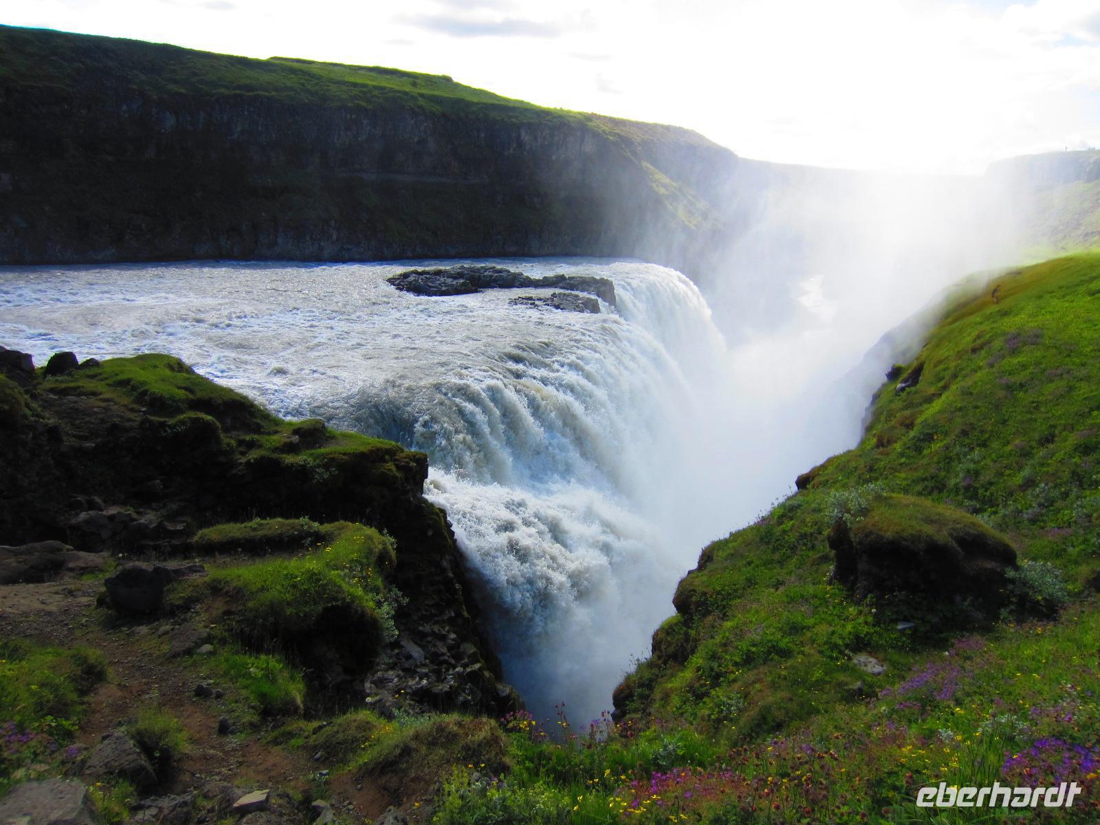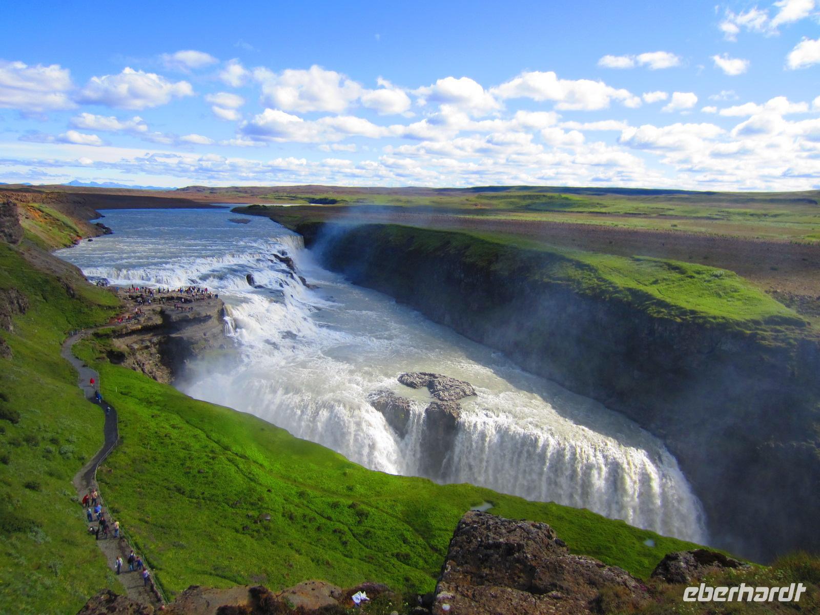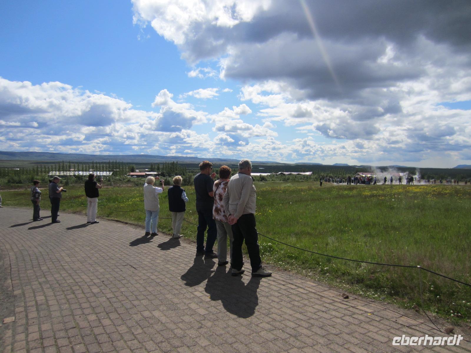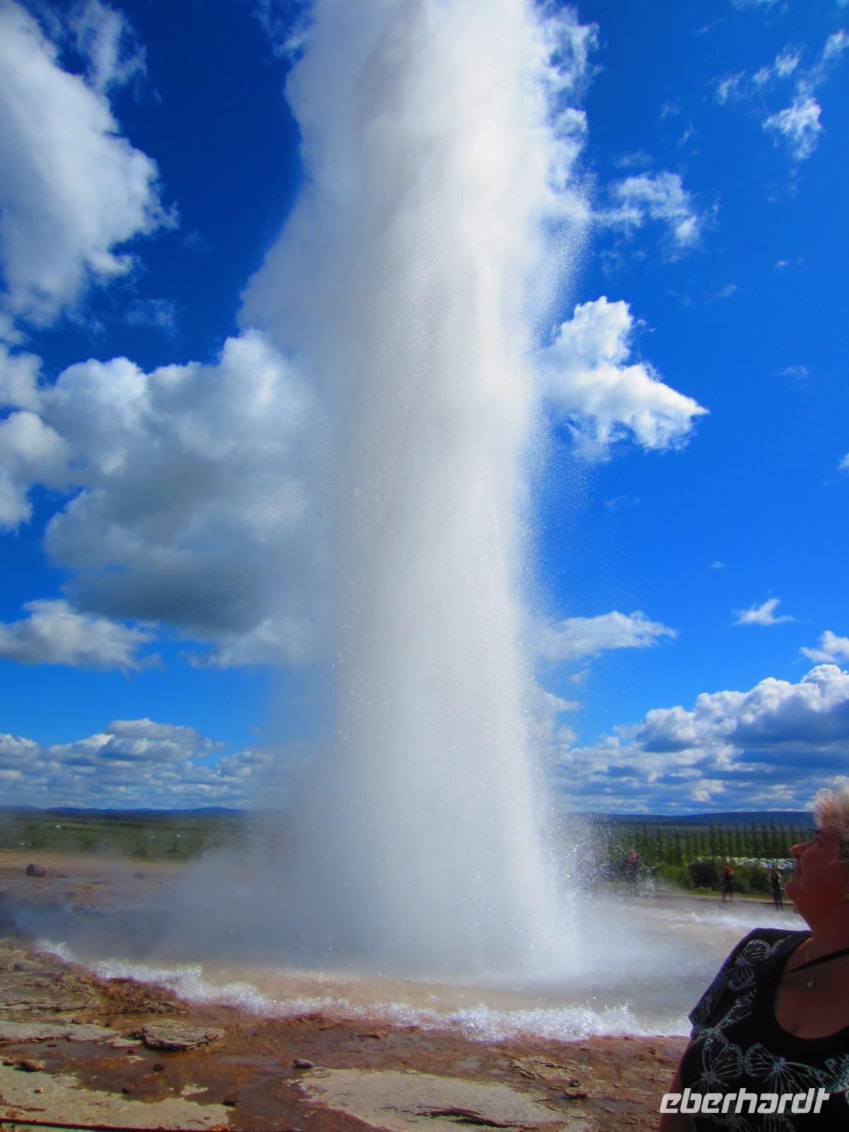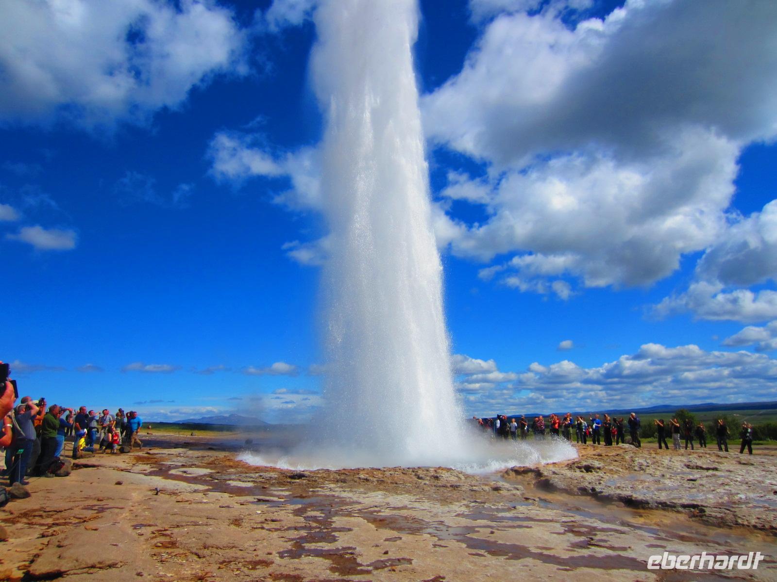Nach einem ausgiebigen Frühstück im Hotel trafen wir auf unsere Reiseleiterin Rosa. Es erwartete uns ein Tag gefüllt mit touristischen Höhepunkten von atemberaubender Naturschönheit. Der schönste Wasserfall Islands, der Gullfoss (Goldener Wasserfall), präsentierte sich uns bei schönstem Sonnenschein. Wir waren begeistert von der unwahrscheinlichen Masse an Wasser, welche in die 70 Meter tiefe Klamm hinab stürzte. Die ganz mutigen unter uns trauten sich sogar bis ganz nah heran. Keine Absperrung trennte uns von den reißenden Fluten. Das ist Island - hautnah an der Natur. Unser nächster Stopp führte uns in das bekannte Geothermalgebiet, in welchem wir den Geysir mit seinem kochend heißen Wasser besichtigen konnten. Schon von weitem konnten wir viele Menschen sehen, die sich um ein großes Loch in der Erde scharrten. Stokkur, der kleine Bruder von Geysir, spukt in regelmäßigen Abständen von ein paar Minuten eine riesige Wassersäule in den Himmel, welche dann schnell wieder verdampft.