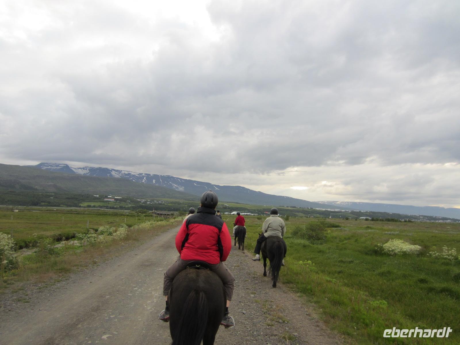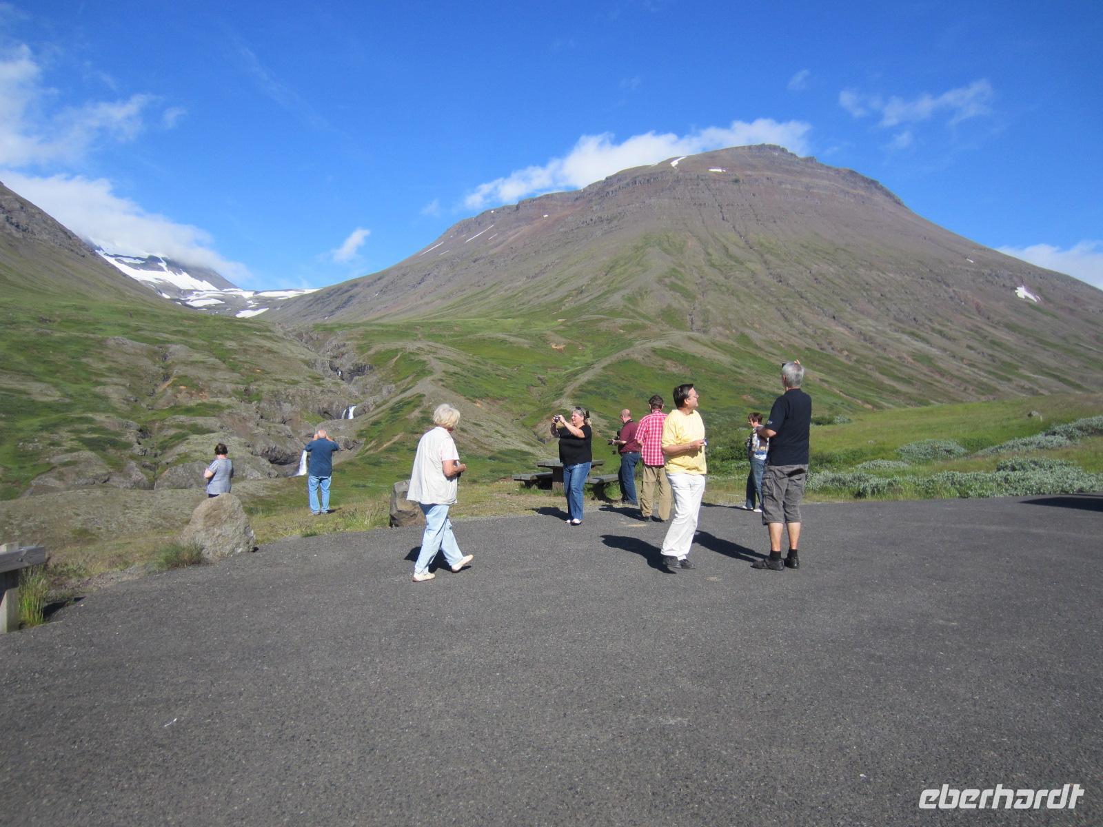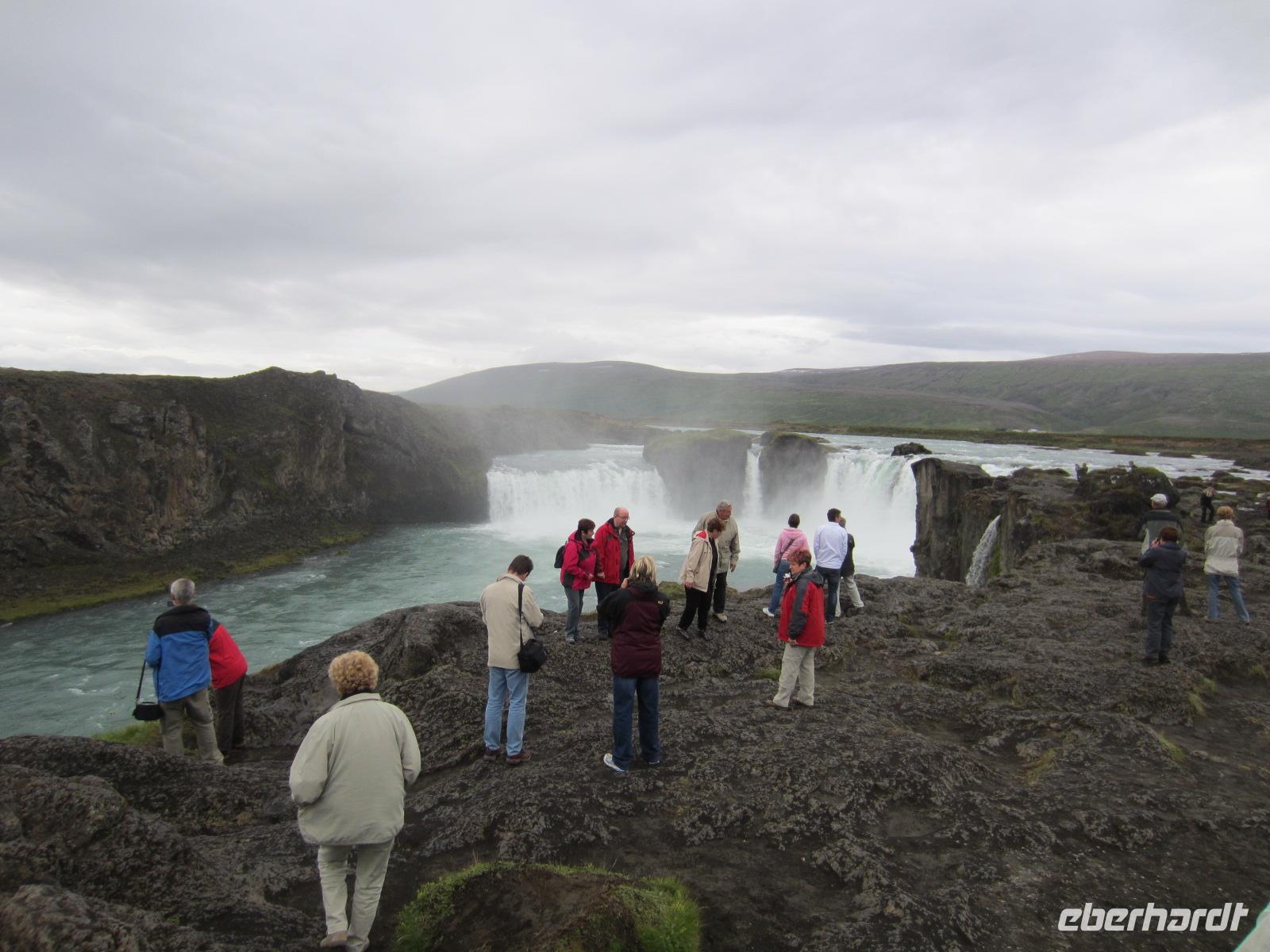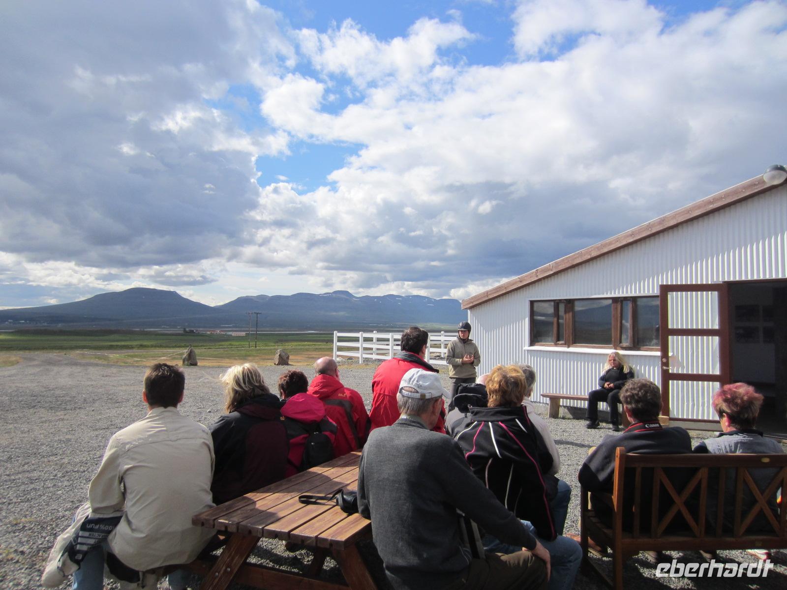 Heute hieß es Koffer packen und ab in den Norden der Insel. Am Morgen lernten wir unseren netten Fahrer Münte kennen, welcher von uns nur liebevoll Müntefering genannt wurde. Mit dem Bus traten wir nun den langen Weg nach Akureyri an. Am Krater Grábrók unternahmen wir eine kleine Wanderung bis ganz noch oben. Von dort bot sich uns ein wundervoller Ausblick auf die umliegende karge, aber beeindrucke Landschaft. Hier konnte man den Alltag komplett vergessen und in die ewigen Weiten eintauchen. Am Nachmittag erreichten wir einen Reiterhof mitten auf dem Land. Die hier ansässige Familie hegt eine lange Tradition in der Zucht von Islandpferden. Praktikantin Theresa aus Deutschland erklärte uns alles zur Geschichte des Hofes, zur Haltung dieser speziellen Pferderasse und über das Leben auf dem Gestüt. Bei einer Vorführung konnten wir uns die 5 Gangarten des Islandpferdes erleben. Ganz speziell sind hier auf der Insel der Tölt und der Pass. Im Stall konnten wir die Pferde mit ihren verschiedenen Fellfarben bewundern und auch streicheln. Die Oma hatte noch Kuchen für uns gebacken und so erhielten wir einen wunderbaren Einblick in das Landleben. Am Abend erreichten wir unser Tagesziel Akureyri. Nach einer orientierenden Rundfahrt in der Stadt, welche fast am Polarkreis liegt, bezogen wir das Edda Hotel. Die Edda Hotels sind typische Unterkünfte, welche im Winter als Internat genutzt werden. Ein wunderbar reichliches Buffet wartete schon auf uns und hinterher noch ein fantastischer Nachtisch.