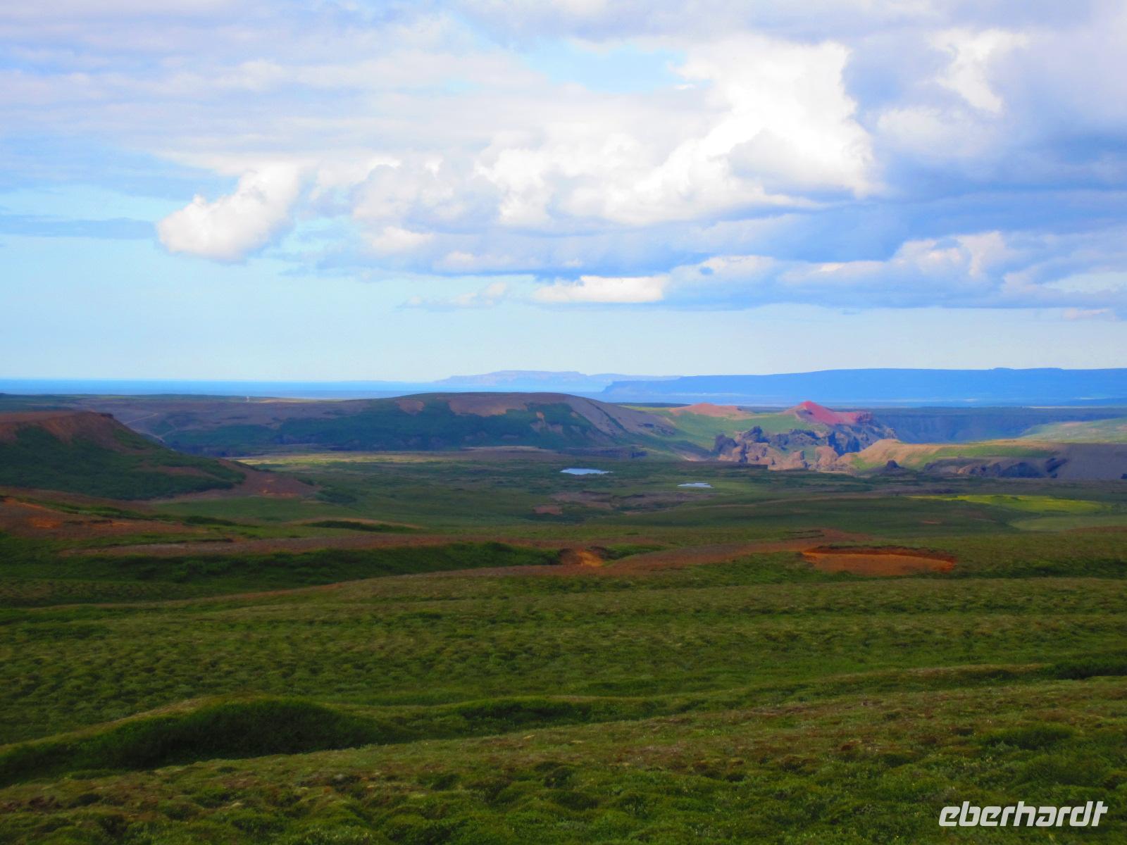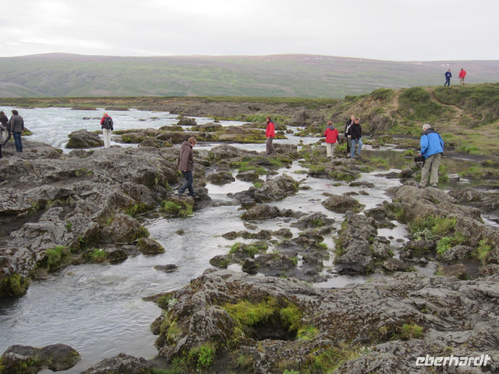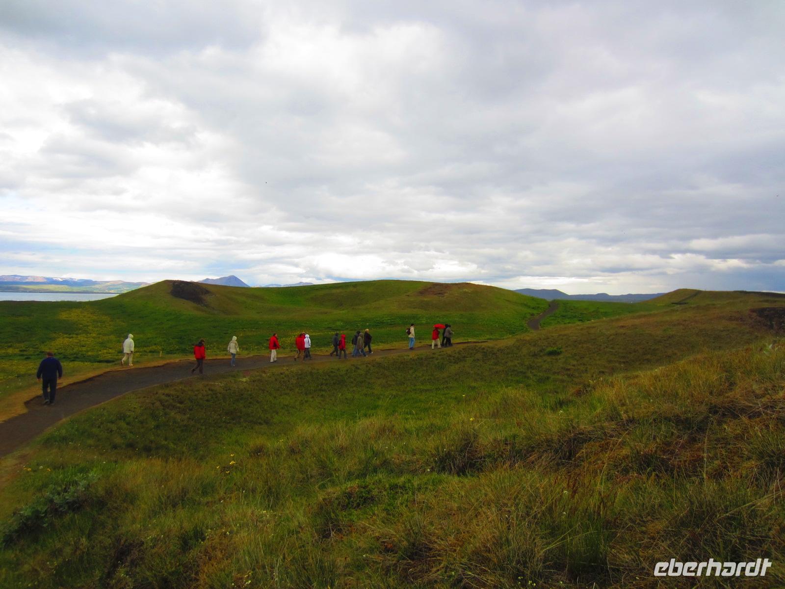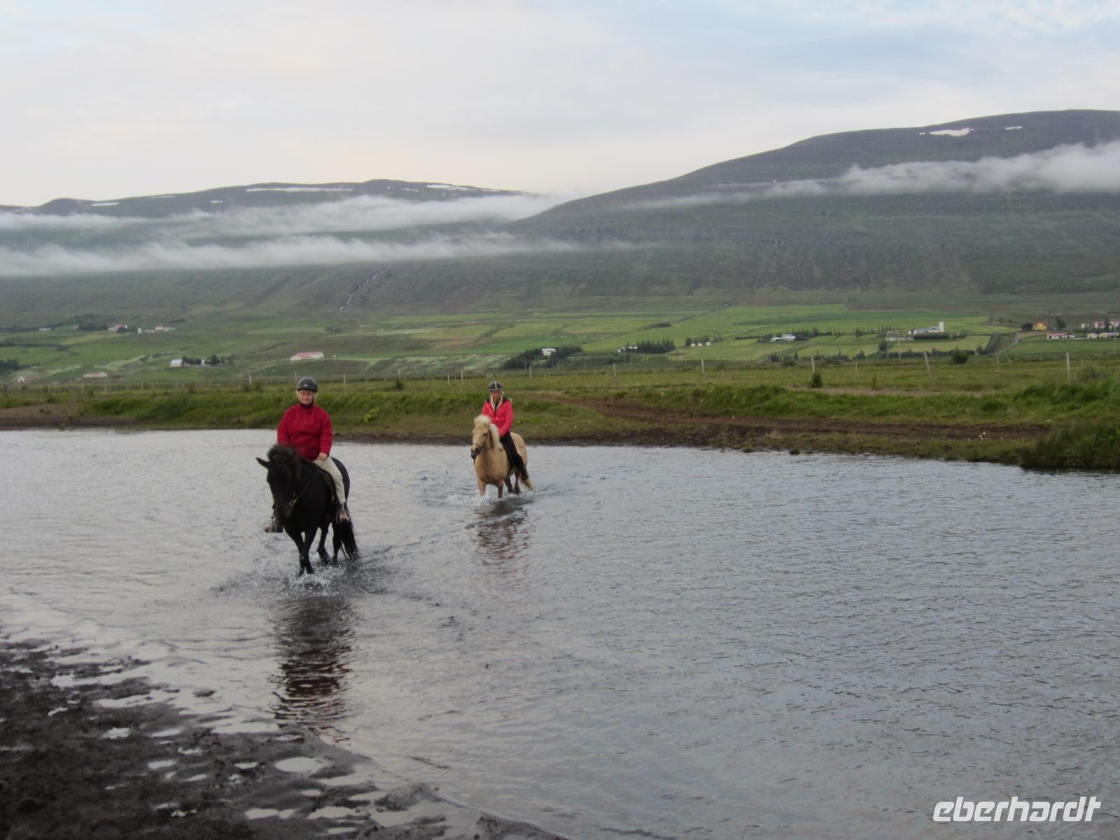 Ein riesiger Krater zog sich mitten durch die Landschaft. Da konnten wir nur staunen und einmal auf 2 Kontinenten zugleich stehen. Im Lavalabyrinth boten sich uns bei einem kurzen Spaziergang allerhand seltsame Felsformationen, hinter denen sich sicherlich der ein oder andere Troll versteckt hielt. Zum Abschluss dieses wundervollen Tages unternahmen wir noch eine kleine Wanderung auf die Pseudokrater rund um den Myvatn, welche herrlich begrünt waren. Wir hatten uns das feine Abendessen redlich verdient. Doch der Tag neigte sich noch nicht dem Ende zu, denn einige von uns brachen noch zu einem fakultativen Reitausflug auf. Unter hellem Himmel sattelten wir unsere Islandpferdchen, rüsteten uns mit Helm und Handschuhen aus und auf ging es durch das grüne Tal. Es war ein einmaliger Ausflug in die Natur. Ringsherum hohe Berge und man sagt ja: “Auf dem Rücken der Pferde liegt das Glück der Erde“. Sogar durch einen Fluss sind wir geritten und so konnten wir den Abend noch herrlich beenden.
