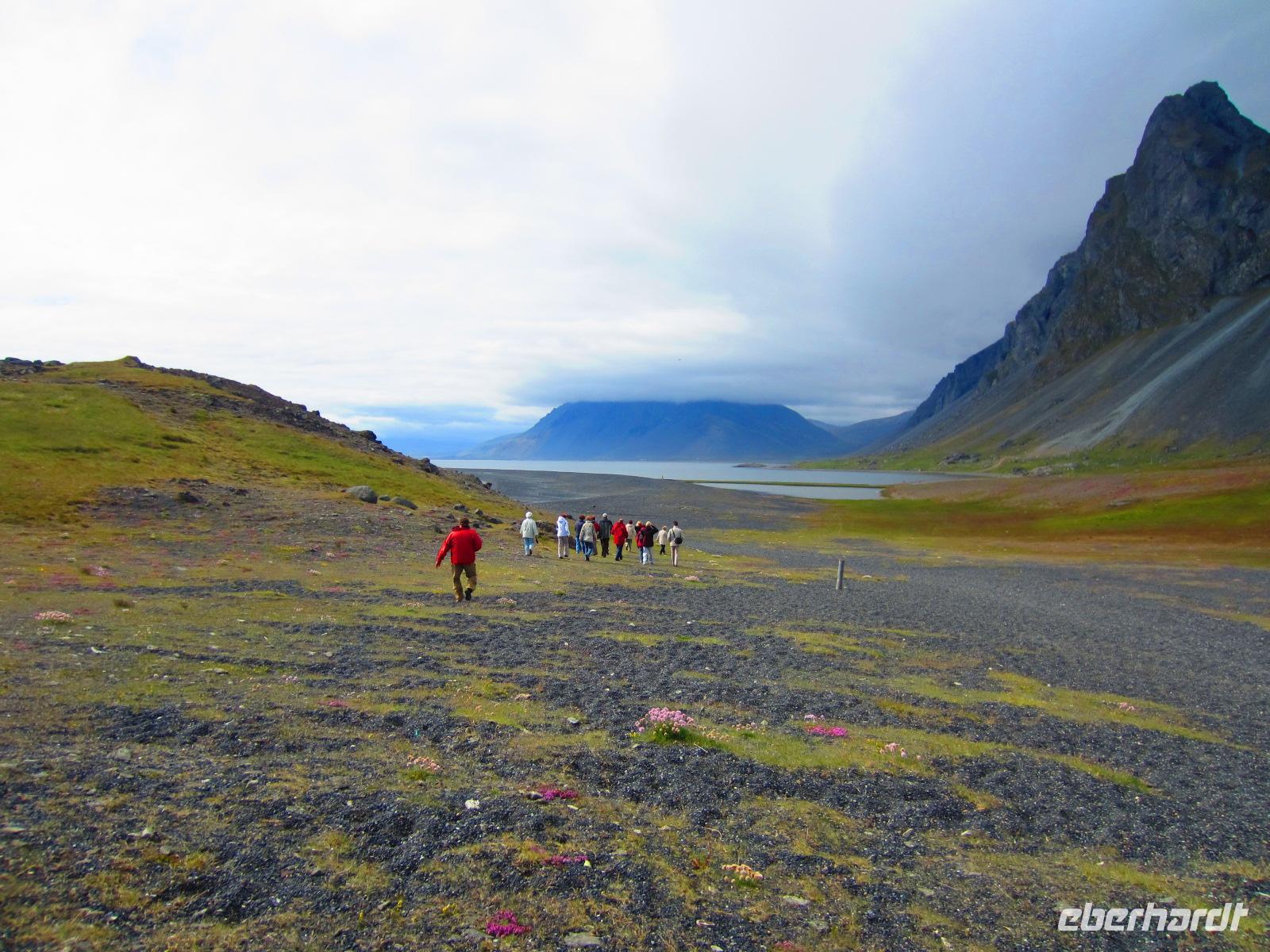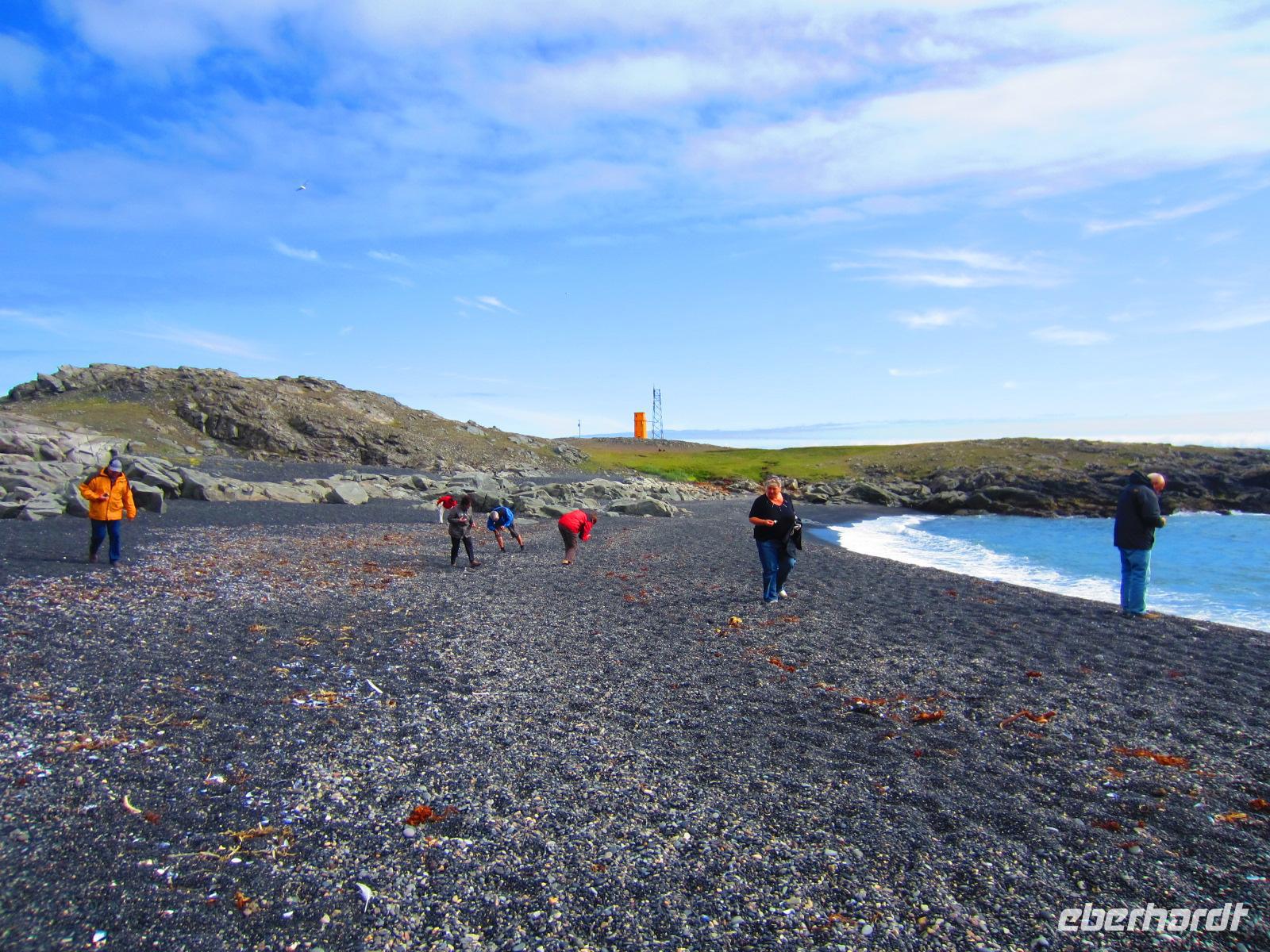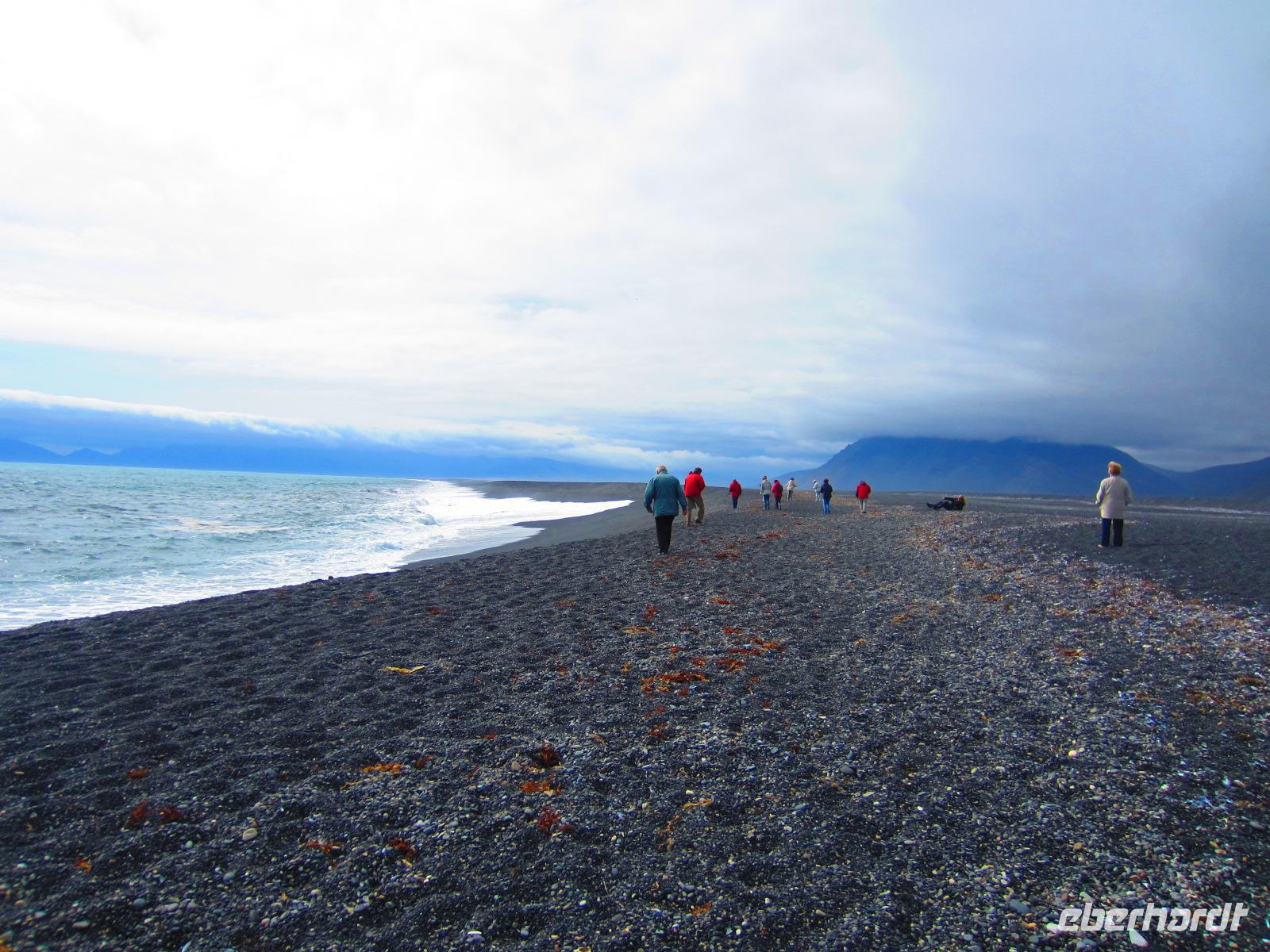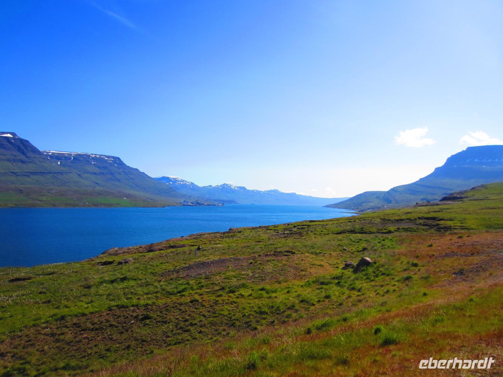 Die Ostfjorde boten uns einen erhabenen Anblick und wir genossen es in der Nähe des Meeres zu sein. Am frühen Nachmittag unternahmen wir noch einen herrlichen Strandspaziergang auf dem schwarzen Sand. Dabei fanden wir allerlei Seltsames. Fischgräten und Knochen, Scheren von Krebsen und lauter schöne Steine, die durch die Sonne herrlich warm waren. Nachdem wir alle fleißig unsere Mitbringsel gesammelt hatten, fuhren wir weiter immer entlang der Fjorde und