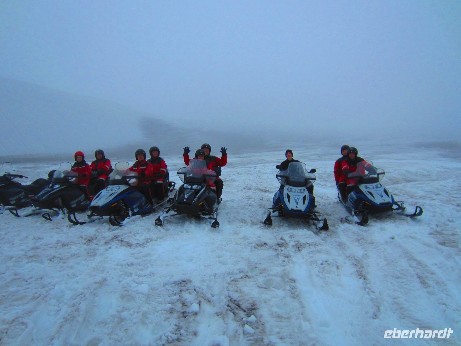 Gegen 8 Uhr wurden wir von 3 großen Geländewagen abgeholt und auf den Vatnajökull gefahren. Schon die Auffahrt war äußerst spannend und vor allem geheimnisvoll, als wir durch den Nebel immer höher gelangten. Oben angekommen, konnten wir uns zwischen einer Jeepfahrt oder Schneemobilfahrt entscheiden. Bei unserer Tour über den größten Gletscher Europas hatten wir unheimlich viel Spaß. Vom Lachanfall im ruckelnden Jeep über eine Schneeballschlacht und das rasante Fahren auf dem Schneemobil war alles dabei. Die Tour beschlossen wir bei einem „Vatnajökull-Bier“ bevor wir mit den Jeeps wieder zurück zum Hotel gefahren wurden. Ein einmaliges Erlebnis, das wir so schnell nicht vergessen werden.