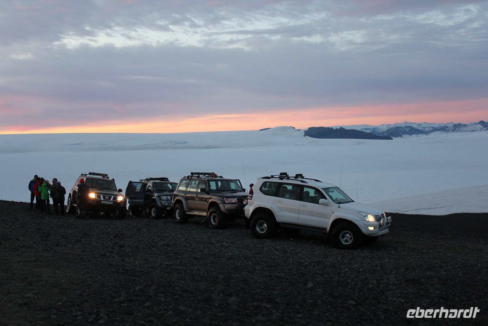 Kurz darauf erreichen wir bereits die Kleinstadt Höfn, unser Übernachtungsort für heute. Am frühen Abend nehmen wir unser Abendessen ein, welches mit 3 verschiedenen Fischvariationen wieder hervorragend schmeckt. Es bleibt nicht viel Zeit, denn schon bald stehen unsere Fahrer für die fakultative Gletschertour bereit und holen uns vom Hotel ab. Nach ca. 60 km Fahrt erreichen wir den Fuße des Vatnajökull, den größten Gletscher Islands, und fahren auf kurvigen und holprigen Wegen hinauf zur Station. Dort steigen wir in Jeeps oder wahlweise Schneemobilen um und erkunden so die „eisige“ Landschaft, bis wir schließlich am Gipfel ankommen. Was für ein Ausblick! Es ist traumhaft! Wieder auf der Station angekommen probieren wir das berühmte Gletscherbier. Es ist köstlich! Somit geht ein erlebnisreicher, aber auch langer Tag zu Ende, der für uns „Gletscherfahrer“ erst nach Mitternacht endet.