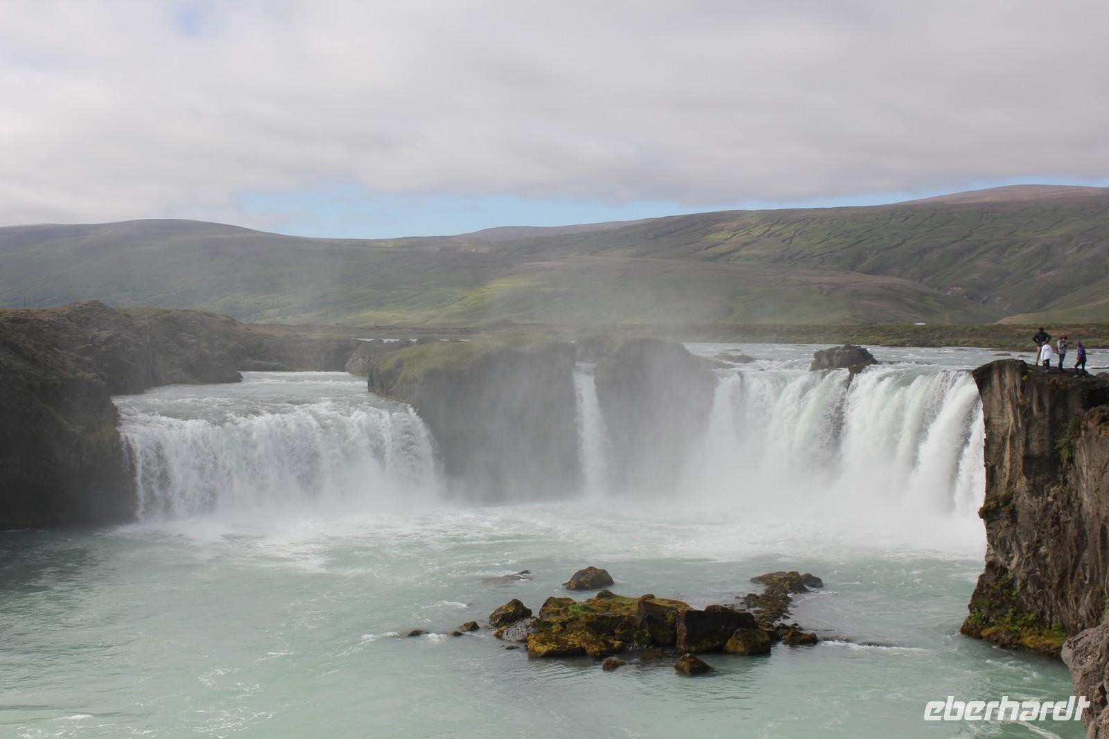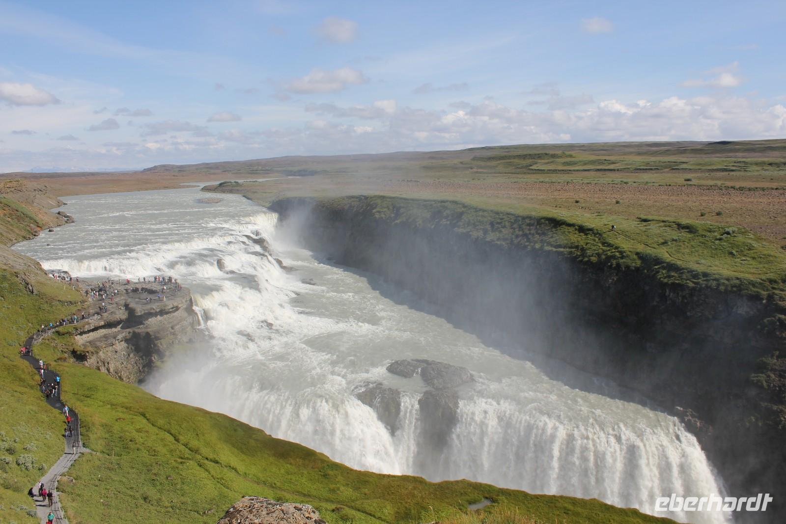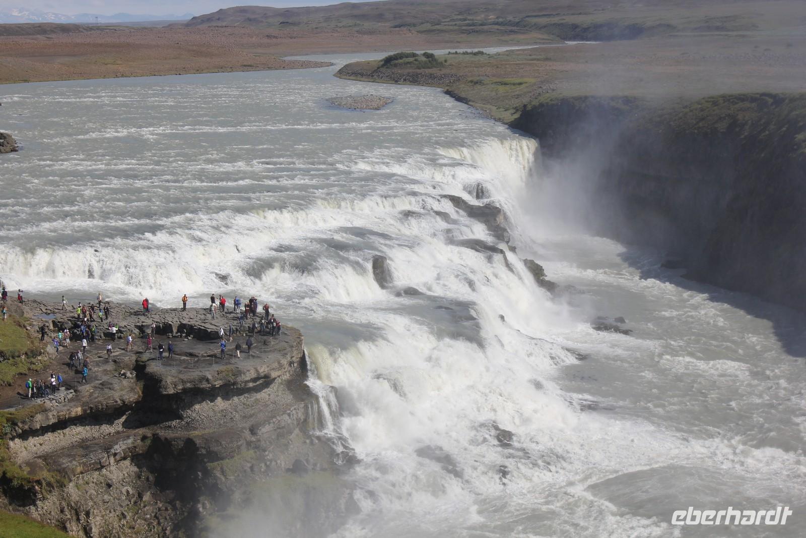 Am frühen Nachmittag erreichen wir den wunderschönen Wasserfall Gullfoss, der in breiter Front über zwei gewaltige, gegeneinander versetzte Kaskaden ins Tal stürzt.