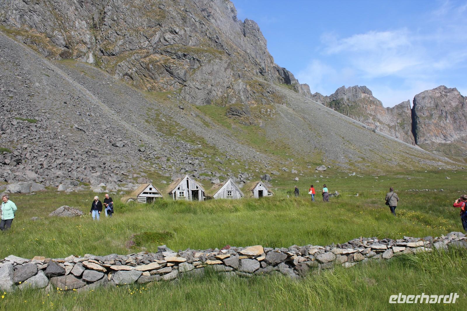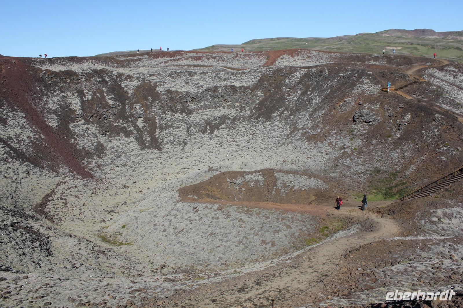 Auf dem Weg zum 170m tiefen Krater Grábrók sehen wir viele der Sommerhäuser, welche typisch für Island sind. Am Krater angekommen unternehmen wir eine kleine Wanderung und umrunden diesen und lassen seine Größe auf uns wirken.